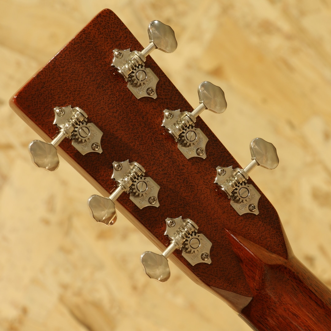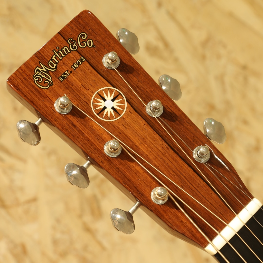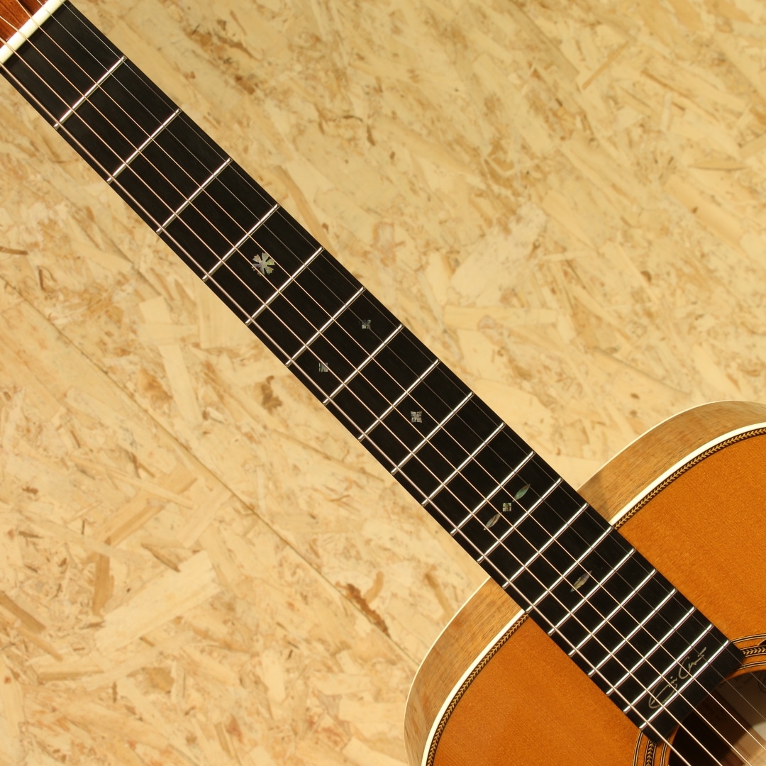 数あるエリッククラプトン限定モデルの中でも良好なスペックとルックスで人気を誇るシグネイチャモデル十一作目、本モデルは当時米国ギターセンターとマーチン社とのコラボ発案され世界限定150本のみ生産されました。本器は2013年製のUSEDアイテムです。今年で80才を迎え8日間もパワフルな公演を武道館で見せてくれた姿に今も興奮冷めやらぬ方も多いでしょう。シトカスプルーストップ、マダガスカルローズウッドサイド&バック、エボニー指板&ブリッジ、オリジナルゴトーオープンバックペグ、スノウフレークス指板ポジション、ヘリンボーンロゼッタ/トリム、アイボロイドバインディング、デルマー社ピックガード、ジグザグバックストリップ、マダガスカルローズウッド化粧版、"クロスロード"ヘッドマーク、トップ構造はスキャロップブレイシングです。ディテールに拘り抜かれたとても綺麗な表情のギター、押し出しの強い基音、繊細な倍音感、タップリのボリューム。音質の高さは言うまでもありません。オーナーによりステージでの高いパフォーマンスを求めて、L.R.Baggs社製のAnthemピックアップマウント。プロ御用達の定番ど真ん中と言える高級ピックアップです。ネックヒールサイドにはストラップピンマウント。マーティンでは周知のバインディング剥がれの修理が施されており、バックがやや縮んだ分短くなっており、ヒールキャップ下あたりの箇所にアイボロイドを6mmほど継ぎ足していますが、バック側でそれほど目立ちません。むしろ起こりやすいバインディング剥がれを先に直している事が安心でしょう。ネックはストレートで弾きやすくセットアップされており、素晴らしい状態をキープ。サドルの残り代も十分で今後の使用も安心です。上記の修理箇所以外は使用感も極めて薄くいくつかの目立ちにくい傷が見られるのみです。およそ12年前より多くの方々にクラプトンが音楽シーンに残した偉大な功績を伝承していきたいというマーチン社の気持ちが込められた特別なモデル。現在もその同じ思いがマーティン社、楽器店に継承され多くのギターファンに新旧素晴らしいモデルをお届けできる事が素晴らしく、これも一重にクラプトンが第一線を走り抜けてくれているからこそと感じます。その礎の一つと言える本器。オリジナルハードケース付属です。ぜひお早めに。