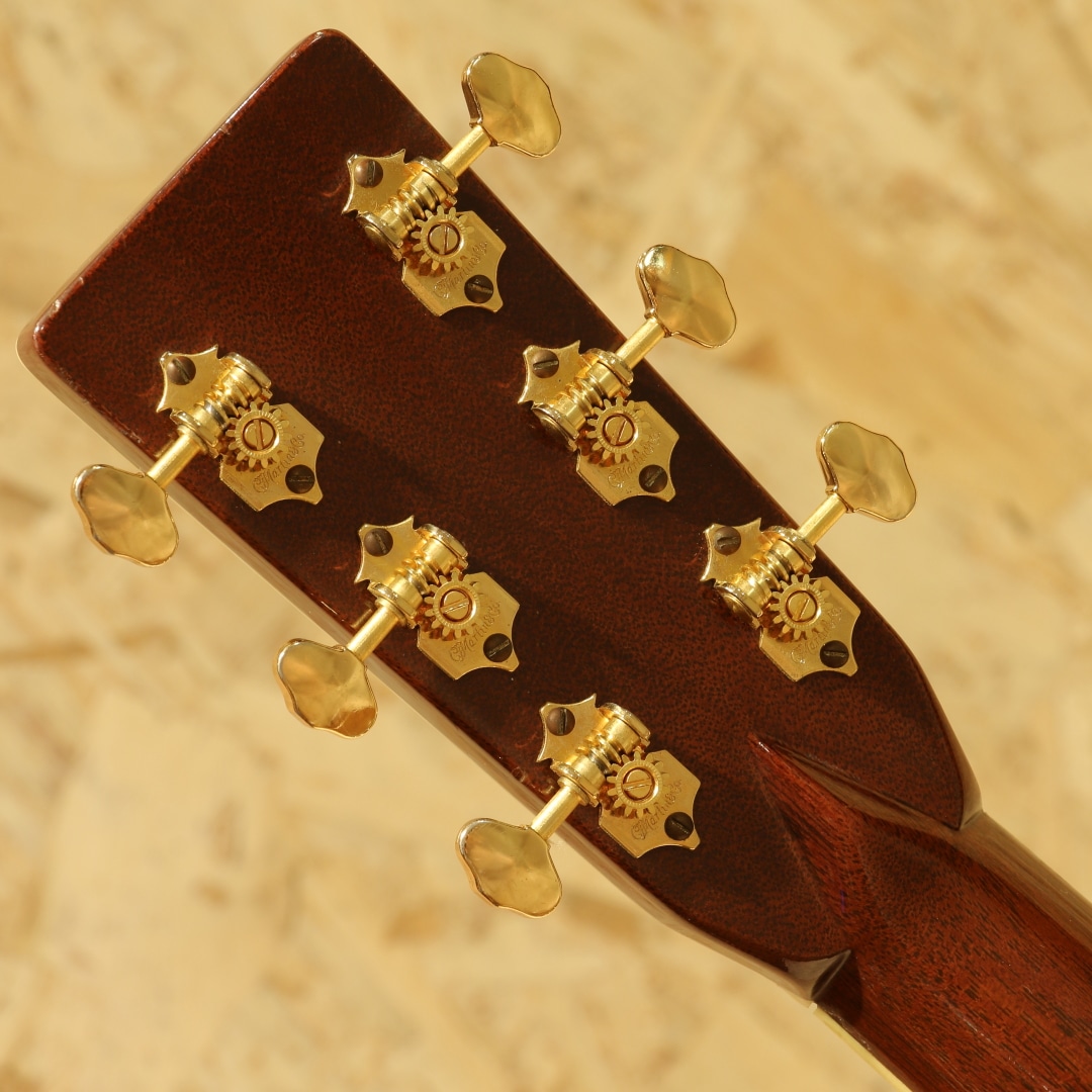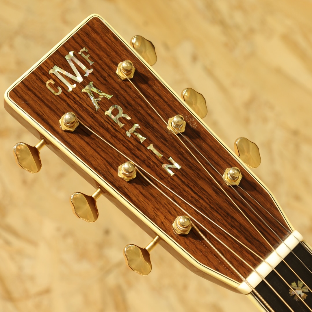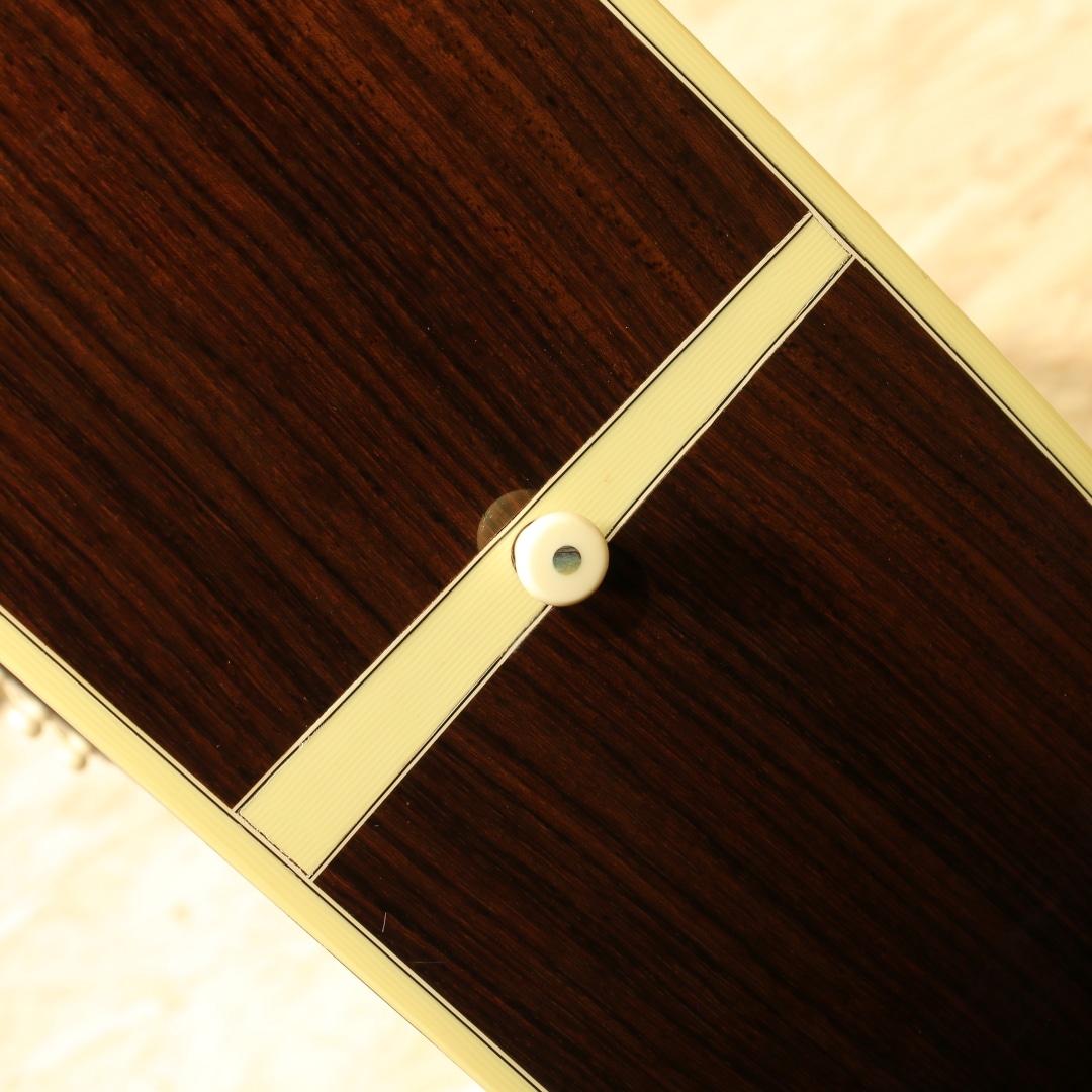 41よりも一層ファンシーなデザインで、マーチン40番台の中でも人気の高いモデル"D-42"。スタイル42は19世紀からある伝統のデザインで、スタイル45の元となる由緒正しいモデルです。本器は1999年製のUSED品。シトカスプルーストップ、イーストインディアンローズウッドサイド&バック、ジニュインマホガニーネック、ロープロファイルネックシェイプ、スタンダードテーパー、エボニー指板&ブリッジ、オリジナルオープンバックゴールドペグ、バーチカルヘッドロゴ、スノーフレークス指板インレイ、ベッコウ柄ピックガード、アバロンロゼッタ&トリム、アイボロイドバインディング、モザイクバックストリップ、フォワードシフテッド・スキャロップドXブレイシング。サイドバックにアバロントリムが入らない代わりに、ブリッジにスノウフレイクインレイを。指板インレイはヘキサゴンからスノウフレイクとなっているのが45との大きな違い。1938年以前のD-45のイメージを基にしたルックスが魅力のモデルです。42.9mmナット幅で現行品よりも狭く親指で握り込みやすい指板幅。現行品の幅が合わなかったという方には是非お試し頂きたいグリップです。そして倍音の絡み合う華やかな響き。しなやかで柔らかい倍音感はマーチン40番台特有と言えるでしょう。空気感を含みふわっと広がるトーン、ですが45よりも若干キラつきが抑えめなため、程よい上品さや倍音感を体感できます。歌モノにおいては45よりも41や42の方が合うという意見もある程、45に負けず劣らずの人気を誇ります。もちろんジャンルを選ぶことなく扱えるという点は流石。歌モノ、フィンガースタイル、オールマイティに使えます。繊細かつドレッドノートに求めたい音量や低音の深みもしっかりと味わえるギター。28からのグレードアップに、45までは手が届かないかなという方にもオススメのモデルです。ボディトップセンターシームの剥がれ修正がされた跡が見られますが、再接着と裏からパッチも当てられ丁寧に補修がされております。ボディサイド6弦側のボトム箇所に2カ所クラック修正をされた跡が見られますが、こちらもしっかりと接着され使用上問題の無い状態です。ボディ1弦バックくびれにバインディング剥がれ修正跡が見られますが、近年アイボロイドでは致し方無いと言えるでしょう。それらを除くとボディトップ面下部のセンターシーム横に見られる当て擦りキズ、6弦側ブリッジ横の延長線にある当てキズ、ブリッジ周りに細やかな当てキズやヘッド2弦ブッシュ周りの細やかなキズ、全体的な薄い線キズなど年式相応の使用感が見られますが、まだまだ使用していける1本。ネック周りの演奏性は整えられ良好な状態、ガシガシ使っていきたいプレイヤーずコンディションの1本です。華やかなルックス、上品なサウンドを持つマーチン40番台。使用感こそ見られるモノの演奏する分には全く問題の無い1本です。お探しだった方は是非この機会にご検討下さいませ。