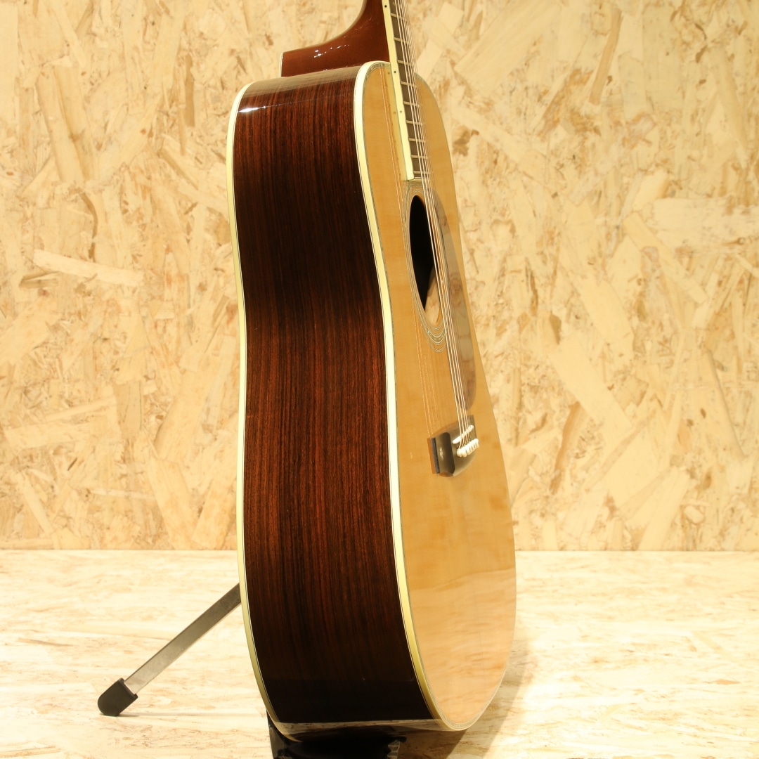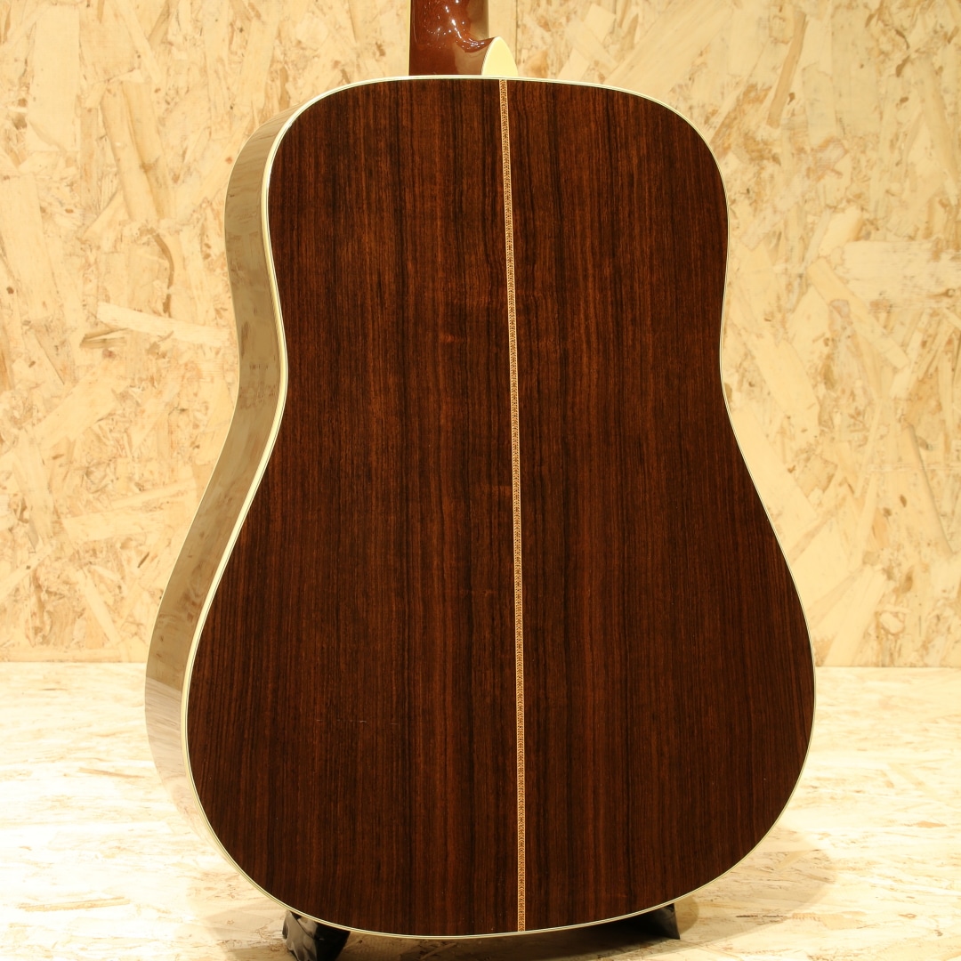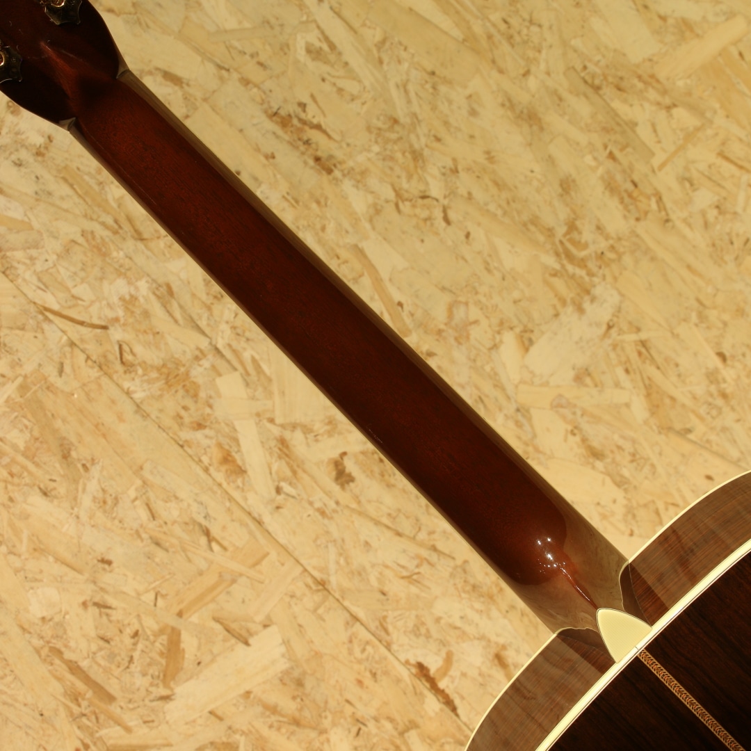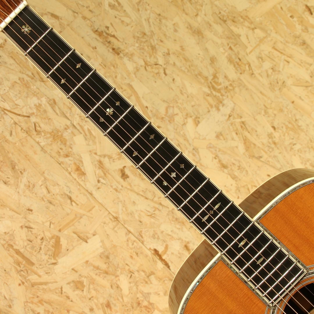 41よりも一層ファンシーなデザインで、マーチン40番台の中でも人気の高いモデル"D-42"。スタイル42は19世紀からある伝統のデザインで、スタイル45の元となる由緒正しいモデルです。本器は1999年製のUSED品。シトカスプルーストップ、イーストインディアンローズウッドサイド&バック、ジニュインマホガニーネック、ロープロファイルネックシェイプ、スタンダードテーパー、エボニー指板&ブリッジ、オリジナルオープンバックゴールドペグ、バーチカルヘッドロゴ、スノーフレークス指板インレイ、ベッコウ柄ピックガード、アバロンロゼッタ&トリム、アイボロイドバインディング、モザイクバックストリップ、フォワードシフテッド・スキャロップドXブレイシング。サイドバックにアバロントリムが入らない代わりに、ブリッジにスノウフレイクインレイを。指板インレイはヘキサゴンからスノウフレイクとなっているのが45との大きな違い。1938年以前のD-45のイメージを基にしたルックスが魅力のモデルです。42.9mmナット幅で現行品よりも狭く親指で握り込みやすい指板幅。現行品の幅が合わなかったという方には是非お試し頂きたいグリップです。そして倍音の絡み合う華やかな響き。しなやかで柔らかい倍音感はマーチン40番台特有と言えるでしょう。空気感を含みふわっと広がるトーン、ですが45よりも若干キラつきが抑えめなため、程よい上品さや倍音感を体感できます。歌モノにおいては45よりも41や42の方が合うという意見もある程、45に負けず劣らずの人気を誇ります。もちろんジャンルを選ぶことなく扱えるという点は流石。歌モノ、フィンガースタイル、オールマイティに使えます。繊細かつドレッドノートに求めたい音量や低音の深みもしっかりと味わえるギター。28からのグレードアップに、45までは手が届かないかなという方にもオススメのモデルです。ボディトップセンターシームの剥がれ修正がされた跡が見られますが、再接着と裏からパッチも当てられ丁寧に補修がされております。ボディサイド6弦側のボトム箇所に2カ所クラック修正をされた跡が見られますが、こちらもしっかりと接着され使用上問題の無い状態です。ボディ1弦バックくびれにバインディング剥がれ修正跡が見られますが、近年アイボロイドでは致し方無いと言えるでしょう。それらを除くとボディトップ面下部のセンターシーム横に見られる当て擦りキズ、6弦側ブリッジ横の延長線にある当てキズ、ブリッジ周りに細やかな当てキズやヘッド2弦ブッシュ周りの細やかなキズ、全体的な薄い線キズなど年式相応の使用感が見られますが、まだまだ使用していける1本。ネック周りの演奏性は整えられ良好な状態、ガシガシ使っていきたいプレイヤーずコンディションの1本です。華やかなルックス、上品なサウンドを持つマーチン40番台。使用感こそ見られるモノの演奏する分には全く問題の無い1本です。お探しだった方は是非この機会にご検討下さいませ。