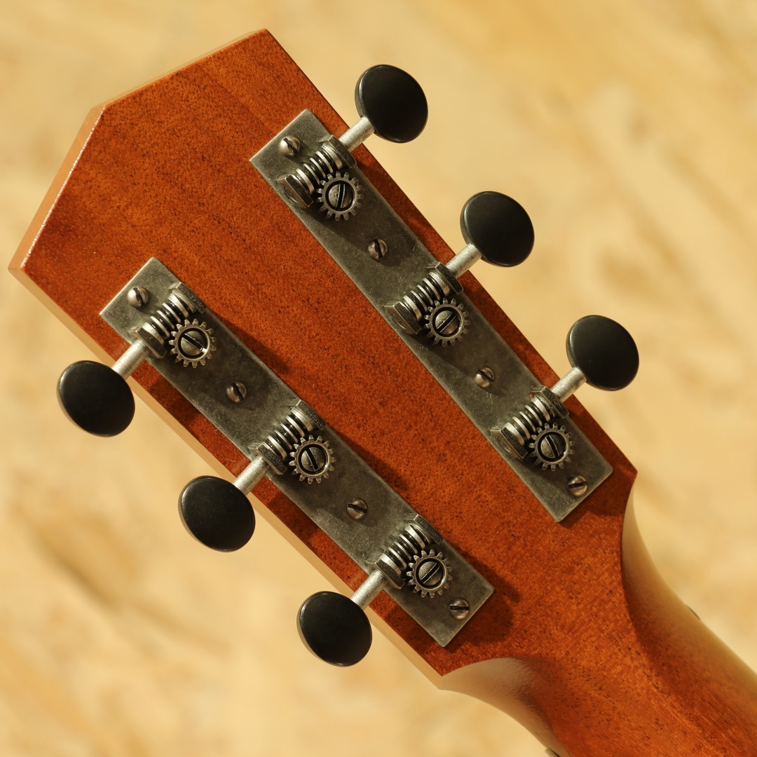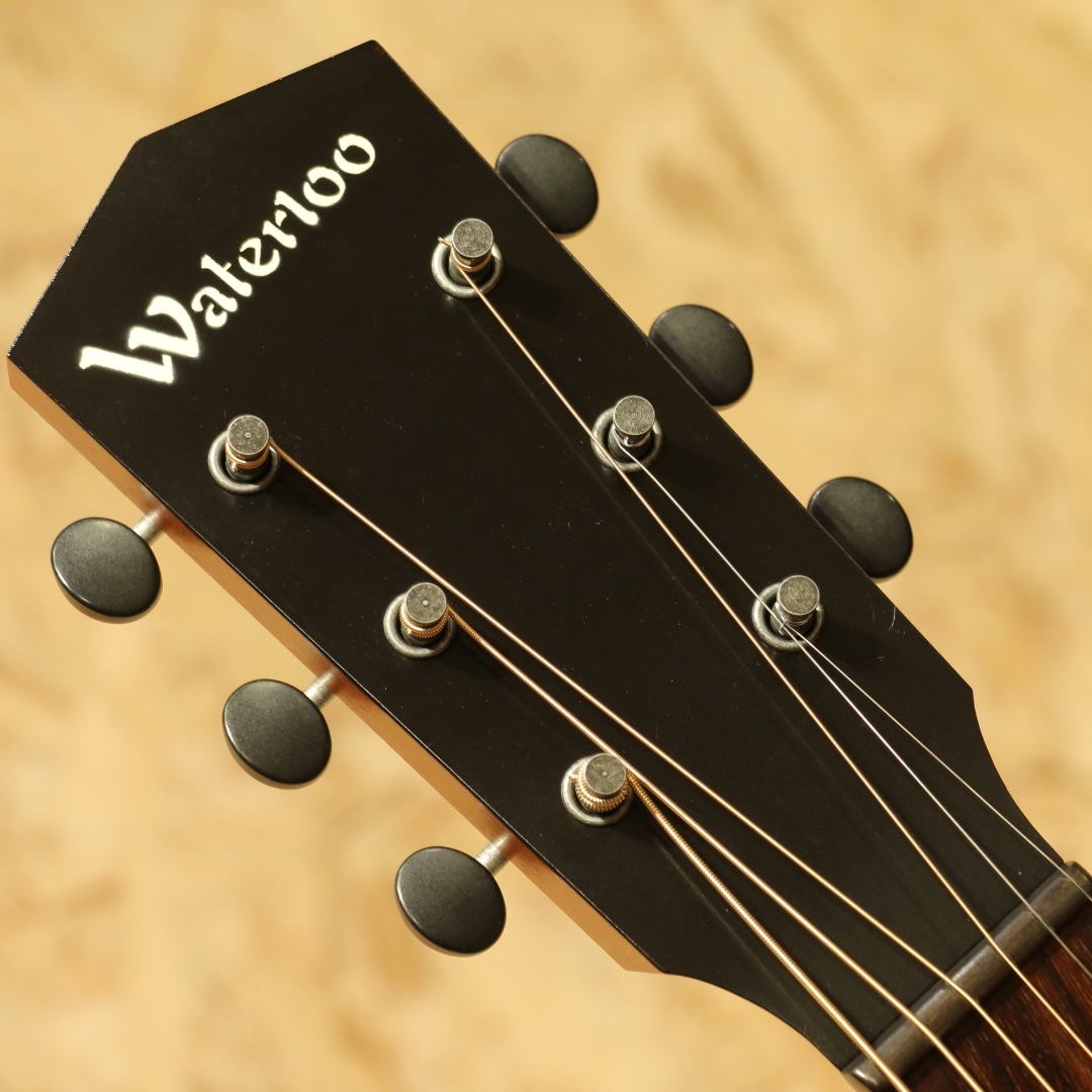 アメリカン・ルーツ・ミュージシャンに愛された古き良き時代のカラマズークオリティを極限まで高め、リバイバル。ギブソンが自社のセカンドブランドにカラマズーと町の名前を付けた事に因み、ビル・コリングスはオースティンの旧名である"ウォータールー"をブランド名にしました。Gibson L-00ボディを持つKalamazoo KG-14スタイルの"WL-14"。スプルーストップ、マホガニーサイド/バック、マホガニーネック、ローズウッド指板、エボニーストレートブリッジ、ゴールデン・エイジ・レストレーション・チューナー、パール指板ドット、アイボロイド1プライロゼッタ/バインディング、セミグロスフィニッシュ。ラダーブレイシング/T-Barロッド仕様のモデルとなります。カラマズータイプらしい簡素なルックスですが、驚くべきコストパフォーマンスが実現されています。楽器としてのクオリティの高さはまさにコリングスギターそのものです。30'sらしい厚めのVシェイプネックですが、しっかりと角度のついた形状で思いのほか手馴染みの良い仕上がりとなっています。ラダーブレーシング特有の箱鳴り感、濃密で、ボリュームがあり、この手のギターに求めたくなるビンテージギターさながらのドライな感触も存分にお楽しみいただけます。とても丁寧に扱われてきたのか使用感のほとんどない大変美しい状態をキープ。ヘッド突板1弦ポスト付近の擦り傷やボディに極僅かなへこみが見られますがご使用への影響はございません。古き良き時代のサウンドを再現したWaterloo、市場での流通も少なくなっていますので是非この機会をお見逃しなく。オリジナルハードケースが付属します。