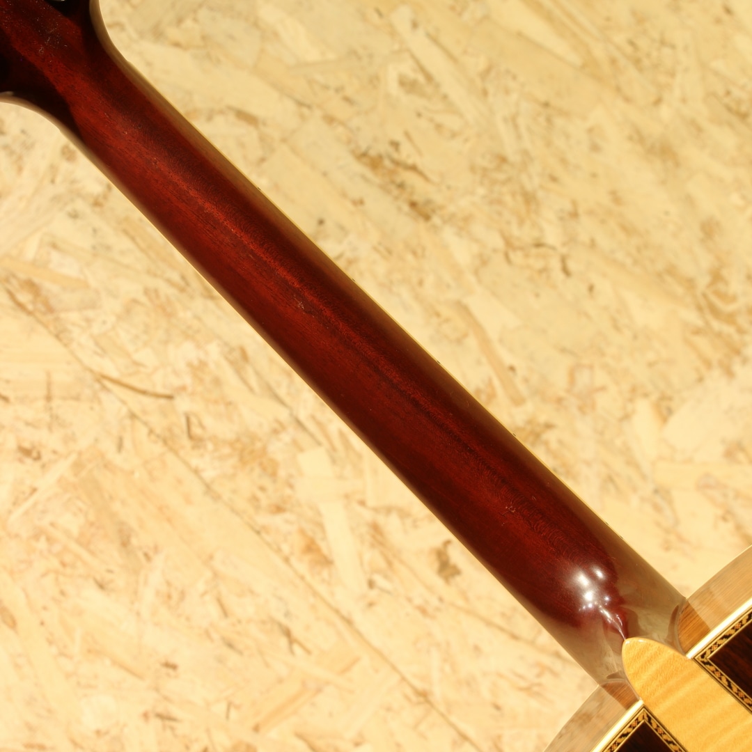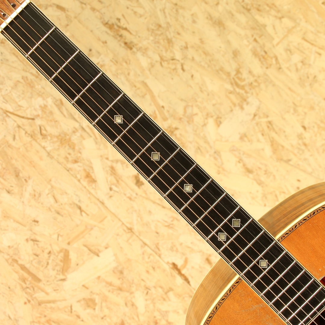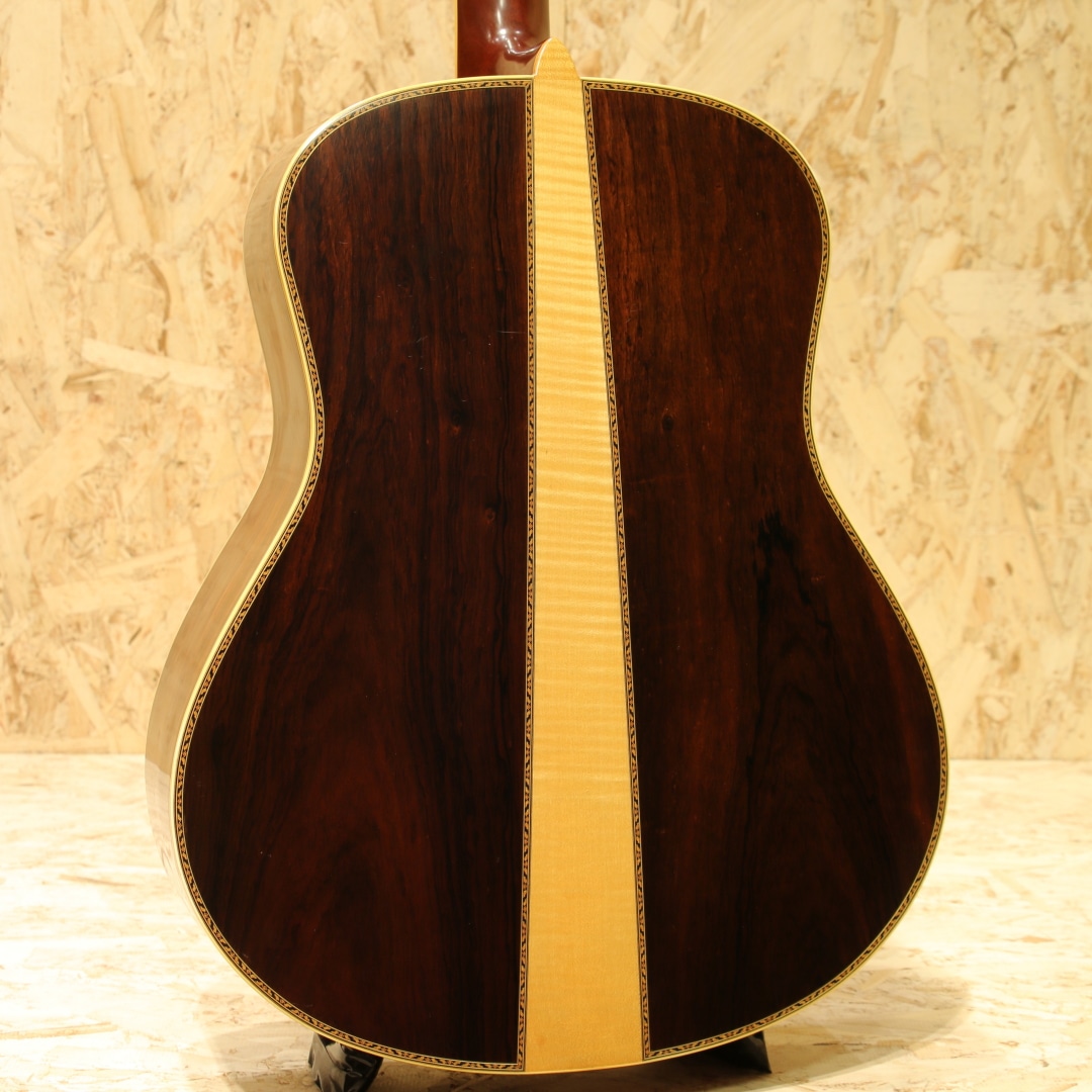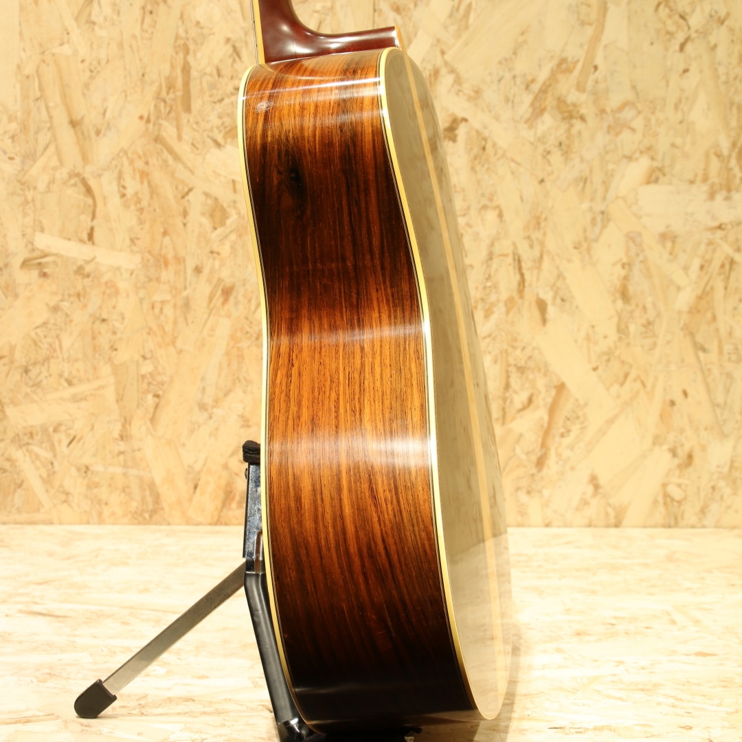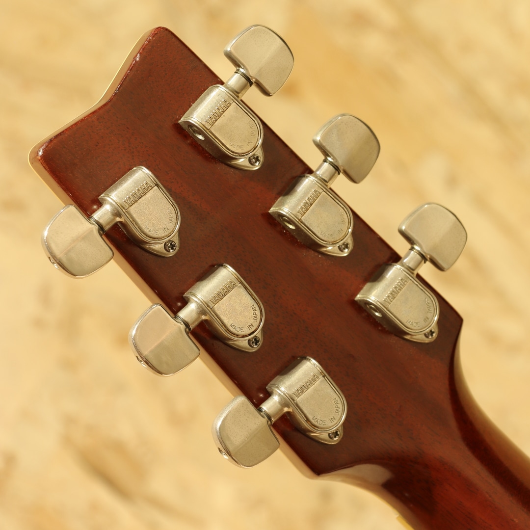 赤ラベルが終わりを迎える七十年代初頭に登場した高級手工モデル"FG-2000"。ライン製品とは一線を画す品質で、今でもコアなファンを持つギターです。トップにはスプルース、サイド&バックは迫力の最高級ハカランダ、バック面は虎杢入りメイプルセンターのスリーピース仕様です。ホンジュラスマホガニーネック、黒々としたエボニー指板&ブリッジ、オリジナルペグ、ハカランダ化粧板、音叉ヘッドマーク、オリジナルロッドカバー、オリジナルダイアモンド指板インレイ、寄木ロゼッタ&トリム、オリジナルベッコウ柄ピックガード、トップグロスフィニッシュ、サイド&バックセミグロスフィニッシュ、トップ構造は特徴的な細身で背丈の低いエックスブレイシングです(ファットで膨らみのあるサウンドの初期仕様は人気があります)。ジャンボボディから吐き出される圧倒的なボリューム、豊かな低音、硬質でクリアーな高音が魅力。強く弾いても潰れずに音像を残したままふくよかなトーンを奏でます。指弾き時には甘く厚みのある音色、FGモデルらしい快活さもしっかりと感じます。ストロークで力強く、アルペジオで繊細に鳴るギターです。1弦側サイド面に木部クラック跡が確認できますが、しっかりとリペア済みですので問題なくご使用いただけます。P.G.周りに見られる弾き傷跡や打痕、引っかき傷などは全体的に見受けられますが、総合的に見れば長年弾き込まれてきたのうかがえる貫禄のあるルックス。ネックの状態も問題なくやや低めに設定されたプレイコンディションで演奏性は良好です。高度成長期の真っ只中にヤマハ社が持てる技術のすべてを惜しまずに注ぎ込んだシリーズで、細かな所まで凝った作りとなっています。その後のヤマハLシリーズ誕生への足掛かりとなったヤマハ史における重要なモデルです。オリジナルハードケースが付属します。