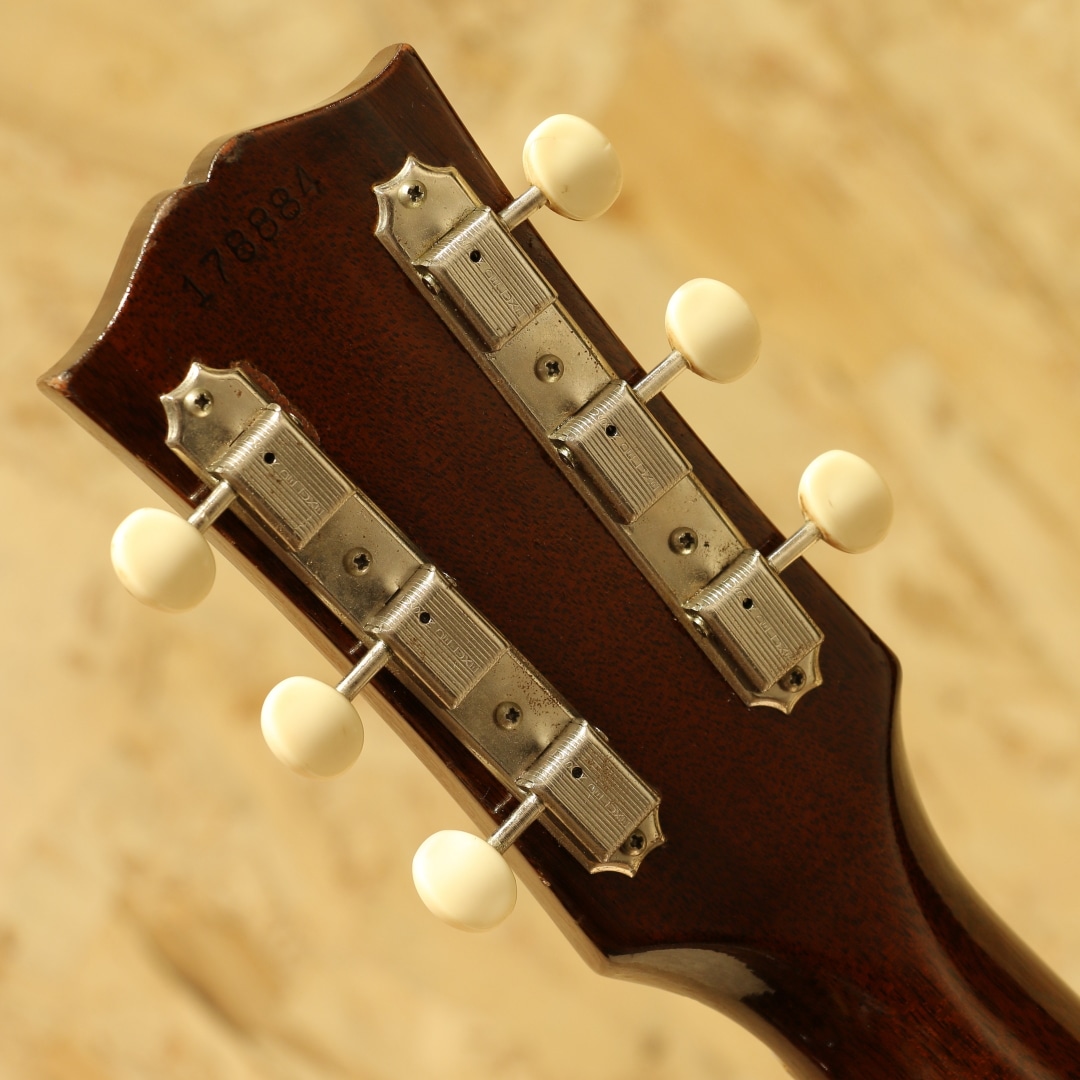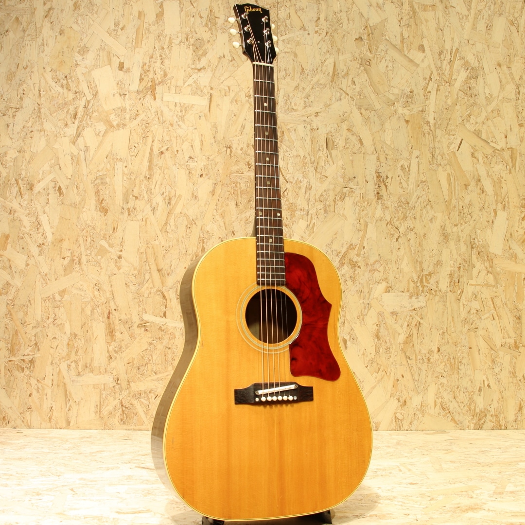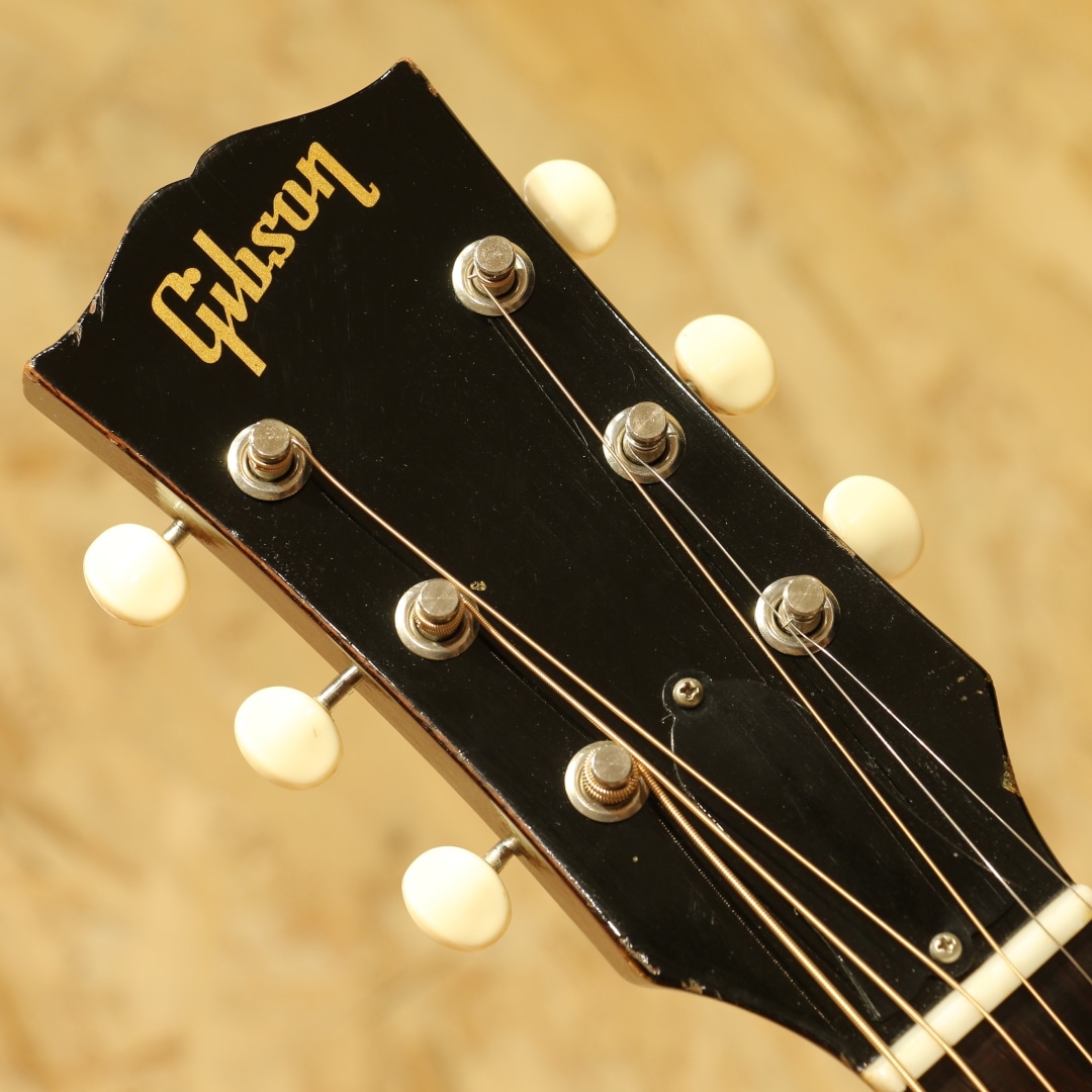 ギブソンを代表するラウンドショルダーボディ・ジャンボモデルのもうひとつの顔"J-50"。"1947年よりJ-45"のナチュラルカラーとしてラインナップされた人気モデル。有名ミュージシャンの使用も多数見られる実力派モデルです。本器は1964年製のVintage品。良い雰囲気の外観&グッドサウンドの1本。スプルーストップ、マホガニーサイド&バック、マホガニーネック、ハカランダ指板&ブリッジ、光沢無しのセラミックアジャスタブルサドル、シングルライン3連クルーソンペグ、オリジナルナット、オリジナルセルロイドラージピックガード、ダブルリングロゼッタ、ノンスキャロップド・Xブレイシング、実測約42.5mmナット幅のレギュラーネック。60年から62年頃にかけてはネックの厚みが薄く、細やかなフレージングの取り回しが良いグリップ。そこから1965年にかけては厚みがじわじわと戻っていき、1965年の途中からはナローネック&14度ヘッドと大きな変化を迎えます。本器はそんなレギュラーグリップ&17度ヘッド仕様を持った64年製の個体。Late60’sと比較すると、よりオープンで明るいトーン、切れ味の鋭くレンジ感の広いサウンドが魅力となる時期です。グリップ感も薄すぎず、厚すぎずで手に馴染む塩梅。手の平でグリップを感じられる安心感があります。やはりパーカッシブとも評される独特のADJサウンド、コンプ感のあるドンシャリとした響き。歌モノに合わせやすく、リズムを刻むにはもってこいのトーン。何よりカッティングでの切れ味、ストローク1発での金属的ともクリスタルとも言えるジャキンという快活なトーンは唯一無二です。抜け感の強くアタック感の強い響きからも細かな手数でのストローク、カッティングで個性を発揮してくれる音色です。全体に薄いオーバーラッカーが施されていますが、大きく風合いを損なうものではありません。ボディトップ面に細やかな当てキズこそ見られますが、板の割れは見られずで非常に良好な状態をキープされた個体。ネック周り、フレットの残り、トラスロッドの残り、サドルの高さも含めた演奏性も良好、60年代前半らしいトーンを非常に良い操作性で体感できる1本です。この時代に求める満足度の高いサウンドをお手元にご用意できます。是非かき鳴らして響かせてください。