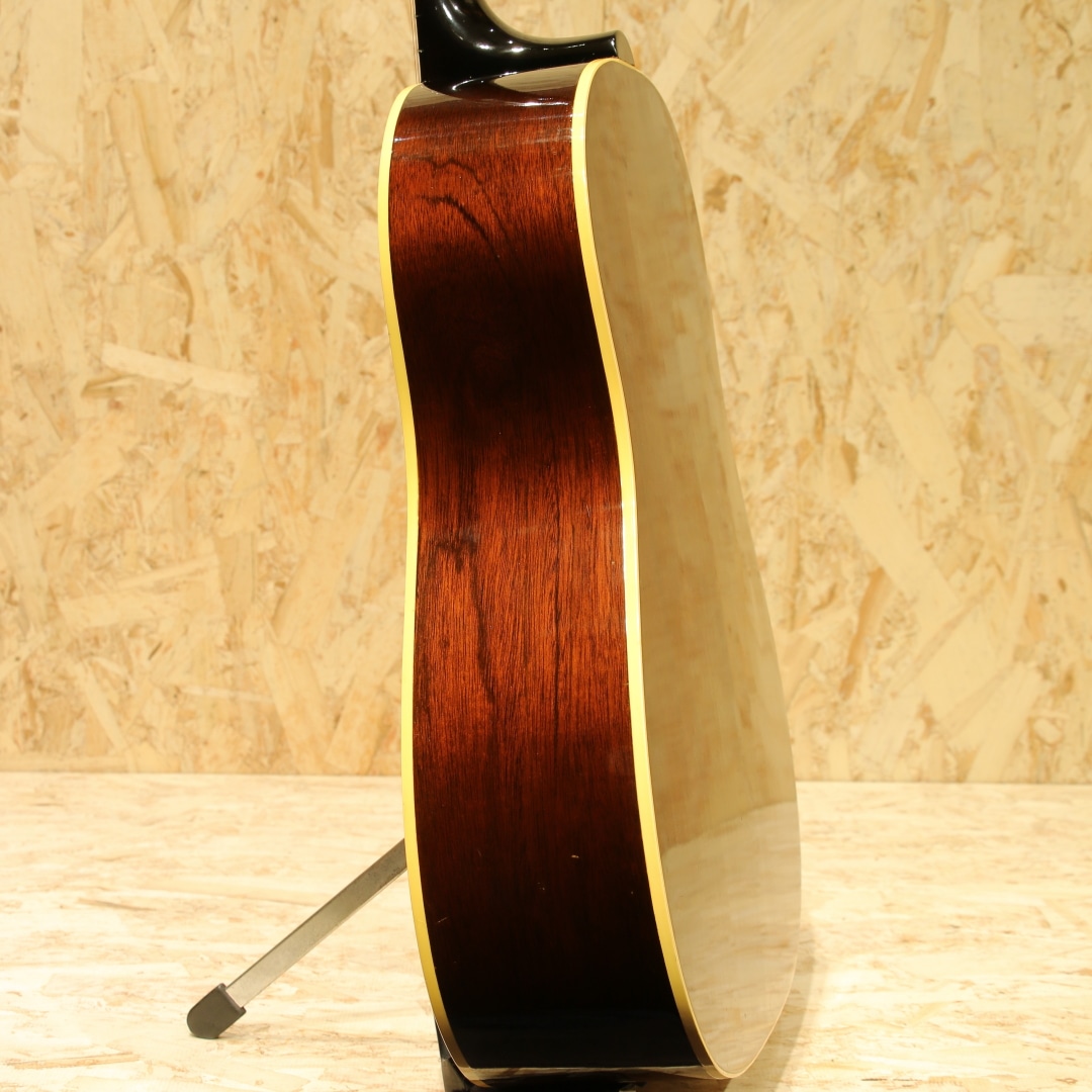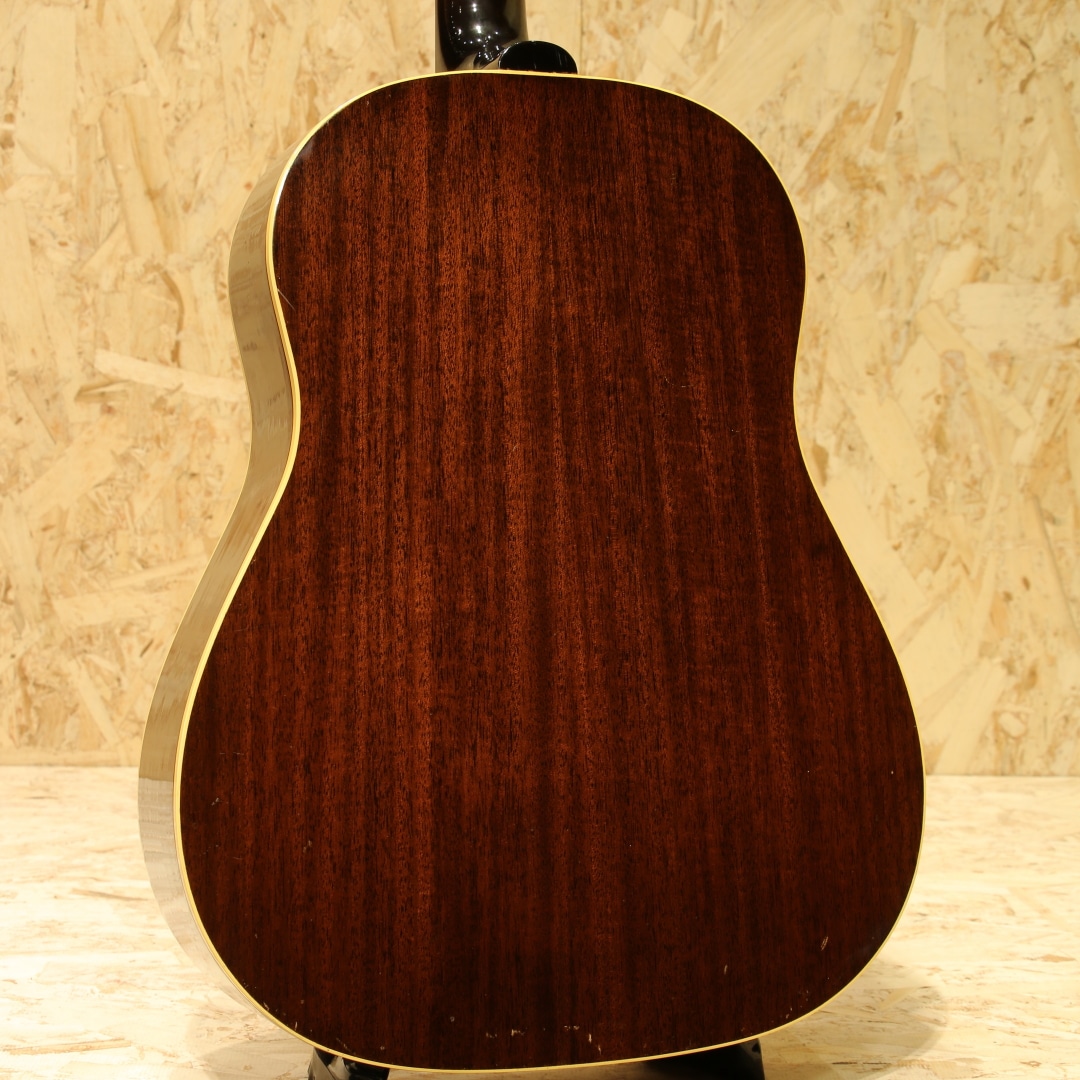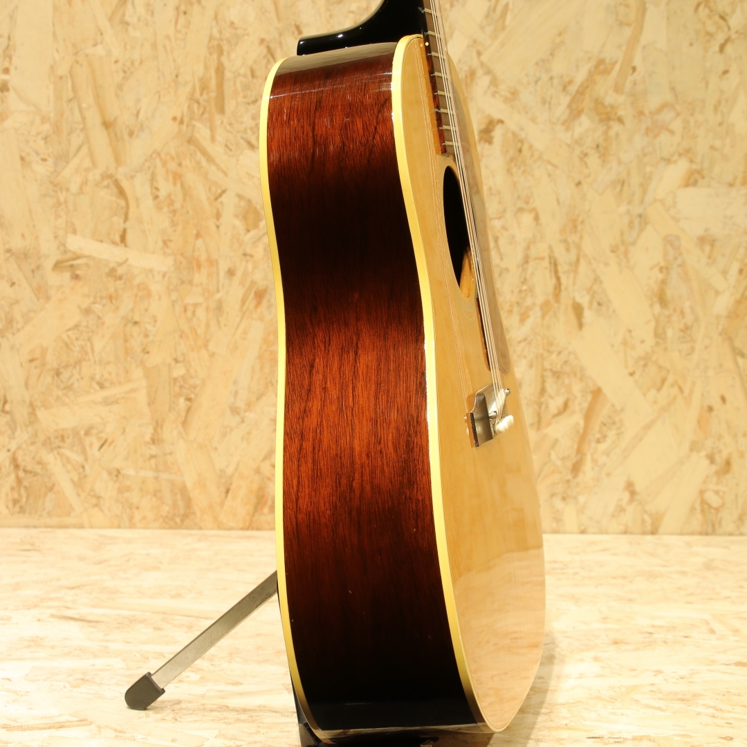 ギブソンを代表するラウンドショルダーボディ・ジャンボモデルのもうひとつの顔"J-50"。"1947年よりJ-45"のナチュラルカラーとしてラインナップされた人気モデル。有名ミュージシャンの使用も多数見られる実力派モデルです。本器は1964年製のVintage品。良い雰囲気の外観&グッドサウンドの1本。スプルーストップ、マホガニーサイド&バック、マホガニーネック、ハカランダ指板&ブリッジ、光沢無しのセラミックアジャスタブルサドル、シングルライン3連クルーソンペグ、オリジナルナット、オリジナルセルロイドラージピックガード、ダブルリングロゼッタ、ノンスキャロップド・Xブレイシング、実測約42.5mmナット幅のレギュラーネック。60年から62年頃にかけてはネックの厚みが薄く、細やかなフレージングの取り回しが良いグリップ。そこから1965年にかけては厚みがじわじわと戻っていき、1965年の途中からはナローネック&14度ヘッドと大きな変化を迎えます。本器はそんなレギュラーグリップ&17度ヘッド仕様を持った64年製の個体。Late60’sと比較すると、よりオープンで明るいトーン、切れ味の鋭くレンジ感の広いサウンドが魅力となる時期です。グリップ感も薄すぎず、厚すぎずで手に馴染む塩梅。手の平でグリップを感じられる安心感があります。やはりパーカッシブとも評される独特のADJサウンド、コンプ感のあるドンシャリとした響き。歌モノに合わせやすく、リズムを刻むにはもってこいのトーン。何よりカッティングでの切れ味、ストローク1発での金属的ともクリスタルとも言えるジャキンという快活なトーンは唯一無二です。抜け感の強くアタック感の強い響きからも細かな手数でのストローク、カッティングで個性を発揮してくれる音色です。全体に薄いオーバーラッカーが施されていますが、大きく風合いを損なうものではありません。ボディトップ面に細やかな当てキズこそ見られますが、板の割れは見られずで非常に良好な状態をキープされた個体。ネック周り、フレットの残り、トラスロッドの残り、サドルの高さも含めた演奏性も良好、60年代前半らしいトーンを非常に良い操作性で体感できる1本です。この時代に求める満足度の高いサウンドをお手元にご用意できます。是非かき鳴らして響かせてください。