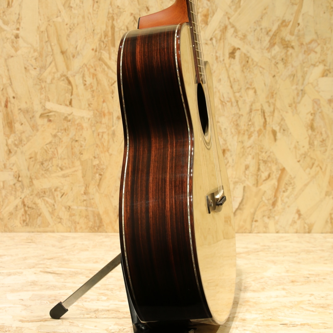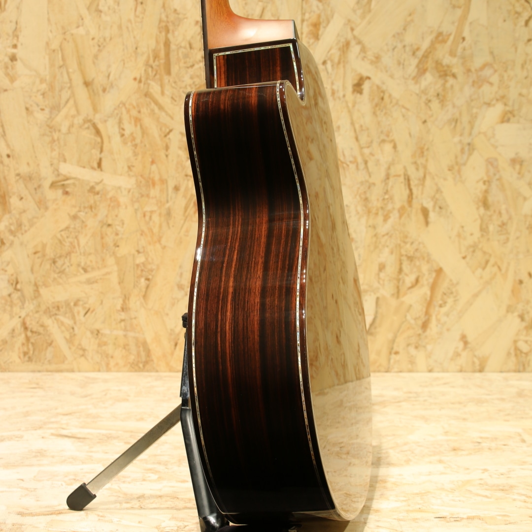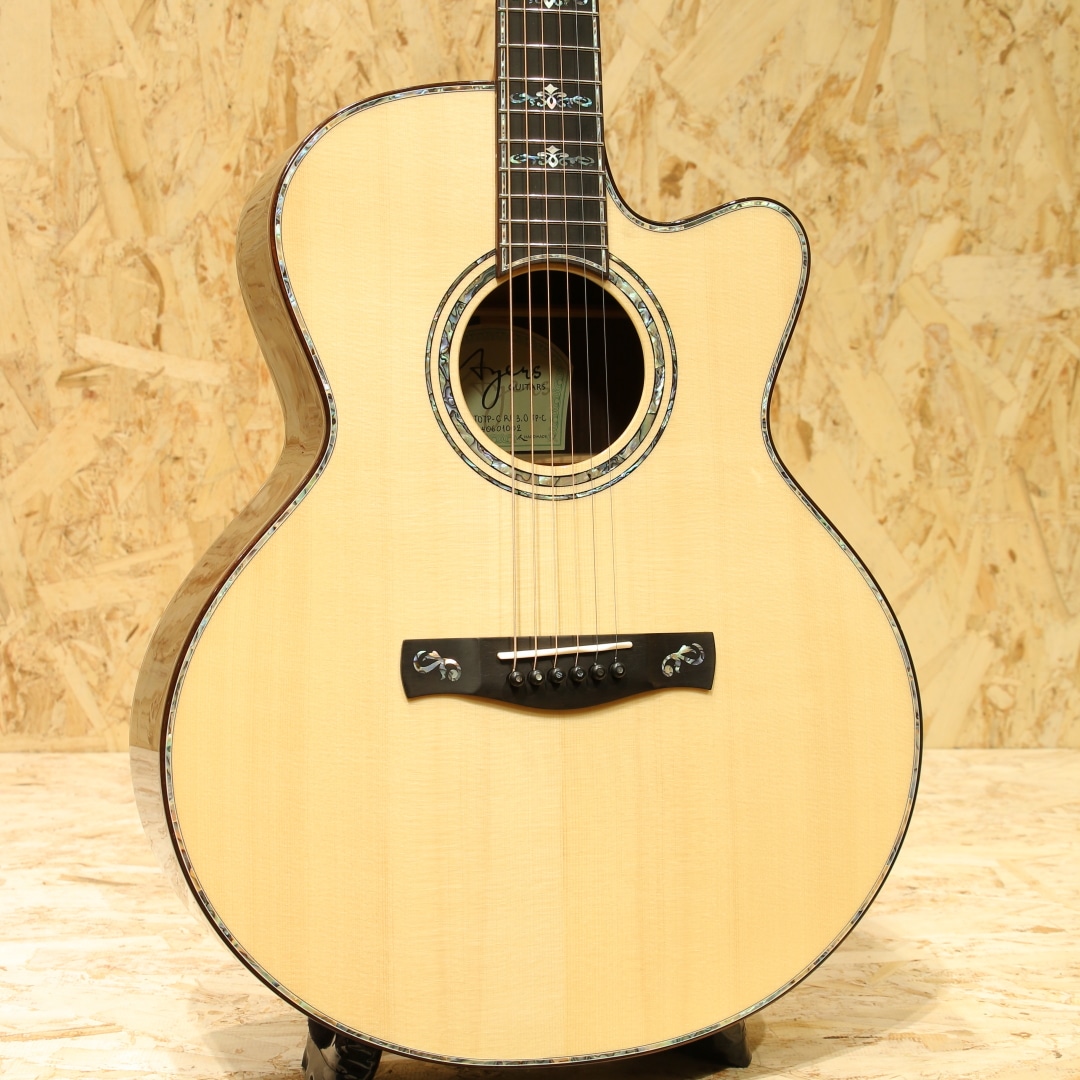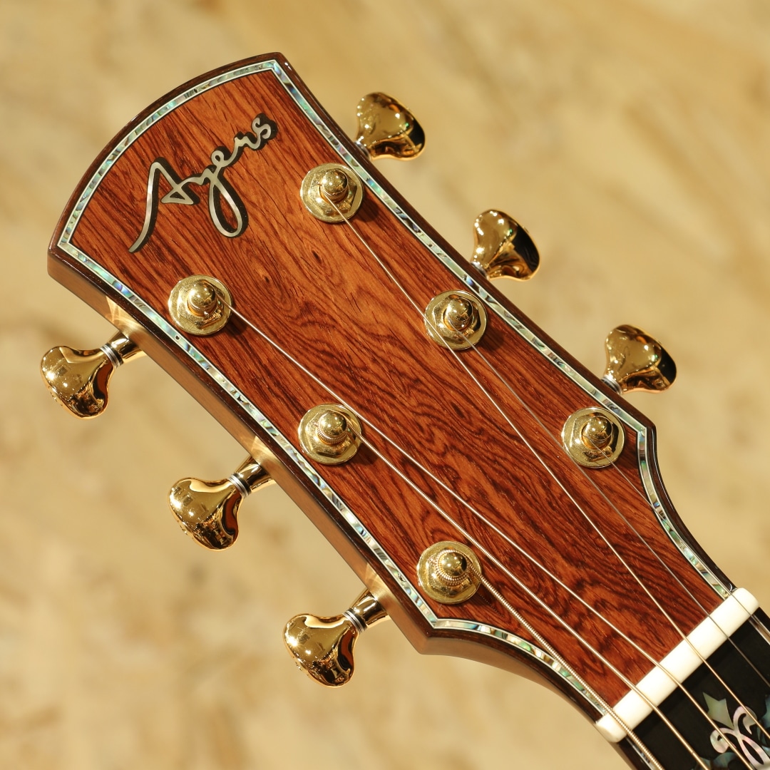 高級なオールハンドメイドギターでしか味わうことができなかった繊細なトーンをリーズナブルに。ベトナムで製造するブランド、”エアーズ”。完全手工にて生産されるハイコストパフォーマンスなブランドです。本器はオリジナルスモールジャンボシェイプモデルの”SJ-07P-CRF 3.0 JP-C”2020年代製、使用感極薄USED品です。目幅の整った美しいアルパインスプルーストップ、インディアンローズウッドサイド&バック、マホガニー1Pネック、エボニー指板&ブリッジ、Gotoh510ロトマチックゴールドペグ、アバロンダブルリングロゼッタ、インディアンローズウッドバインディング&アバロントリム/パフリング、スキャロップドXブレイシング。エアーズは厳選された材料を使用し、ハンドメイドで製作されています。本器はOTS(オーバートーンシステム)が採用された1本、ver3.0に当たる仕様。構造倍音と銘打ったシステムで基音の上に乗る倍音成分を多くし、複雑で広がりのある倍音の多いサウンドを狙っています。同時に音の揺らぎをも生み出して心地よさや美しさを感じられるようなサウンドを得やすい構造。ネック自体は薄めに成形されており、演奏性高く複雑なフレーズでも対応の出来るシェイプ。フィンガースタイルのギターとしては少し狭めな43.5mmナットとなっており、ソロギターなどフィンガーでの細やかなフレーズのフィンガリングでもスムーズな演奏が可能です。ボディ形状はSJ(Small Jumbo)。OMサイズより多くの空気感を含んだトーン、広いレンジ感で濃厚な低音成分を体感できるボディシェイプです。ボディにはアームレストも搭載されており、演奏の際のストレスも軽減し抱えやすい仕様です。スプルースの中でもしなやかで豊かな弾力性を持つアルパインスプルース、タッチレスポンスにも優れ繊細な音色が持ち味、心地よい倍音を含みながら上品なサウンドを生み出します。王道ともいえるインディアンローズウッドとの組み合わせ。芯のあるやや太めなトーンですが重たい印象はありません。サスティーンの伸びやかさは流石の一言。濁らない分離の良さもありながら、しっかりと和音を感じるまとまりの良さもありサウンドバランスにも長けた1本です。ローズウッドの暗めなトーンの箇所にクロスの擦り傷が分かる程度と大変美しい状態です。ネック含めたコンディションも良好、少し低めに整えられてた弦高設定で演奏性も充分。サドルに下げ幅もまだ残っており、今後の仕様も安心です。手工ギターや高級ギターのようなニュアンスを持ち、拘りの詰め込まれたアジアメイドのハンドメイドギター。そのコスパの良さを是非お手元でご体感下さい。オリジナルハードケースが付属します。