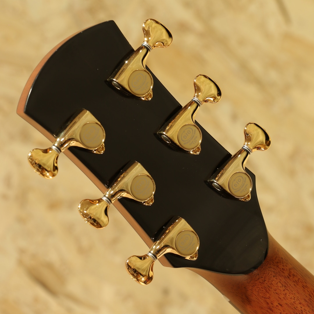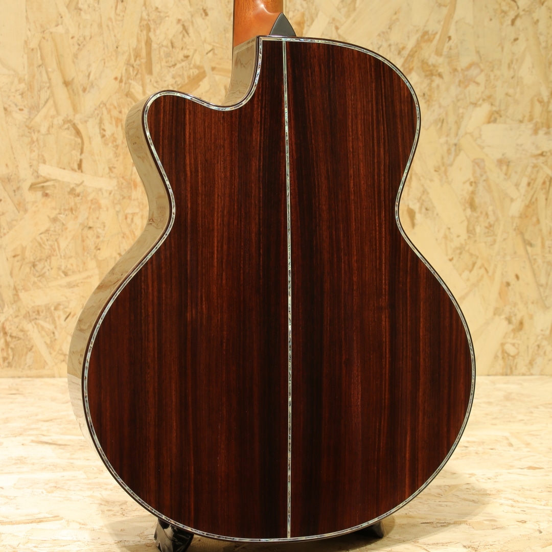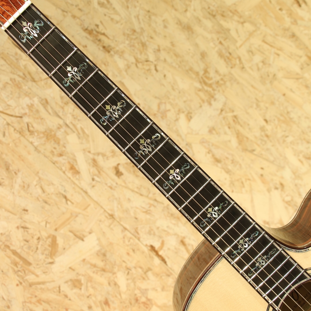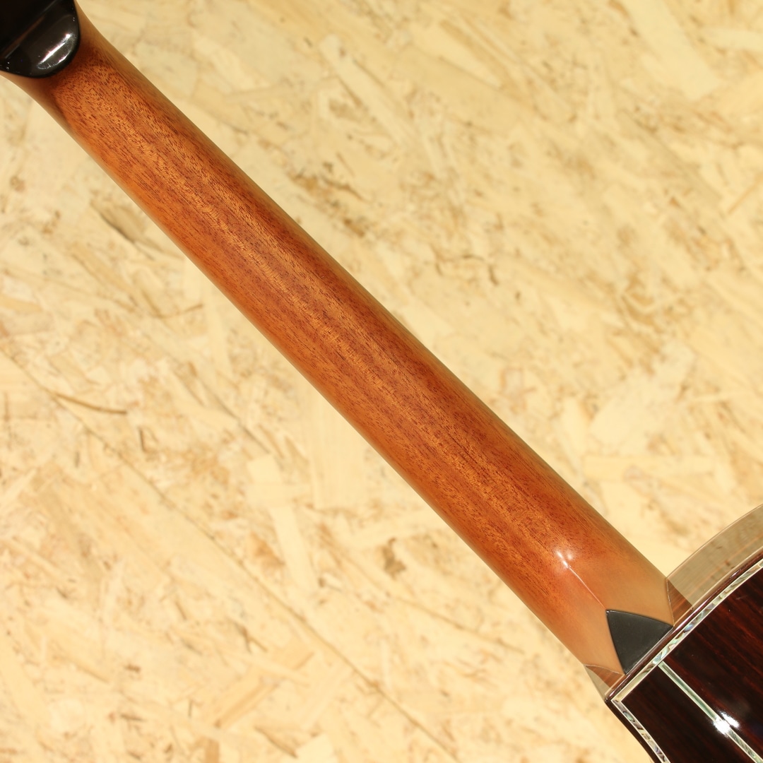高級なオールハンドメイドギターでしか味わうことができなかった繊細なトーンをリーズナブルに。ベトナムで製造するブランド、”エアーズ”。完全手工にて生産されるハイコストパフォーマンスなブランドです。本器はオリジナルスモールジャンボシェイプモデルの”SJ-07P-CRF 3.0 JP-C”2020年代製、使用感極薄USED品です。目幅の整った美しいアルパインスプルーストップ、インディアンローズウッドサイド&バック、マホガニー1Pネック、エボニー指板&ブリッジ、Gotoh510ロトマチックゴールドペグ、アバロンダブルリングロゼッタ、インディアンローズウッドバインディング&アバロントリム/パフリング、スキャロップドXブレイシング。エアーズは厳選された材料を使用し、ハンドメイドで製作されています。本器はOTS(オーバートーンシステム)が採用された1本、ver3.0に当たる仕様。構造倍音と銘打ったシステムで基音の上に乗る倍音成分を多くし、複雑で広がりのある倍音の多いサウンドを狙っています。同時に音の揺らぎをも生み出して心地よさや美しさを感じられるようなサウンドを得やすい構造。ネック自体は薄めに成形されており、演奏性高く複雑なフレーズでも対応の出来るシェイプ。フィンガースタイルのギターとしては少し狭めな43.5mmナットとなっており、ソロギターなどフィンガーでの細やかなフレーズのフィンガリングでもスムーズな演奏が可能です。ボディ形状はSJ(Small Jumbo)。OMサイズより多くの空気感を含んだトーン、広いレンジ感で濃厚な低音成分を体感できるボディシェイプです。ボディにはアームレストも搭載されており、演奏の際のストレスも軽減し抱えやすい仕様です。スプルースの中でもしなやかで豊かな弾力性を持つアルパインスプルース、タッチレスポンスにも優れ繊細な音色が持ち味、心地よい倍音を含みながら上品なサウンドを生み出します。王道ともいえるインディアンローズウッドとの組み合わせ。芯のあるやや太めなトーンですが重たい印象はありません。サスティーンの伸びやかさは流石の一言。濁らない分離の良さもありながら、しっかりと和音を感じるまとまりの良さもありサウンドバランスにも長けた1本です。ローズウッドの暗めなトーンの箇所にクロスの擦り傷が分かる程度と大変美しい状態です。ネック含めたコンディションも良好、少し低めに整えられてた弦高設定で演奏性も充分。サドルに下げ幅もまだ残っており、今後の仕様も安心です。手工ギターや高級ギターのようなニュアンスを持ち、拘りの詰め込まれたアジアメイドのハンドメイドギター。そのコスパの良さを是非お手元でご体感下さい。オリジナルハードケースが付属します。