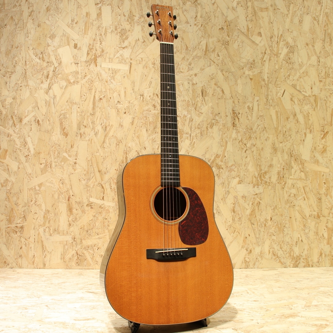 "D-28"とともに歴史を創ってきた、マーチンギターを代表するモデル"D-18"。本器は後にD-18Vへと名称が変更されたヴィンテージシリーズの初期モデル”D-18VM”。1997年製のUSED品です。シトカスプルーストップ、マホガニーサイド&バック、エボニー指板&ブリッジ、ロングサドル、ゴトー製オープンバックペグ、アバロンドット指板インレイ、スタイル18ロゼッタ、べっ甲柄ピックガード、42.9mmナット幅、Vシェイプネック、フォワードシフテッド・スキャロップドXブレイシング。プリウォーマーチンの中でもゴールデンエラとも呼ばれる30-40年代初頭までのギター達。非常に評価が高く、今や中々見ることが出来なくなりました。90年代にはヴィンテージ楽器の魅力が再発掘され、リイシューも盛んに行われる程の人気に。その中でD-18プリウォースタイルを基に製作を行うヴィンテージシリーズの極初期型が本器。今や現行モデルで採用されているエボニー指板&ブリッジ、べっ甲柄ピックガード、オープンバックペグ。更にはVシェイプネックやロングサドルを採用し、よりヴィンテージ要素を詰め込まれた仕様となっています。やはりヴィンテージスタイル故に太いサウンド、コシのある響きを感じられるサウンド。音の厚みを感じられ、乾いたトーンで響きます。マホガニー特有の暖かみを覚える音色、ややレトロさを感じるサウンド。ドレッドノート故のパワー感のある響きが魅力的です。近年マーチンではよく見られるバインディング剥がれの修正跡がボディくびれの4か所に見られますが、致し方ないものと言えるでしょう。丁寧に補修がされており、大きな違和感はありません。ボディサイド1弦側のボトムに2カ所木部割れ修正を行った跡が見られますが、しっかりと接着が施されタッチアップを施されております。ボディ表面に細やかな当てキズ、ヘッド先端にも当てキズやヘッドサイドにはワインダー跡、ボディには薄い擦れキズなど経年感こそ感じられるモノの比較的キレイな状態をキープされている個体。板割れなど致命的なものはなく、細やかなウェザーチェックには貫禄を感じます。ネックのコンディションも整えられ、サドル残も充分。トラスロッド残りは少ないモノの演奏性良好に保たれたUSED品です。トラッドなスタイルを再現したD18。現行品がこのスタイルに近づいたものの、ネックシェイプ由来のモノやロングサドルのルックスは異なります。オールドテイストを感じる1本、是非ご検討下さい。