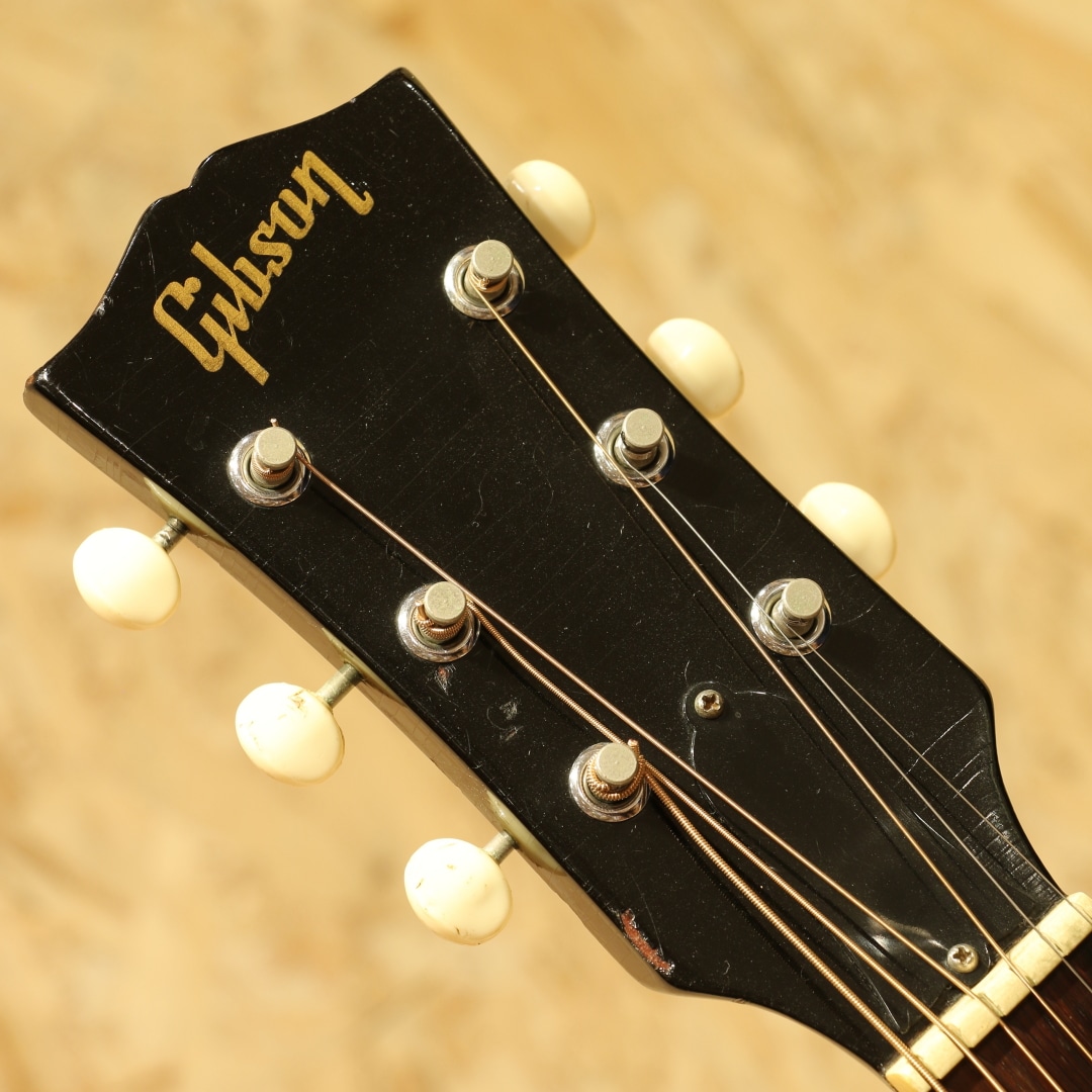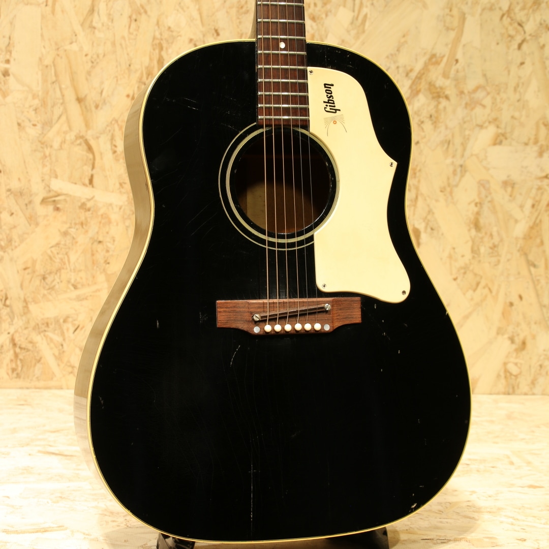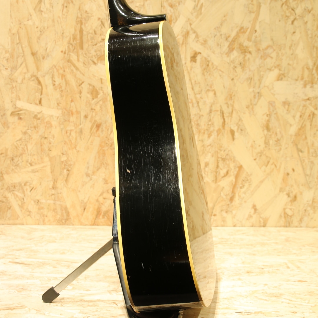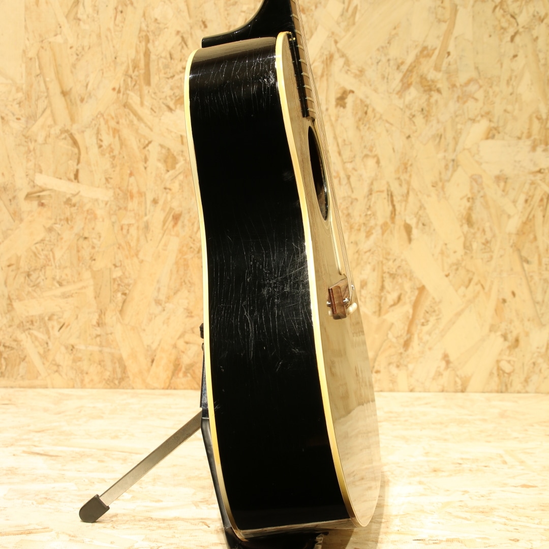ギブソンJ-45は王道中の王道。フラットトップのビンテージ市場の中ではイロモノカラーに関しては比較的保守的ともいえる中、1967年から1969年のわずか短期間にのみ確認されているレアカラーのJ-45。ブラック、レッド、ブラウン、ゴールドなどが確認されており、ビンテージ市場においてそのレアさと群を抜いたルックスの良さ、鉄板のサウンドでの人気が故、高値で取引されています。中でもブラックカラーに関してはとりわけ人気があります。スプルーストップ、マホガニーサイド&バック、マホガニーネック、ローズウッド指板&ボトムベリーブリッジ、ローズウッドアジャスタブルサドル、オリジナルダブルラインクルーソン3perプレートチューナー、ダブルリングロゼッタ、ノンスキャロップドXブレイシング、ブラックカラーフィニッシュ。この時期のレアカラー機種のみ採用されるホワイトカラーのピックガード。68年付近でしか採用されなかったネジ止め仕様、しっかりと残ったホットスタンプロゴ付き。ジャキジャキとコンプレッションの効いた切れの良いサウンドとフィンガリングではショートサスティンでノスタルジックで素朴な表情。他の機種では代用できず新品の60s仕様のギブソンでさえ例外ではありません。トップブリッジ下部からエンドにかけて2列のクラック修正、バックにもセンター付近上下に2箇所クラック修正跡、よく見ればわかる程度ですが、ブリッジ土台のADJ箇所に修正箇所などがあります。フィニッシュはオリジナルで細かいウェザーチェックがびっしり。やや黄色味に焼けたガードが最高にクールです。ナットはオリジナルのミカルタ、若干のすり合わせ、ヘリはありますが問題なく使用出来るレベルでフレットもオリジナルをキープ。ネックはストレートで良好な状態。ADJも下げ幅があり、余裕があります。見た目の風格抜群ですが、まだまだ現役バリバリで使用できる一品。日本国内での流通は常に僅少です。オリジナルのチップボードケース付属です。