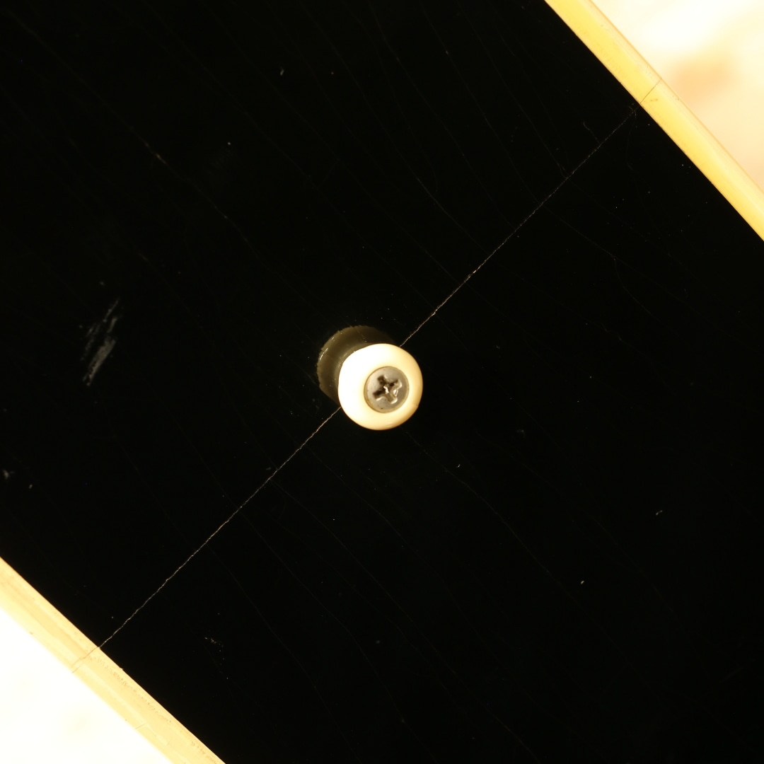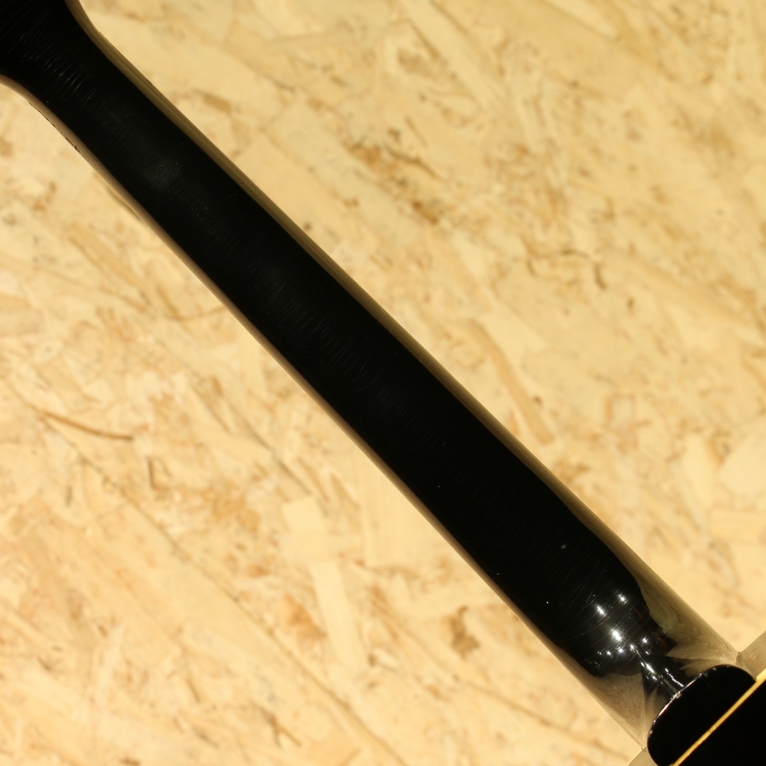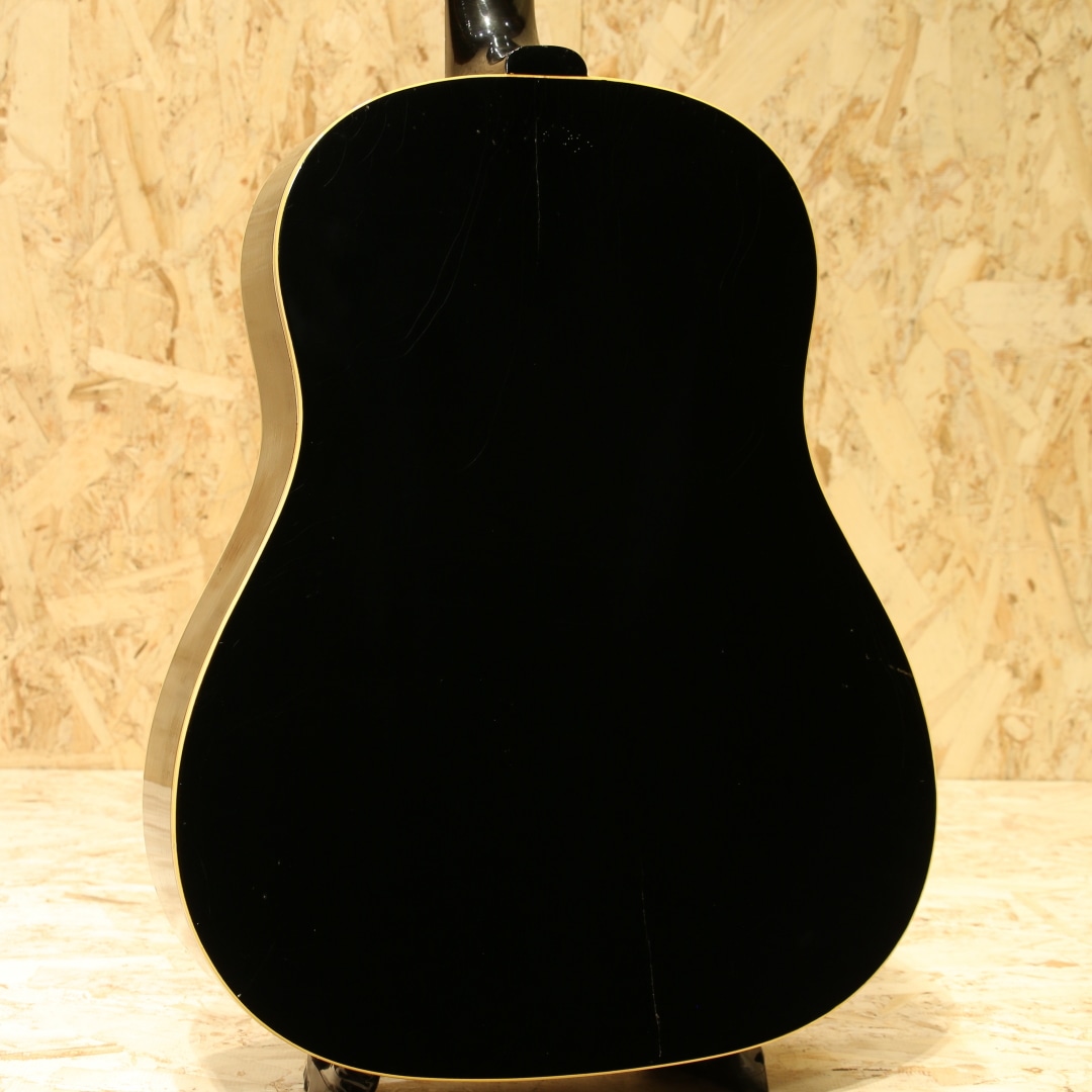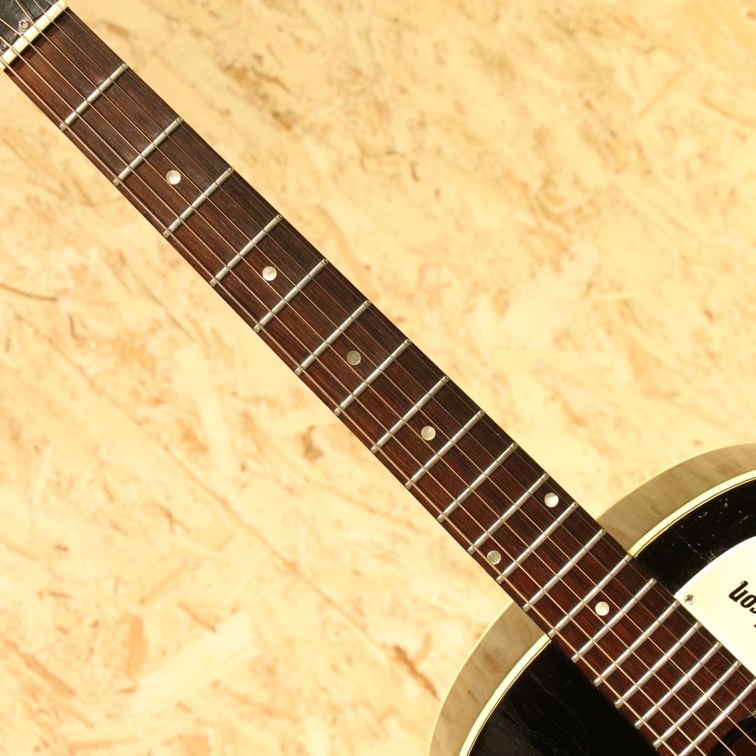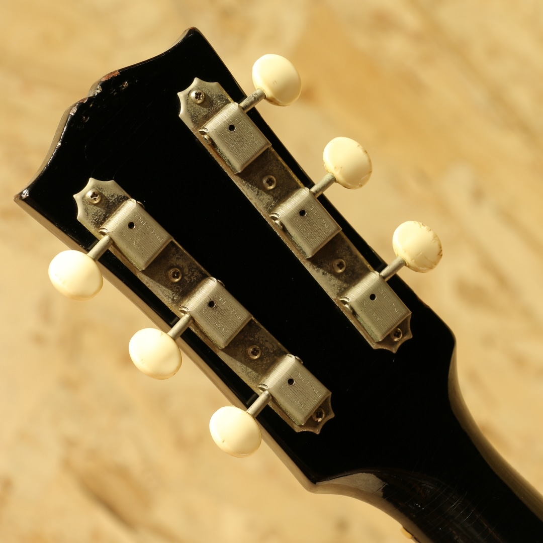 ギブソンJ-45は王道中の王道。フラットトップのビンテージ市場の中ではイロモノカラーに関しては比較的保守的ともいえる中、1967年から1969年のわずか短期間にのみ確認されているレアカラーのJ-45。ブラック、レッド、ブラウン、ゴールドなどが確認されており、ビンテージ市場においてそのレアさと群を抜いたルックスの良さ、鉄板のサウンドでの人気が故、高値で取引されています。中でもブラックカラーに関してはとりわけ人気があります。スプルーストップ、マホガニーサイド&バック、マホガニーネック、ローズウッド指板&ボトムベリーブリッジ、ローズウッドアジャスタブルサドル、オリジナルダブルラインクルーソン3perプレートチューナー、ダブルリングロゼッタ、ノンスキャロップドXブレイシング、ブラックカラーフィニッシュ。この時期のレアカラー機種のみ採用されるホワイトカラーのピックガード。68年付近でしか採用されなかったネジ止め仕様、しっかりと残ったホットスタンプロゴ付き。ジャキジャキとコンプレッションの効いた切れの良いサウンドとフィンガリングではショートサスティンでノスタルジックで素朴な表情。他の機種では代用できず新品の60s仕様のギブソンでさえ例外ではありません。トップブリッジ下部からエンドにかけて2列のクラック修正、バックにもセンター付近上下に2箇所クラック修正跡、よく見ればわかる程度ですが、ブリッジ土台のADJ箇所に修正箇所などがあります。フィニッシュはオリジナルで細かいウェザーチェックがびっしり。やや黄色味に焼けたガードが最高にクールです。ナットはオリジナルのミカルタ、若干のすり合わせ、ヘリはありますが問題なく使用出来るレベルでフレットもオリジナルをキープ。ネックはストレートで良好な状態。ADJも下げ幅があり、余裕があります。見た目の風格抜群ですが、まだまだ現役バリバリで使用できる一品。日本国内での流通は常に僅少です。オリジナルのチップボードケース付属です。