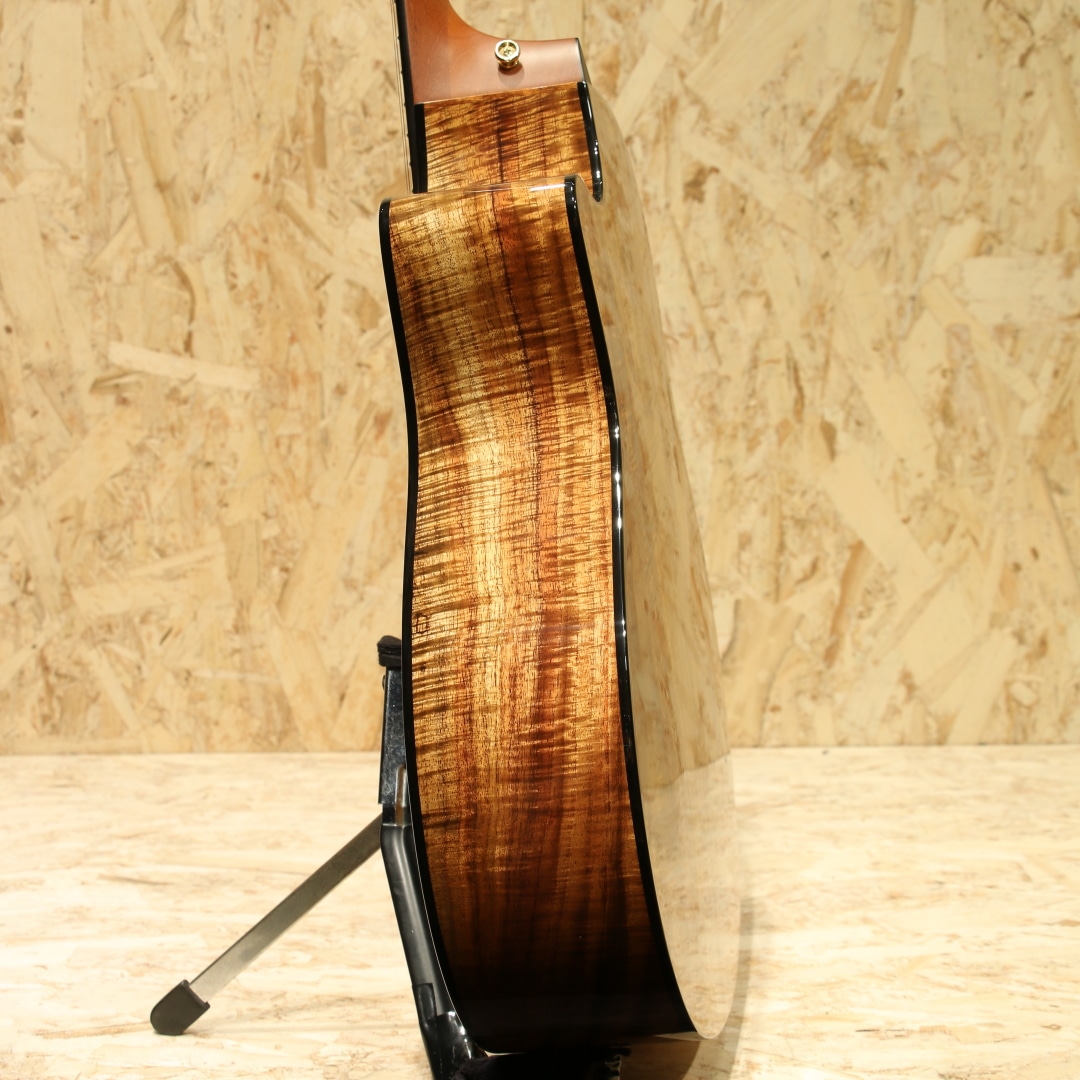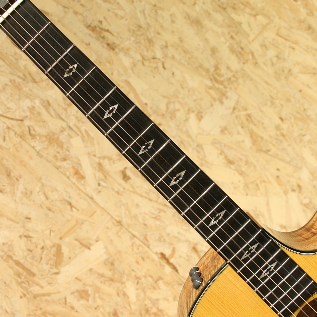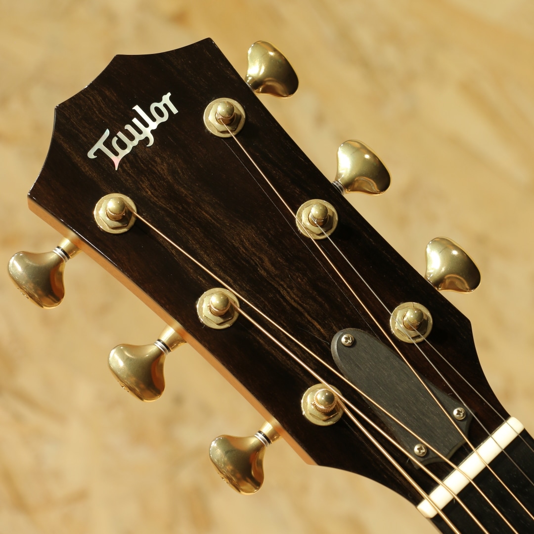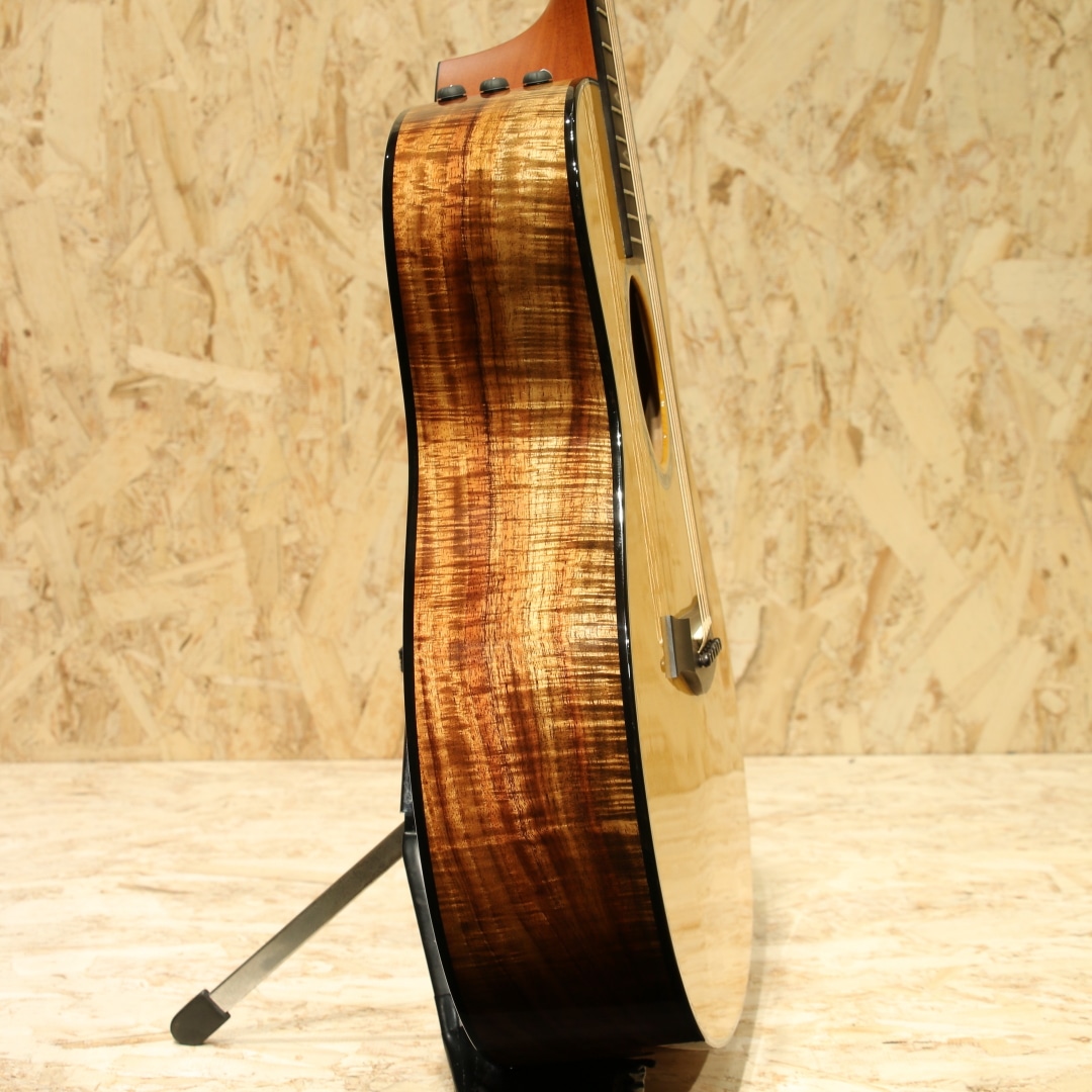 1974年にボブ・テイラーとカート・リスタグの2人によって創立されたテイラー・ギター。革新的なアイデアと高い技術力、ハイセンスなマーケティングで2000年代より急速に成長し、今や世界のトップアコースティックブランドとして、一般ユーザーからプロミュージシャンまで、幅広い層から確固たる支持を得ています。本器はテイラーのラインナップ上杢目が特徴的な”Kシリーズ”。ハワイアンコアのエキゾチックな杢目を活かした高級なシリーズ、日本限定モデルとして製作された機種”K16ce LTD”。2016年製USED品。アディロンダックスプルーストップ、ハワイアンコアサイド&バック、エボニー指板&ブリッジ、ノンピックガード、ベネチアンカッタウェイ、グロストップ仕上げ、スキャロップブレイシング、オリジナルES2ピックアップ搭載。テイラーは木材の保護活動も行っており、カメルーンでエボニーの植林を行う等ギターを作りながら環境にも配慮した製作を行っています。その一環でハワイ島のコアの森を復元・再生活動も行いサスティナビリティのあるモノづくりを現在においても継続しています。その保護している木材であるハワイアンコアを贅沢に使用した高級シリーズがKシリーズ。本器はテイラーのオリジナルシェイプの中でも中間的なサイズに位置するグランドシンフォニー(GS)サイズ。お馴染みの薄めネックで細やかなフレーズも演奏しやすく握り込みやすいグリップ、カッタウェイも搭載されハイポジションまでも弾きやすい仕様とされています。トップにアディロンダックスプルースを採用しているだけあり、太く躍動感のあるサウンド。ですがサイドバックもハワイアンコア材がパリッとした中高音から高音にかけてピークのある材のため、キラっとした煌びやかさも持ち合わせています。艶やかでもたつきの無いスッキリとした響き、各弦の分離感もありますが、適度に混じって纏まる等オールマイティにこなせるポテンシャル。元より上品なサウンドを生み出すテイラーらしいトーン、よりダイナミックで華やかな音色を味わえる限定モデルです。ピックアップシステムにはテイラー独自のシステムES2を搭載。テイラーが研究しサドルの動きが上下ではなく前後である事を突き止め、それを基にサドル横にピエゾを仕込んだ構造。エア感のあるナチュラルなサウンドを出力することが出来ます。EQを掛けて出力可能、コントロールはVol,Treble,Bassと非常にシンプルな構成。簡単な操作で最適なサウンドを造りやすい人気の高い優秀なシステムです。ヘッド先端に薄い当てキズが見られるのが非常に惜しい点。その他ヘッド表とボディバックに極々僅かな範囲に擦りキズが見られますが、非常に使用感の薄い状態をキープされています。ネックコンディションもストレートを保たれ抜群の演奏性、弦高も現代の標準弦高に揃えられておりモダンなテイラーの演奏性を存分に体感できる1本です。サイドバックの贅沢にびっしりと入った杢、眺めて良し弾いて良しサウンド良しの1本。日本限定モデルとして製作、普段のテイラーとは異なったテイストを楽しめる個体。杢目フェチの方にもご納得頂けるであろう外観、エレアコとして実用性を求める方にも満足感の高いギターです。是非お手元にいかがでしょうか。