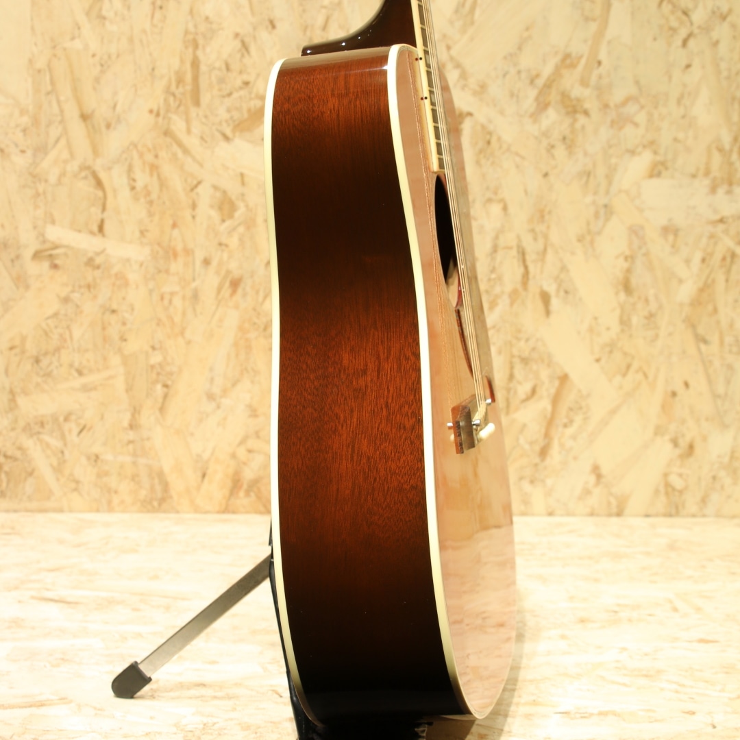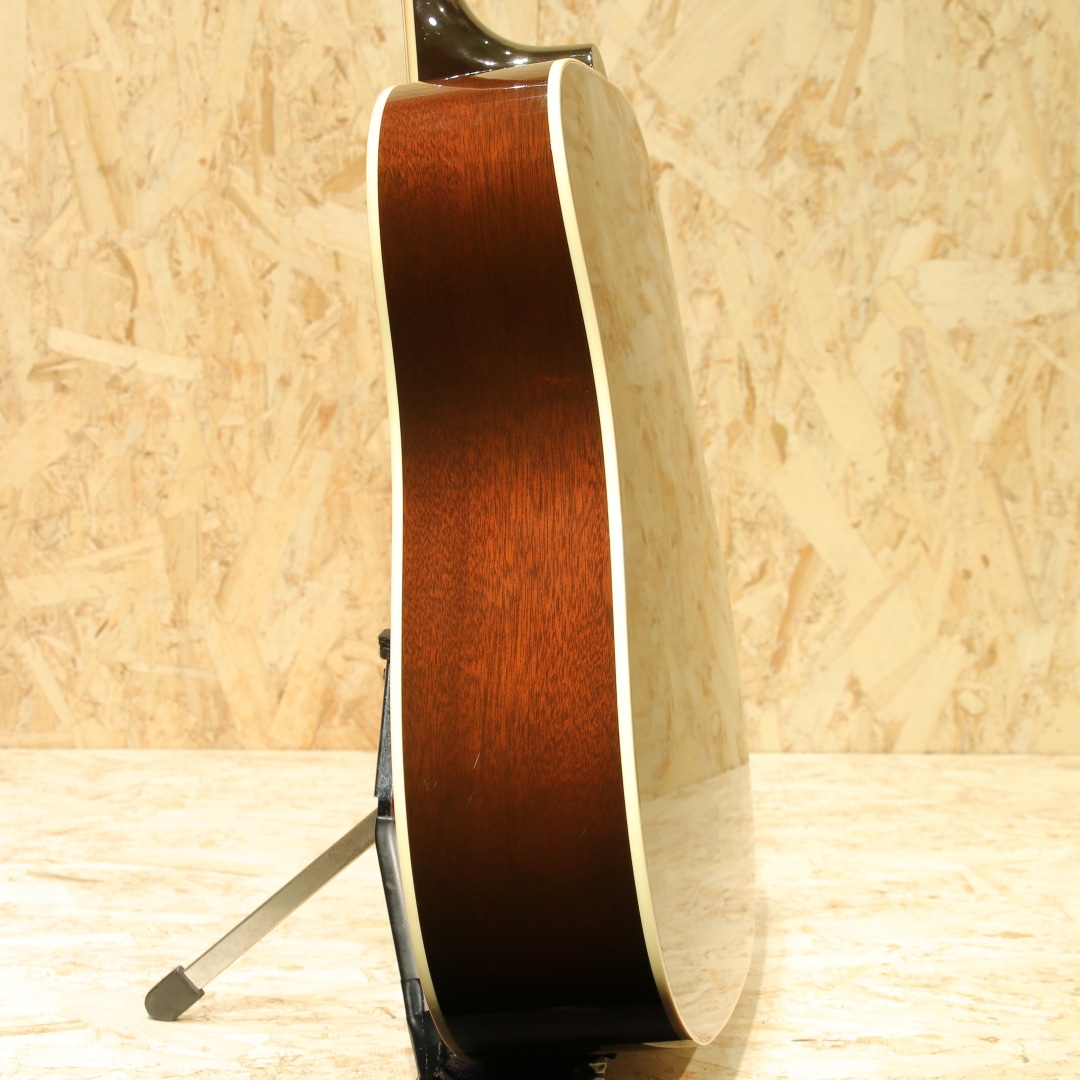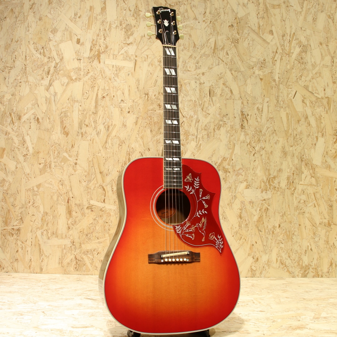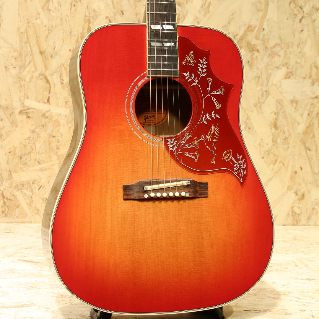 ハチドリをモチーフとした斬新なピックガードデザインで1960年の登場当時から注目と人気を集めた""ハミングバード""。日本においてもギブソン定番機種としてJ-45と肩を並べるモデルとなっています。本器は当時のリミテッド品として製作された60年代仕様のハミングバード。2012年製のUSED品です。スプルーストップ、マホガニーサイド&バック、マホガニーネック、ローズウッド指板&ブリッジ、ADJサドル、キーストーンクルーソンタイプゴールドペグ、ダブルパラレログラム指板インレイ、ダブルリングロゼッタ、彫り込みべっ甲柄ピックガード、スキャロップドXブレイシング。元々はシンガーソングライターの為に設計されたと言われるハミングバード、”ハニートーン”とも評されるサウンドや華やかなルックスの虜になる方も多く非常に人気の高いモデルです。60年代の人気仕様が詰まった本器。60年代でも前半を彷彿とさせるレギュラーネックにホワイトサドル、鮮やかな赤の色合いは60年代中期以降の特徴、多くの方がイメージするルックスを踏襲して製作された1本。J-45と比較しても軽快でオープンなサウンドが特徴的、ADJ仕様ともなれば強い個性を持ったサウンドを武器に出来るスペック。ノーマルスロット仕様に比べ、よりドンシャリ方向へとサウンドが変化。音の立ち上がりも早くなり、アタックの効いたパーカッシブなスタイルにおいて唯一無二とも言えるサウンドを発揮します。軽快かつエアリーに、手数の多いピッキングにおいても声を邪魔しないようなサウンドは歌モノの伴奏としてとても重宝されます。ボディにぽつぽつと僅かん打痕が数か所、ピックガードの模様も僅かピックスクラッチで模様が消えている箇所も見られますが、その他は全体的に使用感は少なく非常にキレイなコンディションをキープされている本器。ネックコンディションも良く演奏性良好、音楽を存分に楽しめるプレイコンディションの1本です。60年代オリジナルヴィンテージは年々高騰しており中々手に取ることが難しくなっておりますが、本器はその良さを引き継いだ近年製のハミングバード。持ち運びに適したギグケースが付属します。