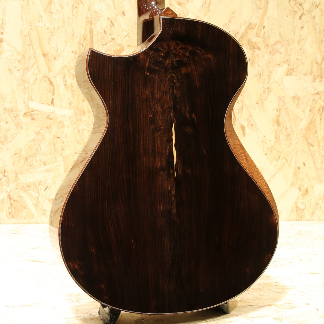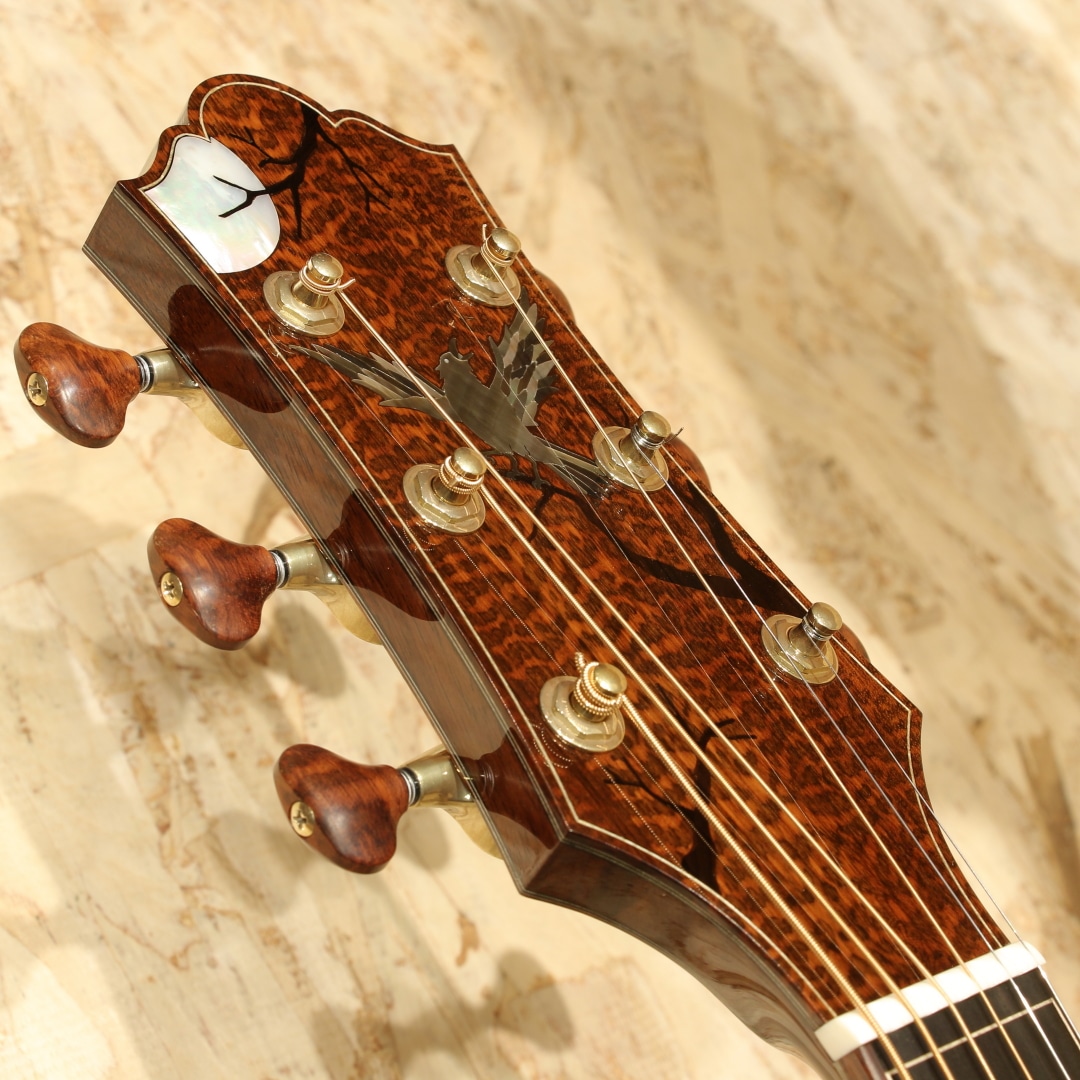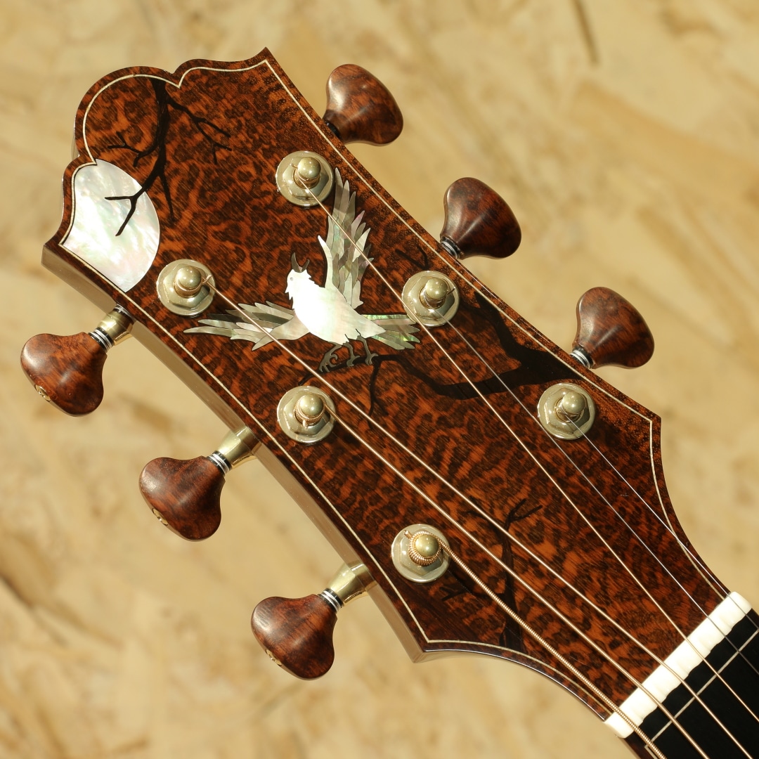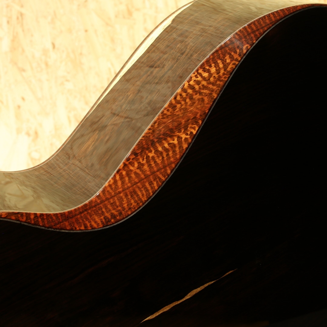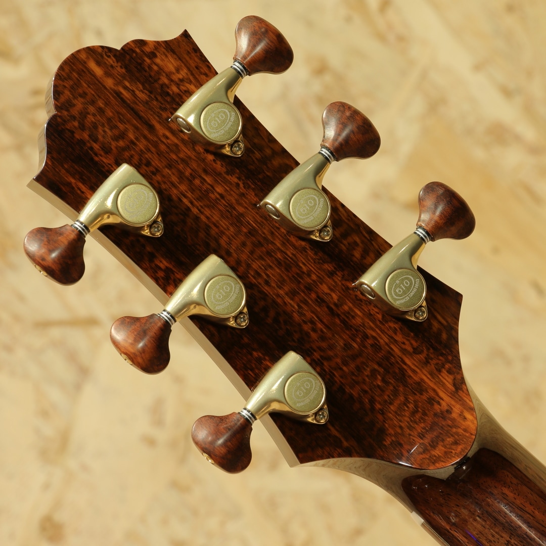 SJシェイプカッタウェイをベースに美事なマテリアルを贅沢に配した"SJ Cutaway"。トップには揺らめく美しいベアクロウ杢が全面に入ったジャーマンスプルース、サイド&バックには比重が高く重厚な音色が特徴で大きめサイズの材料の確保が特に難しくなっている高級材のアフリカンブラックウッドを使用。1ピースのインディアンローズウッドネック、エボニー指板、ゴトー製SGV510XGペグ、うろこ状に揺らめく高級材のスネイクウッドブリッジ&3Dロゼッタ、ヘッド&バックプレート、バインディング&バックコンターにも贅沢にスネイクウッドが使用され統一されています。3Dフローレンタインカッタウェイ、スキャロップドXブレイシング。とても美しい仕上げと高い完成度で、弊社200周年モデルとして最高の技術と素晴らしい材料を配して作り込まれた美事な1本。比重のある材料をあえて使用し、重心が低くより軸ブレ感のない倍音豊かなサウンドに仕上がっています。発音にパンチがあり野太く力強いサウンド。決してソリッドな金属質な響きではなく、重厚かつ広がりのあるサウンドになっています。堅牢なイメージとおもいきやとてもセンシティブなタッチにも明瞭に反応してくれる側面も持ち、材料を扱う技術の高さが伺えます。ネックは手になじみやすい44.5mm幅ナットと緩やかなシェイプ。サウンド、演奏性どちらも最高レベルです。