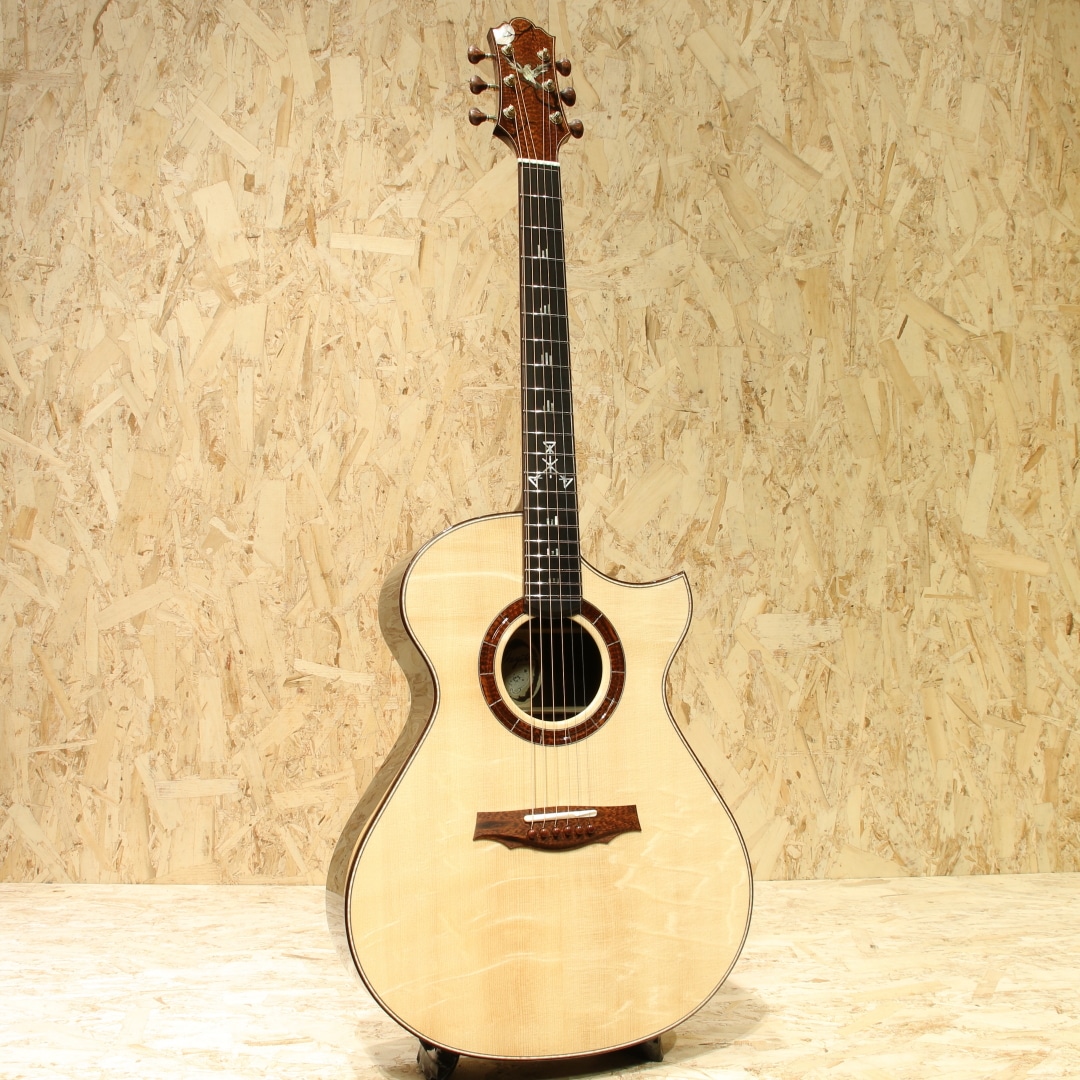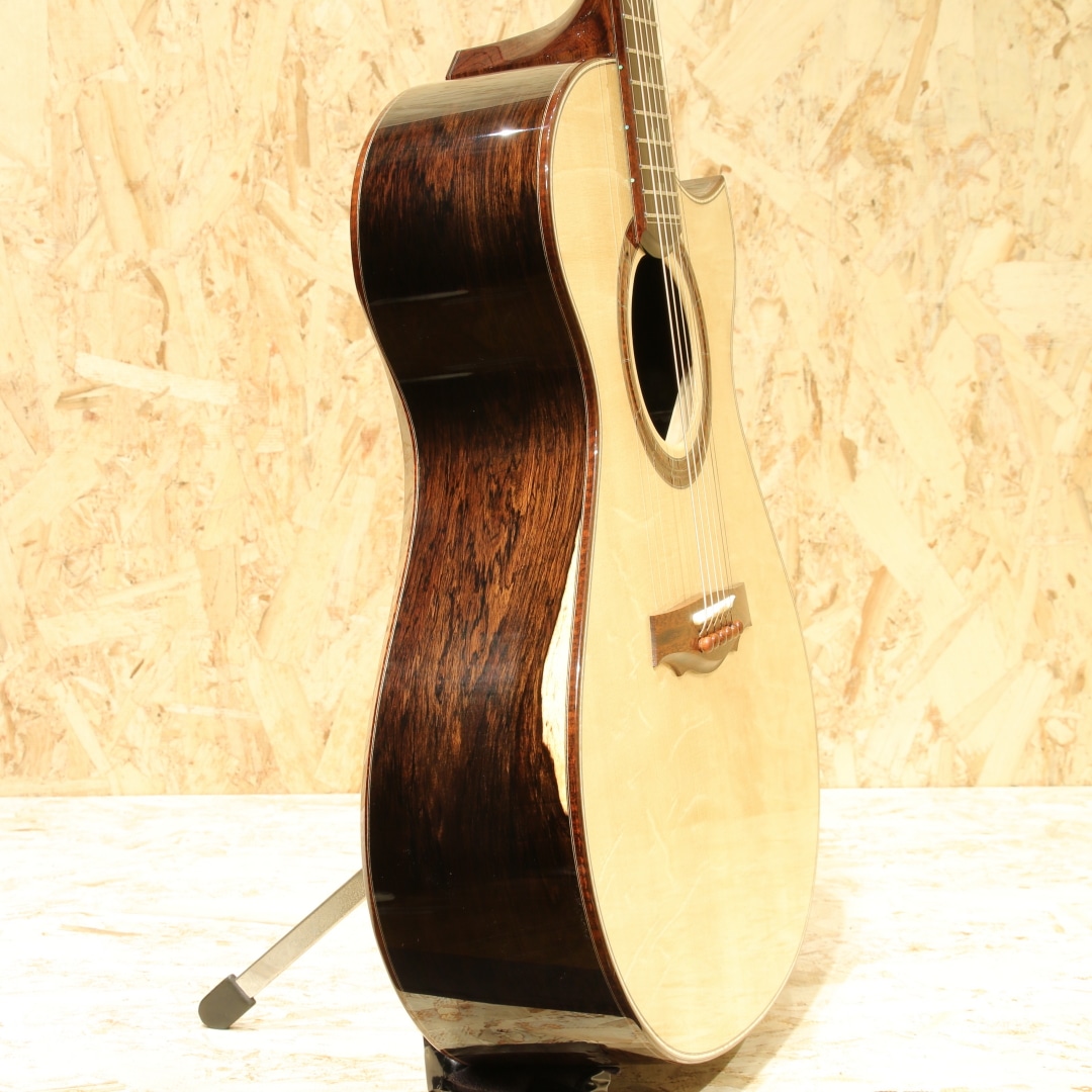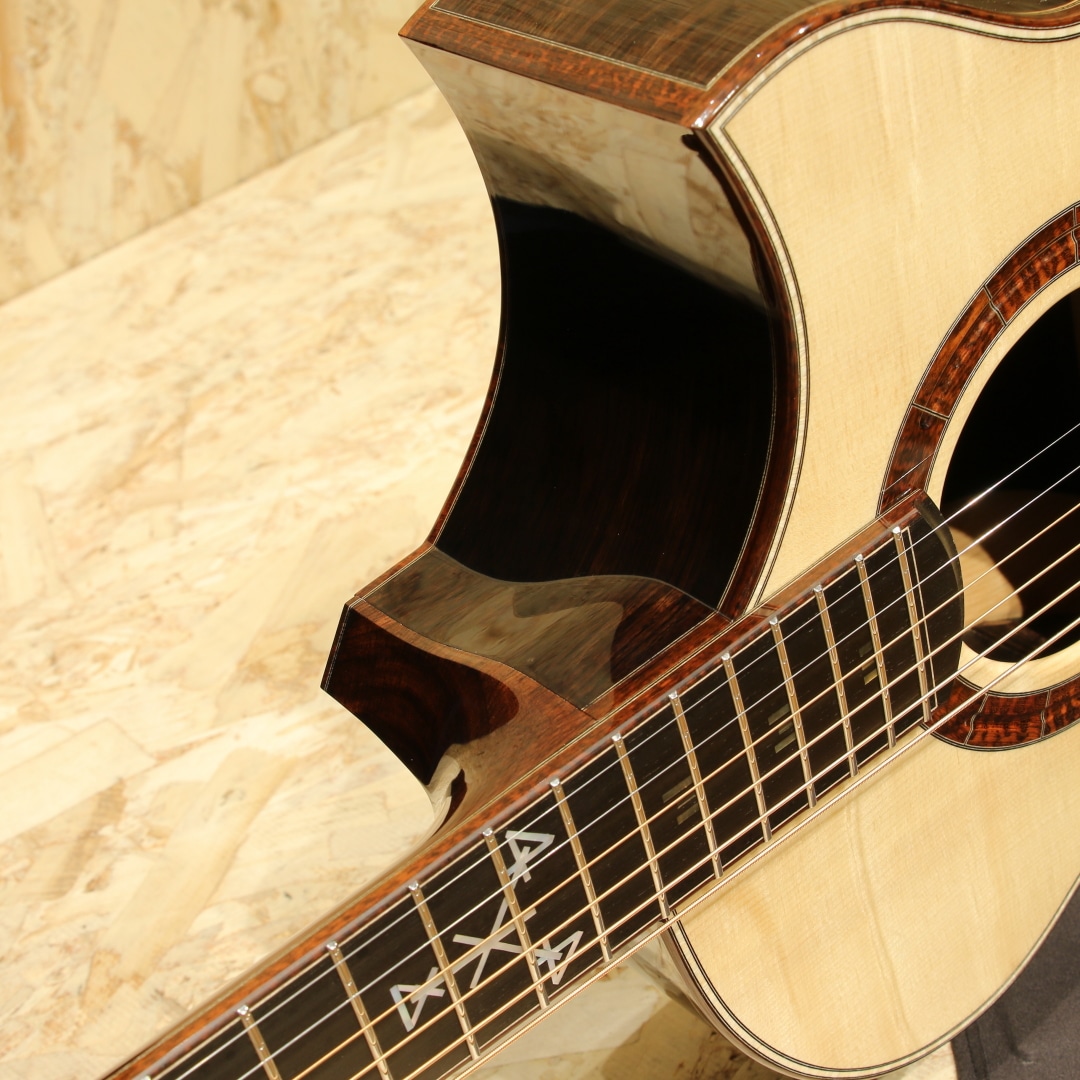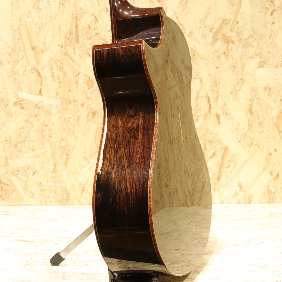 SJシェイプカッタウェイをベースに美事なマテリアルを贅沢に配した"SJ Cutaway"。トップには揺らめく美しいベアクロウ杢が全面に入ったジャーマンスプルース、サイド&バックには比重が高く重厚な音色が特徴で大きめサイズの材料の確保が特に難しくなっている高級材のアフリカンブラックウッドを使用。1ピースのインディアンローズウッドネック、エボニー指板、ゴトー製SGV510XGペグ、うろこ状に揺らめく高級材のスネイクウッドブリッジ&3Dロゼッタ、ヘッド&バックプレート、バインディング&バックコンターにも贅沢にスネイクウッドが使用され統一されています。3Dフローレンタインカッタウェイ、スキャロップドXブレイシング。とても美しい仕上げと高い完成度で、弊社200周年モデルとして最高の技術と素晴らしい材料を配して作り込まれた美事な1本。比重のある材料をあえて使用し、重心が低くより軸ブレ感のない倍音豊かなサウンドに仕上がっています。発音にパンチがあり野太く力強いサウンド。決してソリッドな金属質な響きではなく、重厚かつ広がりのあるサウンドになっています。堅牢なイメージとおもいきやとてもセンシティブなタッチにも明瞭に反応してくれる側面も持ち、材料を扱う技術の高さが伺えます。ネックは手になじみやすい44.5mm幅ナットと緩やかなシェイプ。サウンド、演奏性どちらも最高レベルです。