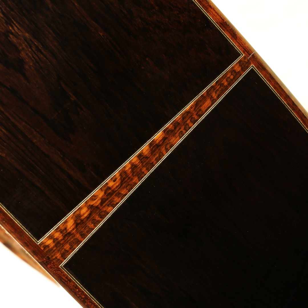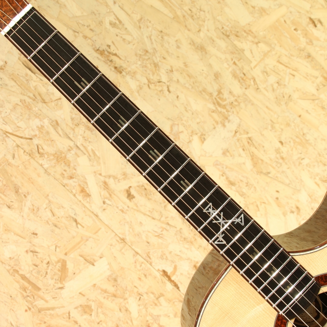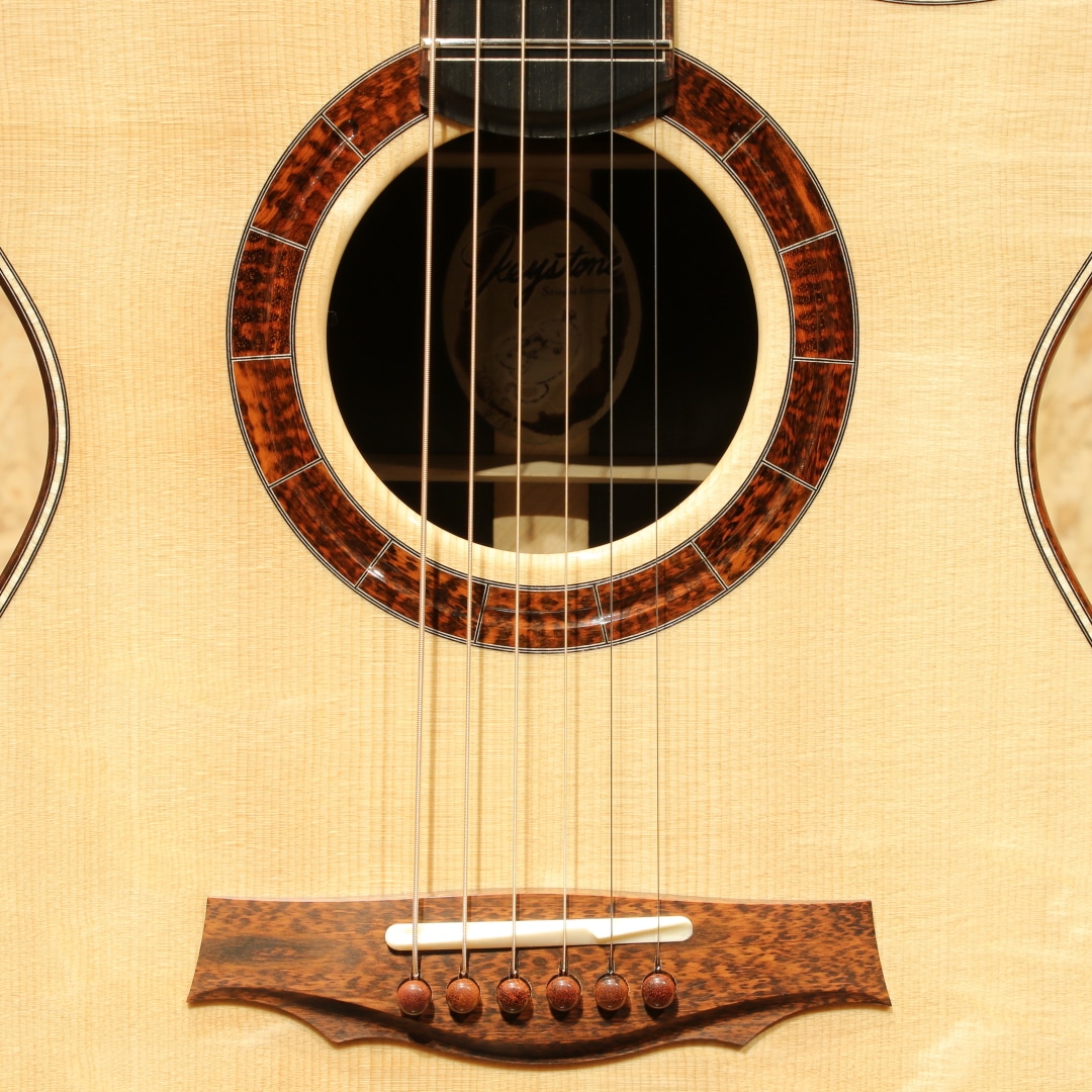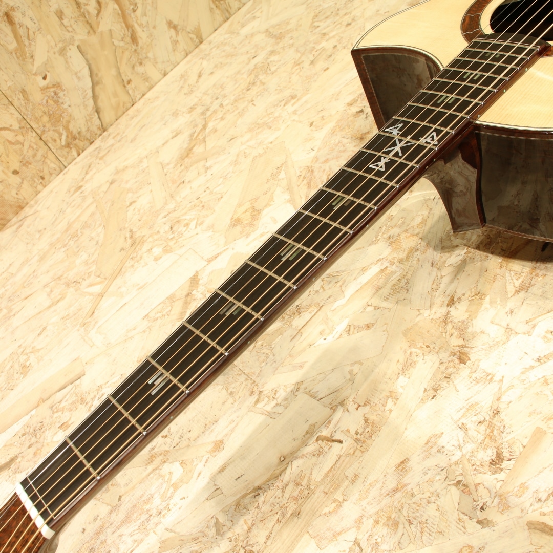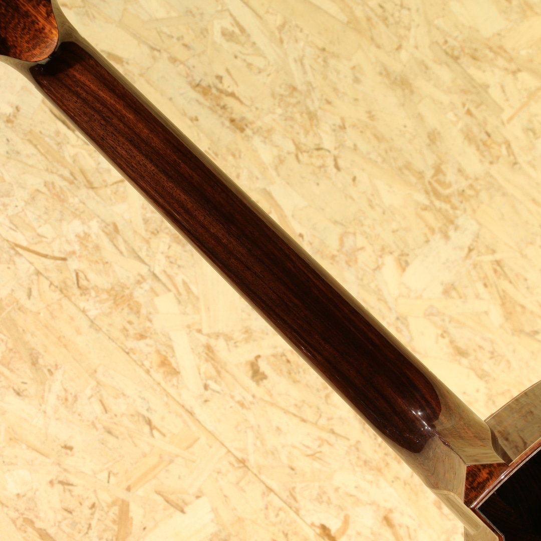 SJシェイプカッタウェイをベースに美事なマテリアルを贅沢に配した"SJ Cutaway"。トップには揺らめく美しいベアクロウ杢が全面に入ったジャーマンスプルース、サイド&バックには比重が高く重厚な音色が特徴で大きめサイズの材料の確保が特に難しくなっている高級材のアフリカンブラックウッドを使用。1ピースのインディアンローズウッドネック、エボニー指板、ゴトー製SGV510XGペグ、うろこ状に揺らめく高級材のスネイクウッドブリッジ&3Dロゼッタ、ヘッド&バックプレート、バインディング&バックコンターにも贅沢にスネイクウッドが使用され統一されています。3Dフローレンタインカッタウェイ、スキャロップドXブレイシング。とても美しい仕上げと高い完成度で、弊社200周年モデルとして最高の技術と素晴らしい材料を配して作り込まれた美事な1本。比重のある材料をあえて使用し、重心が低くより軸ブレ感のない倍音豊かなサウンドに仕上がっています。発音にパンチがあり野太く力強いサウンド。決してソリッドな金属質な響きではなく、重厚かつ広がりのあるサウンドになっています。堅牢なイメージとおもいきやとてもセンシティブなタッチにも明瞭に反応してくれる側面も持ち、材料を扱う技術の高さが伺えます。ネックは手になじみやすい44.5mm幅ナットと緩やかなシェイプ。サウンド、演奏性どちらも最高レベルです。