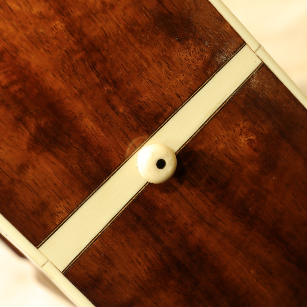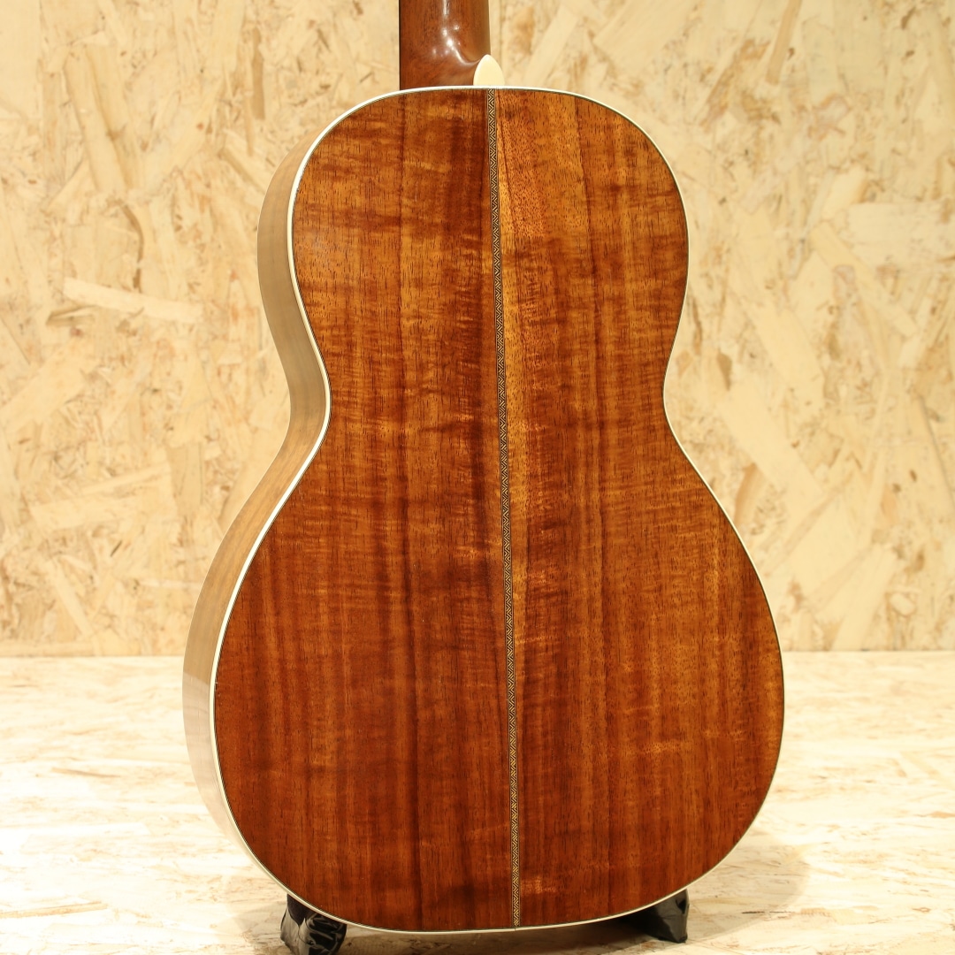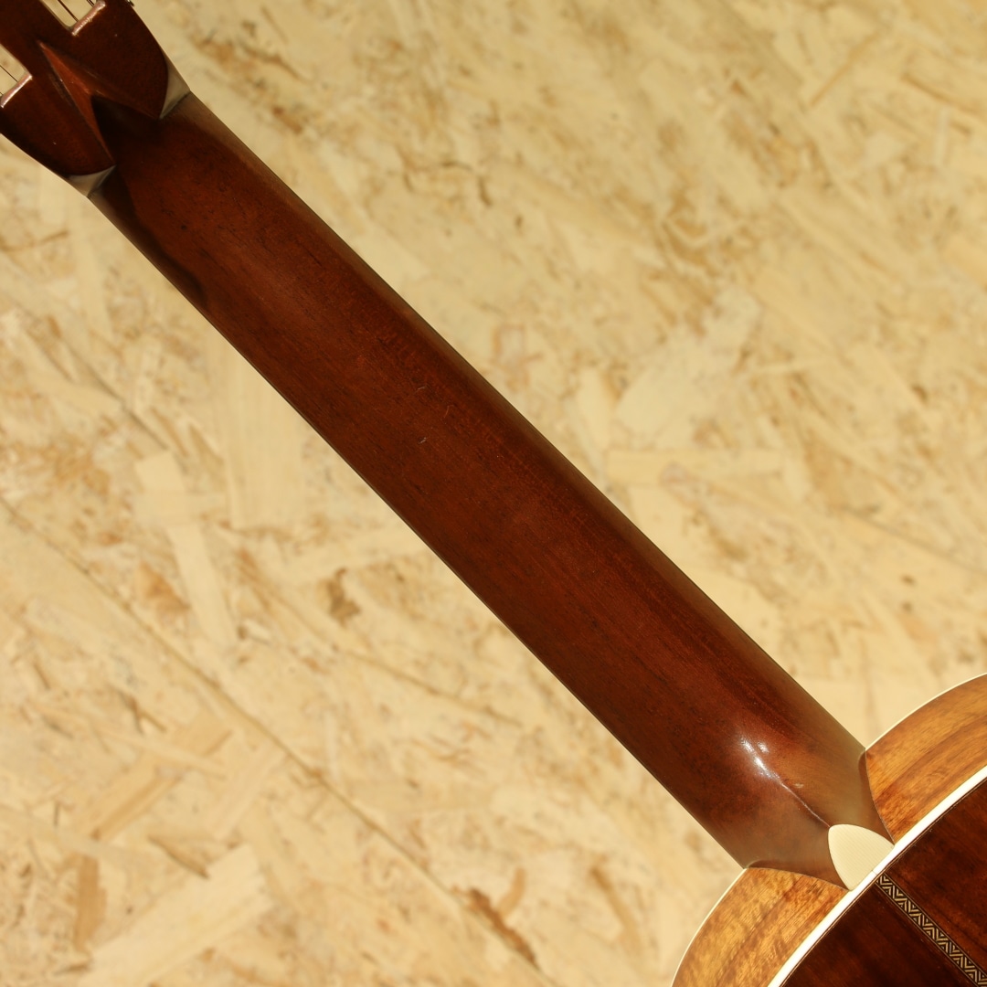 マーチン”K(Koa)”シリーズは、ハワイアン音楽のブーム下だったアメリカでマーチン初のハワイアンモデルとして1917年から1935年まで製造されました。サイズ5から000まで幅の広いラインナップで世に送り出され、年代によりスタンダードセットのモデルとラップスチールギターの様なハワイアンセットのモデルがありました。”K”シリーズはマーチンの他モデル同様にスタイルごとのラインナップを持ち、本器はその中のスタイル28で”0”サイズの”0-28K”。ハワイアンコアに身を包んだ1923年製のVintage品。オールハワイアンコアウッドボディ、マホガニーネック、エボニー指板、スロテッドヘッド、オリジナルプレートチューナー、ダイアモンドスクエア指板インレイ、スキャロップドXブレイシング、エボニーロッド。この時代特有とも言える軽快な反応性、そしてふくよかでスケール感の大きいサウンド。ボディサイズがワンサイズ大きくなったような感覚を覚える個体です。ハワイアンコア特有の艶やかさを併せ持ち、独特の倍音感に虜になる人が多いことも頷けます。少しタイトな立ち上がりをしつつも、素早い反応と快活なトーンで心地よく演奏が出来るでしょう。ボディトップのセンターシームには過去継ぎ目の剥がれが起きた後が見られますが、裏からパッチが当てられており表もタッチアップが施されるなど丁寧に補修がされております。過去にネックリセットが行われており、指板の下にはシムが挟まれ、それに伴いブリッジをリプレイス、現代的な演奏性へと調整がされております。フレットはバーフレットから現代的なTフレットへと打ち換えがされております。その他6弦ペグつまみが若干色合いの違うアイボロイドつまみに交換されている点や薄い弾きキズ、ボディ表面上の擦れキズや当てキズ等見られますが、100年を経たことを考えると良好な状態を保っていると言えるでしょう。サドルも未だ調整幅は残されており、実用性も保たれています。一世紀の時を過ごし、人間でいえば紀寿を迎えたギター。世界恐慌と戦争を乗り越え、手入れをされつつ弾ける状態をキープされた1本です。O-18Kよりも製造本数は少なく、およそ5分の1程と中々見かけることの少ないモデル。この機会をお見逃しなく。