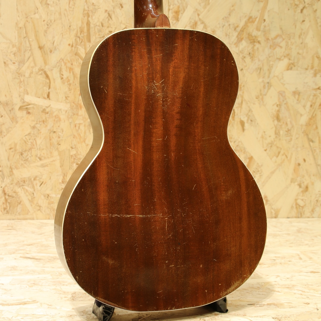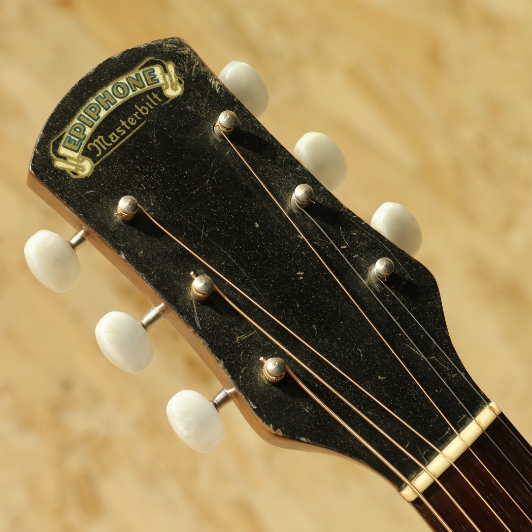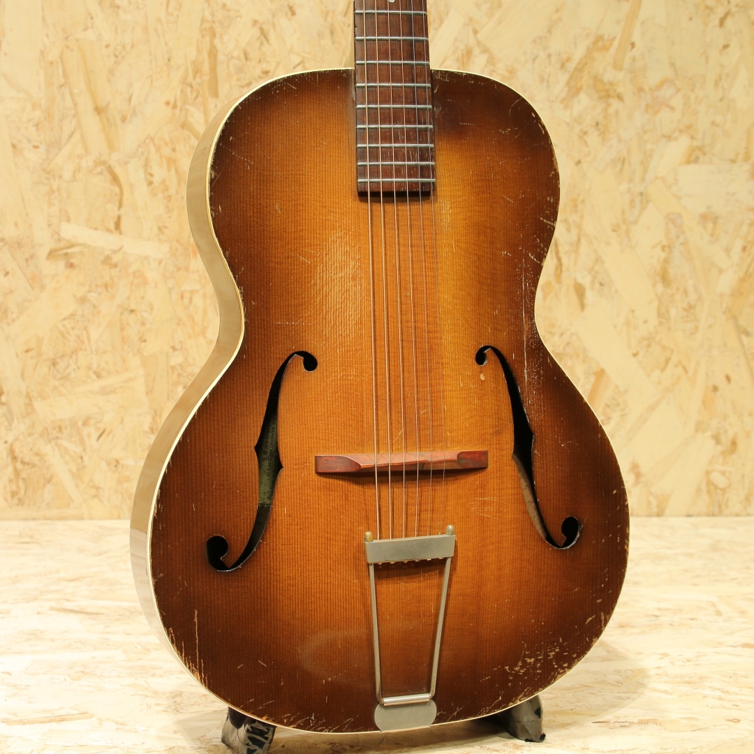 1873年の創業より長い歴史を持つエピフォンブランド。Stathopoulo期ニューヨークの地で名を馳せたアーチドトップ黄金期1930年代。美しい全体のフォルム、細部までこだわったディティールと全体で計算されたハイセンスなバランスのデザイン、良き時代の象徴です。オリジナリティーの高いサウンドも持ち、アーチドトップ界ではGIBSONと席巻し人気を博したEpiphoneですが、のちの1950年代晩年期、経営陣の不仲などにより徐々に衰退。1957年以降はライバル社であったギブソンに買収され、工場がカラマズーに統合されました。1930s黄金期時代の輝かしい作品は今もなお、アーチドトップを愛するジャズギタリストをはじめとしたコアなファンの心をつかんで止みません。本器は1935年製Masterbiltシリーズの"Olympic"。14 3/4ボディーワイド、ハンドカーブドスプルーストップ、マホガニーサイドバック、センターで継がれた2Pネック、ドット指板ポジション、ハカランダ指板、ホワイトセルバインディング。ピックガードと固定金具は欠損しております。1931年より発売されたOLYMPIC。発売当時は13インチボディでしたが、3度サイズが変わり年々大型化した経緯を持ちます。その後1949年には生産終了となりました。本器は2度目のサイズ変更のタイミングで製作が行われた個体。比較的安価な位置づけで製造が行われており、装飾もシンプルに抑えられた比較的小型なモデルになります。アーチトップではメイプルを使用されることも多いですが、本器はマホガニーを使用しまた一味違ったニュアンスを持つ1本。甘いというよりはドライ、ガランとしたマホガニー特有の響きを持ち、音の輪郭が空気に混じるようなエア感を持ったサウンド。耳にキンと来ない柔らかさを持ち、強めのピッキングでも音が纏まりやすい特色を持ったアーチトップです。ネックヒールキャップは欠損、ペグは近年のモノへ交換され片側4つある内のビス穴は2つネジが欠損しています。チューニング自体は問題なく行えるため実用上差し支えの無い状態です。1弦側Fホールの上部、くびれ付近に木部クラックが入った跡が見られますが丁寧に補修がされており、使用上問題ありません。ブリッジは当時のカタログと見比べても形状が異なる為、恐らくリプレイスされているかと思われます。ボディ縁の細やかなキズ、塗装剥げ、ヘッド裏の塗装が粘着テープに反応したであろう跡等長年使用されてきたであろう形跡が見られる貫禄のある個体。ネック自体は若干の順反りとなりますが、この時代の構造としてはストレートに近い良好な状態。ネックシェイプは現代から見てもさほど太さを感じづらく、弦高も現代的で弾きやすい演奏性に整えられており、まだまだ実用的な1本です。エピフォン黄金期に作られたアーチトップギター。現代とは異なる設計思想を感じられ、本格志向でありつつも入門に使える1本です。独特のアーチトップサウンド、是非この機会にいかがでしょうか。