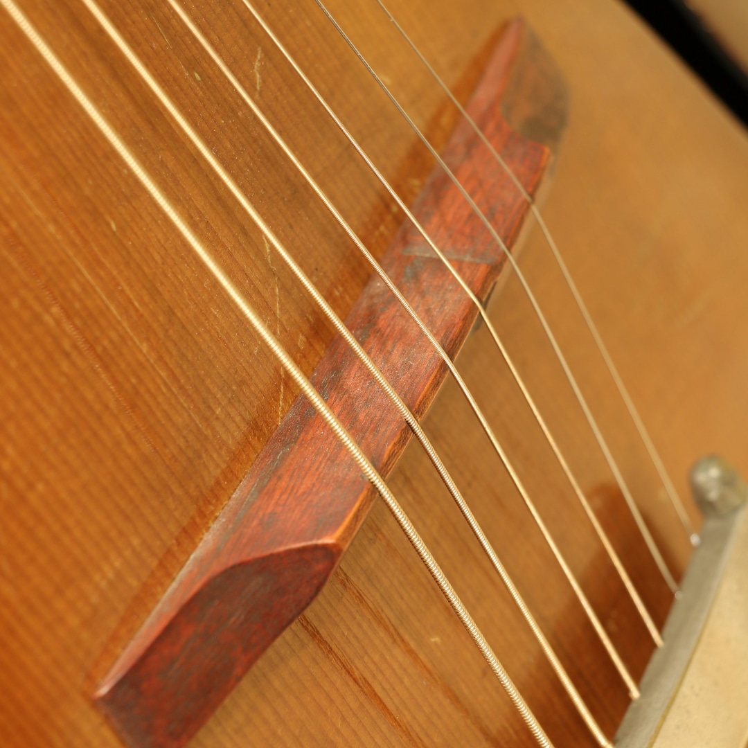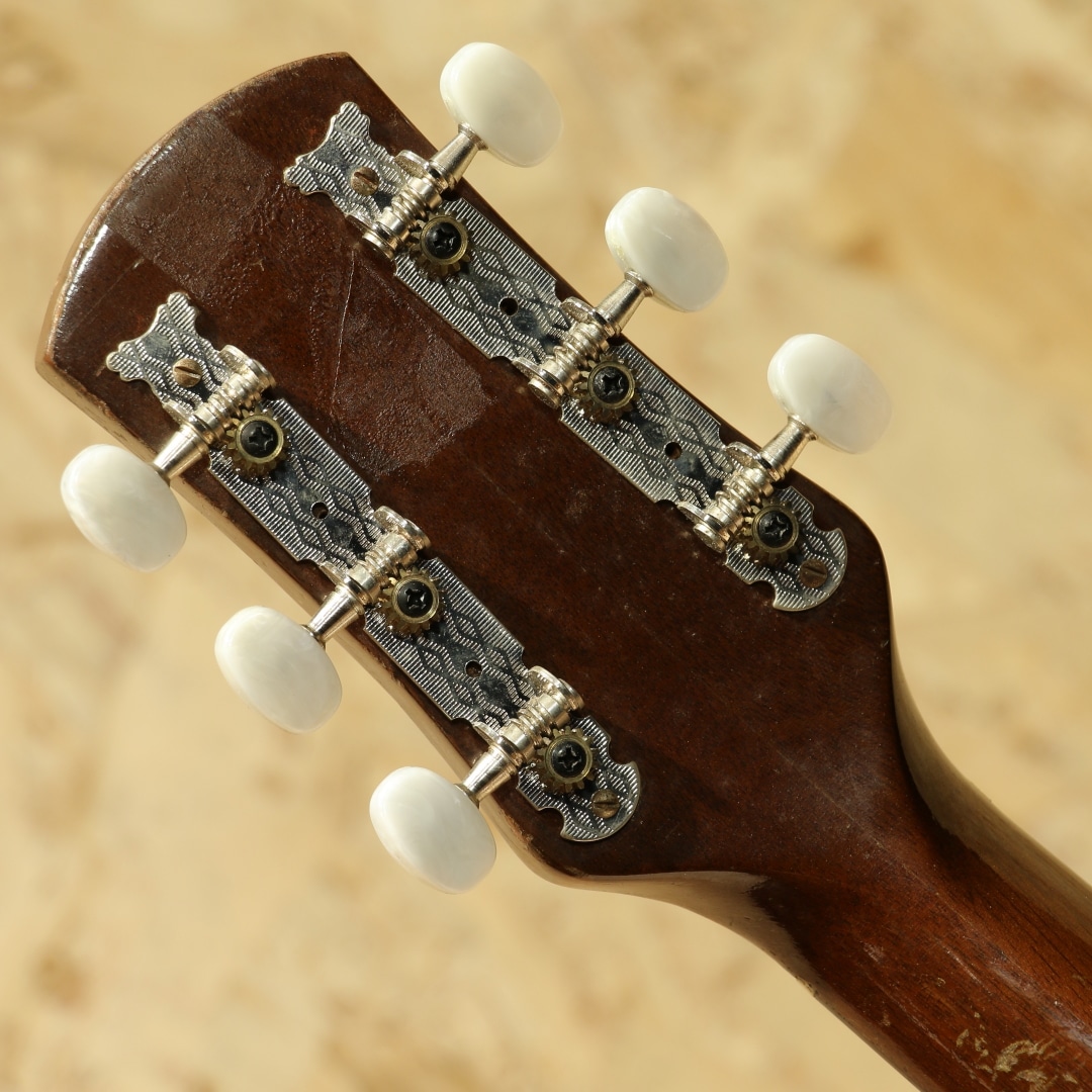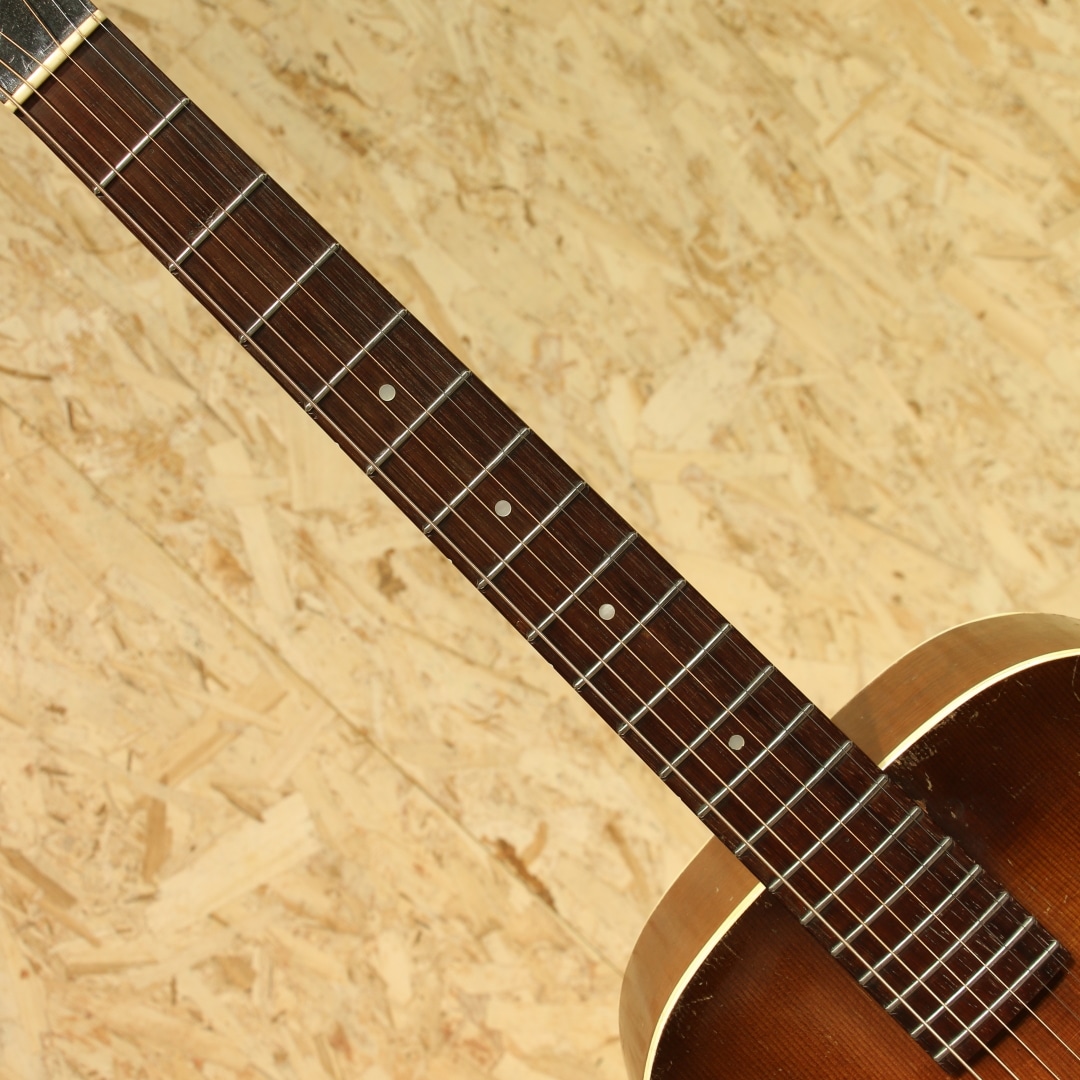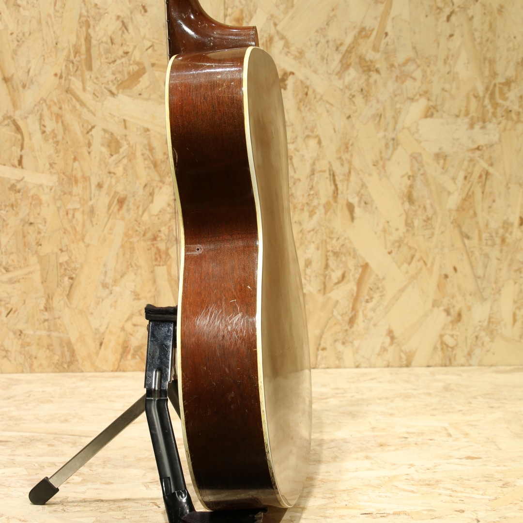 1873年の創業より長い歴史を持つエピフォンブランド。Stathopoulo期ニューヨークの地で名を馳せたアーチドトップ黄金期1930年代。美しい全体のフォルム、細部までこだわったディティールと全体で計算されたハイセンスなバランスのデザイン、良き時代の象徴です。オリジナリティーの高いサウンドも持ち、アーチドトップ界ではGIBSONと席巻し人気を博したEpiphoneですが、のちの1950年代晩年期、経営陣の不仲などにより徐々に衰退。1957年以降はライバル社であったギブソンに買収され、工場がカラマズーに統合されました。1930s黄金期時代の輝かしい作品は今もなお、アーチドトップを愛するジャズギタリストをはじめとしたコアなファンの心をつかんで止みません。本器は1935年製Masterbiltシリーズの"Olympic"。14 3/4ボディーワイド、ハンドカーブドスプルーストップ、マホガニーサイドバック、センターで継がれた2Pネック、ドット指板ポジション、ハカランダ指板、ホワイトセルバインディング。ピックガードと固定金具は欠損しております。1931年より発売されたOLYMPIC。発売当時は13インチボディでしたが、3度サイズが変わり年々大型化した経緯を持ちます。その後1949年には生産終了となりました。本器は2度目のサイズ変更のタイミングで製作が行われた個体。比較的安価な位置づけで製造が行われており、装飾もシンプルに抑えられた比較的小型なモデルになります。アーチトップではメイプルを使用されることも多いですが、本器はマホガニーを使用しまた一味違ったニュアンスを持つ1本。甘いというよりはドライ、ガランとしたマホガニー特有の響きを持ち、音の輪郭が空気に混じるようなエア感を持ったサウンド。耳にキンと来ない柔らかさを持ち、強めのピッキングでも音が纏まりやすい特色を持ったアーチトップです。ネックヒールキャップは欠損、ペグは近年のモノへ交換され片側4つある内のビス穴は2つネジが欠損しています。チューニング自体は問題なく行えるため実用上差し支えの無い状態です。1弦側Fホールの上部、くびれ付近に木部クラックが入った跡が見られますが丁寧に補修がされており、使用上問題ありません。ブリッジは当時のカタログと見比べても形状が異なる為、恐らくリプレイスされているかと思われます。ボディ縁の細やかなキズ、塗装剥げ、ヘッド裏の塗装が粘着テープに反応したであろう跡等長年使用されてきたであろう形跡が見られる貫禄のある個体。ネック自体は若干の順反りとなりますが、この時代の構造としてはストレートに近い良好な状態。ネックシェイプは現代から見てもさほど太さを感じづらく、弦高も現代的で弾きやすい演奏性に整えられており、まだまだ実用的な1本です。エピフォン黄金期に作られたアーチトップギター。現代とは異なる設計思想を感じられ、本格志向でありつつも入門に使える1本です。独特のアーチトップサウンド、是非この機会にいかがでしょうか。