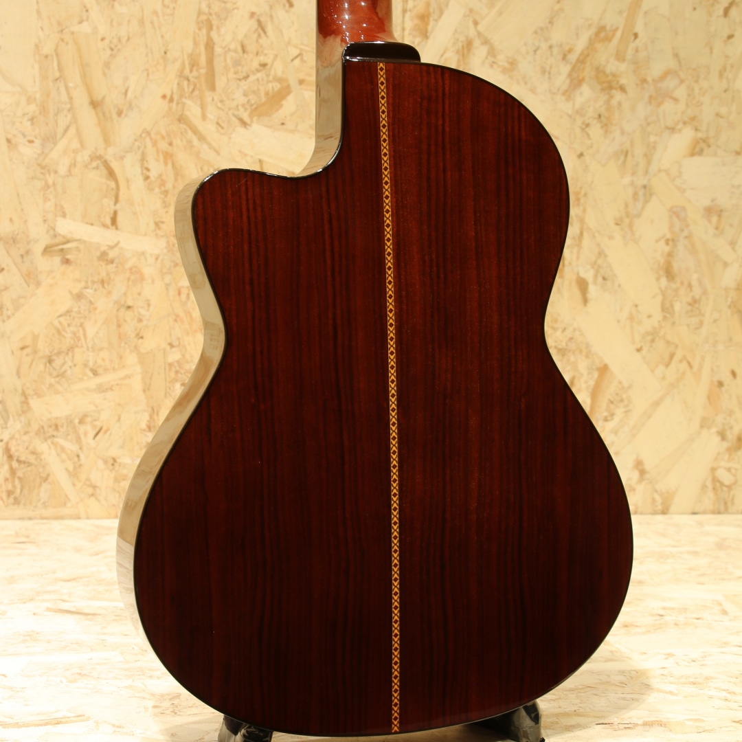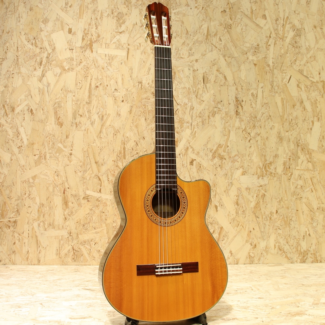 岐阜県の工房にて手作りにこだわり製造を続けるヤイリギター。世代を超えてずっと愛され続けるギター、年月を重ねても色あせないデザイン、使い込むほどに深みが増す音色をコンセプトとして現在でも約30名程の体制で1日20本程のペースで製造されています。海外の著名アーティストを始め、国内プロアーティストからも大きな支持を集めているブランドです。本器はエレガットのカッタウェイモデル”CE-1”。2011年製USED品です。スプルース単板トップ、ローズウッドサイド&バック、マホガニーネック、ローズウッド指板&ブリッジ、ゴールドペグ、パール指板サイドドット、L.R Baggs iBeam Classical Active搭載。通常サイズのクラシックギターのボディを薄くし、カッタウェイを付けたボディ形状。アコースティックギターやエレキギターから持ち替えをお考えの方でも抱えやすいサイズ感やハイポジションまで運指がしやすい点が魅力です。輪郭のハッキリとした音色はピックで弾いた際も指で弾いた際も扱いやすく、ジャンルを問わず活躍してくれます。ピックアップにはL.R Baggs iBeam Classical Activeが搭載。パテントの特殊構造のピエゾ力学を応用し、いかにマイクで拾った音に近づけるかをテーマに作られたピックアップの為ナチュラルなラインサウンドをお楽しみ頂けます。表面的な擦り傷はございますが、大きく目立つような傷はなく、経年を考慮してもきれいな状態が保たれています。プレイ・ネックコンディションも良好です。国産老舗ブランドが作るエレガットの人気機種。オリジナルハードケースが付属します。