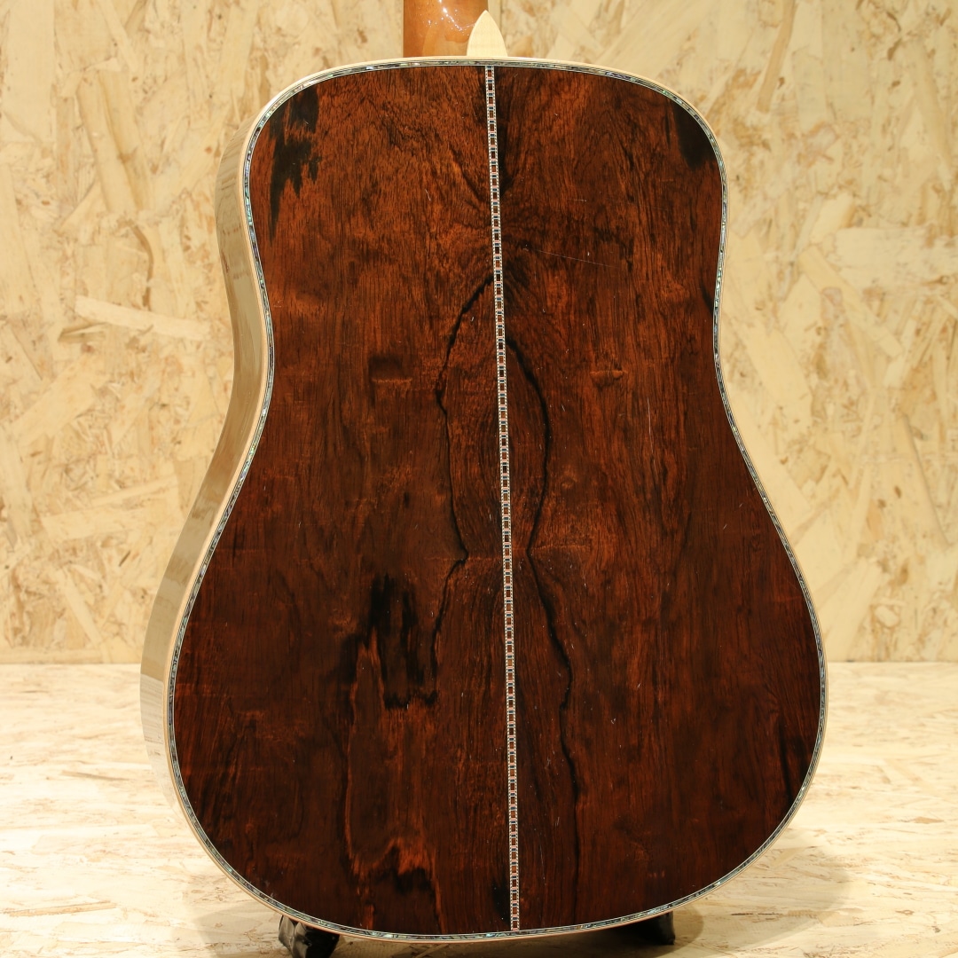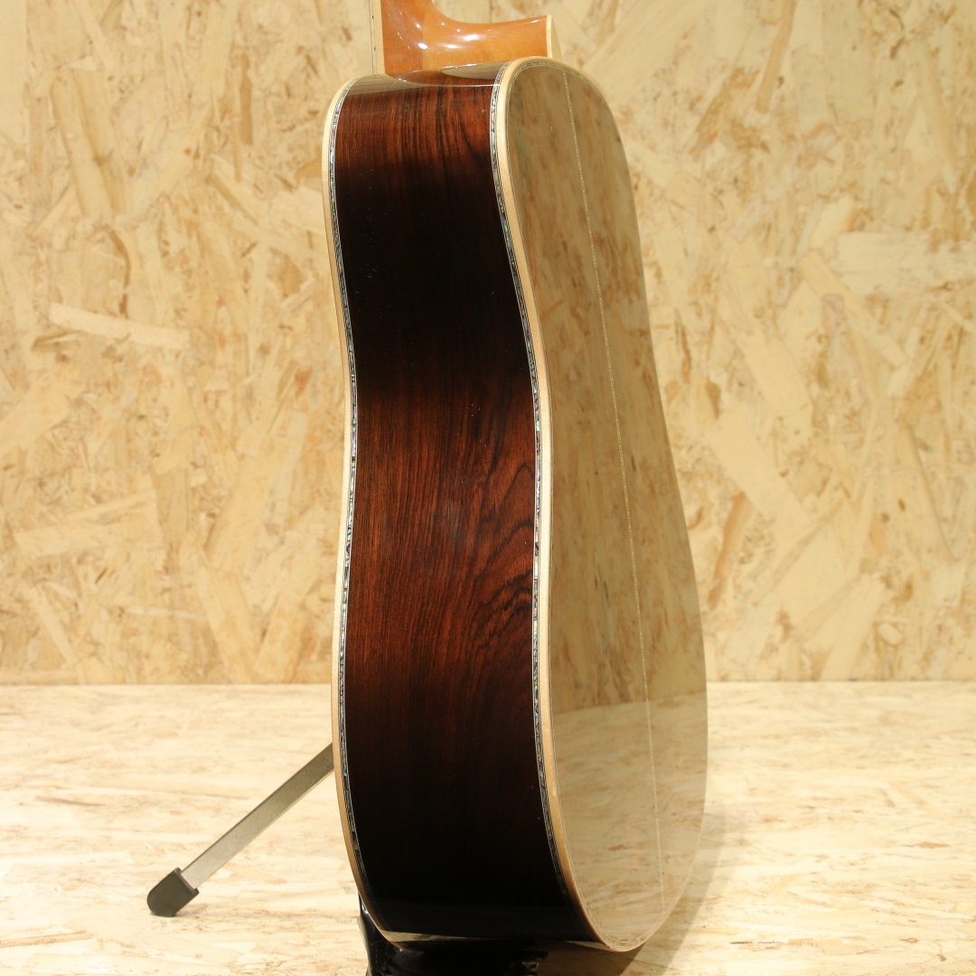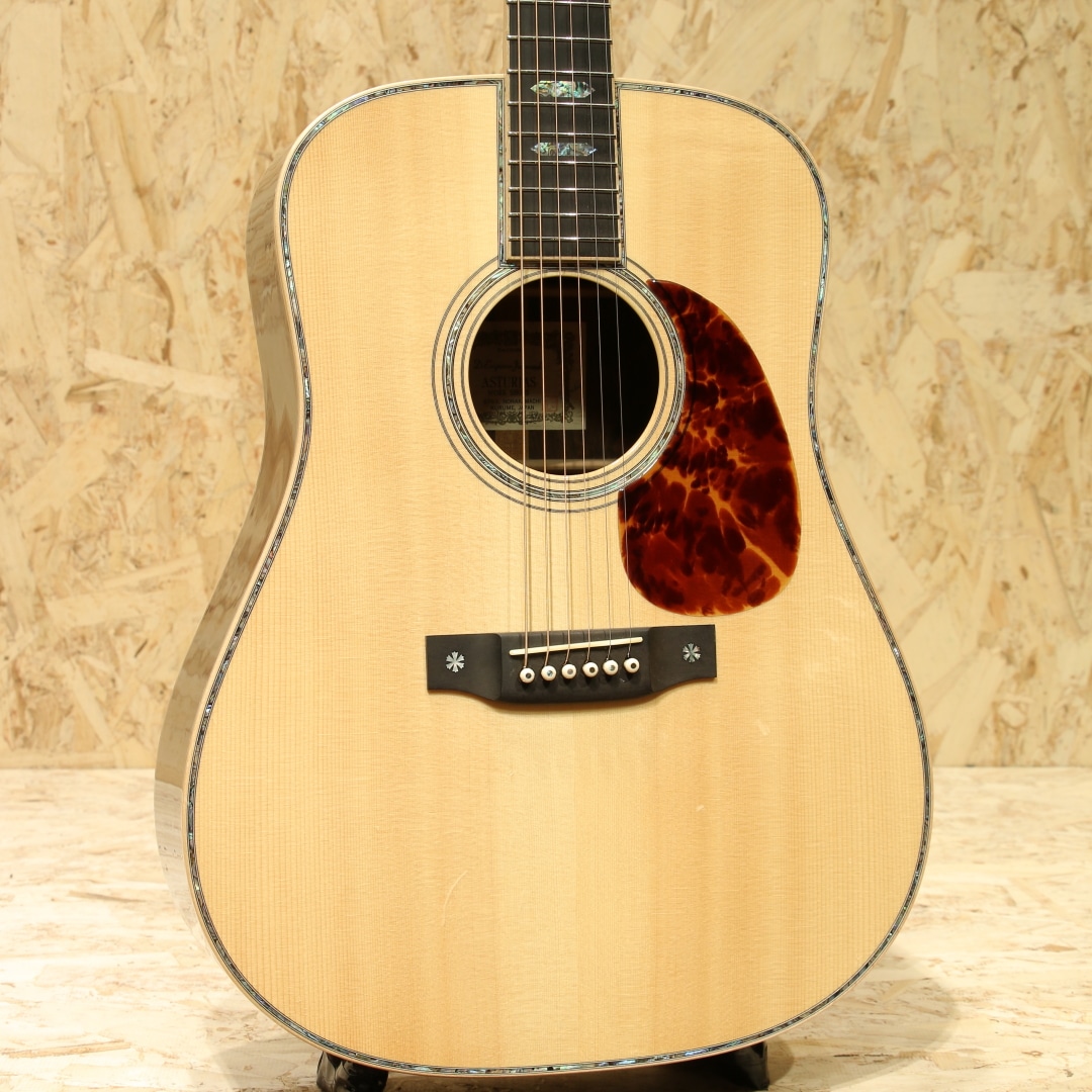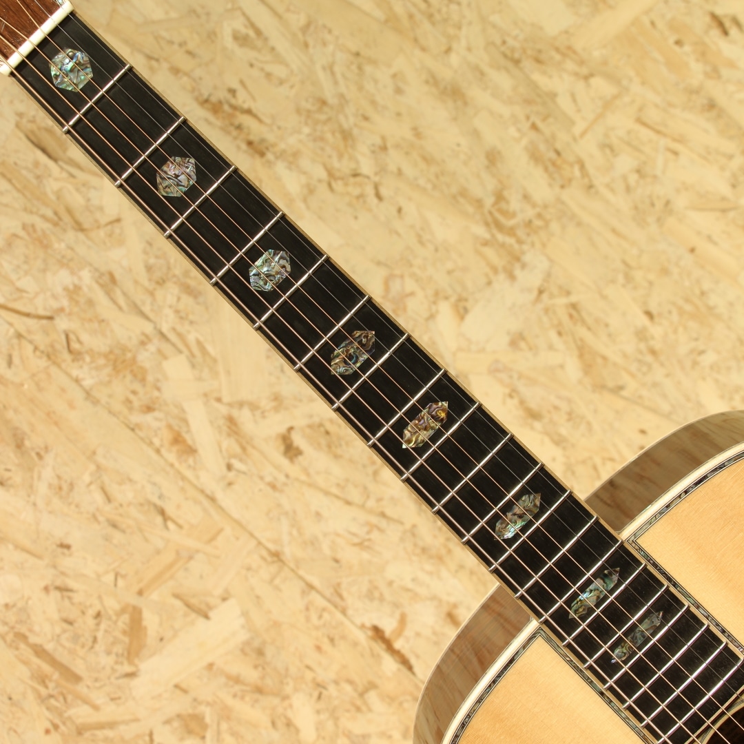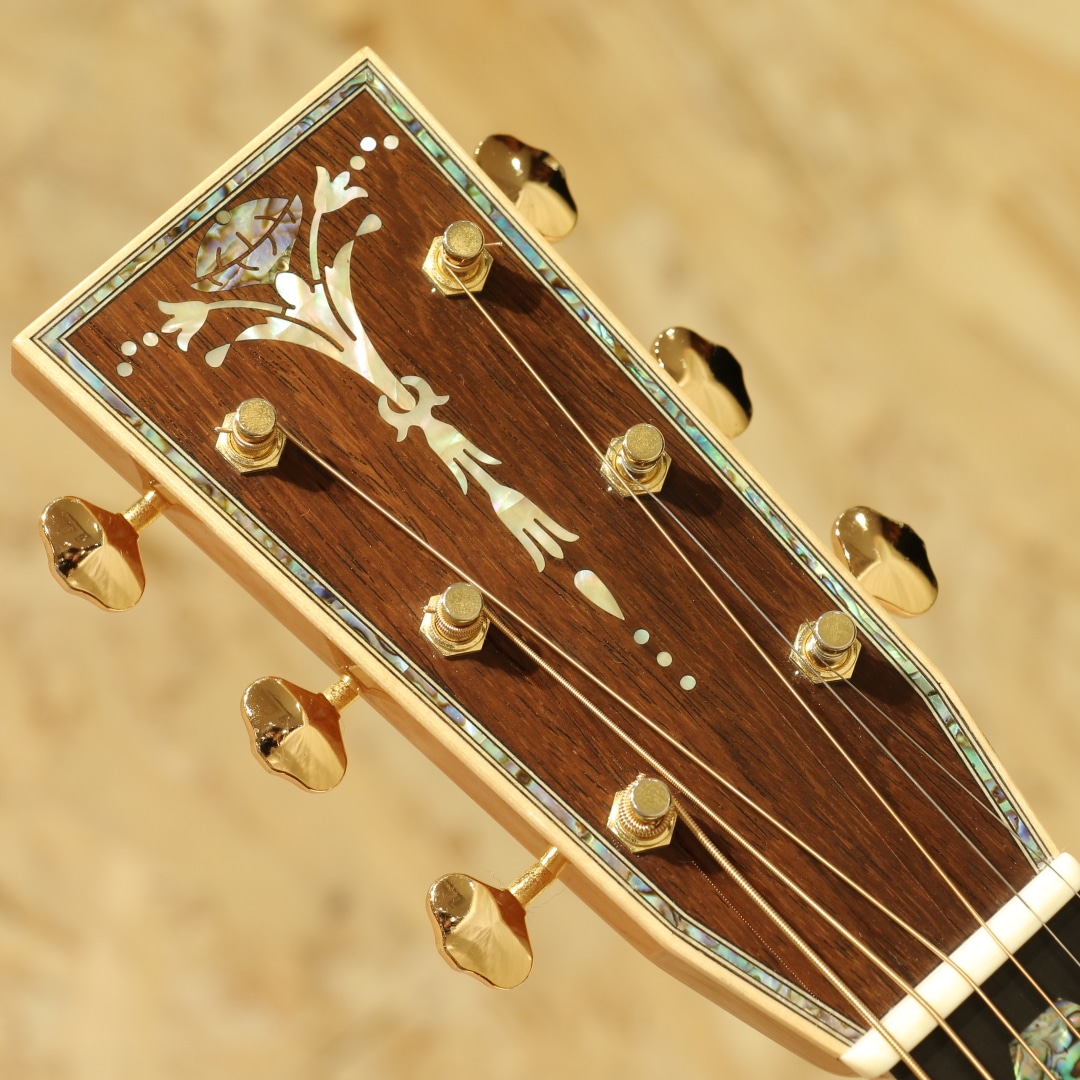 1962年より福岡久留米にてギター製造を行う老舗純国産ギターブランド"アストリアスギター"。現在もベテランを中心とした約15名のスタッフで運営しています。本器は、同社Dシリーズの最上位に君臨するEmperorのハカランダサイド&バックモデル"D.Emperor Jacaranda”。2020年製USED品です。ジャーマンスプルーストップ、ハカランダサイド&バック。マホガニーネック、エボニー指板&ブリッジ、ゴトー製オープンバックゴールドペグ、ハカランダ天神板、ヘッドアバロントーチインレイ、アバロンヘキサゴン指板インレイ、アバロンボディトリムインレイ&ロゼッタ、トーティスピックガード、ノンスキャロップド・Xブレーシング、オールラッカー仕上げ。ヘッドの先からボディエンドまで贅沢に施されたメキシコ貝インレイ。均整の取れた杢目のジャーマンスプルース、美しい杢目のハカランダ、そして青々と輝くアバロンのインレイの数々。外観の絢爛さはもちろん、またサウンドにも唸るものがあります。重厚な低音域にスッキリと抜けていく上品な高音域。上品でいながら力強さも持ち合わせており、爪弾けば美しく、掻き鳴らせば荒々しく、その表情は様々な演奏を表現してくれます。ボディトップ1弦側下部に米粒程の打痕が3か所、ボディサイド6弦側ボトム部に同じく米粒程度の打痕が1か所、ボディサイド1弦側のネック接合部付近にも同様の打痕が1か所、ボディバックにはバックルキズの様なものが散見され、ネック6弦側5fあたりにも演奏中に付いたであろうへこみ、ボディエンドには内部までは達していない木部の表層上のクラックがありますがしっかりと修理されており使用上問題はございません。ピックアップが後付けにて装着されていた為エンドピンは拡張されておりますが現在はピックアップが取り外されており同口径のエンドピンが取り付けられております。使用感こそ強く表れているもののネック・プレイコンディション共に良好で、弾き込まれていたことによるこなれ感もございます。厳選された最高級材や、贅沢に施されたアヴァロンインレイなど経験豊富なアストリアスクラフトマンが時間と手間を惜しまず製作され、数多のステージで活躍していたであろう歴戦の風格が使用感として表れている本器。Emperorという名がふさわしいまでの一つの究極形を体現したギターを是非お手元にいかがでしょうか。スーパーライトケースが付属致します。