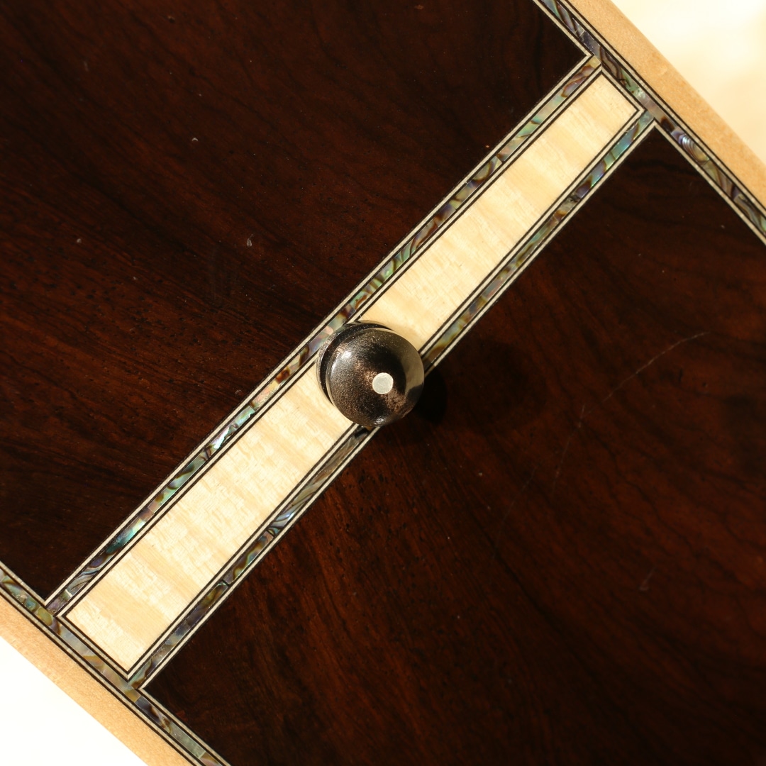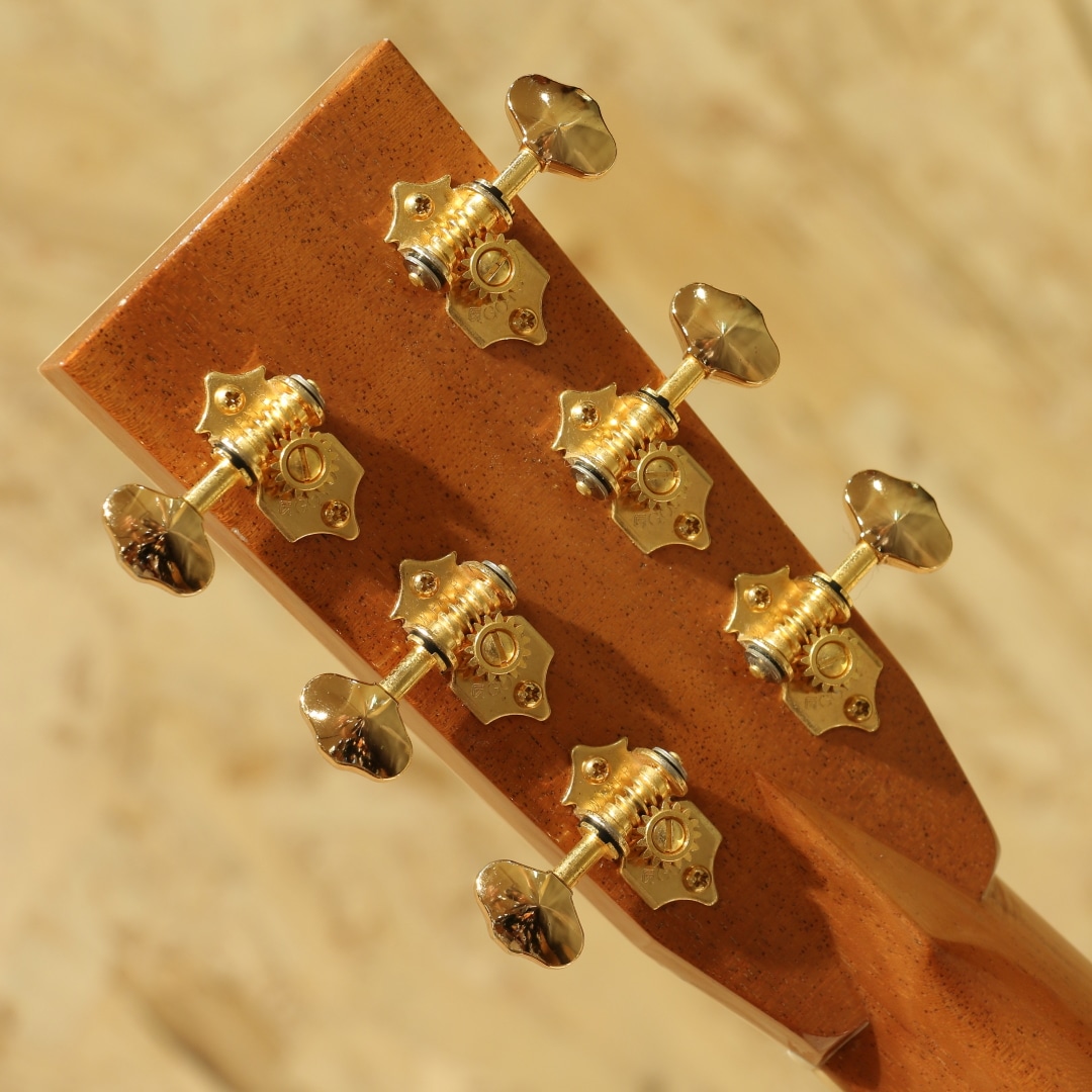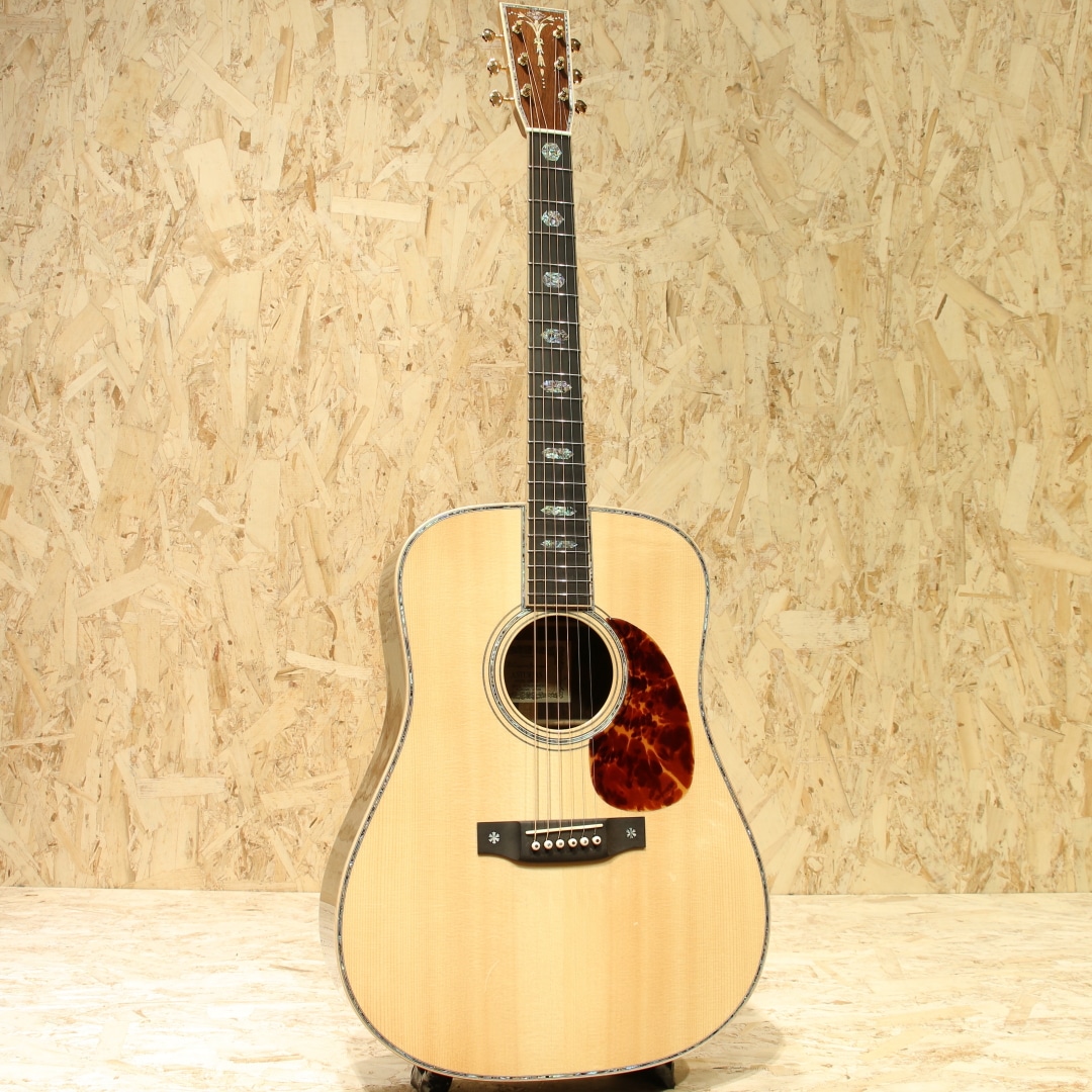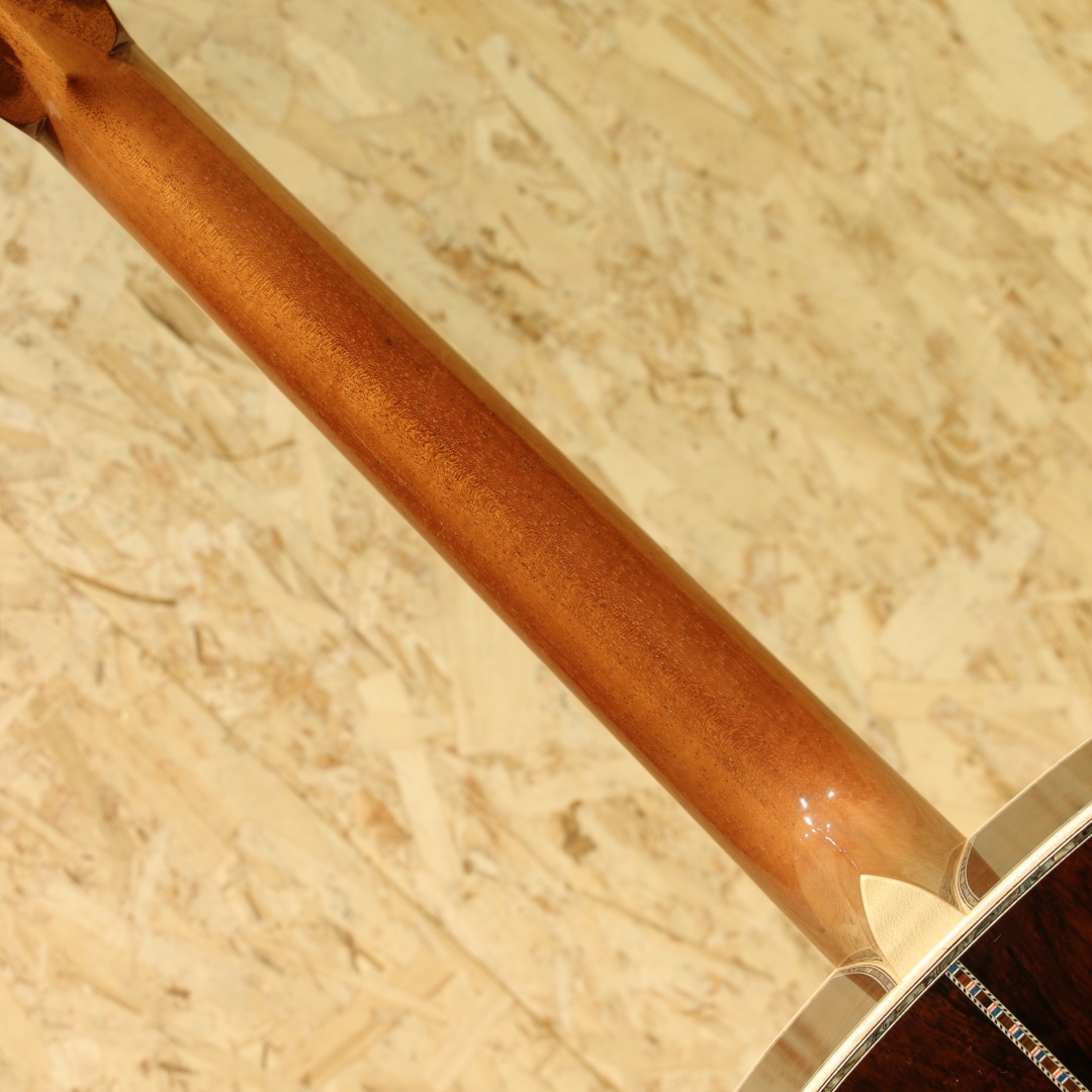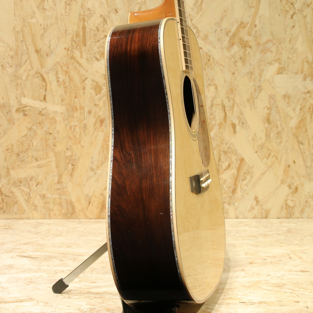 1962年より福岡久留米にてギター製造を行う老舗純国産ギターブランド"アストリアスギター"。現在もベテランを中心とした約15名のスタッフで運営しています。本器は、同社Dシリーズの最上位に君臨するEmperorのハカランダサイド&バックモデル"D.Emperor Jacaranda”。2020年製USED品です。ジャーマンスプルーストップ、ハカランダサイド&バック。マホガニーネック、エボニー指板&ブリッジ、ゴトー製オープンバックゴールドペグ、ハカランダ天神板、ヘッドアバロントーチインレイ、アバロンヘキサゴン指板インレイ、アバロンボディトリムインレイ&ロゼッタ、トーティスピックガード、ノンスキャロップド・Xブレーシング、オールラッカー仕上げ。ヘッドの先からボディエンドまで贅沢に施されたメキシコ貝インレイ。均整の取れた杢目のジャーマンスプルース、美しい杢目のハカランダ、そして青々と輝くアバロンのインレイの数々。外観の絢爛さはもちろん、またサウンドにも唸るものがあります。重厚な低音域にスッキリと抜けていく上品な高音域。上品でいながら力強さも持ち合わせており、爪弾けば美しく、掻き鳴らせば荒々しく、その表情は様々な演奏を表現してくれます。ボディトップ1弦側下部に米粒程の打痕が3か所、ボディサイド6弦側ボトム部に同じく米粒程度の打痕が1か所、ボディサイド1弦側のネック接合部付近にも同様の打痕が1か所、ボディバックにはバックルキズの様なものが散見され、ネック6弦側5fあたりにも演奏中に付いたであろうへこみ、ボディエンドには内部までは達していない木部の表層上のクラックがありますがしっかりと修理されており使用上問題はございません。ピックアップが後付けにて装着されていた為エンドピンは拡張されておりますが現在はピックアップが取り外されており同口径のエンドピンが取り付けられております。使用感こそ強く表れているもののネック・プレイコンディション共に良好で、弾き込まれていたことによるこなれ感もございます。厳選された最高級材や、贅沢に施されたアヴァロンインレイなど経験豊富なアストリアスクラフトマンが時間と手間を惜しまず製作され、数多のステージで活躍していたであろう歴戦の風格が使用感として表れている本器。Emperorという名がふさわしいまでの一つの究極形を体現したギターを是非お手元にいかがでしょうか。スーパーライトケースが付属致します。