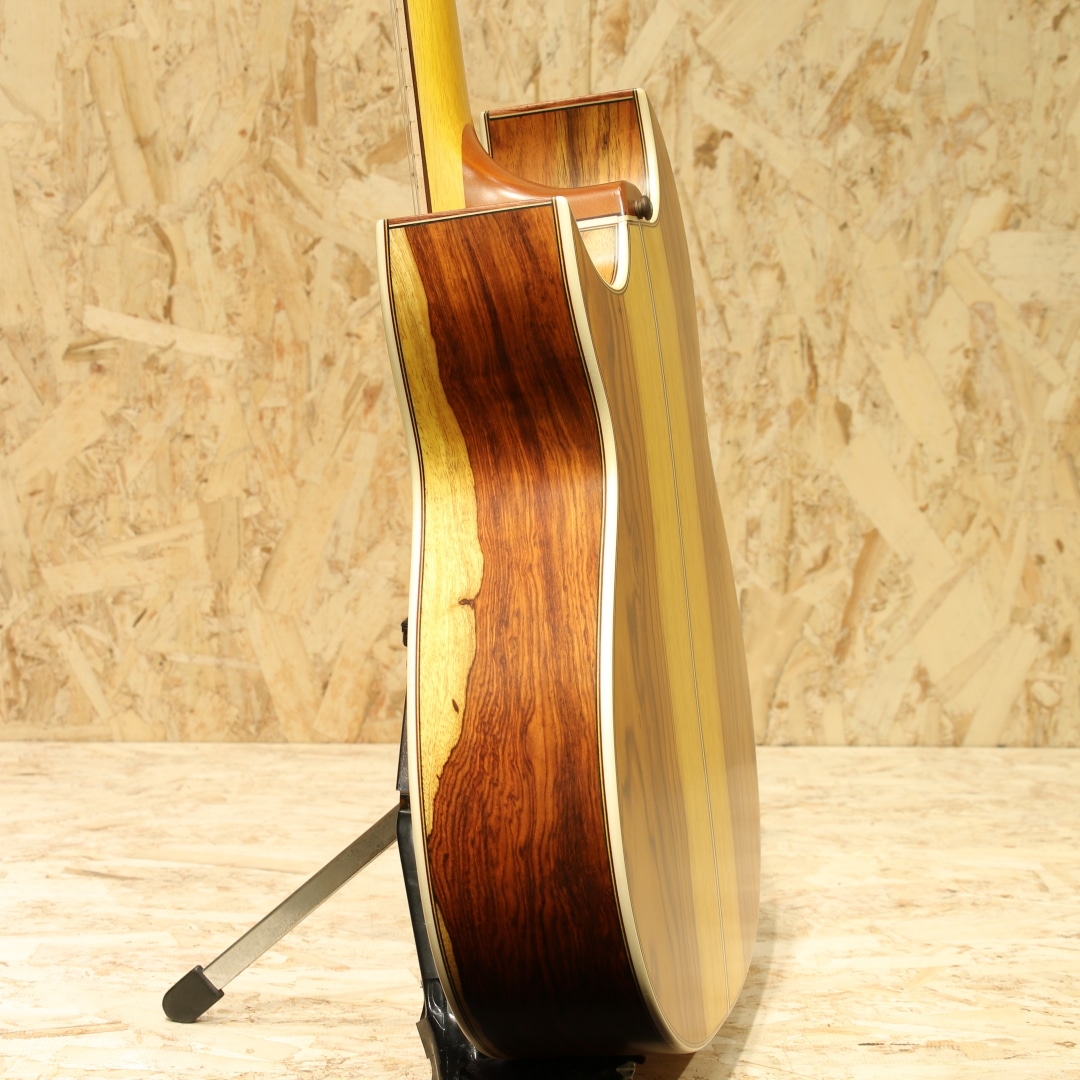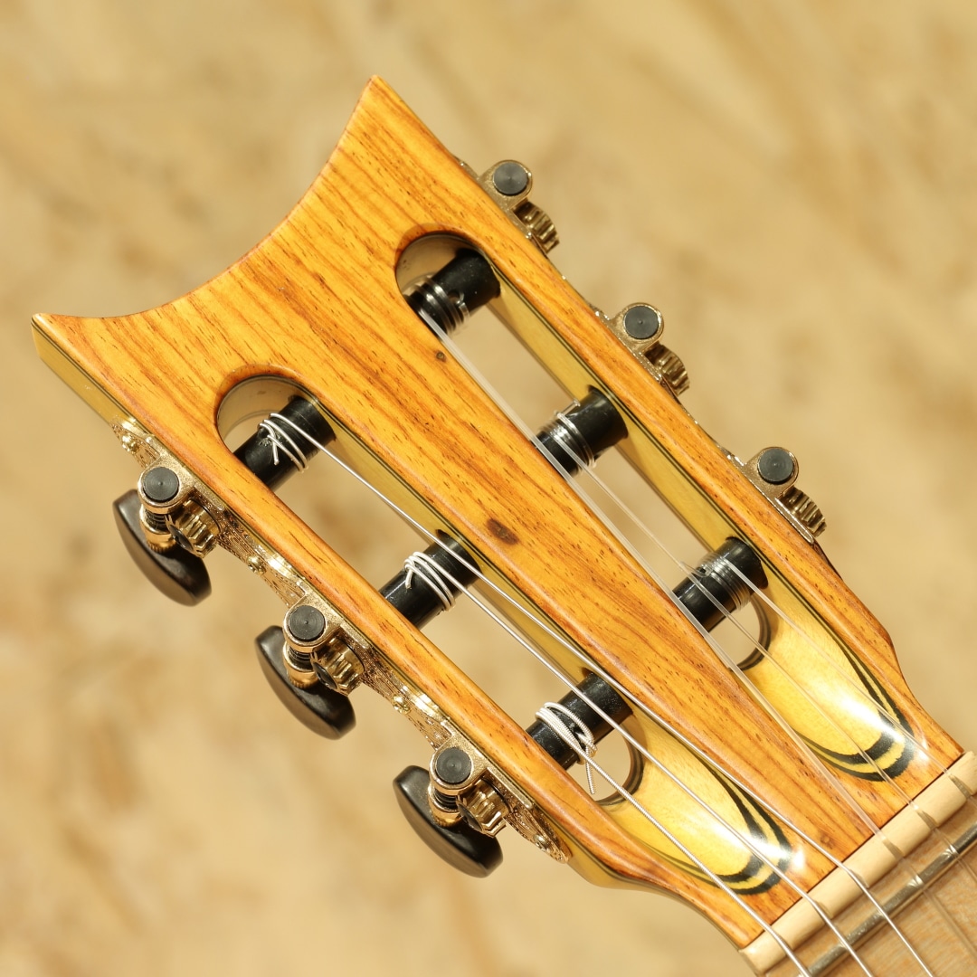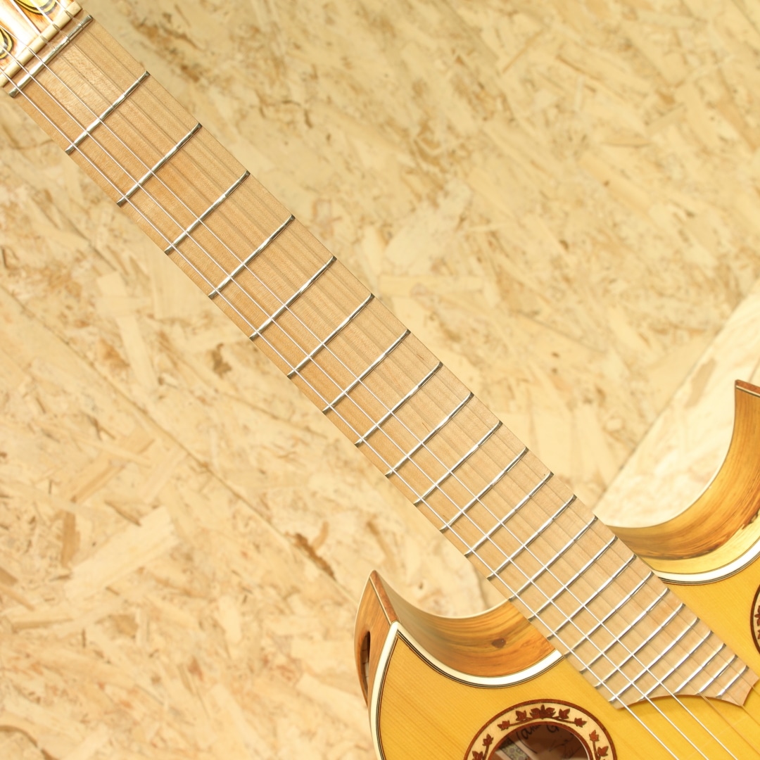 カナリア諸島の小規模な工房にて1本1本を少数精鋭の職人たちにより作られています。スペインの巨匠""パコ・デ・ルシア""からの支持も受ける2000年創業の新進気鋭なブランドです。本器はバルセロナの偉大な製作家の1人、フランシスコ・シンプリシオのギターから得られた知見に基づき製作された"Francisco Simplicio 1932"、2021年製USED品。ノルウェイスプルーストップ、明暗のコントラストが美しいチューリップウッドサイド&バック、シダーネック、メイプル指板&ブリッジ、クリアピックガード(ゴルペ板)。本器の特徴でもある左右に分かれた構造のサウンドホールは、低音と高音の分離の良い響きを余すことなく放出します。サウンドホールの位置が通常よりも上部に配置されており、トップ面の振動幅が増え効率的な鳴りを獲得します。開放弦で押弦時のような安定したトーンを生み出すゼロフレット、積層構造による剛性を高めるダブルフィンガーボード、プレイヤー自身にもダイレクトにサウンドを感じるサウンドポータルなど、アンダルシアンギターには他ブランドでは見られない演奏性や音響性に優れたユニークな仕様が特徴的です。また、アコースティック楽器では珍しいダブルカッタウェイ仕様、徹底的に追及されたプレイアビリティはエレキユーザーの方の持ち替えでも違和感の少ない演奏性の高さを充分に発揮します。フラメンコギターの明るく華やかなサウンドは健在。タッチレスポンスにも優れ、躍動感の溢れる軽快さが魅力な1本。製造上の塗装の凹凸など散見されますが、演奏上に支障はございません。1弦ペグにやや固さがありますが、チューニングは問題なく稼働します。若干のネックの反りが見られますが、弦高は標準的なセッティングが保たれています。類を見ないユニーク且つ実用性に優れたスペイン発フラメンコギター。市場でも中古の出物は少なく、一歩踏み出したフラメンコギターをお探しの方は是非ご検討ください。セミハードケースが付属します。 Condition:EX++ Top:Solid Norway Spruce Side:Solid tulipwood Back:Solid tulipwood Neck:Cedar Fingerboard:Maple Bridge:Maple Fingerboard Inlay:None Rosette:Original Binding:Maple Machine Heads:Original Pick Guard:Clear Pick up:none Nut width:52mm Scale:634mm Case:Semi Hard Case