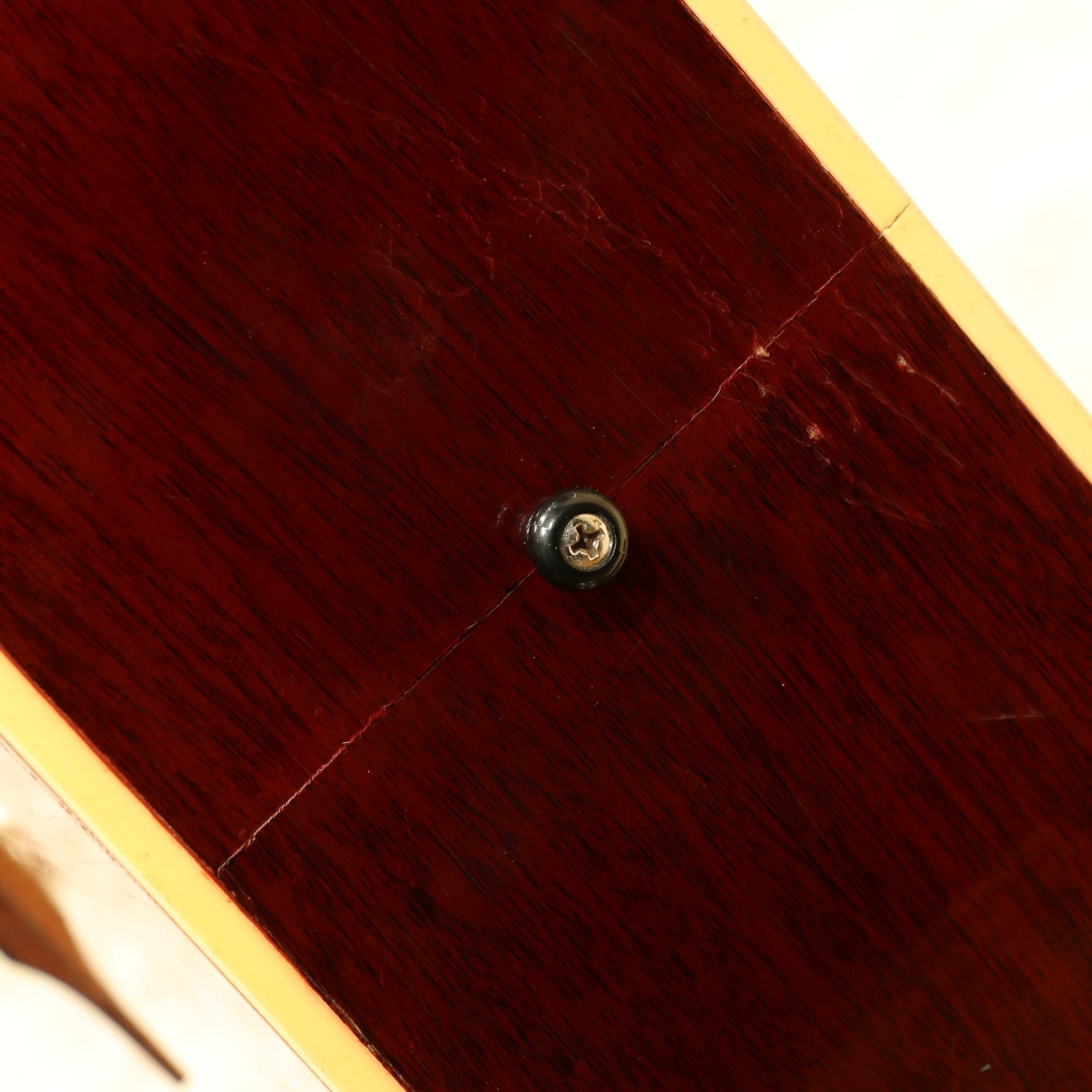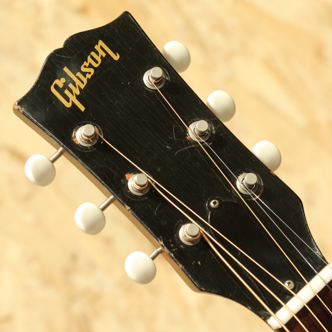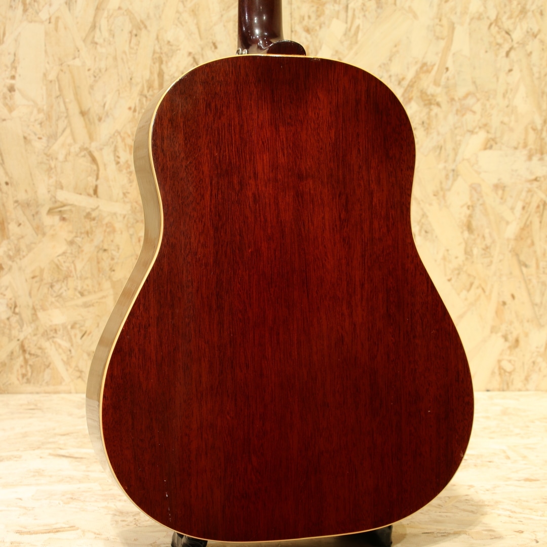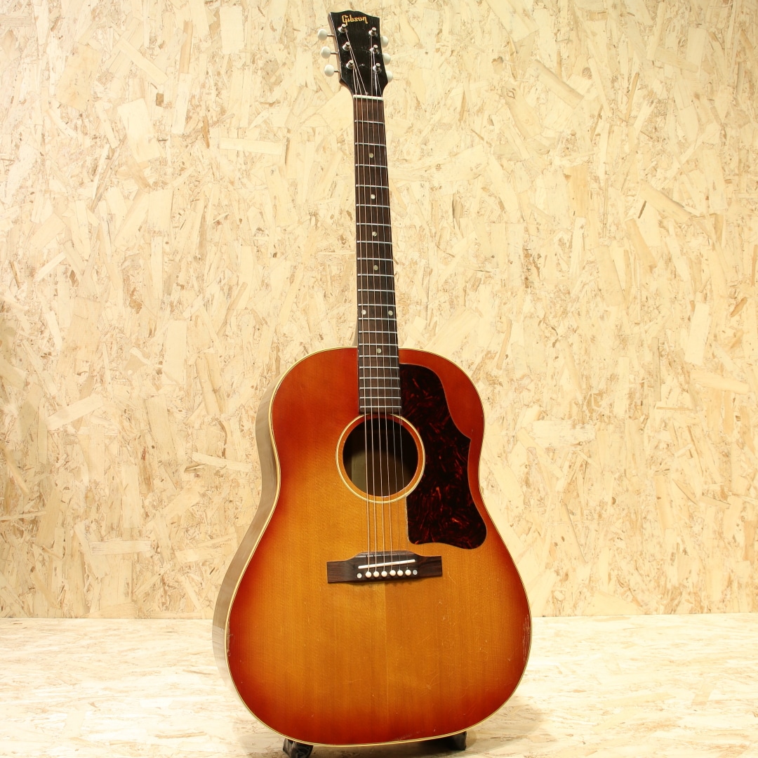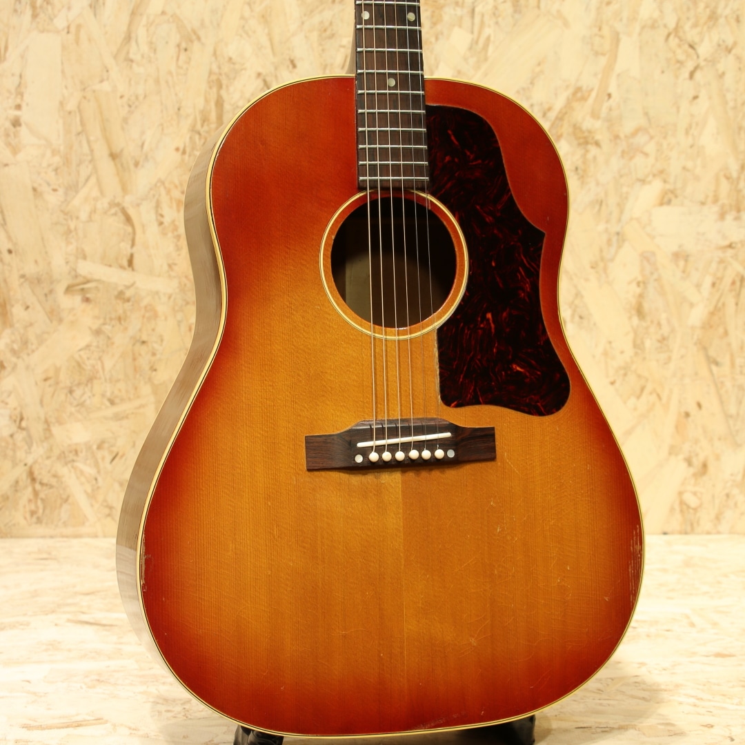 1942年の登場より不動の人気を誇るJ-45。現在に至るまでアコースティックギターシーンのトップを走り続けるロングセラーモデルです。本機は50年代後半と60年代前半のスペックを併せ持つ"J-45"。1961年製Vintage品。スプルーストップ、マホガニーサイド&バック、マホガニーネック、ハカランダ指板&ブリッジ、ノーマルストレートサドル、オリジナル・シン・ポインテッド・ラージピックガード、シングルリングロゼッタ、ワンライン3連クルーソンタイプペグ、ノンスキャロップドXブレイシング。60年代の極初期に見られる色味の濃いダークチェリーサンバーストを備えたJ45。スキャロップ期から1955年頃にノンスキャロップへと変更が入った歴史を持つJ-45。そこからも年々ブレイシングの高さや幅が変わるなど年を追うごとにサウンドの傾向が変わっていきます。本器の頃には細く高い形状へと変化しており、シャープな音色とスピーディな反応性を獲得しています。50年代の太く甘く泥臭さを感じる音色からスッキリと輪郭感のある響きへ、それでありつつも箱全体で増幅しているような空気感のある響きも持ち合わせます。60年代前半のADJと比べるとよりダイレクトなレスポンス、コシのあるサウンド、音色の太さが武器となるでしょう。一度触ると病みつきになるであろうGood Soundの1本です。ネックヒールサイドにストラップピン装着。ブリッジプレートは当時の接着剤を使用していない為リプレイス、同時にブリッジも交換されていますが、両者とも非常に精巧に作られておりぱっと見では見紛うほどの仕上がりです。Vintageではよく見られるピックガードに沿って割れる木部クラックがピックガード内側、サウンドホール上部と下部に見られますが、両者とも接着と内部にパッチが施され問題なく使用できる状態となっています。上記修理跡こそ見られるもののその他には細やかな当てキズや擦れキズが見られる程度と良好な状態をキープされている個体。ネック周りの状態も良く、50年代後半と比べて薄くなったグリップ感も相まって高い演奏性を持っている1本です。50年代後半より演奏性とサウンドが変化、同時期のADJとはサウンドが異なる中間的な印象のJ45。ノーマルスロット故のコシやサスティーン、パンチ感が魅力的な個体です。また一味違った個性を持つ1本、是非ご検討下さい。