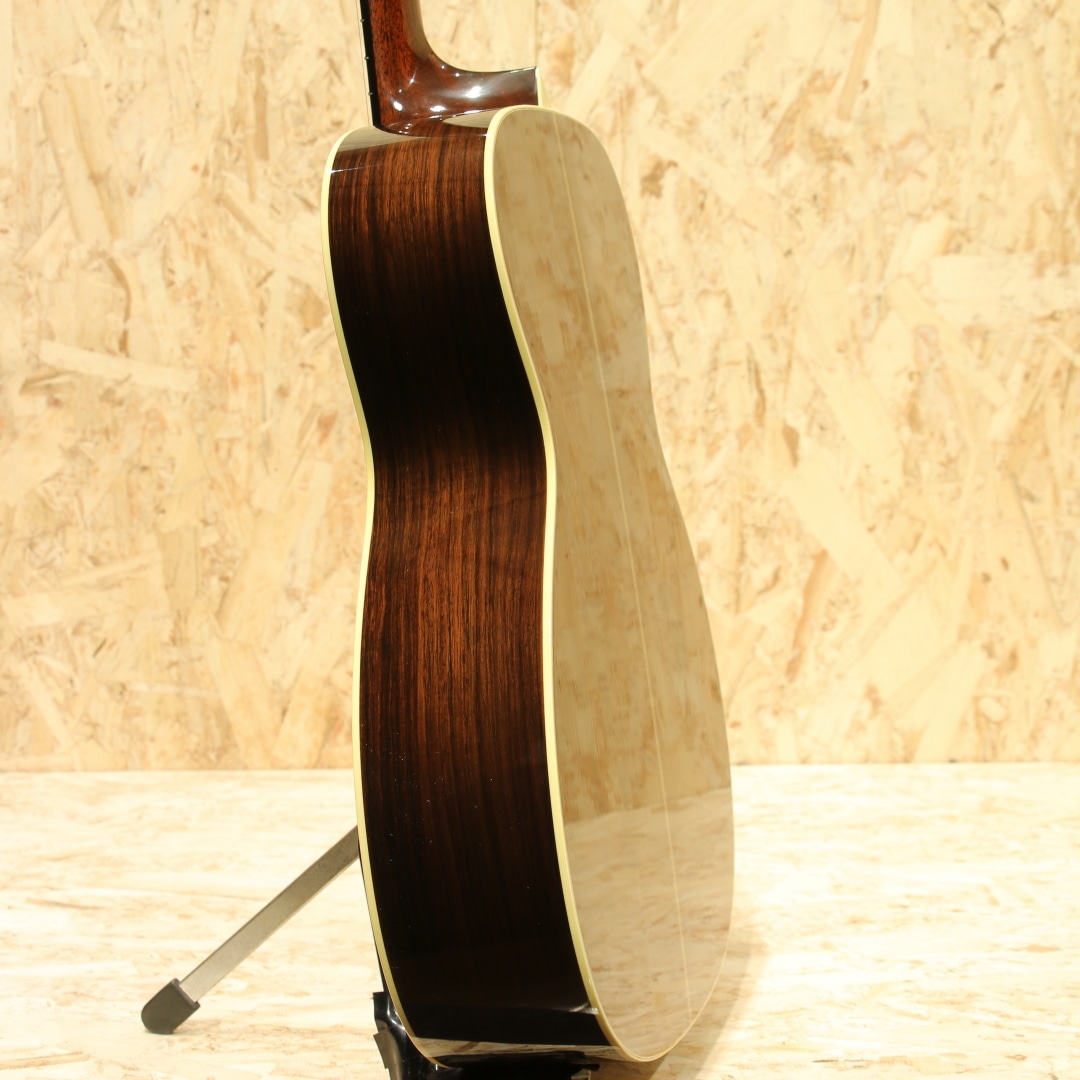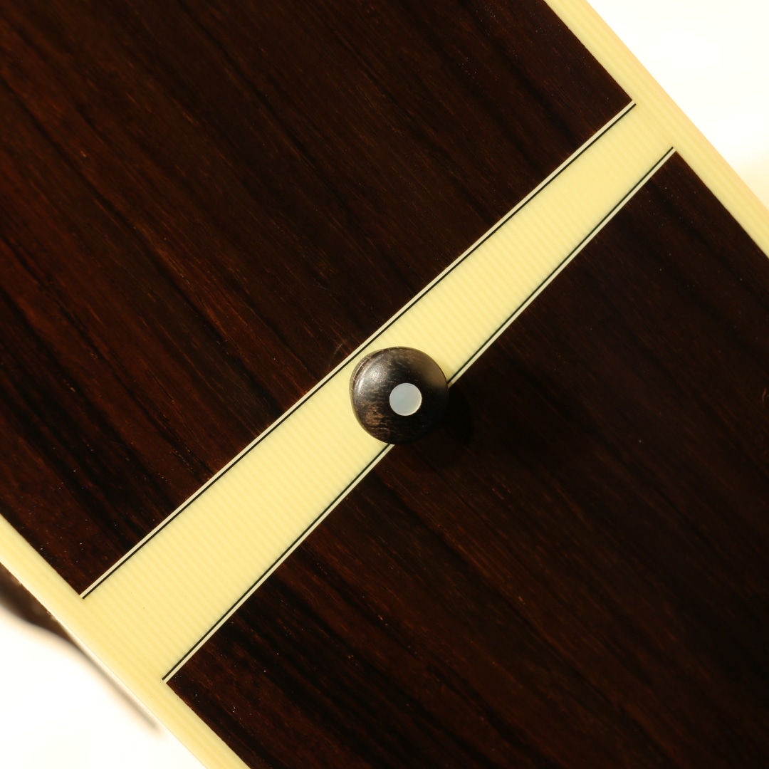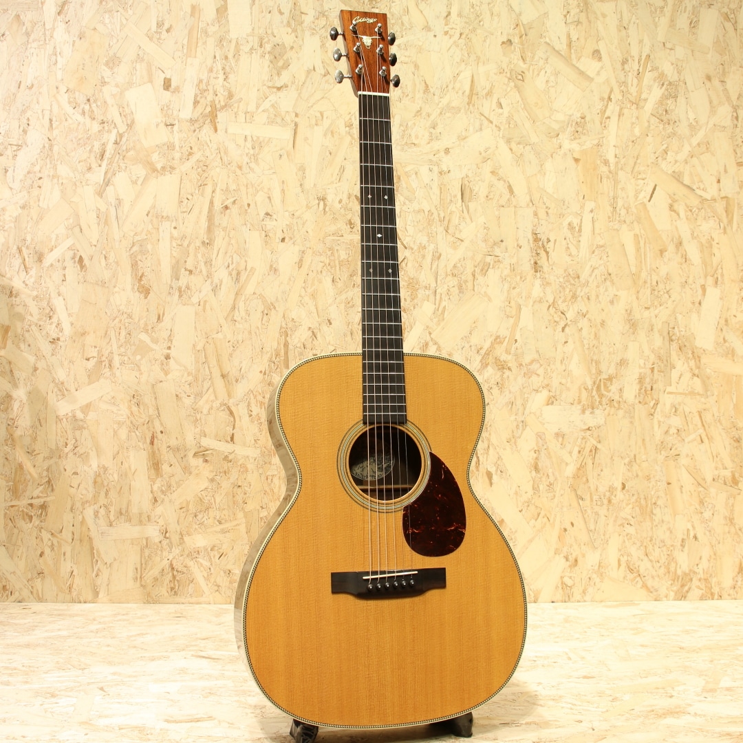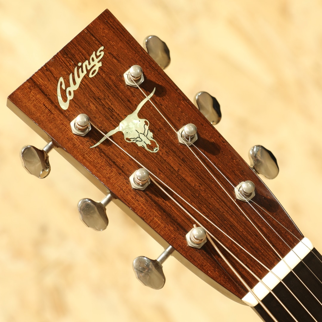 世界的にもっとも高い評価を得ているブランドの一つであるコリングスギター。コリングスの高く保たれたその完成度は、プレイヤーがその楽器を手に持つだけで見惚れてしまう美しさを持ち、音を出せば納得する響きを放ちます。本器はテキサスロングホーンを冠したカスタムメイドの"OM2H Ba”。2003年製のUSED品です。目の整った均整な木目のスプルーストップ、ワイルドな杢目の入ったハカランダサイド&バック、強化金属プレート入りボルトオンホンジュラスマホガニーネック、エボニー指板&ブリッジ、オリジナルウェバリーペグ、オリジナルベッコウセルピックガード、ダイアモンド指板ポジション、ヘリンボーントリム、アイボロイドバインディング、ロングホーン(水牛)ヘッドインレイ、オリジナルスキャロップドXブレイシング。トラディショナルなスタイルを得意とするコリングス、そのコリングスが稀にしか使用することのないハカランダを贅沢にも使用したトラディショナルなスペックを持つ個体。そしてコリングスの中でも定番と言えるOM、ハリのある響きやレンジ感、そして立ち上がりの鋭さ。各帯域のバランス感にも優れた秀逸器と言えるでしょう。音色の太さとキメの細やかな解像度の高いサウンド、磨き抜かれたような艶やかさのある響き。ハカランダ特有の硬質さや抜けの良いハイレンジサウンドも相まって透明感を持った音色を生み出してくれます。各弦の分離感や立ち上がりの素早さに関しては流石としか言えません。どのポジションにおいても余すことなく使える粒立ちの良さ、ピアノトーンを目標としていたその回答が垣間見える1本。スケール長も充分な為ダウンチューニングにも十分対応できるオールマイティさを兼ね備えた王道トラッドなOMです。ボディトップ面1弦側ショルダーやブリッジ下部に光に透かすと見える程度の極薄い当てキズやボディバック面の薄い線キズ、ピックガードの薄い弾きキズ等見られますが、20年余りの時間の経過を考えると非常にキレイなコンディションをキープ。非常に丁寧に扱われてきたことが窺えます。ネックのコンディションも良好、サドル残もしっかりと残したバッチリの状態をキープした個体です。名門コリングスが作り上げるOM。確かな精度、クオリティ、実用性の高さは折り紙付きです。更には滅多に使われない材まで備えたスペシャルな1本。是非お見逃しなく。