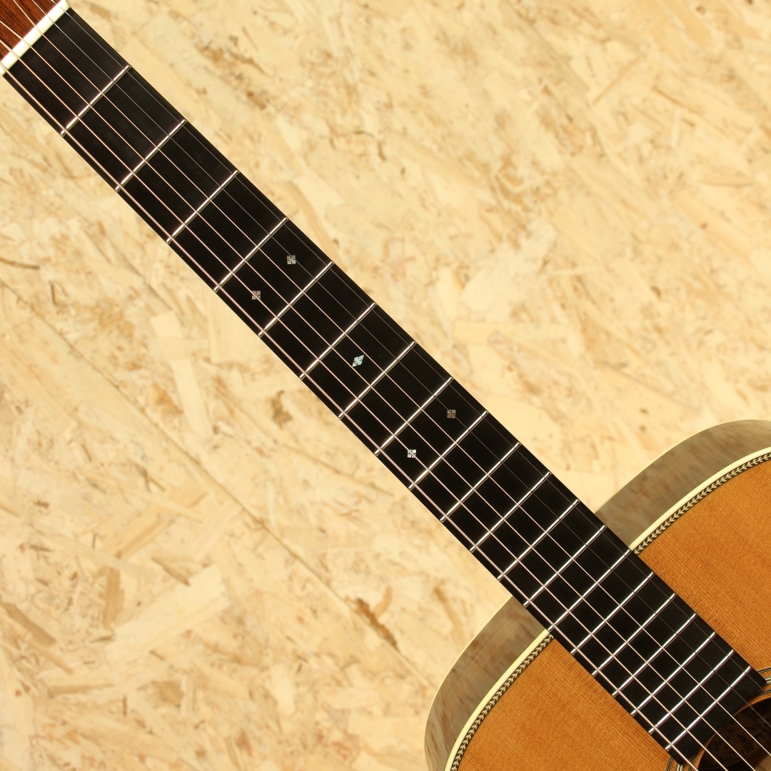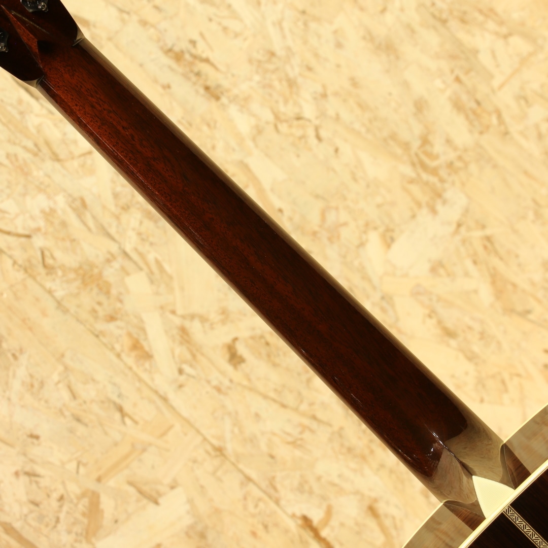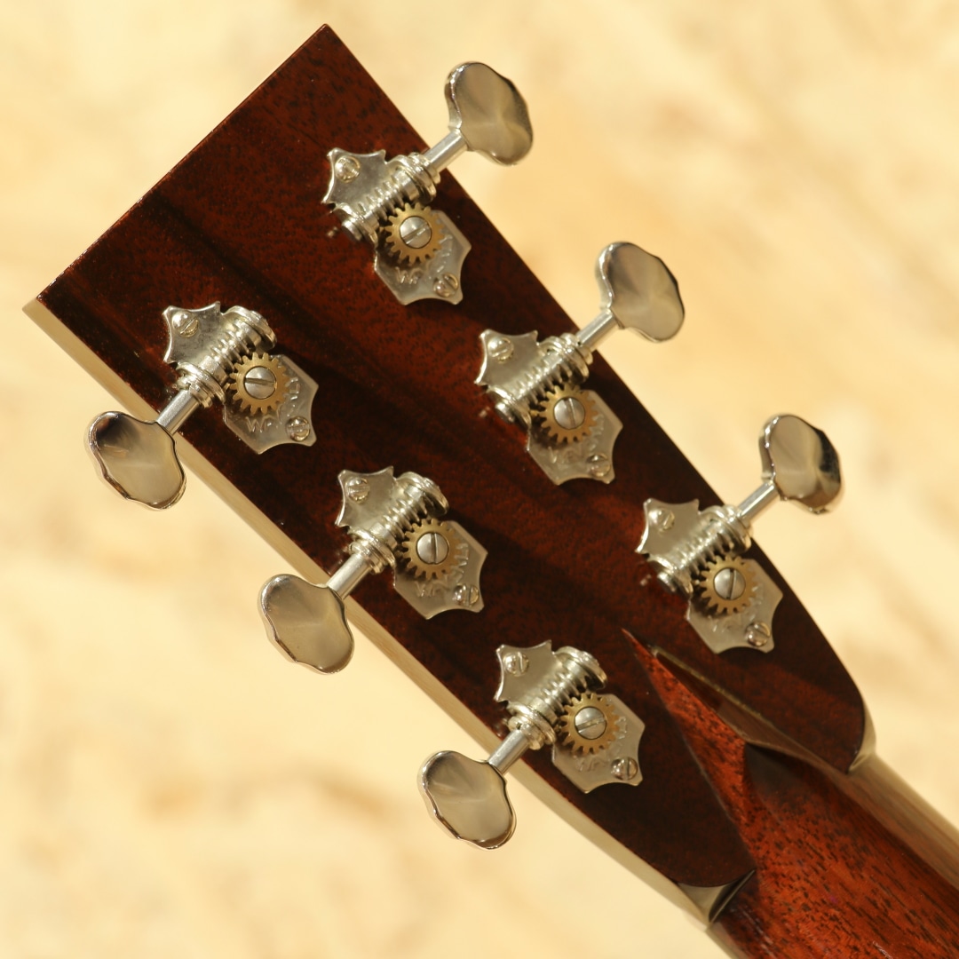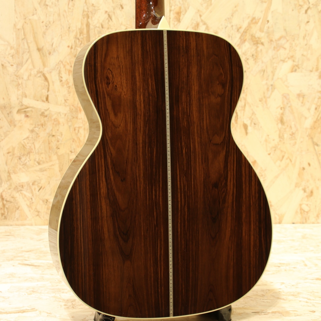 世界的にもっとも高い評価を得ているブランドの一つであるコリングスギター。コリングスの高く保たれたその完成度は、プレイヤーがその楽器を手に持つだけで見惚れてしまう美しさを持ち、音を出せば納得する響きを放ちます。本器はテキサスロングホーンを冠したカスタムメイドの"OM2H Ba”。2003年製のUSED品です。目の整った均整な木目のスプルーストップ、ワイルドな杢目の入ったハカランダサイド&バック、強化金属プレート入りボルトオンホンジュラスマホガニーネック、エボニー指板&ブリッジ、オリジナルウェバリーペグ、オリジナルベッコウセルピックガード、ダイアモンド指板ポジション、ヘリンボーントリム、アイボロイドバインディング、ロングホーン(水牛)ヘッドインレイ、オリジナルスキャロップドXブレイシング。トラディショナルなスタイルを得意とするコリングス、そのコリングスが稀にしか使用することのないハカランダを贅沢にも使用したトラディショナルなスペックを持つ個体。そしてコリングスの中でも定番と言えるOM、ハリのある響きやレンジ感、そして立ち上がりの鋭さ。各帯域のバランス感にも優れた秀逸器と言えるでしょう。音色の太さとキメの細やかな解像度の高いサウンド、磨き抜かれたような艶やかさのある響き。ハカランダ特有の硬質さや抜けの良いハイレンジサウンドも相まって透明感を持った音色を生み出してくれます。各弦の分離感や立ち上がりの素早さに関しては流石としか言えません。どのポジションにおいても余すことなく使える粒立ちの良さ、ピアノトーンを目標としていたその回答が垣間見える1本。スケール長も充分な為ダウンチューニングにも十分対応できるオールマイティさを兼ね備えた王道トラッドなOMです。ボディトップ面1弦側ショルダーやブリッジ下部に光に透かすと見える程度の極薄い当てキズやボディバック面の薄い線キズ、ピックガードの薄い弾きキズ等見られますが、20年余りの時間の経過を考えると非常にキレイなコンディションをキープ。非常に丁寧に扱われてきたことが窺えます。ネックのコンディションも良好、サドル残もしっかりと残したバッチリの状態をキープした個体です。名門コリングスが作り上げるOM。確かな精度、クオリティ、実用性の高さは折り紙付きです。更には滅多に使われない材まで備えたスペシャルな1本。是非お見逃しなく。