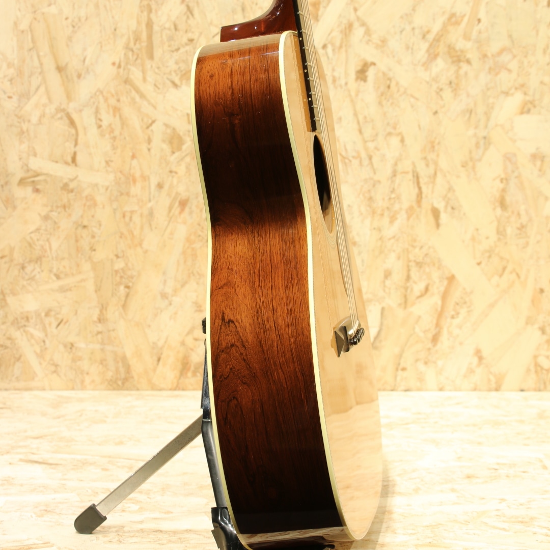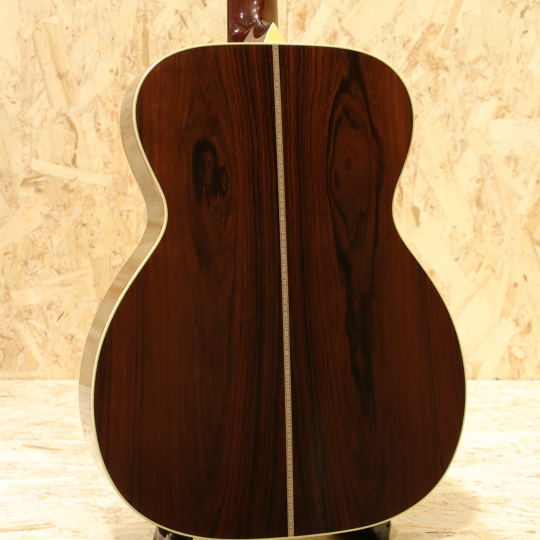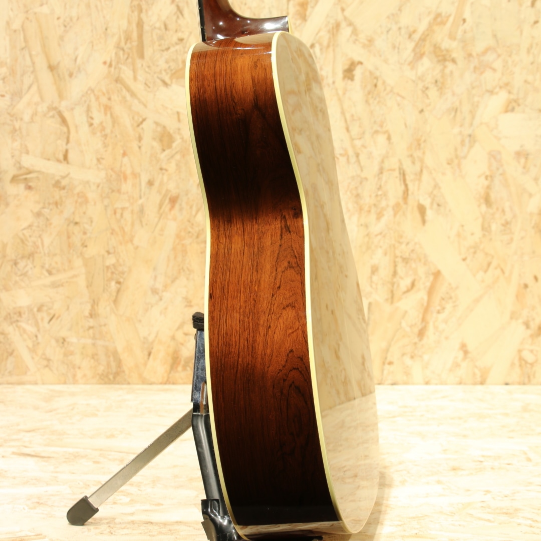 世界的にもっとも高い評価を得ているブランドの一つであるコリングスギター。コリングスの高く保たれたその完成度は、プレイヤーがその楽器を手に持つだけで見惚れてしまう美しさを持ち、音を出せば納得する響きを放ちます。本器は流通稀なハカランダS&Bの逸品”OM2H Ba Jacaranda”。ラッカー塗装期に作られたカスタムモデル。1994年製USED品。目幅の狭い柾目杢が浮き出る極上スプルーストップ、センターにしっかりと柾目杢を配した極上ハカランダサイド&バック、ホンジュラスマホガニーネック、エボニー指板、エボニーレクタングルピラミッドブリッジ、ウェバリーオープンバックペグ、べっ甲柄ピックガード、ヘリンボーントリムパーフリング、ジグザグバックストリップ、アイボロイドバインディング、トップ構造は戦前マーチンの問題点を考慮したオリジナルスキャロップブレイシング、ラッカーフィニッシュ。エキゾチックウッドS&Bモデル自体が流通少なく、またハカランダモデルは他社に比べても珍しいコリングス。音色の太さとキメの細やかな解像度の高いサウンド、磨き抜かれたような艶やかさのある響き。ハカランダ特有の硬質さや抜けの良いハイレンジサウンドも相まって透明感を持った音色を生み出してくれます。各弦の分離感や立ち上がりの素早さに関しては流石としか言えません。どのポジションにおいても余すことなく使える粒立ちの良さ、倍音の乗ったファットなトーンとサスティンに富んだコシのある響き。スケール長も充分な為ダウンチューニングにも十分対応できるオールマイティさを兼ね備えた王道トラッドなOMです。後付けでOval Witz Passiveピックアップを搭載。コンタクトピエゾによってボディトップ面の振動をキャッチ、ピックがボディに当たる音や打音にも反応するポテンシャルを持ちます。パッシブ仕様で電池を必要とせず、出力こそ低めではあるものの足元にプリアンプを置くことでより自由度の高い音作りが可能となります。使用に伴う若干の小傷は見られますが、30年経過してることを考えると大切に弾かれてきたことが伺えます。大きく目立つ傷や使用感もなく、割れなどもなく良好。ネックまわりのコンディションは言わずもがな。パーフェクトなコンディションで弾き心地とも抜群です。コリングスがその実力を馳せたOMモデル。流通稀なハカランダモデルのまさにコレクタブルな1本です。お見逃しなく。