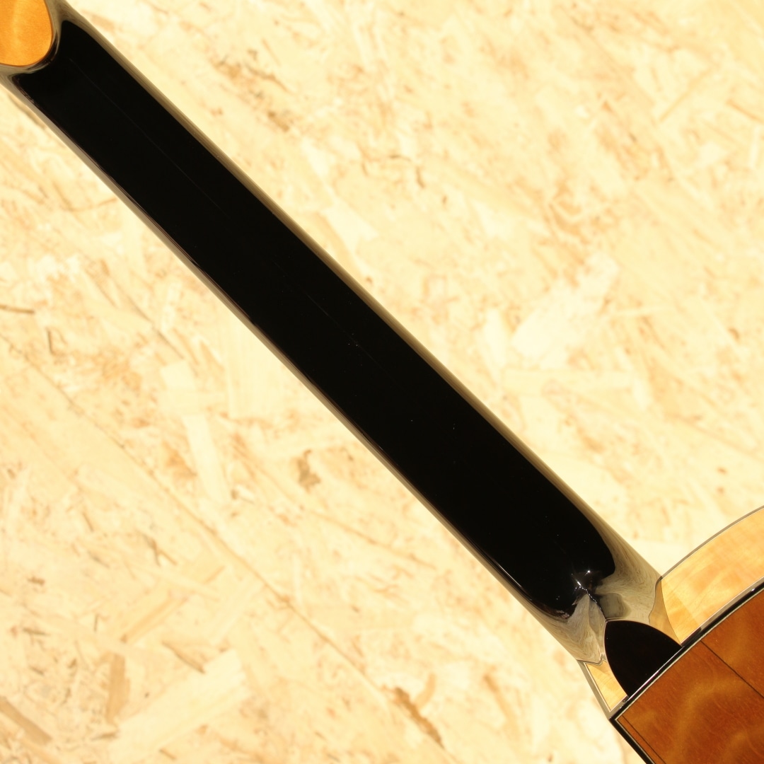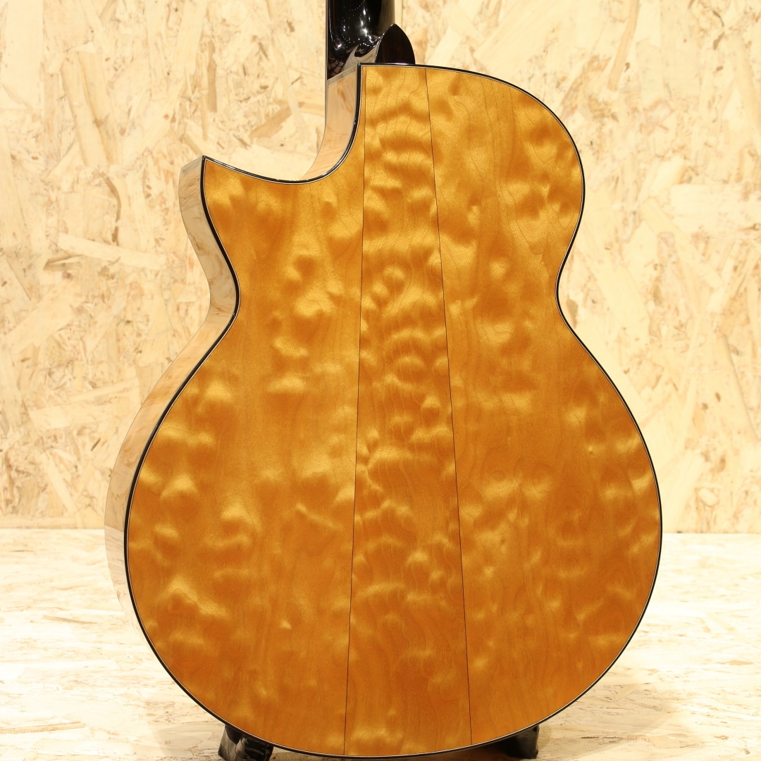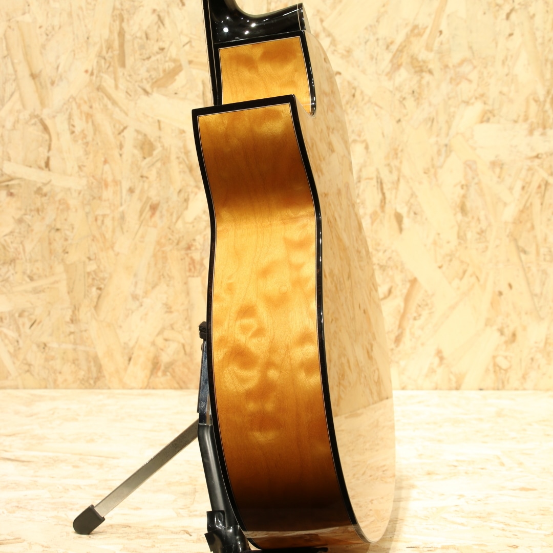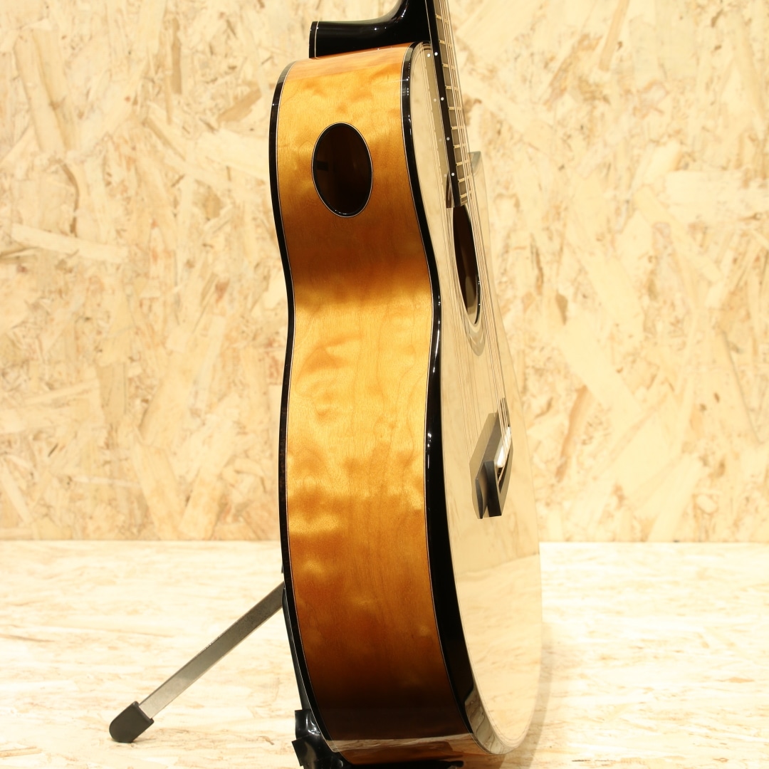 カナダはケベック州に工房を構えるルシアー"Michel Pellerin(ミシェル・ペレリン)"の"Pellerin Guitars"。彼は18歳の頃よりギター製作に従事し、キャリアは25年を越えるベテラン域の製作家。大手製作工場での経験もありましたが、自身のアイデアをフルに製作に注ぎ込めるよう個人での製作を開始。ケベックの国立弦楽器学校で修理や仕上げ、ニス塗りを伝授していた経歴を持ち、その中には世界的に有名な製作家も彼の個人レッスンを受けることがあるほどの塗装の名手としても知られています。 本器は16インチのオリジナルスモールジャンボボディ、ファンフレットにて製作された"Small Jumbo Cutaway Fanfret Adirondack Spruce/Quilted Maple"。木肌の美しいアディロンダックスプルーストップ、サイド&バックには角度によって幻想的な揺らめきを感じるキルテッドメイプルを採用。マホガニーネック、エボニー指板、エボニーブリッジ(スルーブリッジ)、ゴトー510クロームペグ、バールメイプル&アバロン&フレイムメイプルロゼッタ、フレイムメイプルトップパーフリング、エボニーバインディング、フローレンタインカッタウェイ、フローレンタインカッタウェイ、アームレストベベル、サイドサウンドポート、スモールジャンボボディ。トップブレイス構造はラティス構造のようなマルチスケール用のトリプルXブレイシングが採用されています。本器の魅力の1つでもあるマルチスケールを用いたファンフレットネック。バリトンスケールほどは長くなく、6弦側26”(660.4mm)/1弦側25”(635.0mm)の12fストレートでのスケールが採用されています。ナットワイズは46mm、非常に滑らかに仕上げられた薄手のネック形状。幅広さの感じない収まりの良いシェイプはオールポジションでストレスを感じさせない操作性を実現します。スモールジャンボシェイプが生み出す迫力のボリューム、音の立ち上がりに優れ程良くシャープさを感じる明瞭なトーン。氏のラインナップにもあるジャンボサイズをそのまま縮小した本サイズですが、サイズダウンにより力強さのありながら耳馴染みの良い低音、硬質でありながら金属質の少ないクリアな高音とのバランスは素晴らしい整合性を持ちます。コシのある実直なトーンで堅牢さもありながら、タッチニュアンスにも敏感に反応。ダイナミクスレンジにも優れ、ソフトなタッチからハードなアタック感まで繊細に表現します。ダウンチューニングや変則チューニング時もしっかりと対応し、安定したピッチで迫力のあるサウンドを響かせます。エボニー×フレイムメイプルを組み合わせた統一感ある外観。技術の高い精巧な仕上げ。そして、名だたる製作家から絶大な信頼を誇る塗装技術。偉大なソモジ氏の1番弟子としても名を馳せるマリオ氏の弟子としても知られる"Michel Pellerin(ミシェル・ペレリン)"。是非このサウンド、ルックスをお手元でご体感ください。Pellerin Guitarロゴ入りヒスコック製ハードケースが付属します。