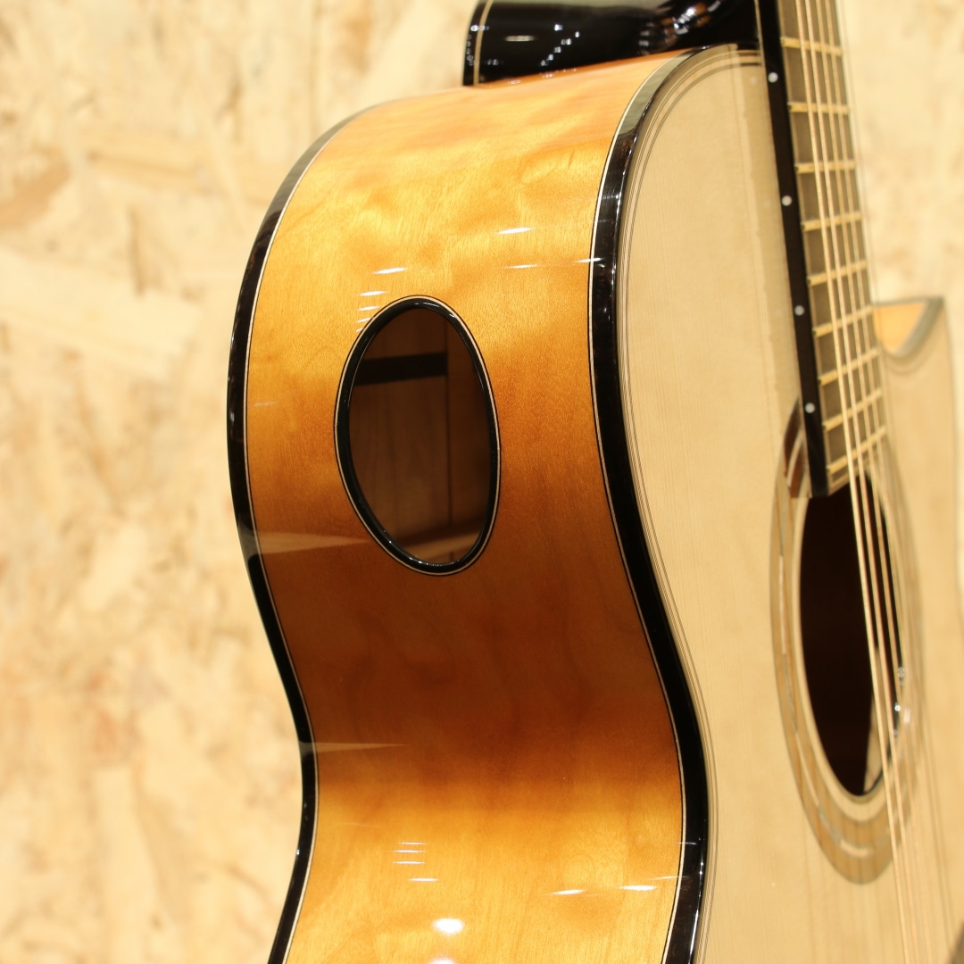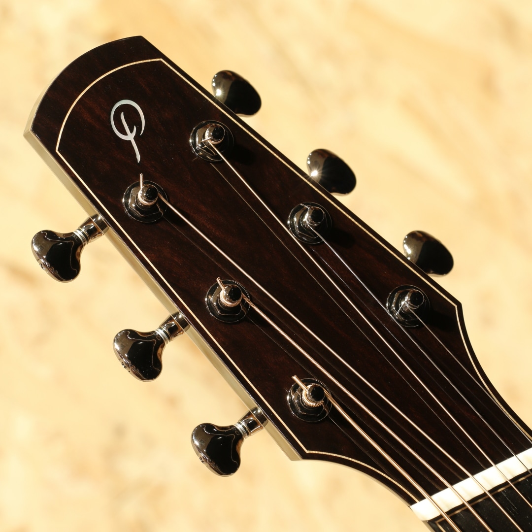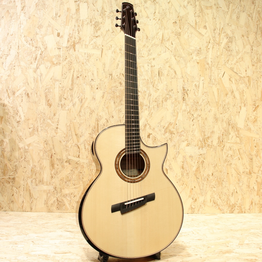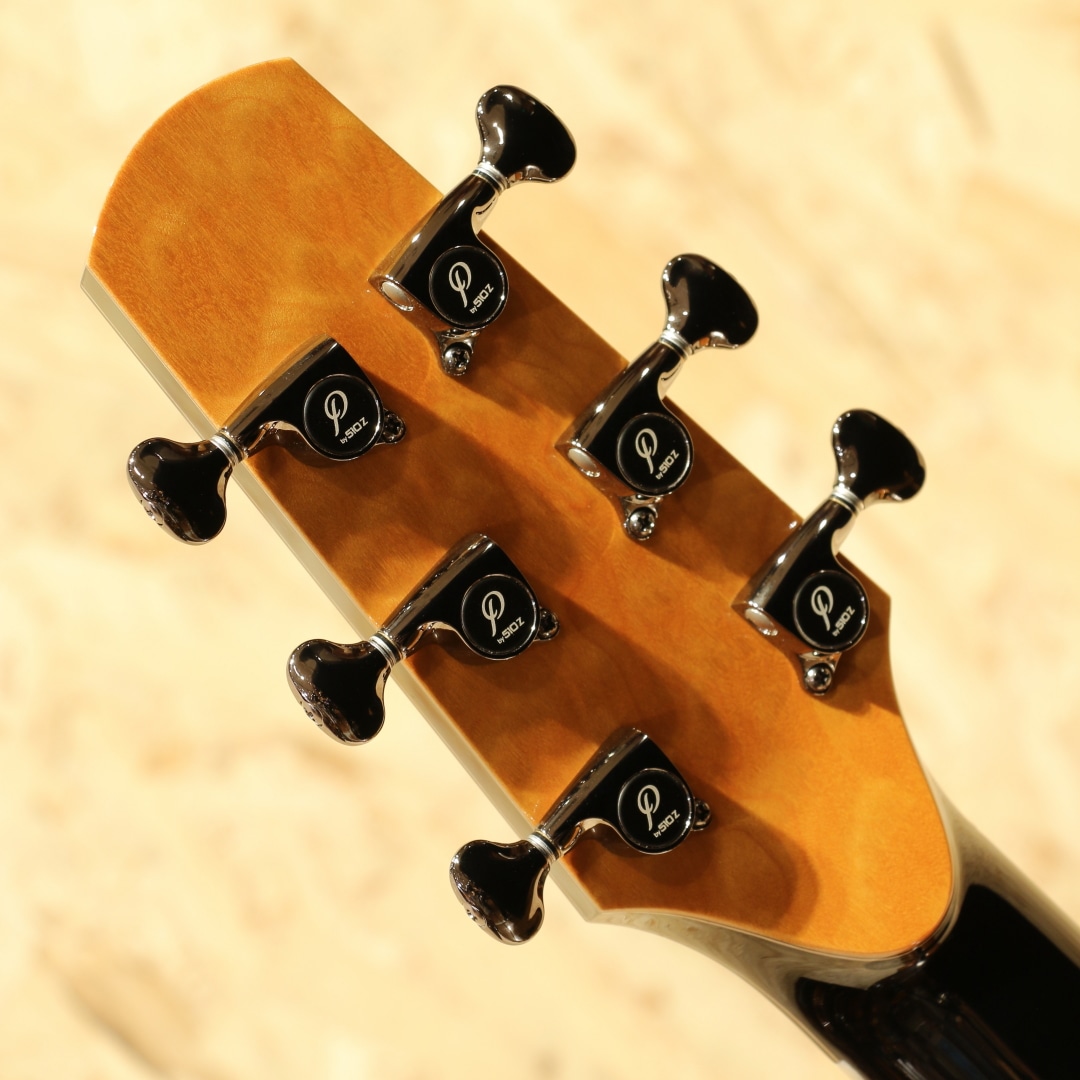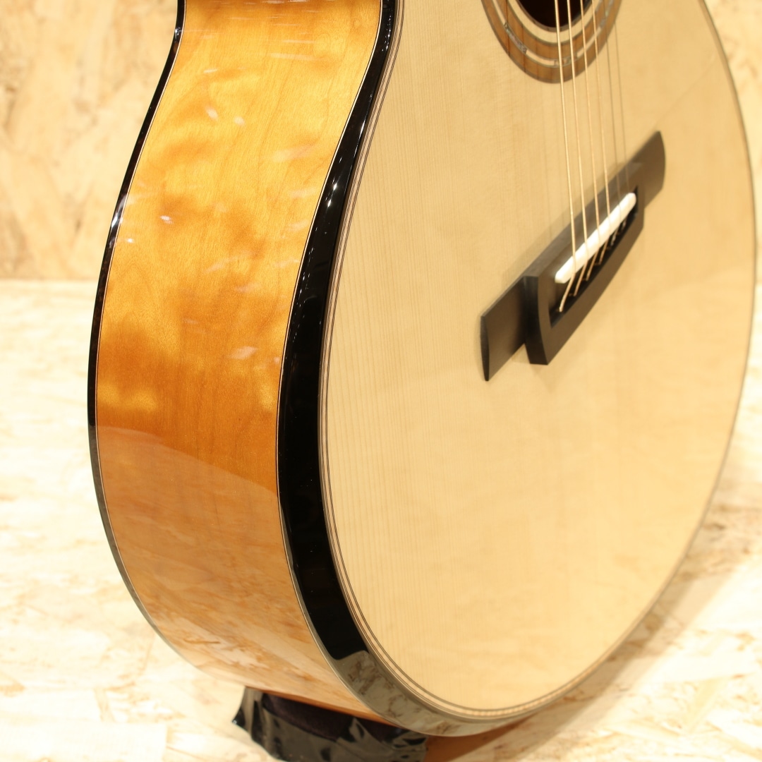 カナダはケベック州に工房を構えるルシアー"Michel Pellerin(ミシェル・ペレリン)"の"Pellerin Guitars"。彼は18歳の頃よりギター製作に従事し、キャリアは25年を越えるベテラン域の製作家。大手製作工場での経験もありましたが、自身のアイデアをフルに製作に注ぎ込めるよう個人での製作を開始。ケベックの国立弦楽器学校で修理や仕上げ、ニス塗りを伝授していた経歴を持ち、その中には世界的に有名な製作家も彼の個人レッスンを受けることがあるほどの塗装の名手としても知られています。 本器は16インチのオリジナルスモールジャンボボディ、ファンフレットにて製作された"Small Jumbo Cutaway Fanfret Adirondack Spruce/Quilted Maple"。木肌の美しいアディロンダックスプルーストップ、サイド&バックには角度によって幻想的な揺らめきを感じるキルテッドメイプルを採用。マホガニーネック、エボニー指板、エボニーブリッジ(スルーブリッジ)、ゴトー510クロームペグ、バールメイプル&アバロン&フレイムメイプルロゼッタ、フレイムメイプルトップパーフリング、エボニーバインディング、フローレンタインカッタウェイ、フローレンタインカッタウェイ、アームレストベベル、サイドサウンドポート、スモールジャンボボディ。トップブレイス構造はラティス構造のようなマルチスケール用のトリプルXブレイシングが採用されています。本器の魅力の1つでもあるマルチスケールを用いたファンフレットネック。バリトンスケールほどは長くなく、6弦側26”(660.4mm)/1弦側25”(635.0mm)の12fストレートでのスケールが採用されています。ナットワイズは46mm、非常に滑らかに仕上げられた薄手のネック形状。幅広さの感じない収まりの良いシェイプはオールポジションでストレスを感じさせない操作性を実現します。スモールジャンボシェイプが生み出す迫力のボリューム、音の立ち上がりに優れ程良くシャープさを感じる明瞭なトーン。氏のラインナップにもあるジャンボサイズをそのまま縮小した本サイズですが、サイズダウンにより力強さのありながら耳馴染みの良い低音、硬質でありながら金属質の少ないクリアな高音とのバランスは素晴らしい整合性を持ちます。コシのある実直なトーンで堅牢さもありながら、タッチニュアンスにも敏感に反応。ダイナミクスレンジにも優れ、ソフトなタッチからハードなアタック感まで繊細に表現します。ダウンチューニングや変則チューニング時もしっかりと対応し、安定したピッチで迫力のあるサウンドを響かせます。エボニー×フレイムメイプルを組み合わせた統一感ある外観。技術の高い精巧な仕上げ。そして、名だたる製作家から絶大な信頼を誇る塗装技術。偉大なソモジ氏の1番弟子としても名を馳せるマリオ氏の弟子としても知られる"Michel Pellerin(ミシェル・ペレリン)"。是非このサウンド、ルックスをお手元でご体感ください。Pellerin Guitarロゴ入りヒスコック製ハードケースが付属します。