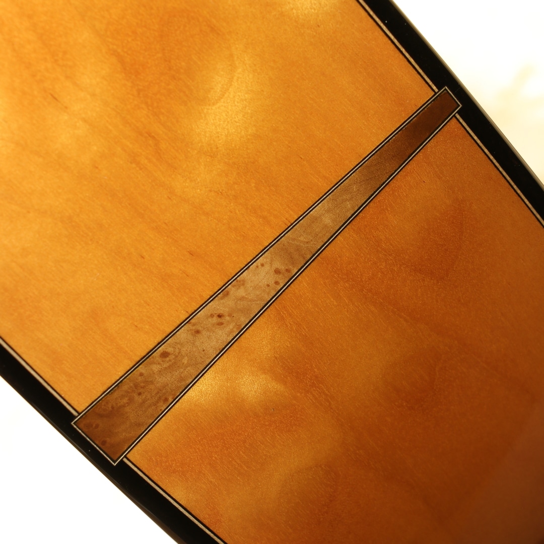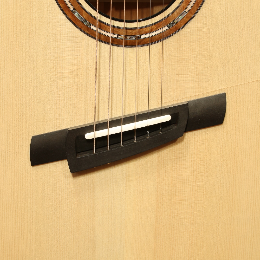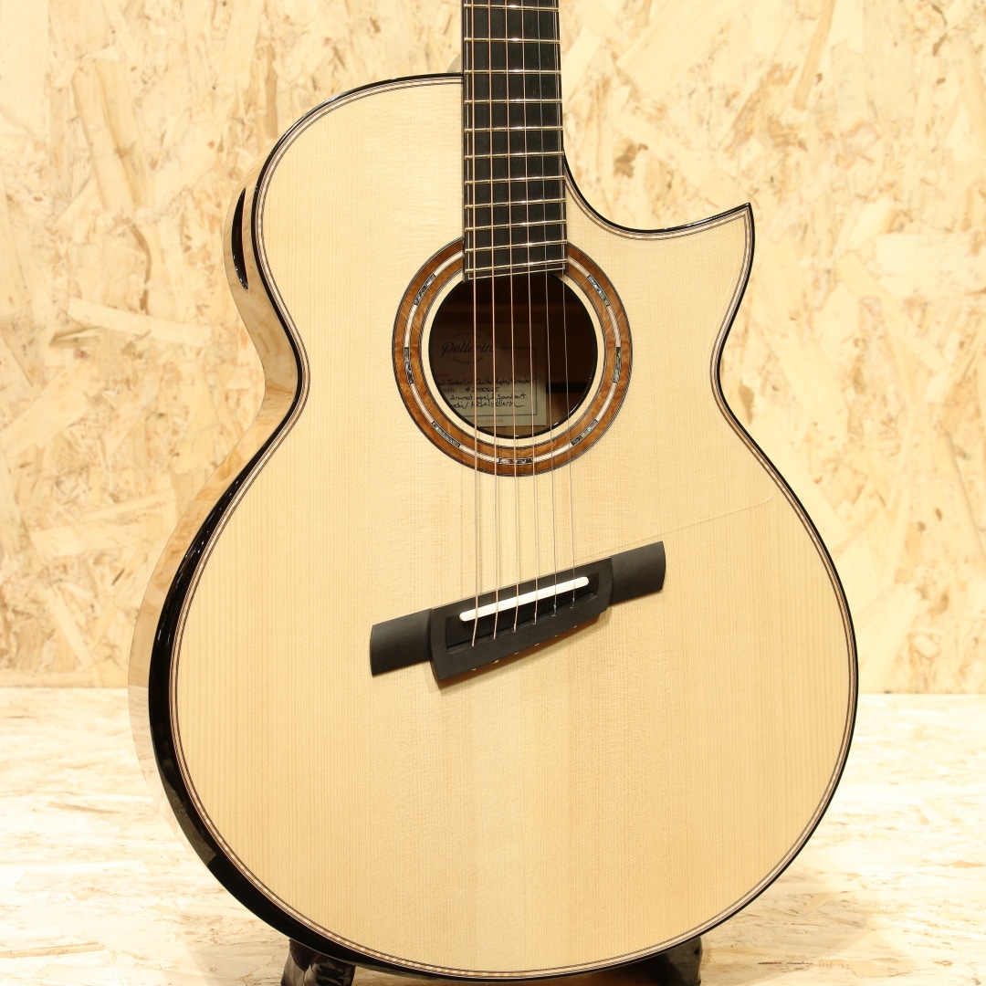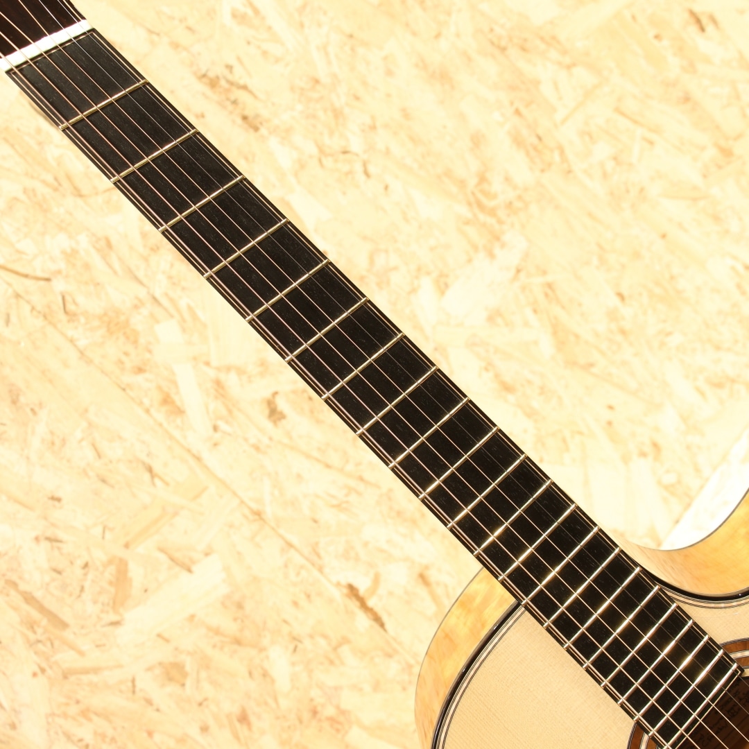 カナダはケベック州に工房を構えるルシアー"Michel Pellerin(ミシェル・ペレリン)"の"Pellerin Guitars"。彼は18歳の頃よりギター製作に従事し、キャリアは25年を越えるベテラン域の製作家。大手製作工場での経験もありましたが、自身のアイデアをフルに製作に注ぎ込めるよう個人での製作を開始。ケベックの国立弦楽器学校で修理や仕上げ、ニス塗りを伝授していた経歴を持ち、その中には世界的に有名な製作家も彼の個人レッスンを受けることがあるほどの塗装の名手としても知られています。 本器は16インチのオリジナルスモールジャンボボディ、ファンフレットにて製作された"Small Jumbo Cutaway Fanfret Adirondack Spruce/Quilted Maple"。木肌の美しいアディロンダックスプルーストップ、サイド&バックには角度によって幻想的な揺らめきを感じるキルテッドメイプルを採用。マホガニーネック、エボニー指板、エボニーブリッジ(スルーブリッジ)、ゴトー510クロームペグ、バールメイプル&アバロン&フレイムメイプルロゼッタ、フレイムメイプルトップパーフリング、エボニーバインディング、フローレンタインカッタウェイ、フローレンタインカッタウェイ、アームレストベベル、サイドサウンドポート、スモールジャンボボディ。トップブレイス構造はラティス構造のようなマルチスケール用のトリプルXブレイシングが採用されています。本器の魅力の1つでもあるマルチスケールを用いたファンフレットネック。バリトンスケールほどは長くなく、6弦側26”(660.4mm)/1弦側25”(635.0mm)の12fストレートでのスケールが採用されています。ナットワイズは46mm、非常に滑らかに仕上げられた薄手のネック形状。幅広さの感じない収まりの良いシェイプはオールポジションでストレスを感じさせない操作性を実現します。スモールジャンボシェイプが生み出す迫力のボリューム、音の立ち上がりに優れ程良くシャープさを感じる明瞭なトーン。氏のラインナップにもあるジャンボサイズをそのまま縮小した本サイズですが、サイズダウンにより力強さのありながら耳馴染みの良い低音、硬質でありながら金属質の少ないクリアな高音とのバランスは素晴らしい整合性を持ちます。コシのある実直なトーンで堅牢さもありながら、タッチニュアンスにも敏感に反応。ダイナミクスレンジにも優れ、ソフトなタッチからハードなアタック感まで繊細に表現します。ダウンチューニングや変則チューニング時もしっかりと対応し、安定したピッチで迫力のあるサウンドを響かせます。エボニー×フレイムメイプルを組み合わせた統一感ある外観。技術の高い精巧な仕上げ。そして、名だたる製作家から絶大な信頼を誇る塗装技術。偉大なソモジ氏の1番弟子としても名を馳せるマリオ氏の弟子としても知られる"Michel Pellerin(ミシェル・ペレリン)"。是非このサウンド、ルックスをお手元でご体感ください。Pellerin Guitarロゴ入りヒスコック製ハードケースが付属します。