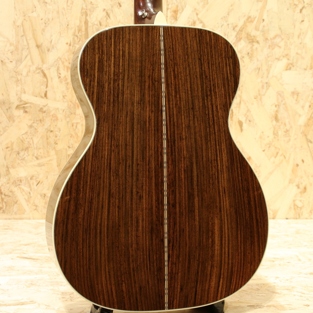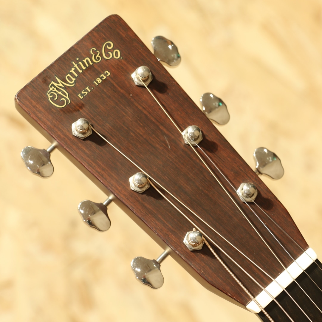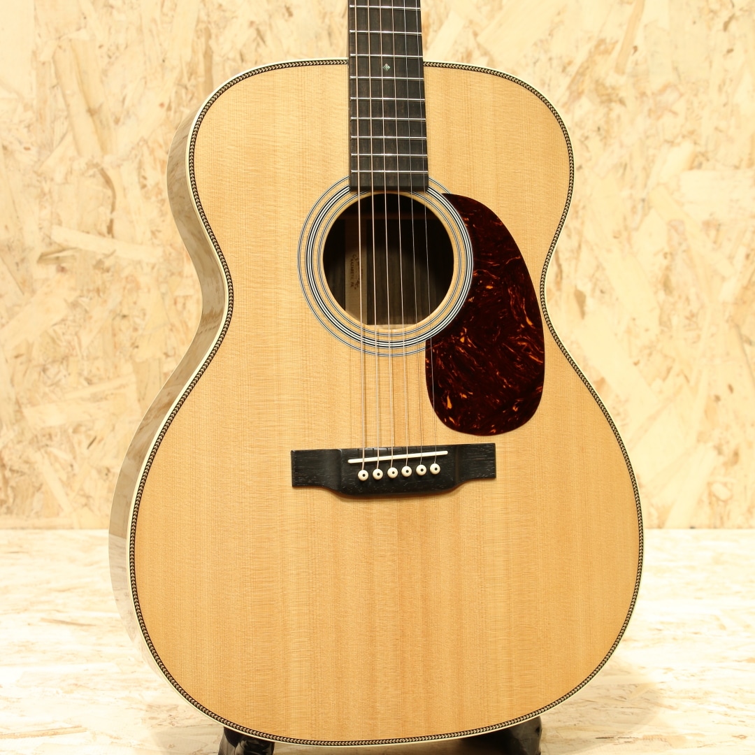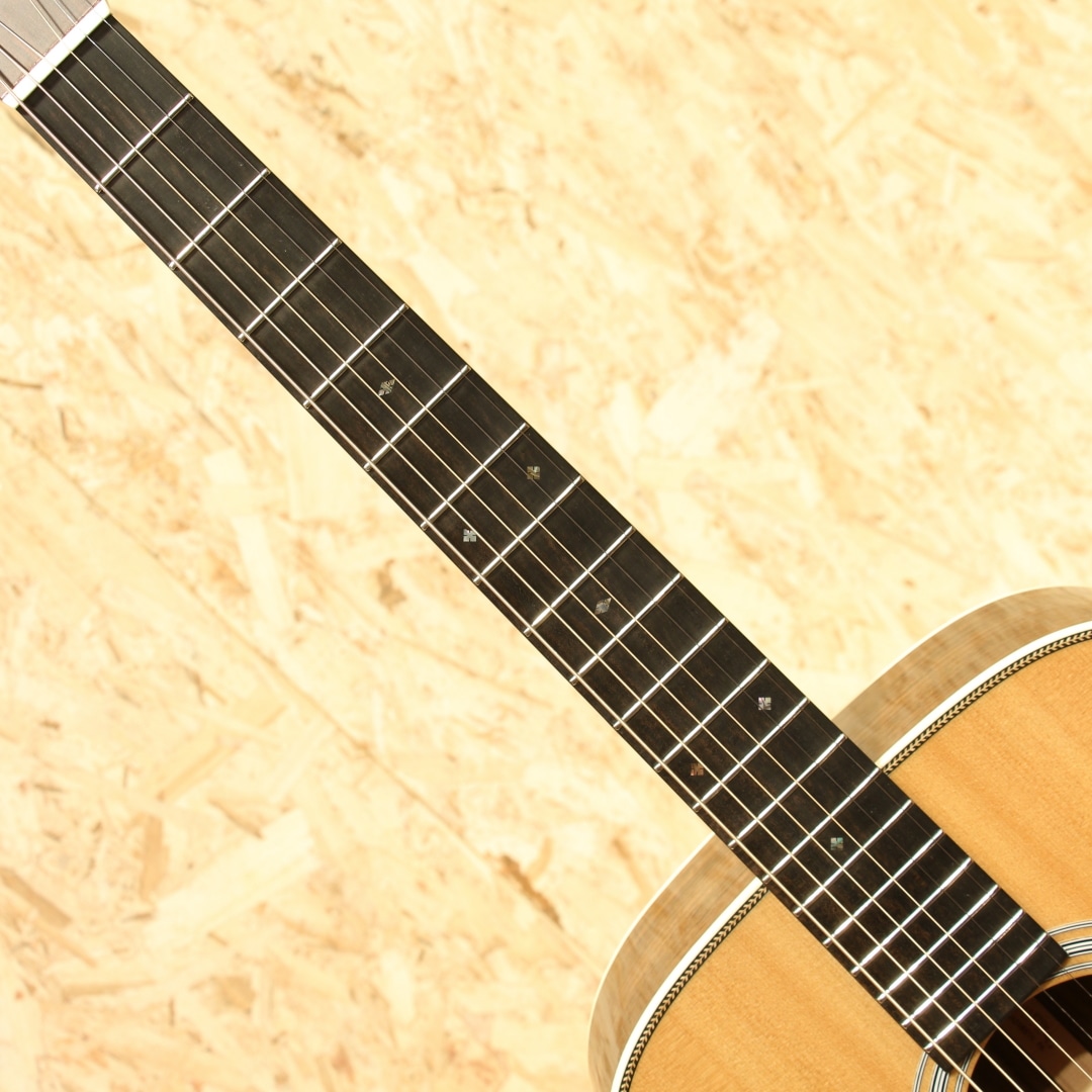 現マーチン工場の中でも、卓越した技術と豊富な経験から至極のギターを造り出す"Martin Custom Shop"。レギュラーラインとは全く異なった環境、工程にて製作。工場の一角に専用の区画があり、昔ながらの工法を継承しながらより精度の高い製作を行っています。ラインナップ上最高峰と言えるオーセンティックシリーズの製作をはじめ、高い完成度を誇るカスタムモデルを製造するトップクラスの部門です。本器はOOO-28をベースとしたカスタム品”CTM OOO-28 Premium Sitka Spruce”。2020年製USED品です。スタイル45に使用されるプレミアムグレードのシトカスプルースをトップに採用、インディアンローズウッドサイド&バック、マホガニーネック、44.5mmナット幅、モディファイドVネックシェイプ、エボニー指板&ブリッジ、ロングサドル、ダイアモンドスクエアアバロン指板ポジション、ゴトー製オープンバックバタービンノブペグ、ベッコウ柄ピックガード、オールドスタイルヘッドロゴ、アバロントリム、アジャスタブルトラスロッド、スキャロップドXブレイシング。ネックヒールサイドにストラップピン装着。2018年に大きな仕様変更が行われたOOO-28。ナット幅44.5mm、薄平形状のモディファイドローオーバルシェイプ、ヘリンボーンを備えたルックス、オープンバックペグなどが大きな点でした。本器もその仕様を踏襲しつつ、トップ材のアップグレードを行いカスタムショップで製作された1本です。プレミアムグレードが故に非常に目の整った、キメの細かい材を使用されています。そのキメの細かさは振動の際の振動の仕方にも影響し、より高音へのレンジ感が広がることの多い印象。その例に漏れず艶やかな音色と繊細なトーンを持ち味としている個体です。シトカらしいカラッとした響きや軸のブレない芯の通ったサウンド。レギュラーよりもキメが細かく解像度の高い響き、そして分離感に優れた出音はカスタムショップ製の造りの良さだからこそと言えます。フィンガー、ストロークと両刀で使える万能選手。スタイルを問わずに扱いやすい優秀な1本です。ボディバック面両くびれ、ボディトップ面1弦側くびれ箇所はバインディング剥がれの修正跡が見られますが近年マーチンでは致し方ないものと言えるでしょう。しっかりと修正され問題なく使える状態となっています。エンドピン箇所はジャックサイズに拡張されておりますが、現在が同径のピンを装着されています。ネック裏1F付近にカポを付けていたのか僅かな塗装剥がれの跡や、10Fの6弦側指板サイドに爪が当たったかのような凹み跡、1弦側指板サイドにもハイポジションに細やかで極僅かな当てキズ、ヘッド表の僅かな当てキズやボディサイドのエンド箇所に僅かな当てキズが数か所見られますが、その他は表面的な擦れキズ程全体を通して比較的使用感の少ないコンディションをキープしている個体。ネック周りの演奏性も良く整えられ、サドル高は非常に残されています。軽いアクションで弾きやすいセッティングとされた演奏性良好な1本です。2025年に仕様変更が入ったOOO-28。それでもこの透明感のある響きやレンジ感は味わえません。艶やかさを感じる大人な1本。ワンランク上のOOOを体感できる個体です。是非ご検討下さい。