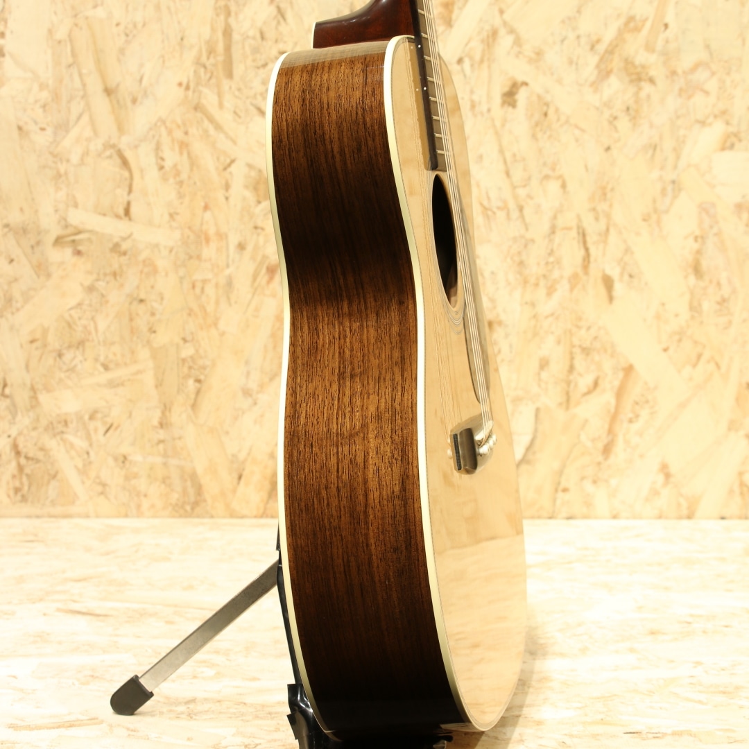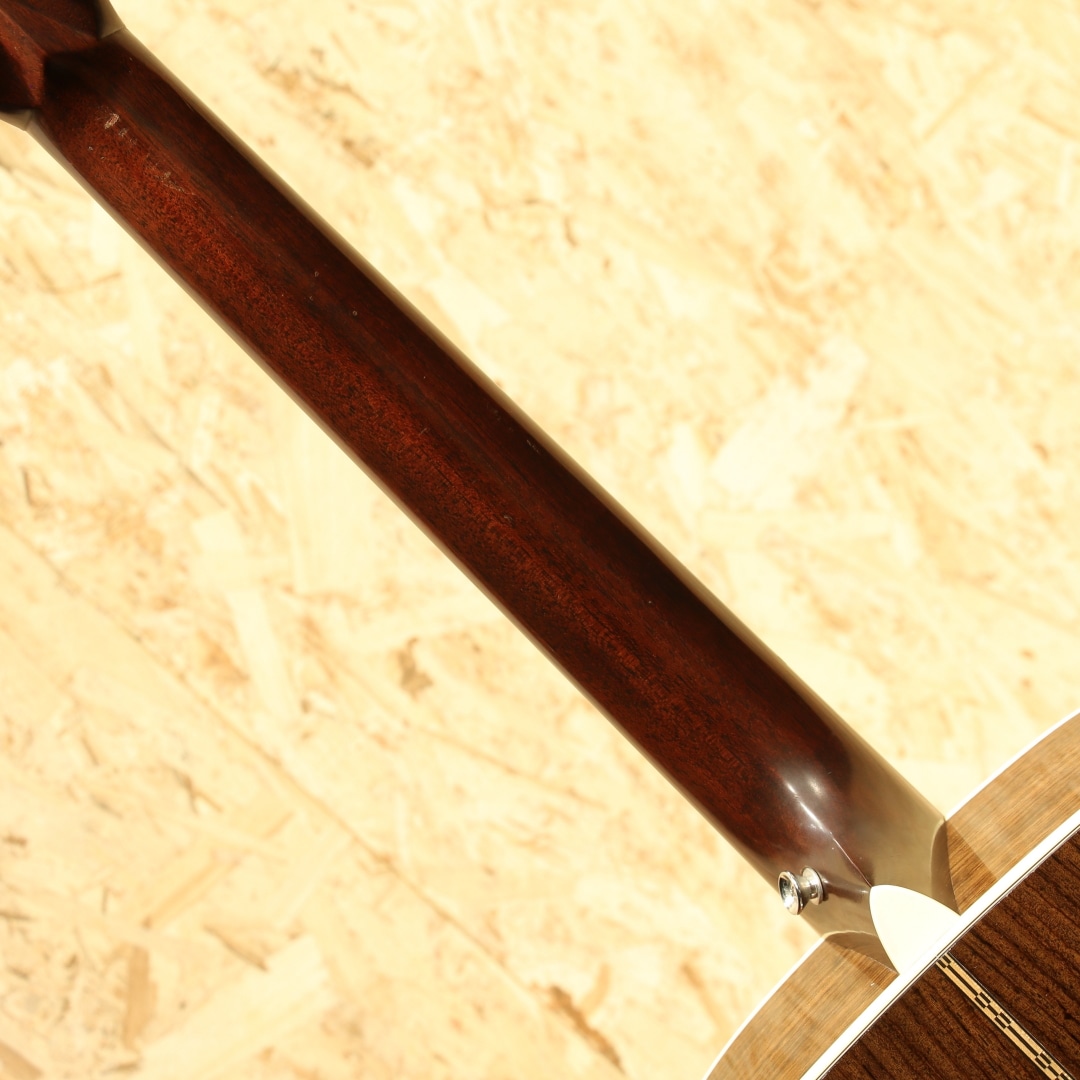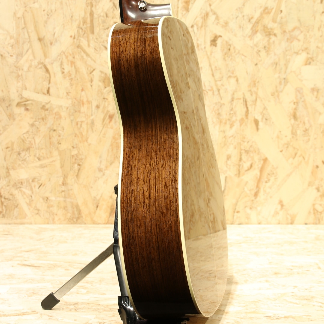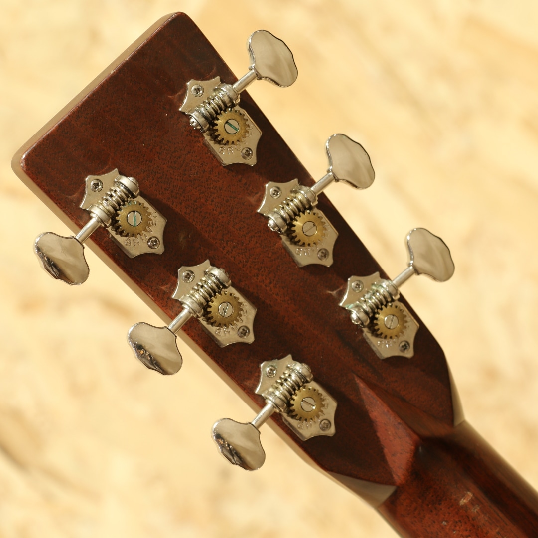 現マーチン工場の中でも、卓越した技術と豊富な経験から至極のギターを造り出す"Martin Custom Shop"。レギュラーラインとは全く異なった環境、工程にて製作。工場の一角に専用の区画があり、昔ながらの工法を継承しながらより精度の高い製作を行っています。ラインナップ上最高峰と言えるオーセンティックシリーズの製作をはじめ、高い完成度を誇るカスタムモデルを製造するトップクラスの部門です。本器はOOO-28をベースとしたカスタム品”CTM OOO-28 Premium Sitka Spruce”。2020年製USED品です。スタイル45に使用されるプレミアムグレードのシトカスプルースをトップに採用、インディアンローズウッドサイド&バック、マホガニーネック、44.5mmナット幅、モディファイドVネックシェイプ、エボニー指板&ブリッジ、ロングサドル、ダイアモンドスクエアアバロン指板ポジション、ゴトー製オープンバックバタービンノブペグ、ベッコウ柄ピックガード、オールドスタイルヘッドロゴ、アバロントリム、アジャスタブルトラスロッド、スキャロップドXブレイシング。ネックヒールサイドにストラップピン装着。2018年に大きな仕様変更が行われたOOO-28。ナット幅44.5mm、薄平形状のモディファイドローオーバルシェイプ、ヘリンボーンを備えたルックス、オープンバックペグなどが大きな点でした。本器もその仕様を踏襲しつつ、トップ材のアップグレードを行いカスタムショップで製作された1本です。プレミアムグレードが故に非常に目の整った、キメの細かい材を使用されています。そのキメの細かさは振動の際の振動の仕方にも影響し、より高音へのレンジ感が広がることの多い印象。その例に漏れず艶やかな音色と繊細なトーンを持ち味としている個体です。シトカらしいカラッとした響きや軸のブレない芯の通ったサウンド。レギュラーよりもキメが細かく解像度の高い響き、そして分離感に優れた出音はカスタムショップ製の造りの良さだからこそと言えます。フィンガー、ストロークと両刀で使える万能選手。スタイルを問わずに扱いやすい優秀な1本です。ボディバック面両くびれ、ボディトップ面1弦側くびれ箇所はバインディング剥がれの修正跡が見られますが近年マーチンでは致し方ないものと言えるでしょう。しっかりと修正され問題なく使える状態となっています。エンドピン箇所はジャックサイズに拡張されておりますが、現在が同径のピンを装着されています。ネック裏1F付近にカポを付けていたのか僅かな塗装剥がれの跡や、10Fの6弦側指板サイドに爪が当たったかのような凹み跡、1弦側指板サイドにもハイポジションに細やかで極僅かな当てキズ、ヘッド表の僅かな当てキズやボディサイドのエンド箇所に僅かな当てキズが数か所見られますが、その他は表面的な擦れキズ程全体を通して比較的使用感の少ないコンディションをキープしている個体。ネック周りの演奏性も良く整えられ、サドル高は非常に残されています。軽いアクションで弾きやすいセッティングとされた演奏性良好な1本です。2025年に仕様変更が入ったOOO-28。それでもこの透明感のある響きやレンジ感は味わえません。艶やかさを感じる大人な1本。ワンランク上のOOOを体感できる個体です。是非ご検討下さい。