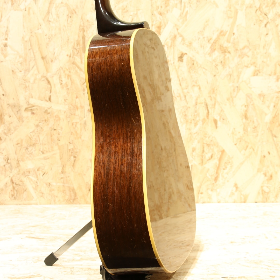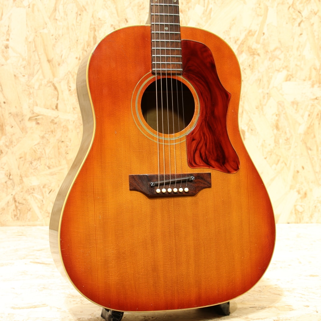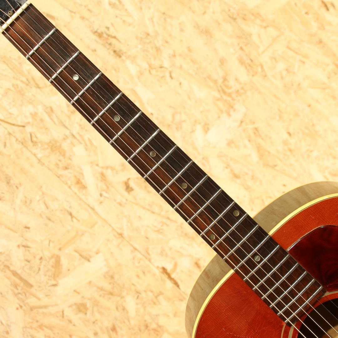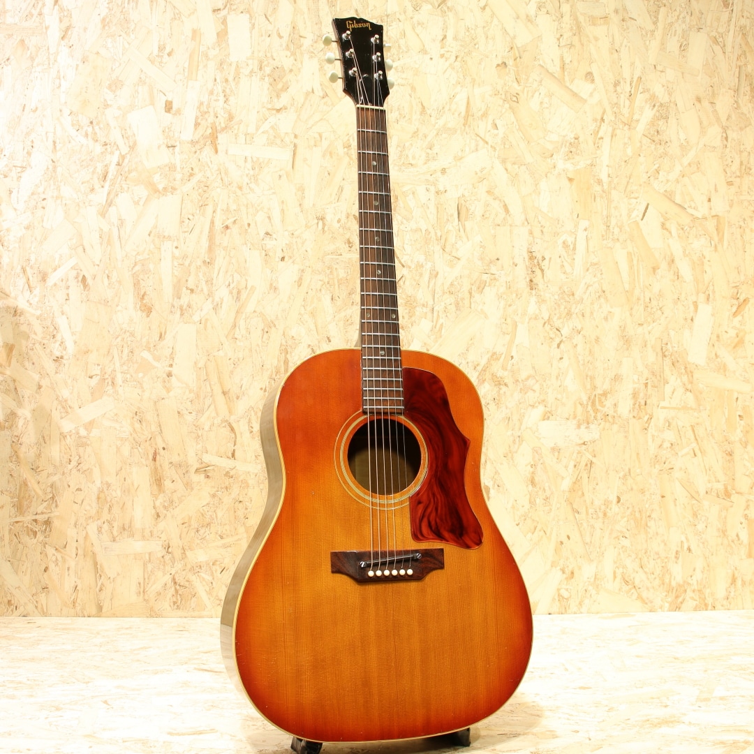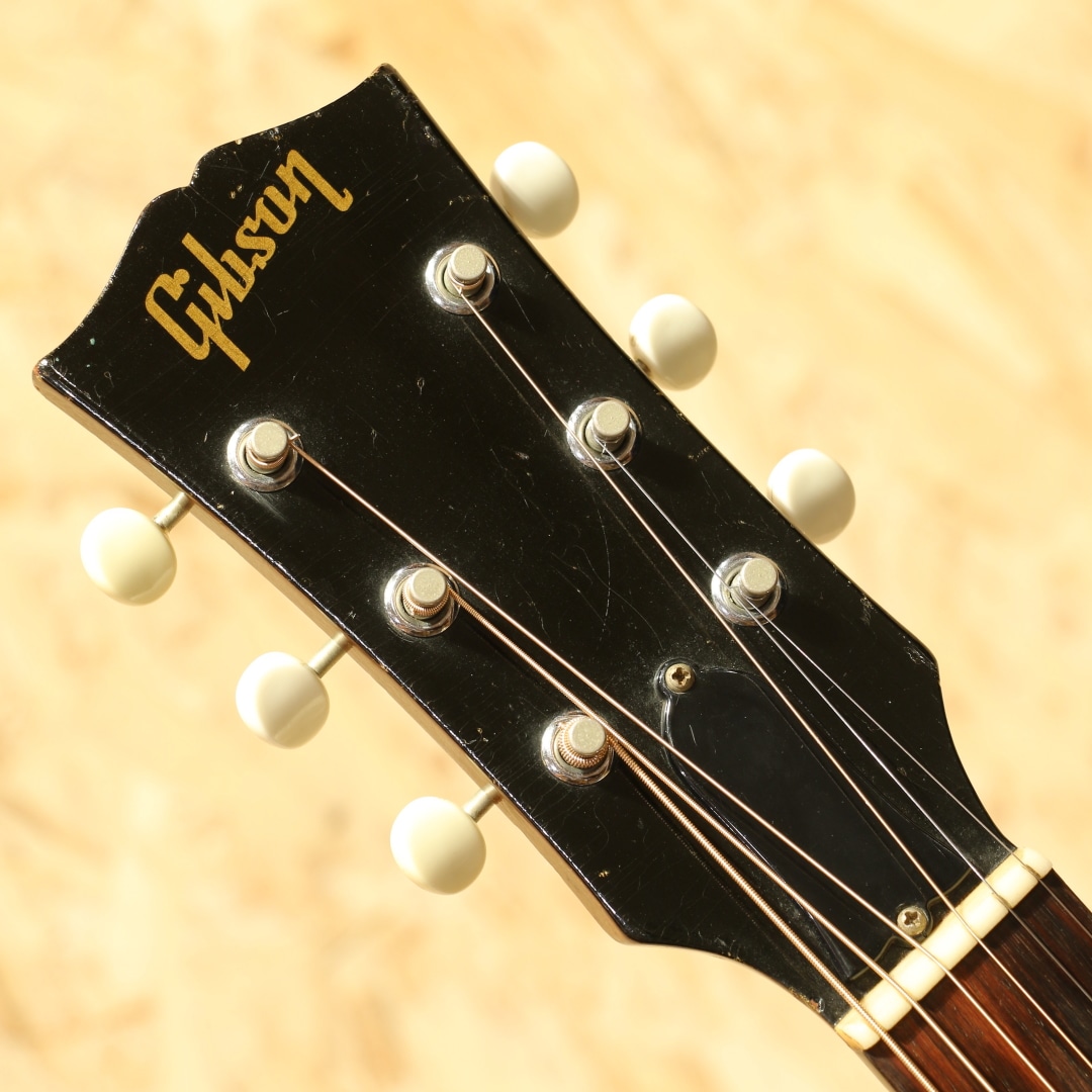 1942年にギブソンが発売を開始した機種J-45、通称ワーキング・ホース。説明不要のギブソンベストセラーモデルです。本器は1969年に製造されたチェリーサンバーストカラーの1本。スプルーストップ、マホガニーサイド&バック、マホガニーネック、ローズウッド指板、オリジナルナット、指板ドットインレイ、オリジナルの厚手のベッコウ柄ラージセルロイドラージピックガード、ダブルリングロゼッタ、ノンスキャロップド・エックスブレイシング、ナット幅約43ミリレギュラーグリップ、約14度のヘッド角。ペグはクルーソン1ラインタイプへリプレイス、ADJサドルはウッド製のモノへ、ブリッジはややオーバーサイズのローズウッド製のモノへリプレイスされています。1965年にナローネックへと変更となり、ヘッド角度も14度へ。1967年頃からダークな色合いのサンバーストカラーが復活、1968年から1969年にかけてはブリッジの向きもダウンベリーとなり、ナット幅も約43mmへと戻ります。本器もその流れを汲んだ1本です。ギブソンらしいカラーリング、お馴染みのルックスを持った60年代後半スペック。ヘッドの角度がやや浅くなったことで、音色も緩くメロウなトーンへ。レンジ感はミドルの方へ寄り、バスっバスっとした空気砲のようなコンプがかった音の飛び方、そしてADJの代名詞とも言えるパーカッシブな響き。サクサクとした軽快な手応え、緩さを感じさせるロー感やサスティンの短さ、唯一無二とも言える個性を持った時期に作られた1本です。とりわけカッティングでの歯切れの良さやコンプがかったサウンド、フィンガーでの素朴で繊細、メロウなトーンを響かせてくれます。歌い手に寄り添ってくれるワークホース、この時代のJ-45を愛用するミュージシャンが多いことも頷けます。後付けにてL.R Baggs i-Beam Activeを搭載。ブリッジプレートに取り付けられた特殊なピエゾにてボディトップの振動を拾い上げるシステム。マイクで収音した音に近づけるために2年間の開発期間を設けて発売されたシステムです。アクティブ仕様の為、出力も稼げるなどメリットの多い仕様です。扱いやすく、アコギらしい空気感を出力できる優秀なシステム。ロッドカバーはやや厚めのタイプへ、ADJビスも近年のモノへ交換されています。ネックヒール裏には過去ストラップピンを取り付けていた跡が見られますが、現在は埋め木とタッチアップが施されております。上記リプレイス箇所こそあるものの板割れなどはなく、60年代後半らしいサウンドを存分に出力してくれる個体。ADJの上げ下げの幅も充分あり、ネックコンディション良しと良好なPlay Vintage。これからも活躍してくれるであろう個体です。風合い良し、実用性の高いヴィンテージ。Late60sのお手本のようなサウンドを体感できる1本。是非ご検討下さい。