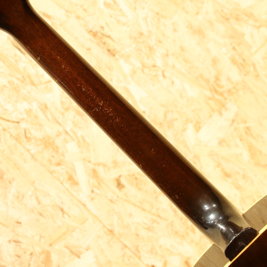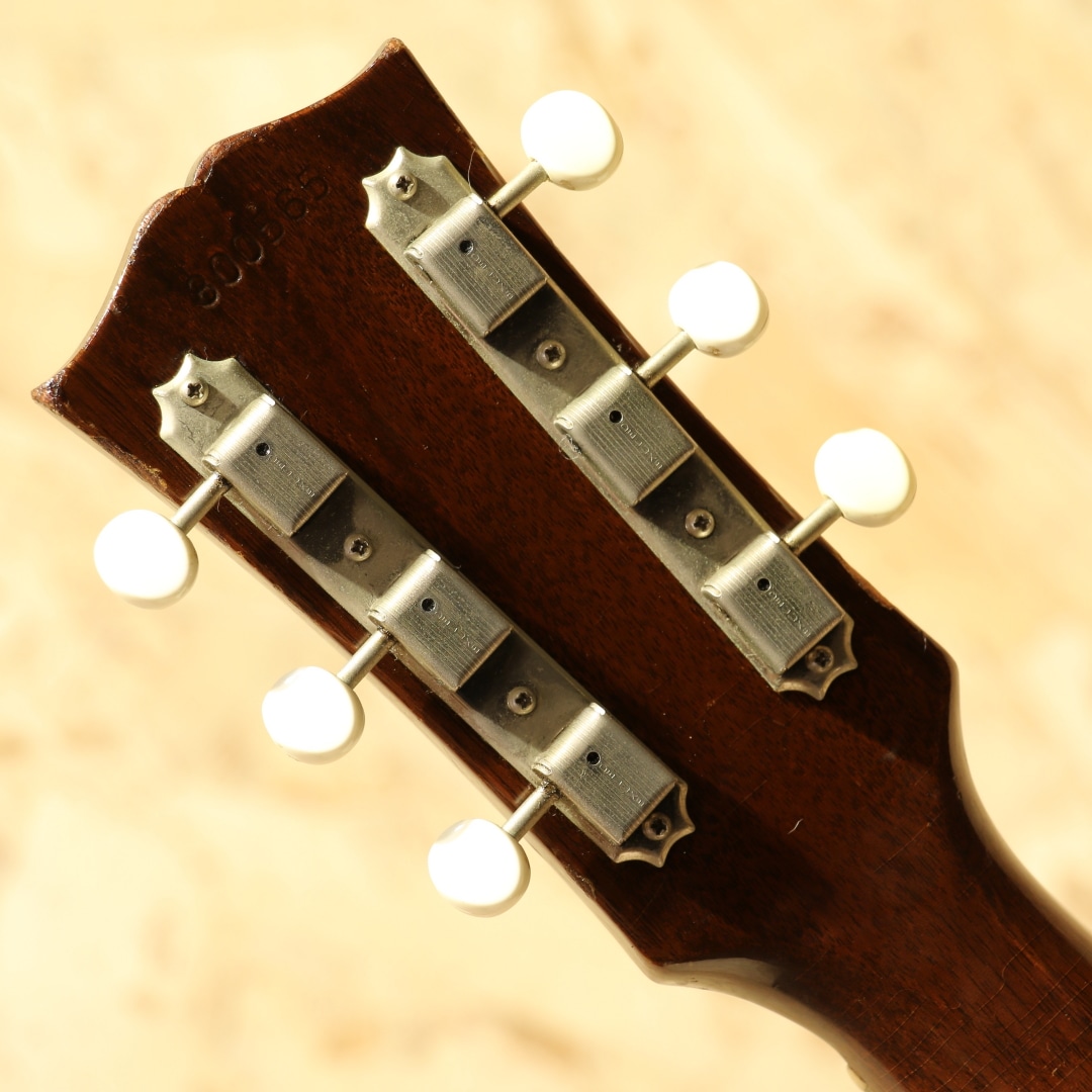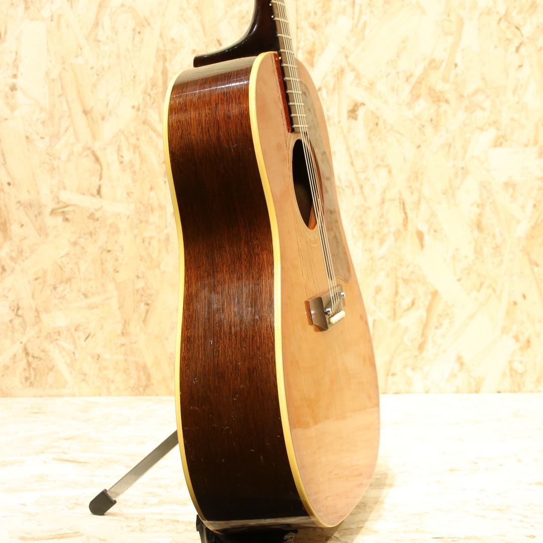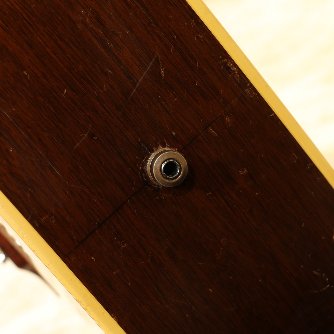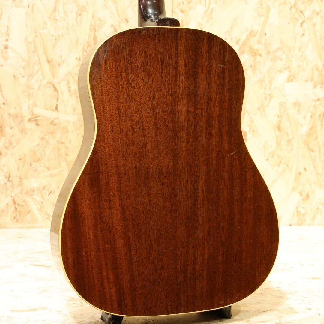 1942年にギブソンが発売を開始した機種J-45、通称ワーキング・ホース。説明不要のギブソンベストセラーモデルです。本器は1969年に製造されたチェリーサンバーストカラーの1本。スプルーストップ、マホガニーサイド&バック、マホガニーネック、ローズウッド指板、オリジナルナット、指板ドットインレイ、オリジナルの厚手のベッコウ柄ラージセルロイドラージピックガード、ダブルリングロゼッタ、ノンスキャロップド・エックスブレイシング、ナット幅約43ミリレギュラーグリップ、約14度のヘッド角。ペグはクルーソン1ラインタイプへリプレイス、ADJサドルはウッド製のモノへ、ブリッジはややオーバーサイズのローズウッド製のモノへリプレイスされています。1965年にナローネックへと変更となり、ヘッド角度も14度へ。1967年頃からダークな色合いのサンバーストカラーが復活、1968年から1969年にかけてはブリッジの向きもダウンベリーとなり、ナット幅も約43mmへと戻ります。本器もその流れを汲んだ1本です。ギブソンらしいカラーリング、お馴染みのルックスを持った60年代後半スペック。ヘッドの角度がやや浅くなったことで、音色も緩くメロウなトーンへ。レンジ感はミドルの方へ寄り、バスっバスっとした空気砲のようなコンプがかった音の飛び方、そしてADJの代名詞とも言えるパーカッシブな響き。サクサクとした軽快な手応え、緩さを感じさせるロー感やサスティンの短さ、唯一無二とも言える個性を持った時期に作られた1本です。とりわけカッティングでの歯切れの良さやコンプがかったサウンド、フィンガーでの素朴で繊細、メロウなトーンを響かせてくれます。歌い手に寄り添ってくれるワークホース、この時代のJ-45を愛用するミュージシャンが多いことも頷けます。後付けにてL.R Baggs i-Beam Activeを搭載。ブリッジプレートに取り付けられた特殊なピエゾにてボディトップの振動を拾い上げるシステム。マイクで収音した音に近づけるために2年間の開発期間を設けて発売されたシステムです。アクティブ仕様の為、出力も稼げるなどメリットの多い仕様です。扱いやすく、アコギらしい空気感を出力できる優秀なシステム。ロッドカバーはやや厚めのタイプへ、ADJビスも近年のモノへ交換されています。ネックヒール裏には過去ストラップピンを取り付けていた跡が見られますが、現在は埋め木とタッチアップが施されております。上記リプレイス箇所こそあるものの板割れなどはなく、60年代後半らしいサウンドを存分に出力してくれる個体。ADJの上げ下げの幅も充分あり、ネックコンディション良しと良好なPlay Vintage。これからも活躍してくれるであろう個体です。風合い良し、実用性の高いヴィンテージ。Late60sのお手本のようなサウンドを体感できる1本。是非ご検討下さい。