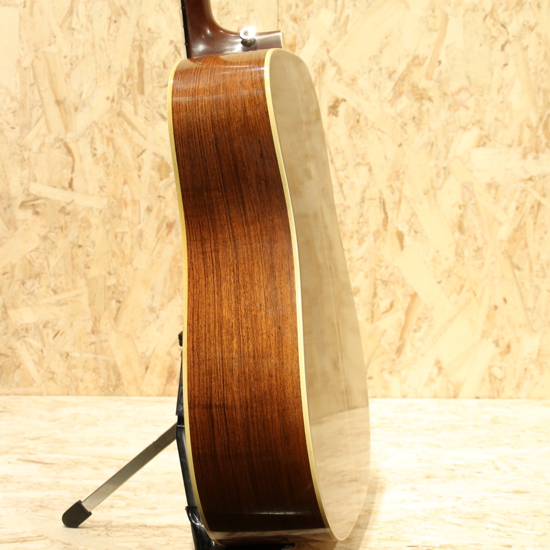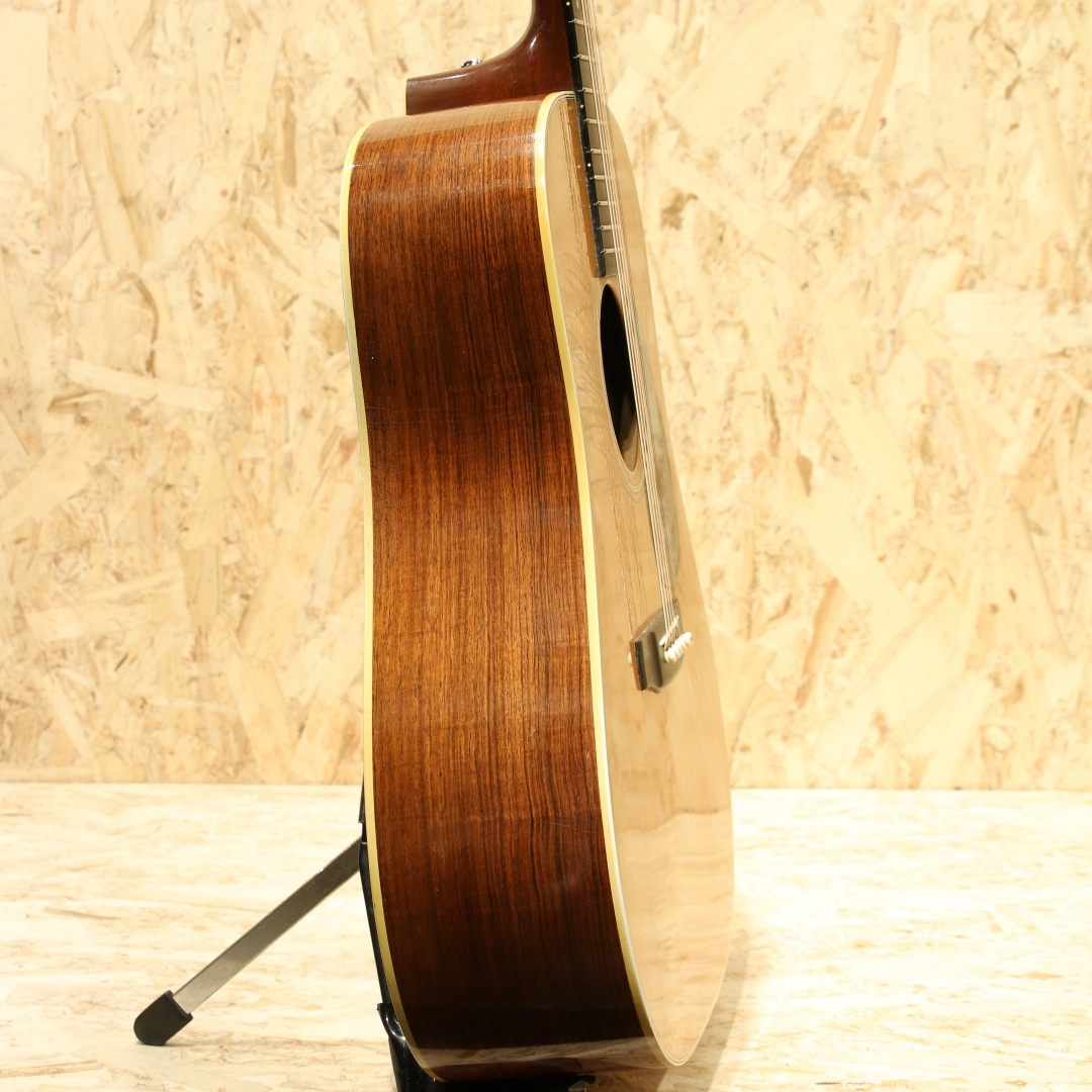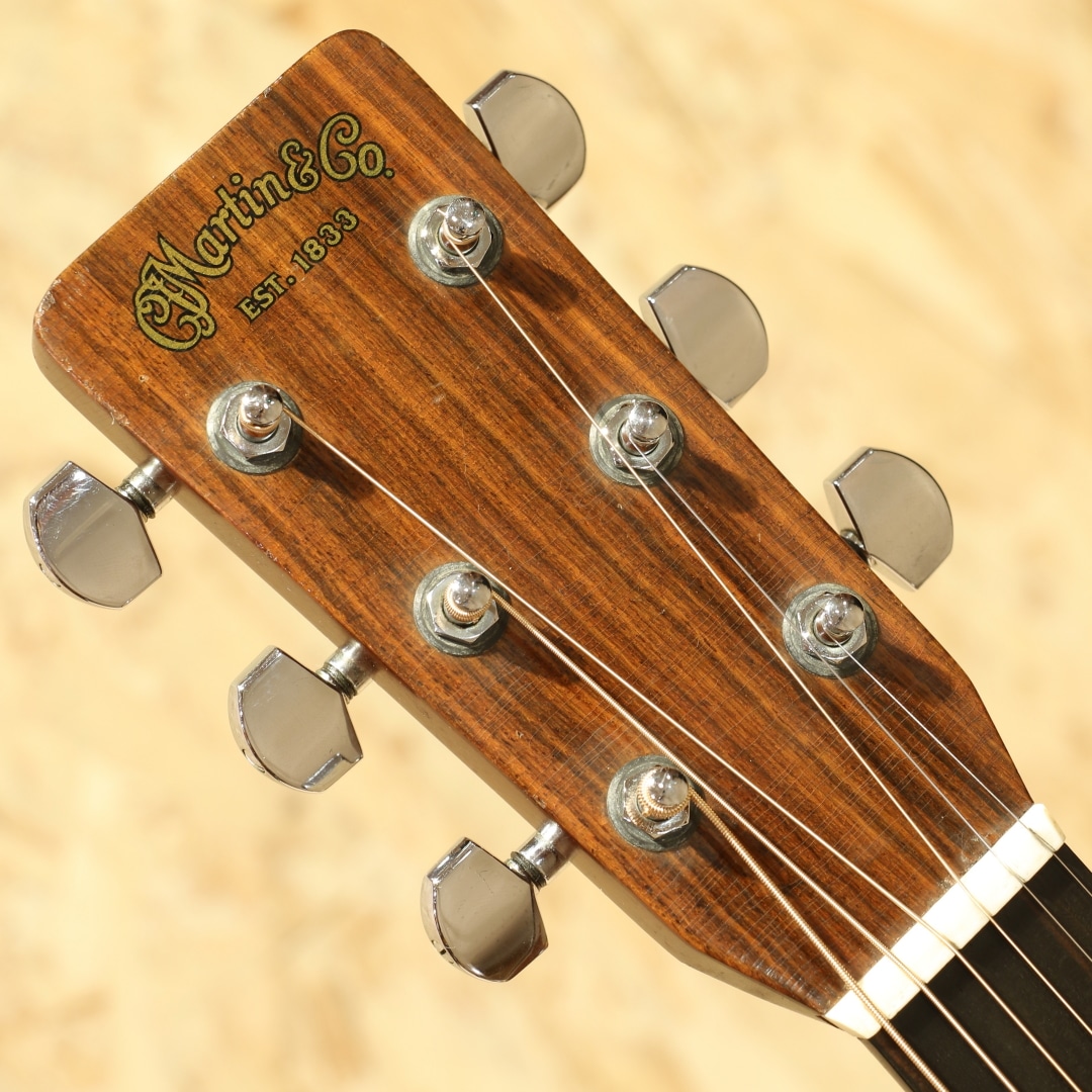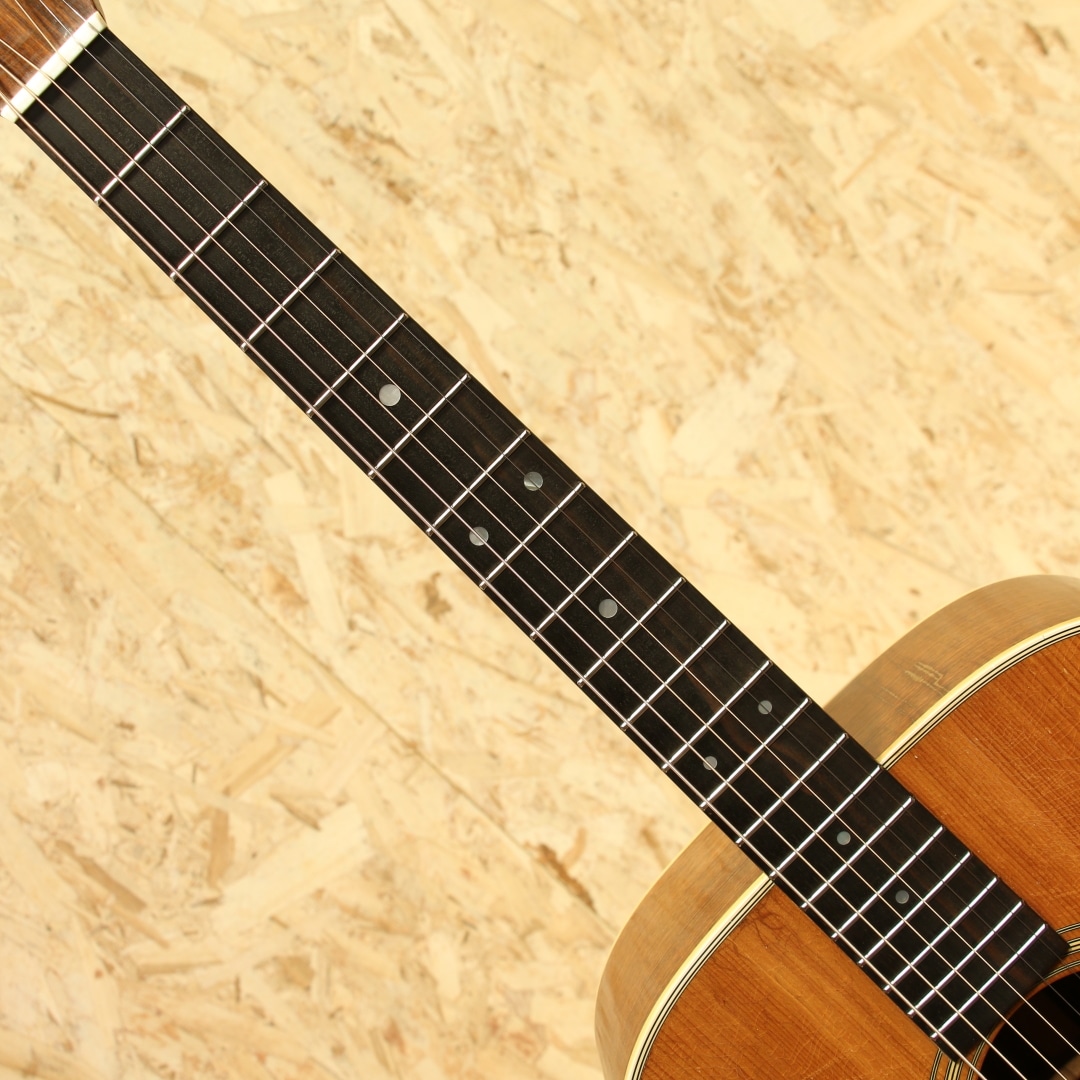 アコースティックギターのワールドスタンダード”D-28”。1960年代のアメリカフォークブームを受け70年代は生産数も多く、日本のフォークブーム時には憧れの的にもなりました。その呼び名に恥じない世界基準であり続けたモデルです。本器は70年代のテイストを色濃く残す1981年製の1本。スプルーストップ、ローズウッドサイドバック、マホガニーネック、スクエアロッド、エボニー指板&ブリッジ、オリジナルミカルタナット&サドル、パールドット指板インレイ、シャーラーロトマチックペグ、ノンスキャロップドXブレイシング。ピックガードはブラックカラーのモノへと交換されています。D-28は当時の流行りであったフォークソングに使用されることも多かった為、多くの音源でそのサウンドを聴くことが出来ます。その時期の音楽を聴いていた方はこのサウンドに覚えがある方も多いでしょう。スクエアロッド期特有の太さや甘さのあるサウンド。比重がありコシのある低音、やや甘く伸びやかな高音域。音色のバランスも良く、非常に扱いやすい出音です。ノンスキャロップドXブレイシングの為、強いピッキングにも耐えうる許容の広さや芯のあるサウンドを獲得しています。この太甘な音色や透明感のある煌びやかな音色はこの時期ならではの魅力。現代のネックと比べナット幅が狭い42.9mm仕様、程よく握りやすいネック、その性質上スタイルを問わずにオールマイティに使用できる1本です。エンドピン箇所はジャックサイズに拡張されており、現在では同径のピンが装着されています。サウンドホール周りの弾きキズ、細やかな当てキズ、ボディサイド1弦側くびれ箇所の塗装反応跡など経年感を感じさせますが、40年ほどの年月を経たことを考えるとキレイな状態と言えるでしょう。ネック周りの状態も良く、サドルの残りは少ないながらも弾きにくさは感じさせない状態。まだまだガシガシ使っていける1本です。現行品とはまた違ったテイスト、当時のものでしか味わえないサウンド。当時は舶来品で手が届かなかった方も多かったはずです。是非この機会にお手元にいかがでしょうか。