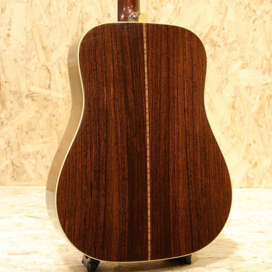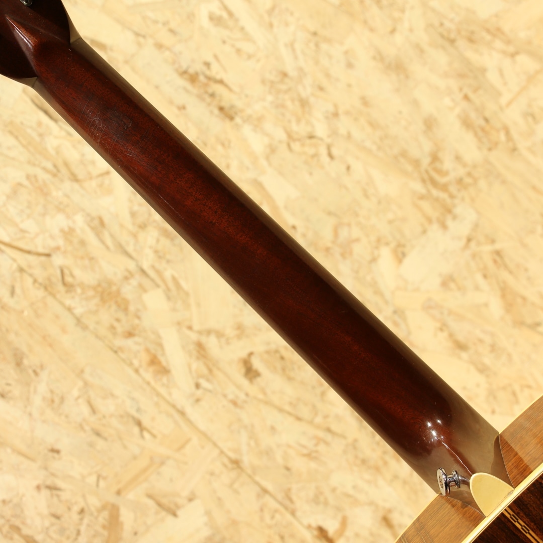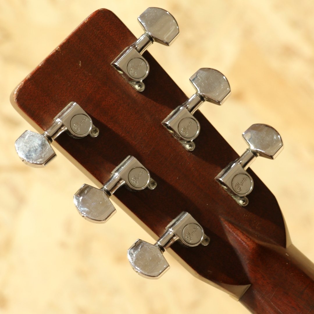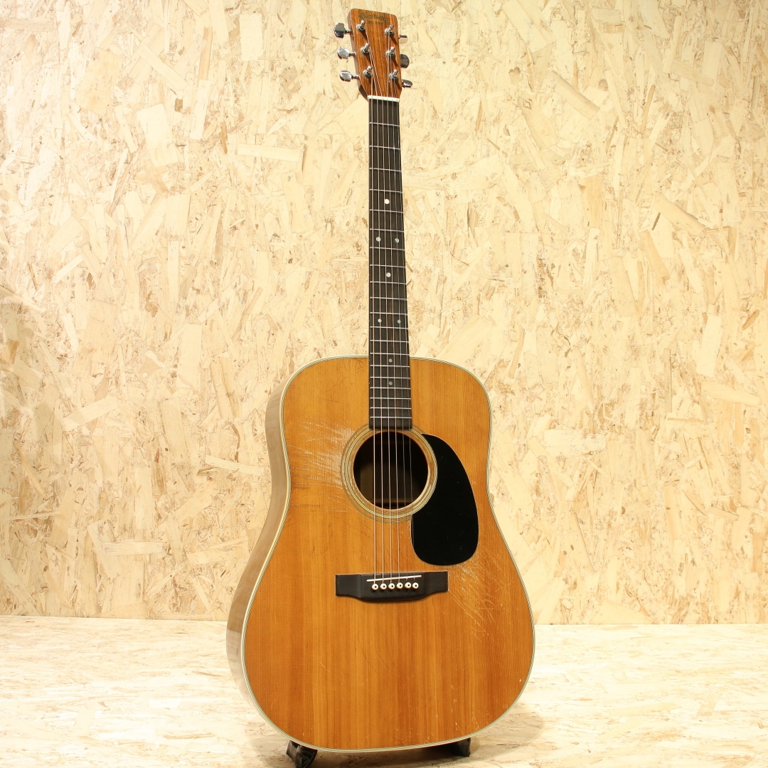 アコースティックギターのワールドスタンダード”D-28”。1960年代のアメリカフォークブームを受け70年代は生産数も多く、日本のフォークブーム時には憧れの的にもなりました。その呼び名に恥じない世界基準であり続けたモデルです。本器は70年代のテイストを色濃く残す1981年製の1本。スプルーストップ、ローズウッドサイドバック、マホガニーネック、スクエアロッド、エボニー指板&ブリッジ、オリジナルミカルタナット&サドル、パールドット指板インレイ、シャーラーロトマチックペグ、ノンスキャロップドXブレイシング。ピックガードはブラックカラーのモノへと交換されています。D-28は当時の流行りであったフォークソングに使用されることも多かった為、多くの音源でそのサウンドを聴くことが出来ます。その時期の音楽を聴いていた方はこのサウンドに覚えがある方も多いでしょう。スクエアロッド期特有の太さや甘さのあるサウンド。比重がありコシのある低音、やや甘く伸びやかな高音域。音色のバランスも良く、非常に扱いやすい出音です。ノンスキャロップドXブレイシングの為、強いピッキングにも耐えうる許容の広さや芯のあるサウンドを獲得しています。この太甘な音色や透明感のある煌びやかな音色はこの時期ならではの魅力。現代のネックと比べナット幅が狭い42.9mm仕様、程よく握りやすいネック、その性質上スタイルを問わずにオールマイティに使用できる1本です。エンドピン箇所はジャックサイズに拡張されており、現在では同径のピンが装着されています。サウンドホール周りの弾きキズ、細やかな当てキズ、ボディサイド1弦側くびれ箇所の塗装反応跡など経年感を感じさせますが、40年ほどの年月を経たことを考えるとキレイな状態と言えるでしょう。ネック周りの状態も良く、サドルの残りは少ないながらも弾きにくさは感じさせない状態。まだまだガシガシ使っていける1本です。現行品とはまた違ったテイスト、当時のものでしか味わえないサウンド。当時は舶来品で手が届かなかった方も多かったはずです。是非この機会にお手元にいかがでしょうか。