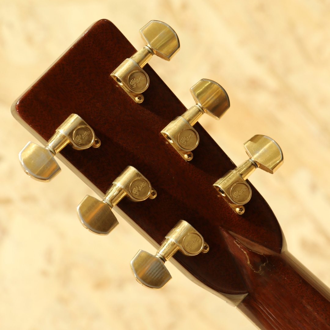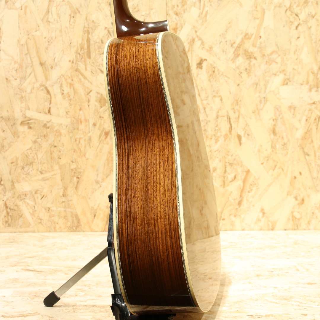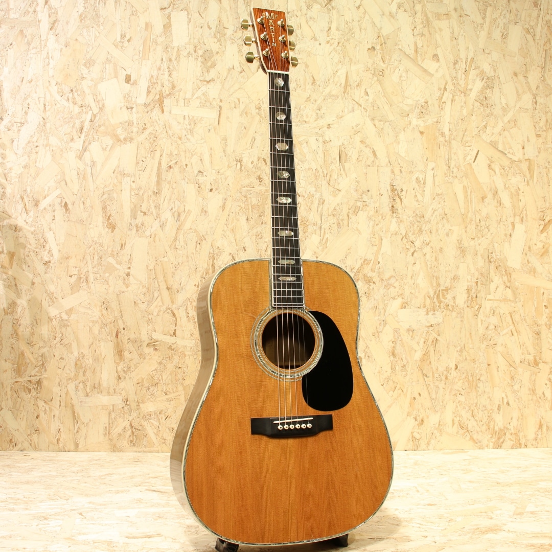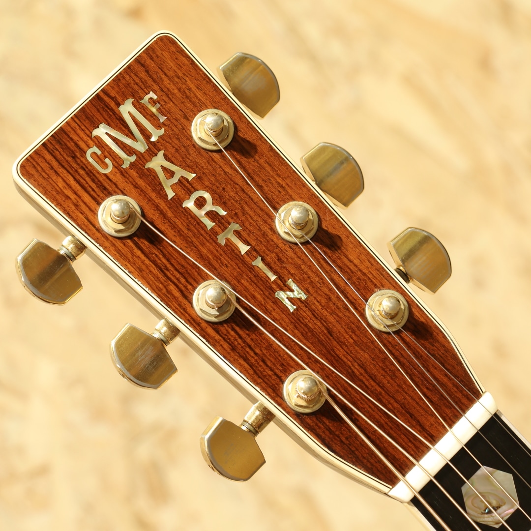 マーチン"D-45"はカントリーシンガー"Gene Autry(ジーン・オートリー)"からのからの特別オーダーから生まれたマーチンギターの最高級機種。1933年から1942年の間に91本が製造された後、1度その幕を閉じます。その後、マーチンギターの広報・研究家として活躍したマイク・ロングワースによって1968年に再生産が実現されました。マーチンスタイル45はこの型番に見合う材料を供給できない場合には生産されません。常にこの上ないクオリティを誇る最高のシリーズとなります。本器は1994年製の1本。最高級シトカスプルーストップ、最高級イーストインディアンローズウッドサイド&バック、マホガニーネック、SQネックロッド、エボニー指板&ブリッジ、ゴールドシャーラーロトマチックペグ、バーチカルヘッドロゴ、アバロンヘキサゴン指板インレイ、ソリッドアバロンロゼッタ&トリム、ノンスキャロップドXブレイシング。ピックガードは70s風の塗装を乗せたジャストサイズのブラックカラーへ変更されています。華やかな外観ときらびやかなサウンド、いつの時代も変わらない憧れの最高級機種。濃密で奥深い倍音、きらびやかで芯のあるトーン。"45"を冠するギターのみに許されたサウンドです。SQロッドでより太い芯、ノンスキャロップでより芯のある艶やかさを含んだ音色は80s譲り。ルックスは70sの要素も与えられ、ハイブリッドな45となっています。ボディトップ面下部には過去打痕が入ったのかタッチアップが施された箇所がみられ、ボディバックの6弦側くびれ付近にもタッチアップ跡が見られます。ボリュート箇所の塗装が剥がれていますが、使用上は問題はありません。指板エンドのバインディングは過去作り直されているのか、若干白みがあるものになっています。上記点を除けばサウンドホール周りやピックガード周りの弾きキズ、細々とした当てキズやペグのメッキ剥がれ見られますが30年近くの年月を考えればキレイな状態をキープされています。SQロッドの為チューニング時は僅か順反りとなりますが、サドル残りもあり、現状弦高も適正で扱いやすい1本。フレット残りが若干少なめですが、弾きにくさは感じさせない個体です。この仕様でしか出せないサウンドがあります。憧れの45、ながめて愛でて良し、長年の気持ちを込めてガシガシ弾いても良しの1本。