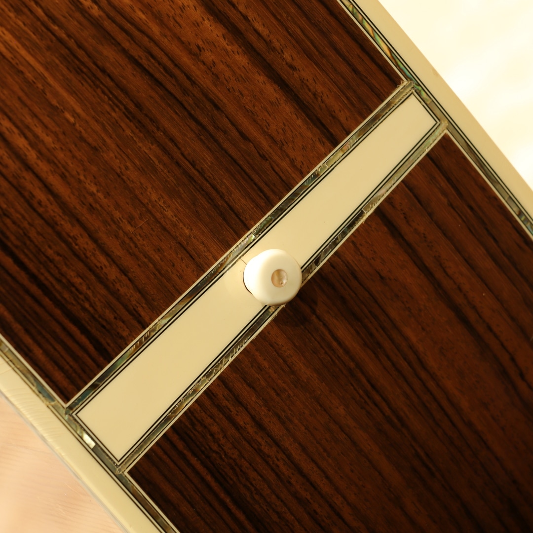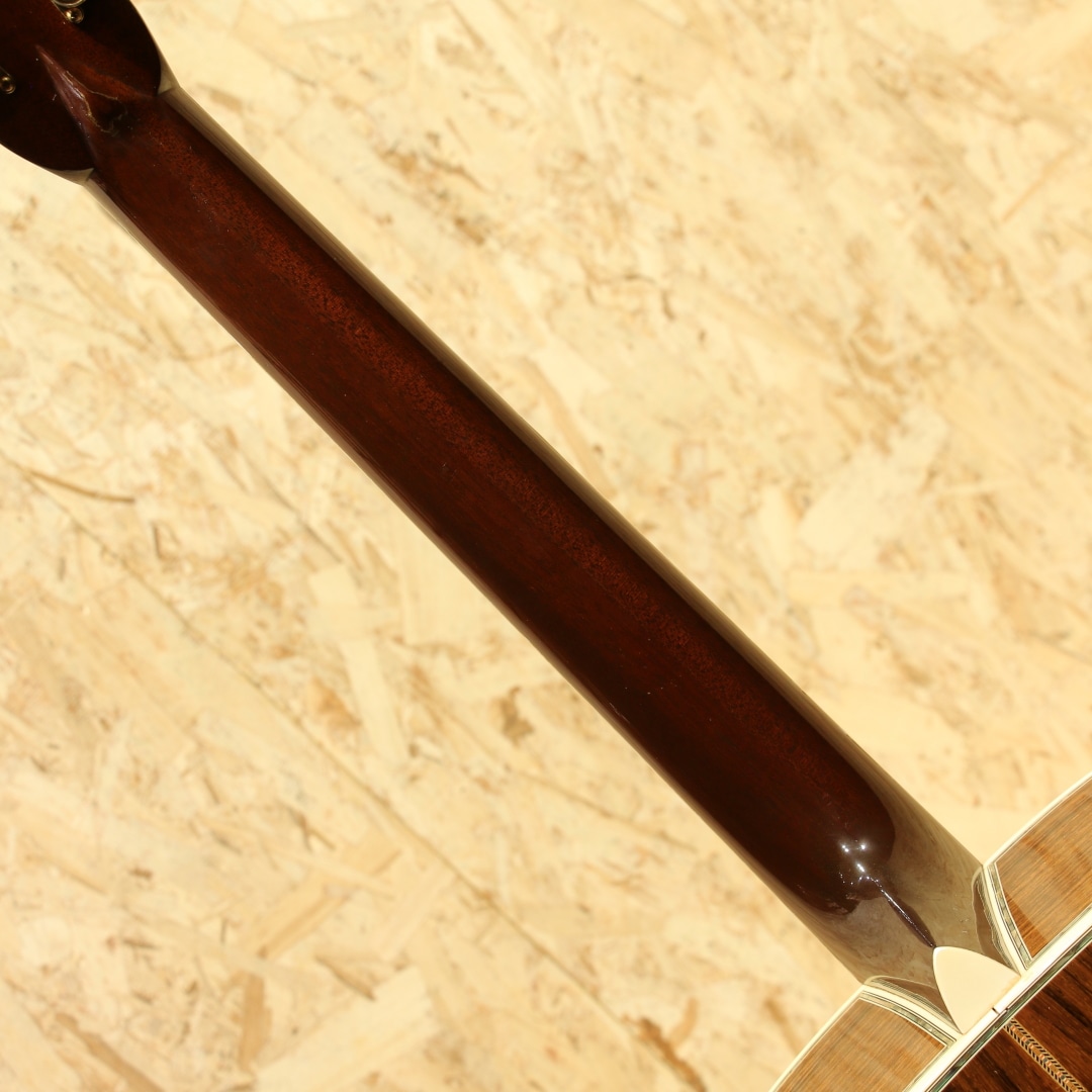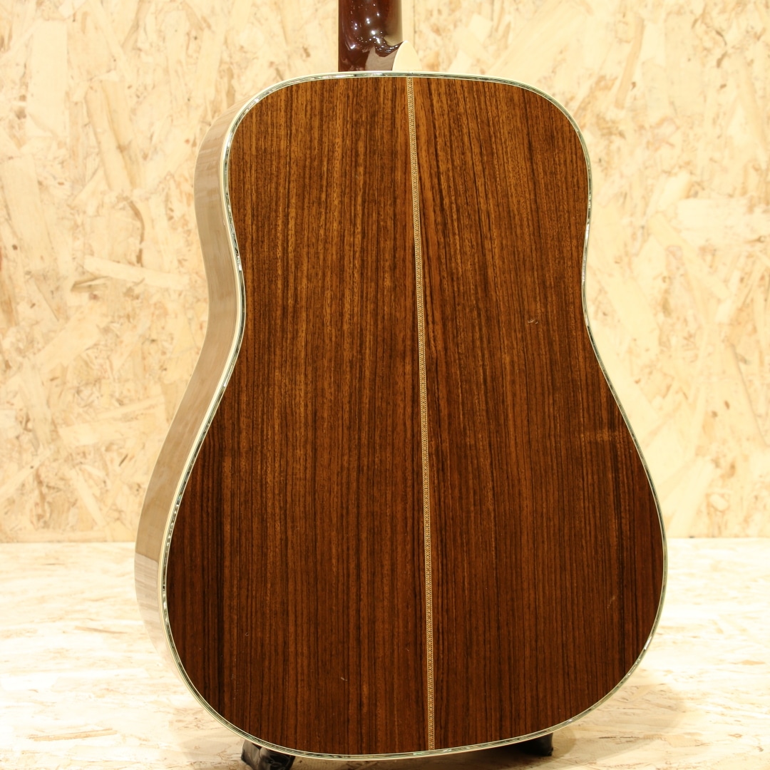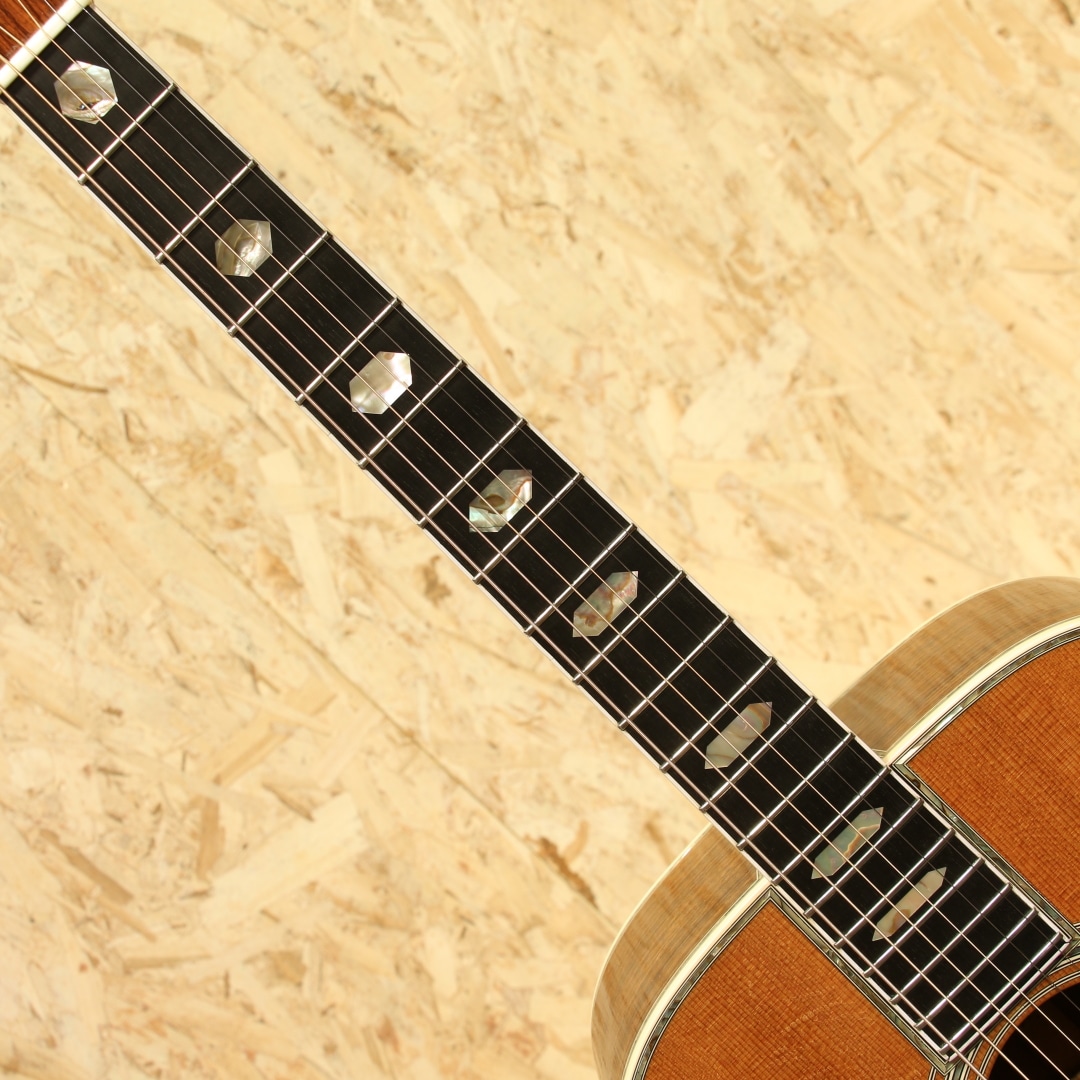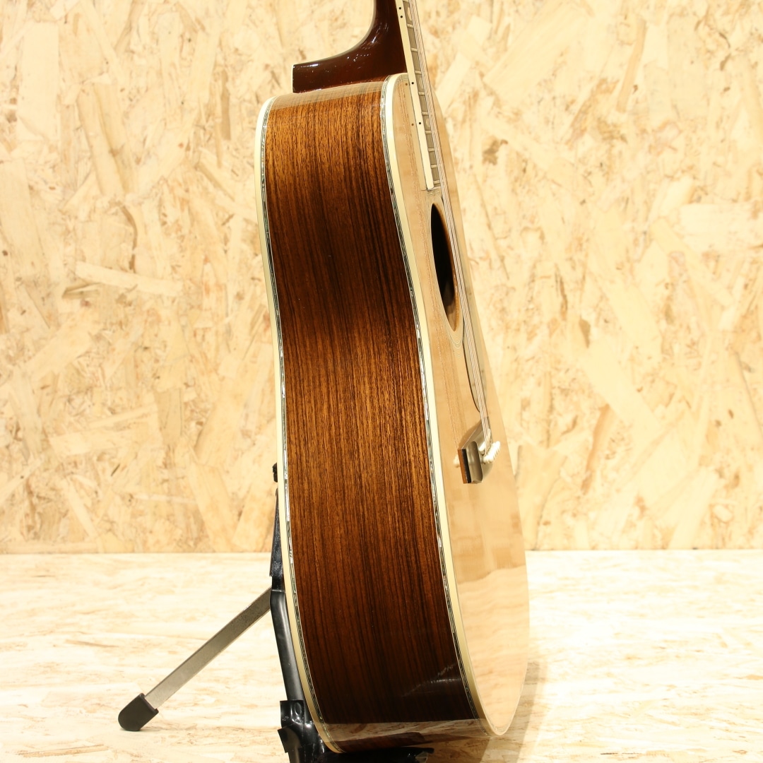 マーチン"D-45"はカントリーシンガー"Gene Autry(ジーン・オートリー)"からのからの特別オーダーから生まれたマーチンギターの最高級機種。1933年から1942年の間に91本が製造された後、1度その幕を閉じます。その後、マーチンギターの広報・研究家として活躍したマイク・ロングワースによって1968年に再生産が実現されました。マーチンスタイル45はこの型番に見合う材料を供給できない場合には生産されません。常にこの上ないクオリティを誇る最高のシリーズとなります。本器は1994年製の1本。最高級シトカスプルーストップ、最高級イーストインディアンローズウッドサイド&バック、マホガニーネック、SQネックロッド、エボニー指板&ブリッジ、ゴールドシャーラーロトマチックペグ、バーチカルヘッドロゴ、アバロンヘキサゴン指板インレイ、ソリッドアバロンロゼッタ&トリム、ノンスキャロップドXブレイシング。ピックガードは70s風の塗装を乗せたジャストサイズのブラックカラーへ変更されています。華やかな外観ときらびやかなサウンド、いつの時代も変わらない憧れの最高級機種。濃密で奥深い倍音、きらびやかで芯のあるトーン。"45"を冠するギターのみに許されたサウンドです。SQロッドでより太い芯、ノンスキャロップでより芯のある艶やかさを含んだ音色は80s譲り。ルックスは70sの要素も与えられ、ハイブリッドな45となっています。ボディトップ面下部には過去打痕が入ったのかタッチアップが施された箇所がみられ、ボディバックの6弦側くびれ付近にもタッチアップ跡が見られます。ボリュート箇所の塗装が剥がれていますが、使用上は問題はありません。指板エンドのバインディングは過去作り直されているのか、若干白みがあるものになっています。上記点を除けばサウンドホール周りやピックガード周りの弾きキズ、細々とした当てキズやペグのメッキ剥がれ見られますが30年近くの年月を考えればキレイな状態をキープされています。SQロッドの為チューニング時は僅か順反りとなりますが、サドル残りもあり、現状弦高も適正で扱いやすい1本。フレット残りが若干少なめですが、弾きにくさは感じさせない個体です。この仕様でしか出せないサウンドがあります。憧れの45、ながめて愛でて良し、長年の気持ちを込めてガシガシ弾いても良しの1本。