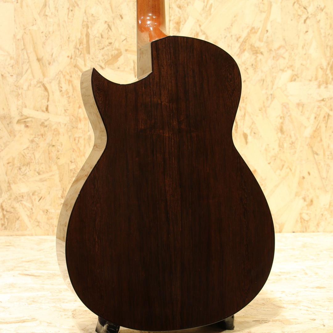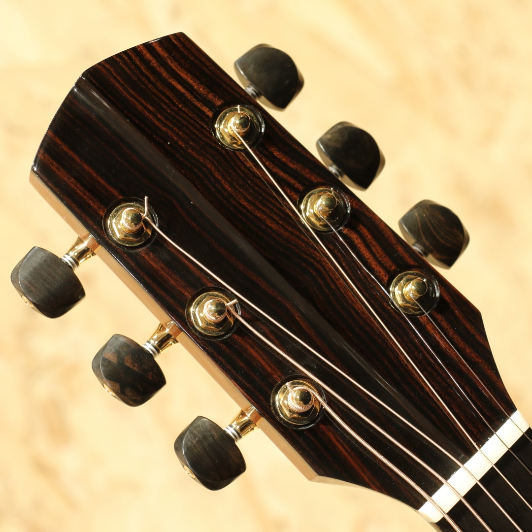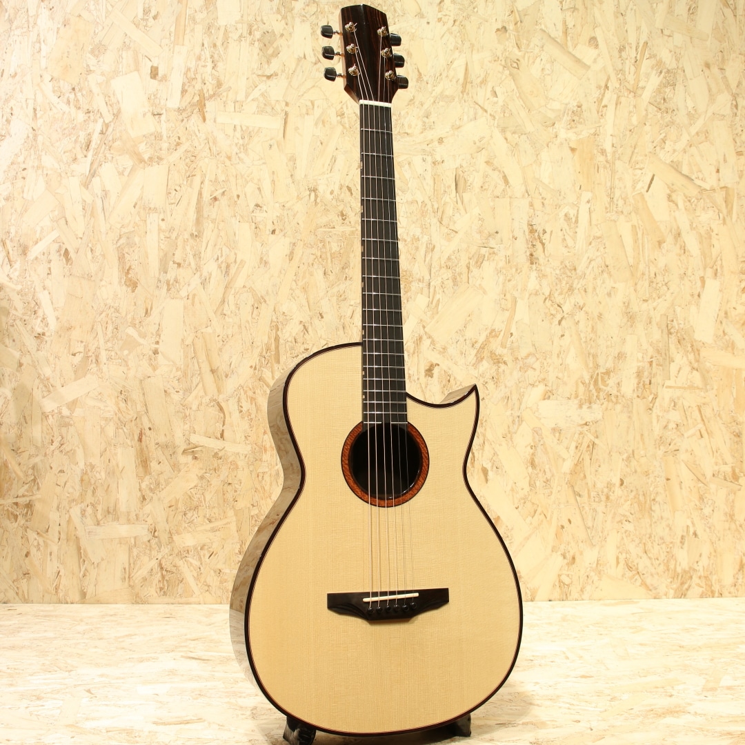 平光ギターは愛知県にてギター製作をするルシアー平光泰典氏によるブランド。一柳一雄氏のもとクラシックギター製作のノウハウを学び、音質・演奏性にこだわりをもって製作される国内屈指の人気ルシアーです。過去の作品一つ一つからデーターを蓄積しブラッシュアップを重ねた平光氏最新のデザインと独自に開発した近年完成したと言われる平光ブレイシングパターンを採用してしています。日々進化をとげ益々の完成度を持ち合わせます。本器は"Type OO 12F Cutaway German Spruce Madagascar Rosewood”。抱えやすく可愛らしい小ぶりなサイズ、フローレンタインカッタウェイを持つ1本です。黄色目のジャーマンスプルーストップ、マダガスカルローズウッドサイド&バック、ホンジュラスマホガニーネック、エボニー指板、ハカランダブリッジ、ゴトー510ゴールドカラー(エボニーノブ)、立体形状に削られたローズウッド天神板、スポルテッドメイプル指板ポジション、ダークローズウッドバインディング、フローレンタインカッタウェイ、カリンで装飾されたロゼッタ、平光ブレイシングと命名されたオリジナルXブレイシングは計算されつくされた独自の曲線と組み合わせによりトップに流れる振動を想定しながら、長年制作で徐々にブラッシュアップを進めていった独自構造。残すべくポイントと落とすべきポイントを抑えた驚くべき形状のブレイシングです。ファットでふくよかな空気感と同時に放たれる締まりの効いたキンとした音像で分離感の良い出音が持ち味の平光ギター。クリアで滑舌の良いトーンでかつフラットトップながらジャズギタリストも唸らせる単音の伸びでロウフレットからハイフレットまでデッドな箇所が少なく均一で変わらぬしっかりとした密度を持ち、OOサイズならではの小回りの利いたレスポンス良さと抜け感も相まってとても上質で使い勝手の良いサウンドになっています。12Fジョイント機種定番のスロテッドヘッドではなく、ソリッドヘッドで扱いやすく、ヒールレスのカッタウェイがハイポジションまでのアクションをスムーズにしています。12フレット仕様にしながらジョイント箇所を弾きやすくしている構造は一見矛盾したようにも見られるかも知れませんが、音色を得るためのもの。12Fジョイントと14Fジョイントの根本的構造が故、12Fジョイントで得られる音像の太さは14Fジョイントでは得られません。音痩せやコシの細さが見られない、太く伸びやかで芯のある音色は平光氏の真骨頂。フィンガーでもピッキングでも、弾き方を選ばずにあらゆるプレイの表現を可能にする平光ギター。多くのトッププロからも信頼を寄せられており、一線で活躍するミュージシャンよりフィードバックされるノウハウがその造りにダイレクトに反映されています。当店ではカスタムオーダーも承りますのでお気軽にご相談ください。オリジナルNAZCA製ギグケース付属。