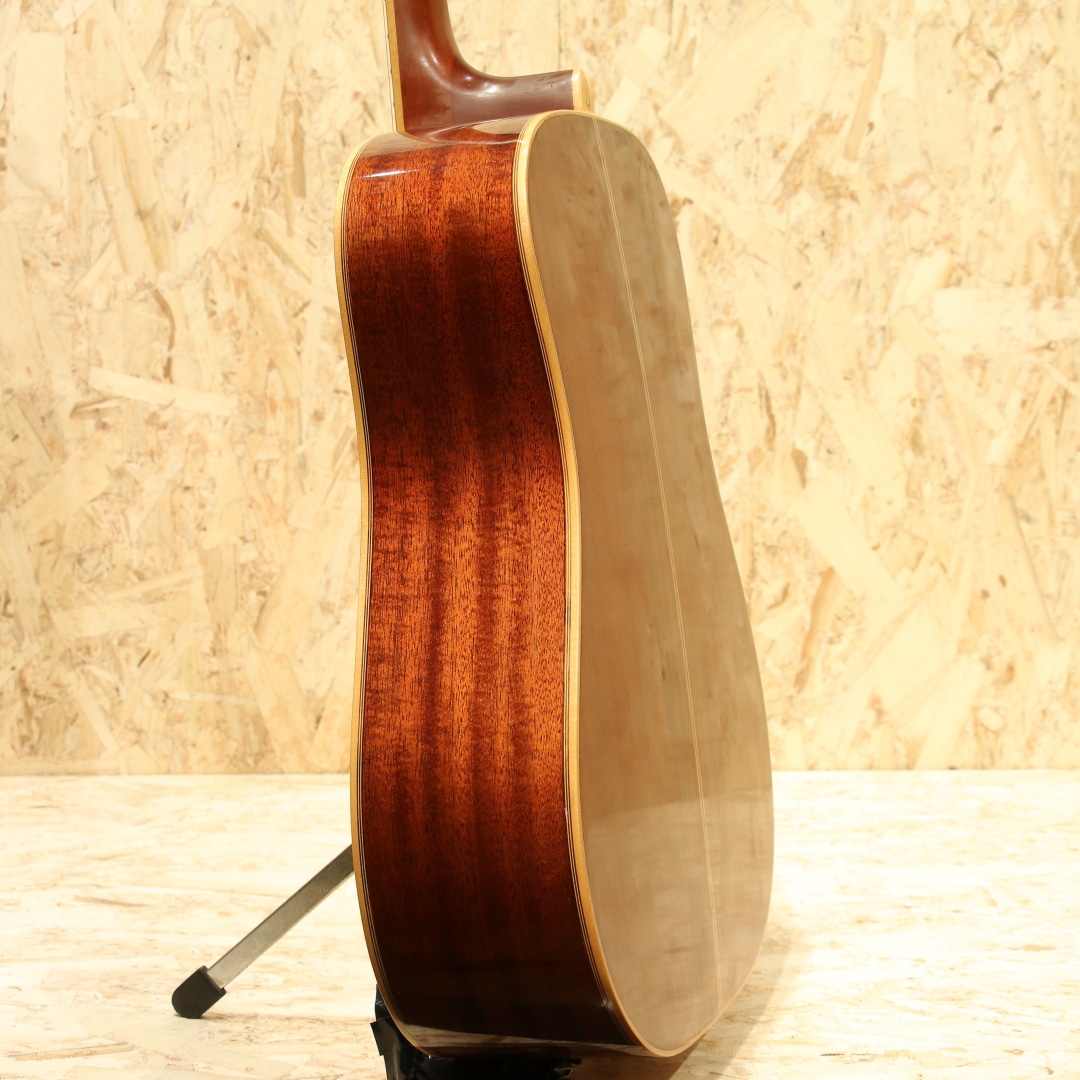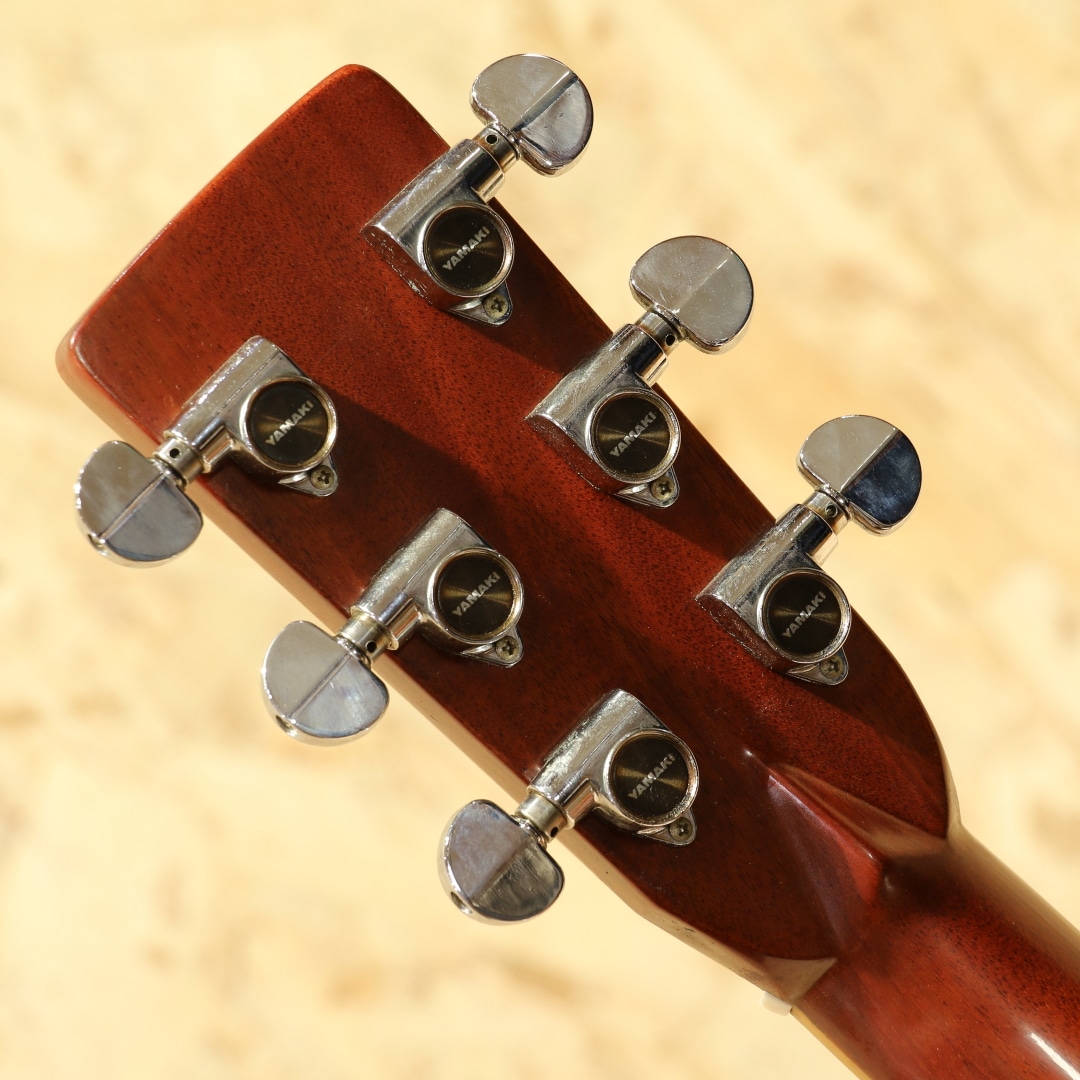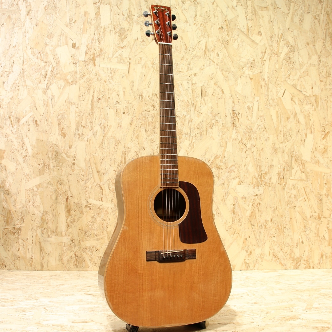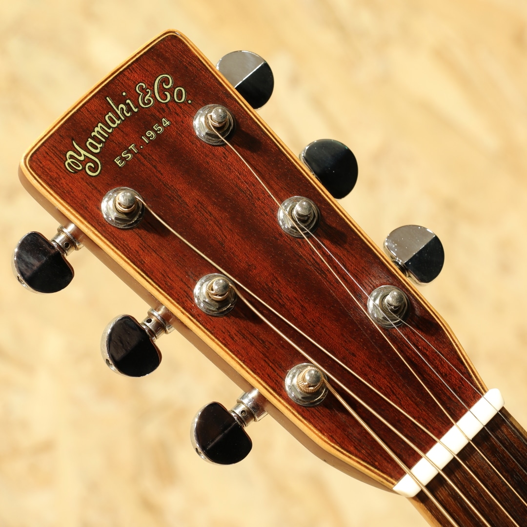 独自の設計や美学から未だに根強いファンも多いブランド”YAMAKI”。フォークブームの時代を駆け抜け、惜しくも現在では無くなってしまったブランドの一つです。本器はオール単板モデル”Y-60D”。1970年代製と思われるUSED品。エゾ松単板トップ、マホガニー単板サイド&バック、ローズウッド指板&ブリッジ、ロトマチックタイプペグ、ウッドピックガード、ナチュラルカラー。ヤマキの中でも上位に位置するウッドクラフトシリーズ。80年前後のごく一部の時期のみ製作されたシリーズとなります。その名の通り木材の質感を活かした仕様にて製作されており、ピックガードやバインディング等が木製となっています。そして総単板仕様で製作された本格派仕様。ヒールキャップにさりげなく入れられたバッファローのインレイがクールな印象です。ヤマキを含めこの時期のギターに通じる芯の強く基音がハッキリとした音色。レンジ感としてはミドルに寄っていますが、その分押し出し感のある響きやウォームなトーンを味わうことが出来ます。硬い訳ではなく太く甘い部分も感じられる音色。ゴージャスさよりは質実剛健な印象を受けますが、現代にも通用するポテンシャルを持っている1本です。ボディトップとバック全体に過去やすり掛けをしたのか細かなキズが付き塗装表面上の艶が消えております。ボディバックにはボンドや接着剤を塗ったのか刷毛跡のようなラインが見られます。どちらも外観上目立つ箇所ですが、使用上問題のある状態ではありません。この時期の国産ギターにしばしば見られる白濁の点在やその他にも細やかな当てキズ等経年感は見られますが、使用していく上で問題の無い状態をキープ。演奏性も問題無し、しっかりと整えられておりまだま活躍してくれるであろう1本です。当時革新的なアプローチを試みやコピーだけでない国産の強みを出していたブランド。無くなってしまった今なお根強いファンのいるフォークブームを駆け抜けたメーカーの内の1つです。古き良きフォークソングがお好きな方や当時を経験されている方は思い出しながら弾くも良し、木材で統一された家具のようなルックスを楽しむも良し。是非お手元にいかがでしょうか。