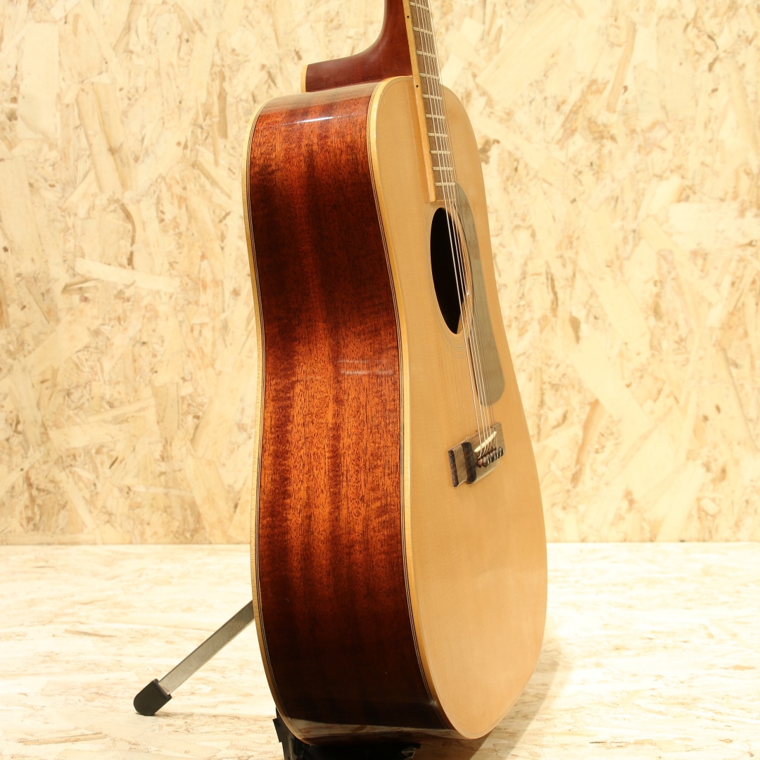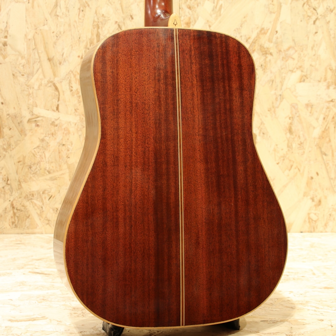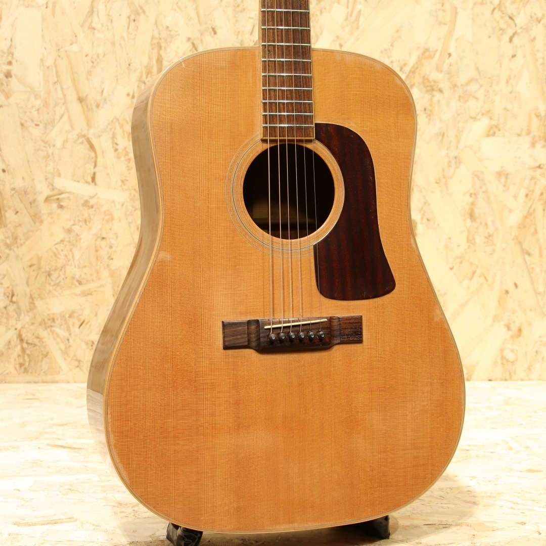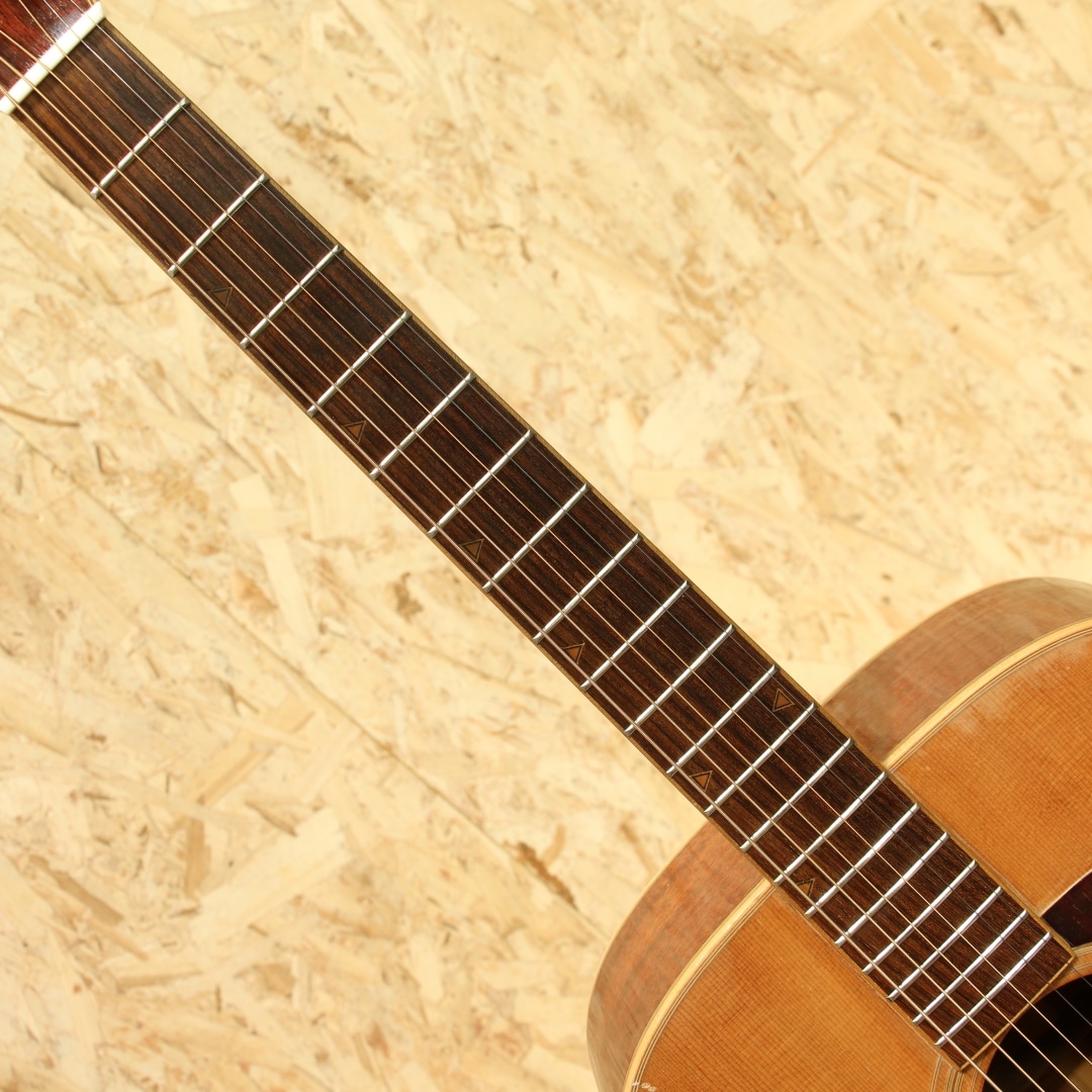 独自の設計や美学から未だに根強いファンも多いブランド”YAMAKI”。フォークブームの時代を駆け抜け、惜しくも現在では無くなってしまったブランドの一つです。本器はオール単板モデル”Y-60D”。1970年代製と思われるUSED品。エゾ松単板トップ、マホガニー単板サイド&バック、ローズウッド指板&ブリッジ、ロトマチックタイプペグ、ウッドピックガード、ナチュラルカラー。ヤマキの中でも上位に位置するウッドクラフトシリーズ。80年前後のごく一部の時期のみ製作されたシリーズとなります。その名の通り木材の質感を活かした仕様にて製作されており、ピックガードやバインディング等が木製となっています。そして総単板仕様で製作された本格派仕様。ヒールキャップにさりげなく入れられたバッファローのインレイがクールな印象です。ヤマキを含めこの時期のギターに通じる芯の強く基音がハッキリとした音色。レンジ感としてはミドルに寄っていますが、その分押し出し感のある響きやウォームなトーンを味わうことが出来ます。硬い訳ではなく太く甘い部分も感じられる音色。ゴージャスさよりは質実剛健な印象を受けますが、現代にも通用するポテンシャルを持っている1本です。ボディトップとバック全体に過去やすり掛けをしたのか細かなキズが付き塗装表面上の艶が消えております。ボディバックにはボンドや接着剤を塗ったのか刷毛跡のようなラインが見られます。どちらも外観上目立つ箇所ですが、使用上問題のある状態ではありません。この時期の国産ギターにしばしば見られる白濁の点在やその他にも細やかな当てキズ等経年感は見られますが、使用していく上で問題の無い状態をキープ。演奏性も問題無し、しっかりと整えられておりまだま活躍してくれるであろう1本です。当時革新的なアプローチを試みやコピーだけでない国産の強みを出していたブランド。無くなってしまった今なお根強いファンのいるフォークブームを駆け抜けたメーカーの内の1つです。古き良きフォークソングがお好きな方や当時を経験されている方は思い出しながら弾くも良し、木材で統一された家具のようなルックスを楽しむも良し。是非お手元にいかがでしょうか。