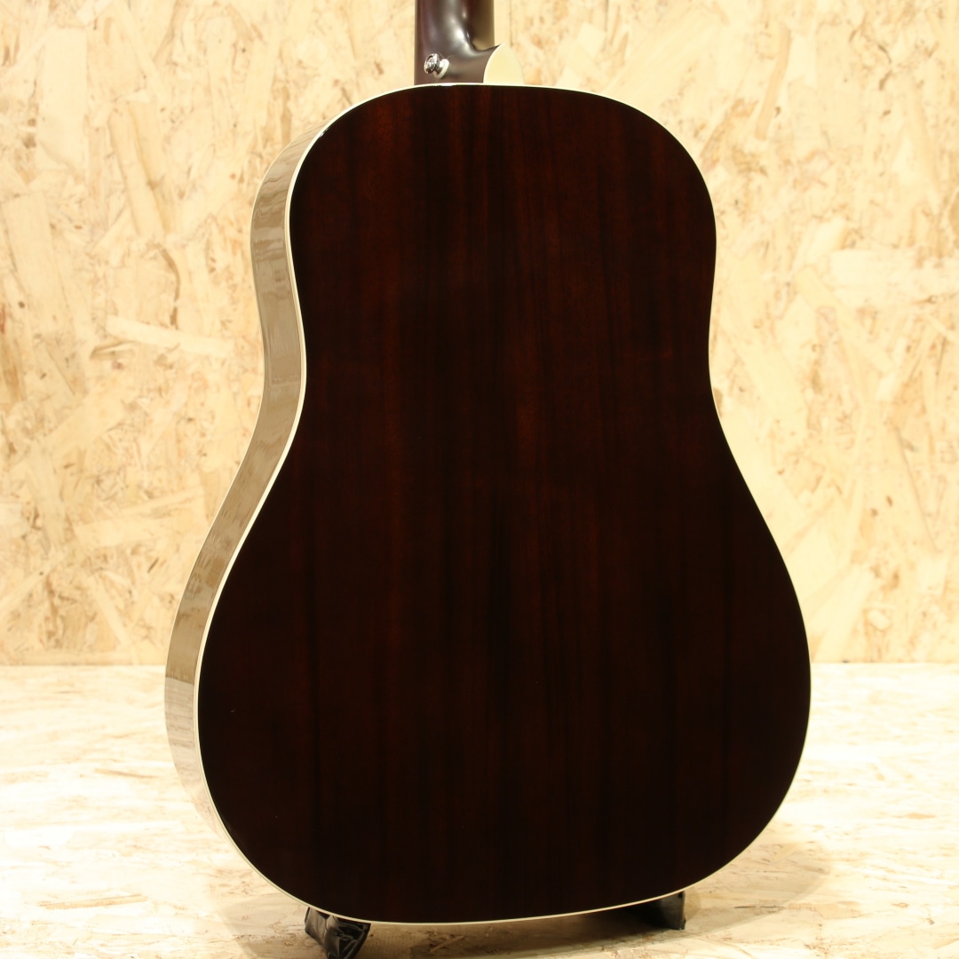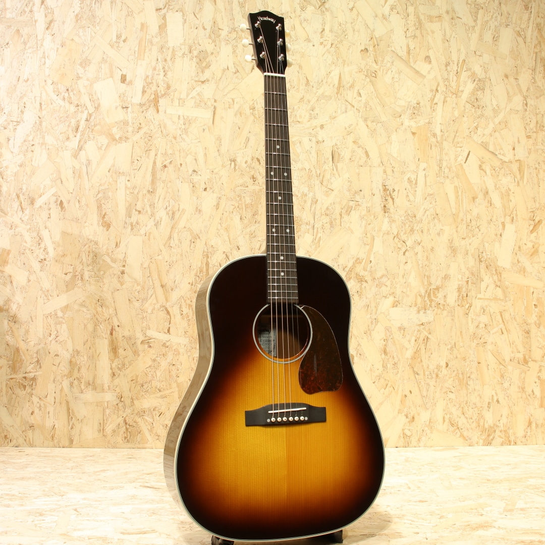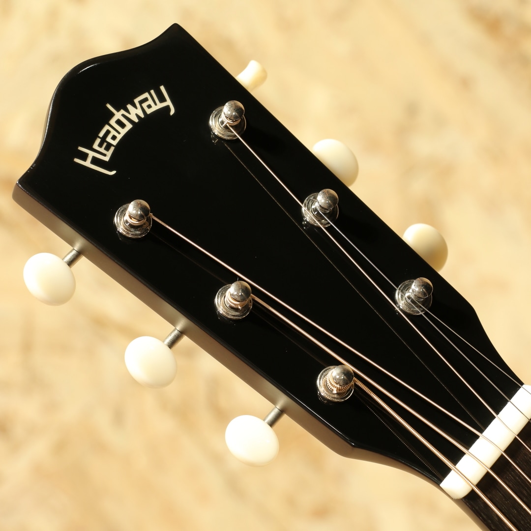 独自の工法と方法論で高品質のアコースティックギターを製作している長野県松本市の老舗ブランド"ヘッドウェイ"。多くのアコースティックギターファン、ミュージシャンたちに支持される日本製ギターを代表するブランドのひとつです。そのラインナップの中でも近年人気を博すのがJapan Tune-up(JT)シリーズ。海外で製造しコストを抑えつつ、最終調整は日本で。演奏性に直結する部分に妥協を許さない、ハイコストパフォーマンスのシリーズ群です。本器はJTシリーズ、エイジド加工を施したトップ材を使用したオール単板モデル”HJ-V115ASE/AGED SB”。2020年代製のUSED品です。エイジド加工を施したスプルース単板トップ、アフリカンマホガニー単板サイド&バック、ナトーネック、オヴァンコール指板&ブリッジ、グローバーオープンバックタイプペグ、Fishman Sonitoneピックアップシステム搭載。ヘッドウェイの拘りである「アリ溝ジョイント」「ネックの後仕込み」、これらは非常に高精度な加工が求められる為以前まで国産である上位機種でのみ採用していました。ですがJTシリーズではこの構造を採用しており、高精度での作業が行える工場で製作が行われています。更にネックヒールにも立って弾けるように「ストラップピン」とアンプに繋げるようにするギター用マイクである「ピックアップ」を標準で内蔵、搭載しています。特筆すべきは木材を特殊な熱加工を施し、経年を再現するエイジド加工を施したトップ材を使用している点。余分な油分や水分を揮発させることで弾き込まれたような熟れたトーン、そして木材の安定性等のメリットを持つため、音の要であるトップ材へ施されています。トップ以外にもオール単板で製作されている等抜かりの無い仕様。ヴィンテージライクなルックス、トラディショナルな仕様を持つ本格派。その見た目と違わず乾いた、弾き込まれたようなトーンを感じさせるドライな響き。明るく明瞭、柔らかさやふくよかさを感じさせる音色。音の密度がありすぎないところに引き算の美学のようなものを感じさせます。このボディではキレの良さを感じやすい為、パーカッシブな演奏もまた良しでしょう。歌モノで使うと歌とぶつかりにくいメリットを持つ等扱いやすい1本。ピックアップにはFishman製Sonitoneを搭載。アンプへの接続が可能で、サウンドホールのすぐ横につまみが2つあるコントローラーが装着されています。それぞれ音量を調整するVol、高音を調整するTone、Toneは上げると元気で明るい響きで下げるとやや甘い丸い音色がします。人前での演奏、録音での使用、配信等幅広く使用できるギター用マイクを搭載したギターです。全体的に使用感は薄く、細やかな擦れキズが若干見られる程度となっています。ネック周りの演奏性も良し、家弾きからステージまでこなせるオールマイティな1本。拘りと高精度の加工を武器に人気を誇るヘッドウェイ。ハイコスパのJTシリーズのクオリティも高くこちらも人気の高いシリーズです。コストパフォーマンスに優れ、本格派ながら扱いやすい1本。是非お手元でお楽しみ下さいませ。