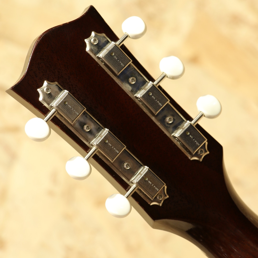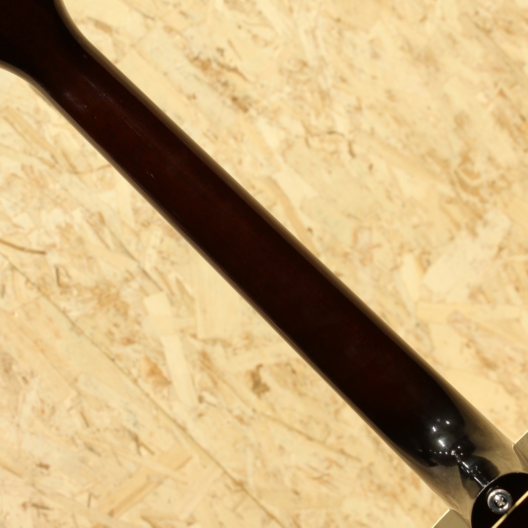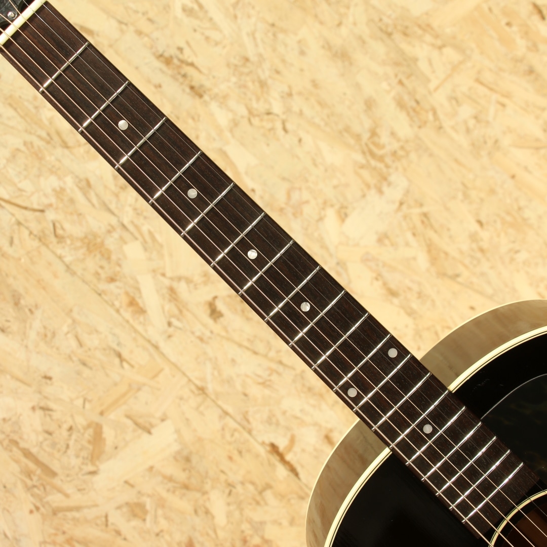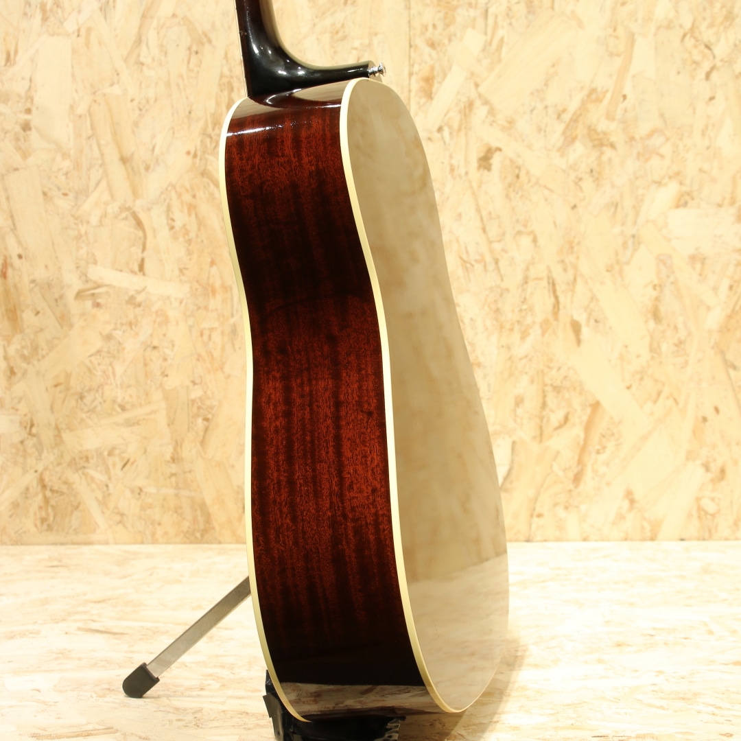 某楽器店65周年を記念して立ち上げられたブランド”Nostalgia”。古き良き音楽の傍らで鳴っていたヴィンテージサウンド、そのノスタルジーを新品でも感じて欲しいとの願いを持って国産にて製造されています。本器はJ-45タイプ[N1 "Reminisce"]。2020年代製のUSED品です。アディロンダックスプルーストップ、マホガニーサイド&バック、マホガニーネック、ローズウッド指板&ブリッジ、ドットMOP指板インレイ、ラージベッコウ柄セルピックガード、シングルリングロゼッタ、ゴトー製ノーラインクルーソンタイプペグ、19F最終、ノンスキャロップドXブレイシング、オールラッカーのヴィンテージサンバーストカラー、オープンポア仕上げ。言わずもがなGIBSONを代表する機種”J-45”。数々の歴史を作ってきたアコースティックギターをも代表するモデルで著名なアーティストの使用も多く、ワークホース(頼りになる馬車馬)の異名を持つ傑作器の1つです。そのJ-45の歴史の中でも1940年代-1950年代にかけての仕様をミックスして設計されているのが本器。『Reminisce(レミニス)』には「追憶する、思い出を語る」という意味が込められており、長い時間を掛けて語り継がれるギターであって欲しいとの思いが込められています。枯れたサウンド、ワイドレンジ、そしてパワフルなサウンドを目標としています。40年代に使われていたアディロンダックスプルースをトップに配し、評価の高い50年代後半のグリップを採用、ラージガードは59年製の実機から採寸して製作されています。接着剤も当時に倣いニカワ接着を採用。そして極薄のオールラッカー塗装、導管が見えるオープンポアによって、長い年月を経たかのような風合いを新品でも漂わせる仕上がり。他にもネックブロックの形状やフレット数によるロゼッタの見え方等マニアックな個所にまで拘り抜かれたモデルです。ヴィンテージをベースとしつつも、それぞれの年代をミックスされたハイブリッド。そしてオープンなトーンを持った響きとカラッとした音色。国産らしい芯を持ったサウンドではありますが、アディロンによる太さやふくよかさから暖かみを感じるトーンになっています。軸はブレずに、ある程度制御された暴れ方を魅せる辺りよく出来ていると感じさせられます。ストロークからフィンガーまで対応出来そうなオールマイティ、ハイブリッドな1本。後付けにてL.R Baggs Element VTCを搭載。アンダーサドルピエゾによって音の輪郭や芯を捉えたサウンドを拾い上げることが可能となり、Element素子自体は柔軟な為ブリッジ付近のボディトップ面の振動もトラッキング。エンドジャックと一体化されたプリアンプでふくよかに、生生しいサウンドへと調整されアウトプットします。サウンドホール縁のコントローラでVolとToneの調整が可能となっており、ステージ上での音色調整も出来ます。あらゆるプレイヤーに愛用される現代の定番ピックアップ、優秀なシステムの1つです。サウンドホール周りにやや広範囲のピックスクラッチ跡が見られますが、極薄塗装が故の削れ方で致し方ありません。見た目よりはキズは深くなく使用上問題の無い状態。ヘッドの角の僅かな当てキズや細かな擦れキズや当てキズ等の使用感こそ見られますが、それもヴィンテージのような貫禄を見せる個体。ネック周りの状態も良く、これからも使っていける1本となっています。国産の確かな技術で製造しつつも、古き良きスタイルを織り交ぜたノスタルジックな1本。手頃な金額でありながらも拘り貫いたディティールには唸るものがあります。今後使っていくうちに付くキズも後々の勲章となり得る良い風合い。一度お試し下さいませ。