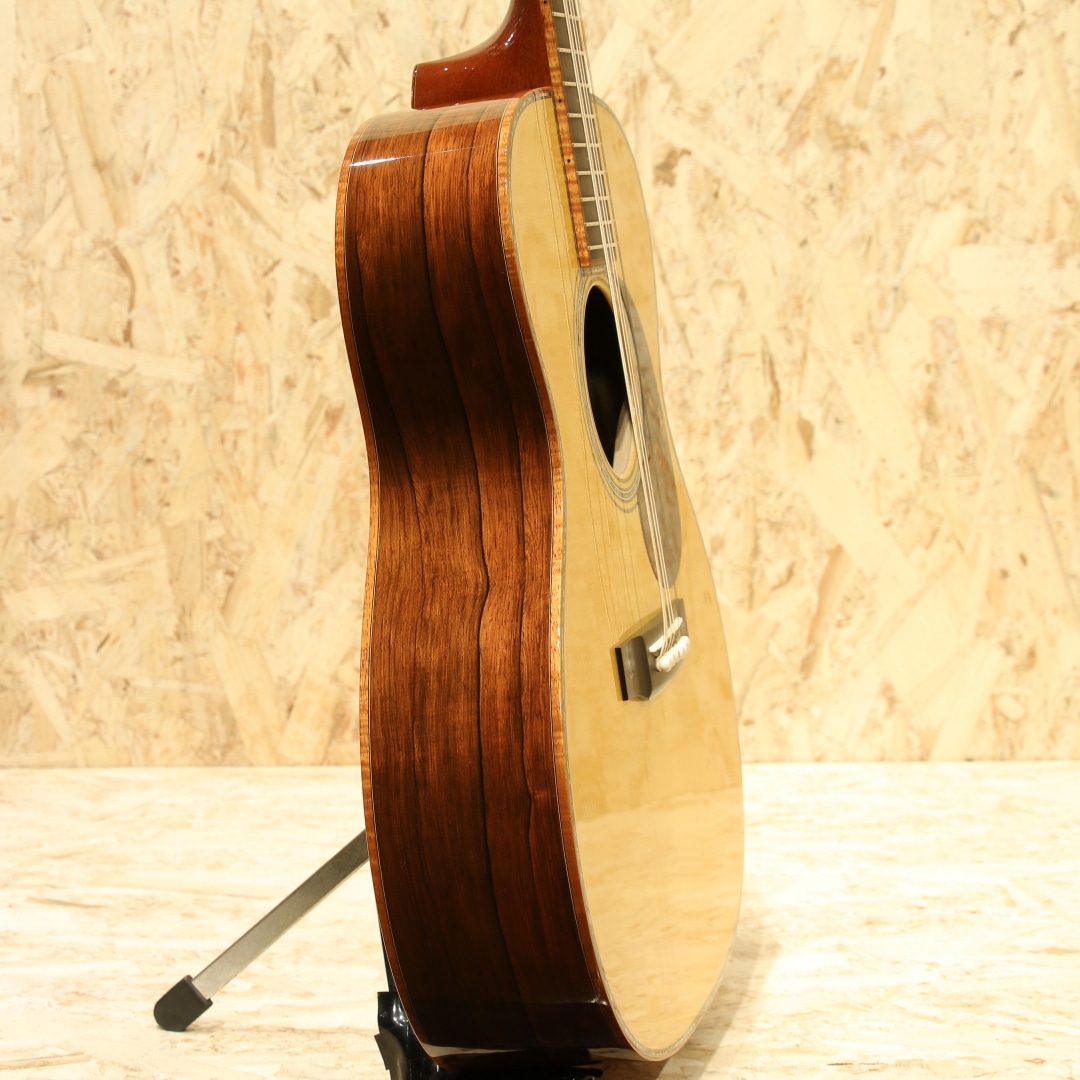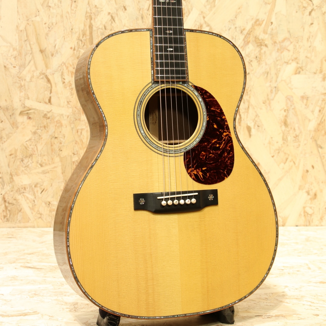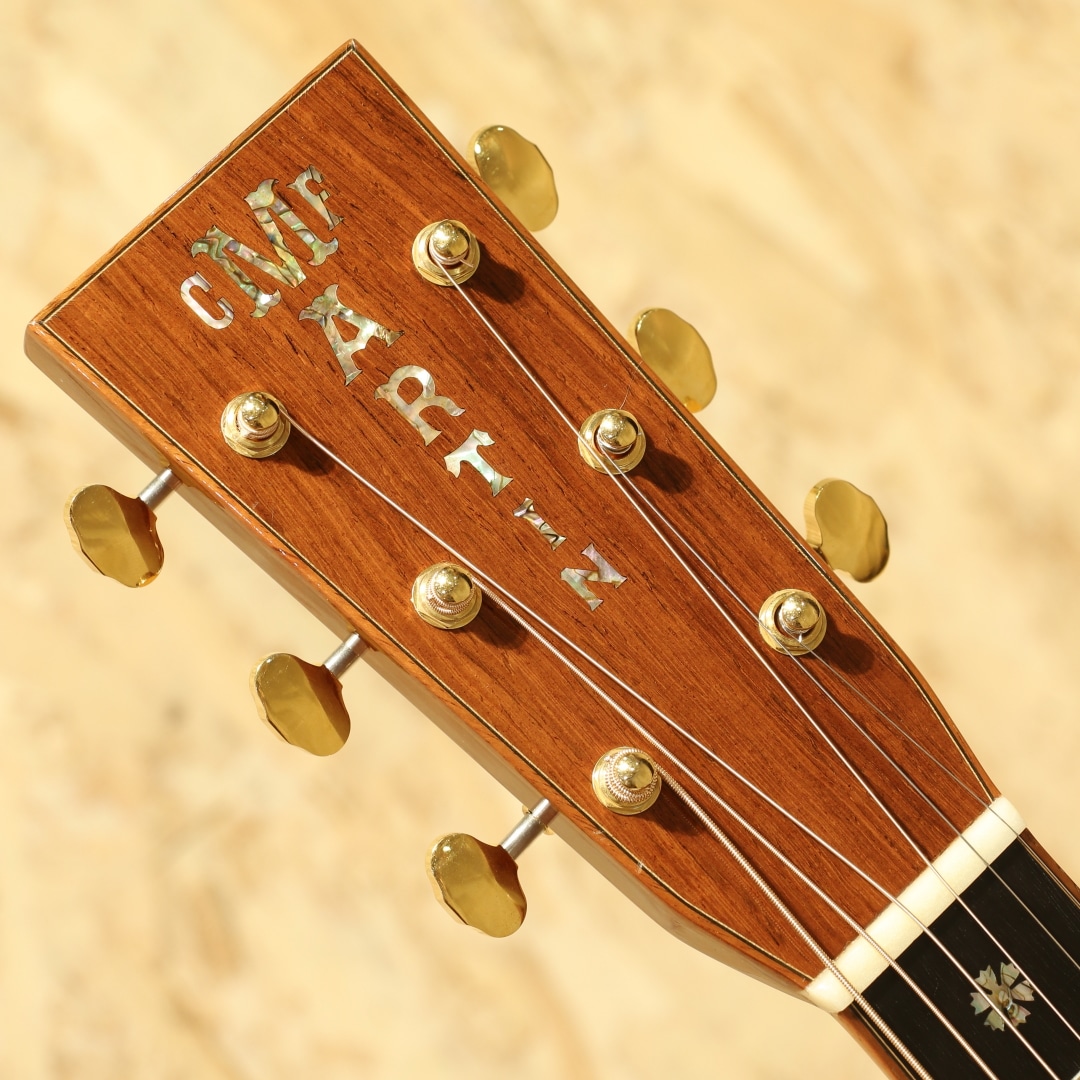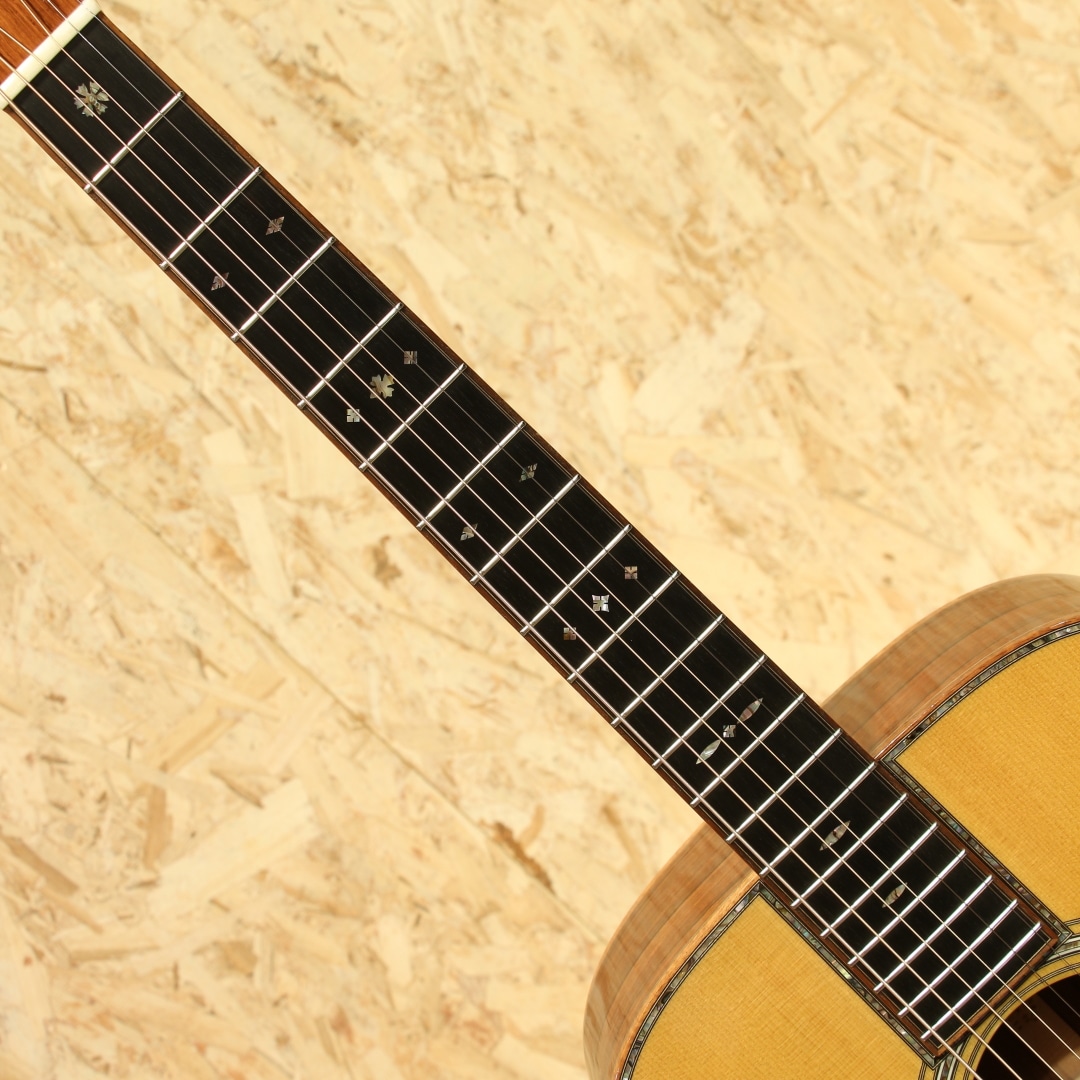 高い技術と完成度にて素晴らしいギターを造り出すマーチンカスタムショップ製の"CTM OOO-42 Madagascar Rosewood Anaheim"。2012年のアナハイム・ナムショウで発表された限定モデルで2012年から2013年のレンジで限定生産されました。本器は2012年製。目が細かく端正な杢のアディロンダックスプルーストップ、淡い杢で追柾目のワイルドなグレインの最高級マダガスカルローズウッドサイドバック。エボニー指板&ブリッジ、ウェバリーゴールドペグ、デルマー社ベッコウ柄セルロイドピックガード、表板アバロントリム&ロゼッタ、アバロンスノウフレイクス&キャッツアイ指板ポジション、ブラック指板サイドポジション。マダガスカルローズウッド天神板、フレイム杢が美しいコアウッドバインディング、スキャロップドXブレイシング。ふくよかで柔らかく、倍音豊かな上質な42サウンド。きらびやかで甘いトーン、広がりのあるワイドレンジサウンド。弾く毎に引き込まれる、カスタムショップ製ならではの完成度の高いサウンドです。ブリッジ1弦側端の上下にうっすらウェザーチェックに進む前の塗装ライン、ヘッドプレート全体に光でかざしてわかる程度の細かく浅めの弦すり痕、その他は光をかざせば分かる程度のわすかな擦り傷程度、フレットヘリなどもなく、前述の部分以外はほとんど使用感のみられない美品状態をキープしています。ネックコンディションも大変良好。弾きやすくセットアップされており、スムーズな演奏ができる状態です。本モデルはウッドマテリアルの組み合わせや装飾のパターンが素晴らしく良い顔でとても人気が高く、中古で入荷しても足が速いモデル。お探しだった方はぜひお早めに。迷われているうちに売り切れ必至のアイテム。ご存知でなかった方は是非、この機会にチェックして下さい。オリジナルハードケース付属。