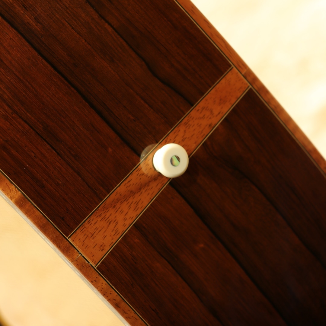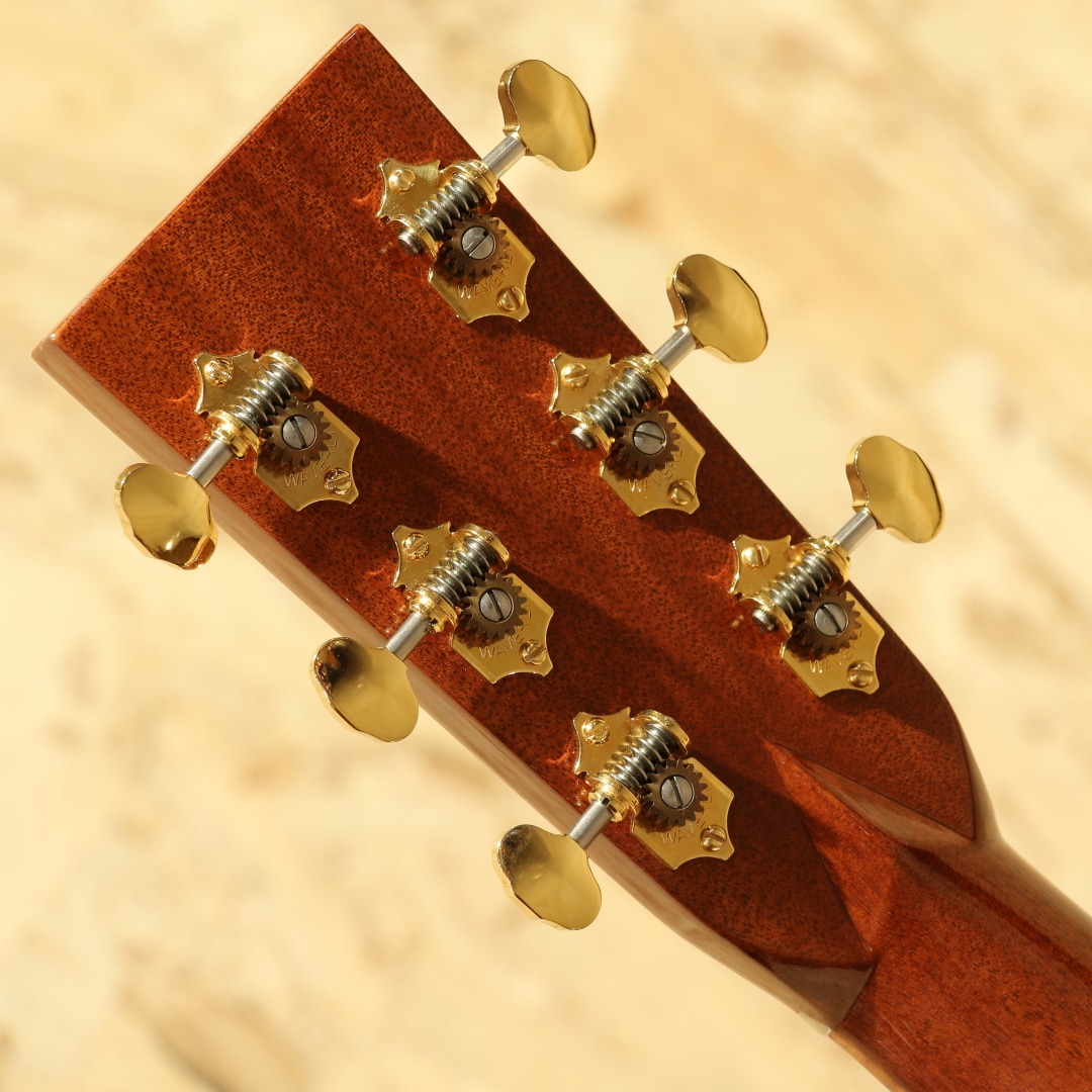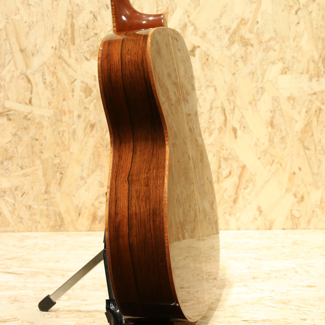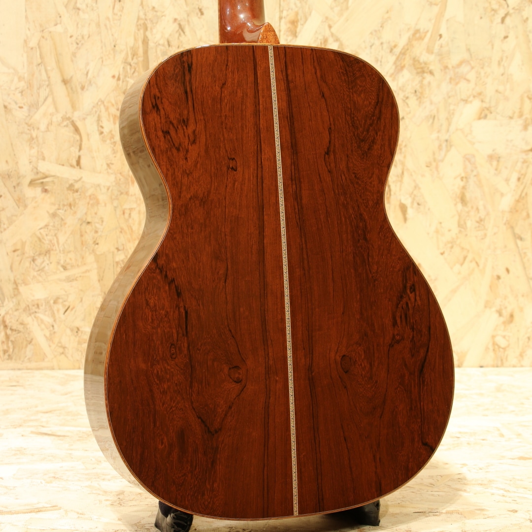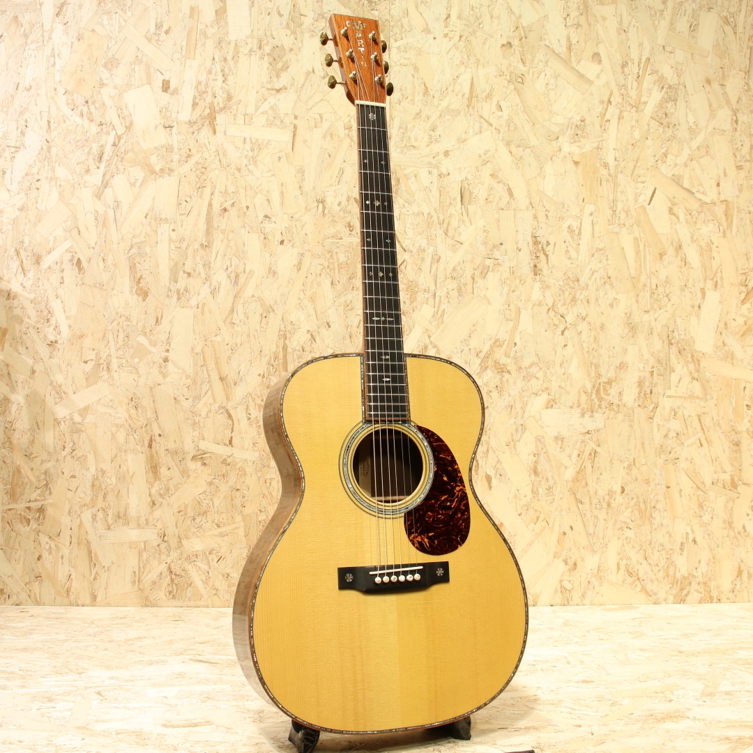 高い技術と完成度にて素晴らしいギターを造り出すマーチンカスタムショップ製の"CTM OOO-42 Madagascar Rosewood Anaheim"。2012年のアナハイム・ナムショウで発表された限定モデルで2012年から2013年のレンジで限定生産されました。本器は2012年製。目が細かく端正な杢のアディロンダックスプルーストップ、淡い杢で追柾目のワイルドなグレインの最高級マダガスカルローズウッドサイドバック。エボニー指板&ブリッジ、ウェバリーゴールドペグ、デルマー社ベッコウ柄セルロイドピックガード、表板アバロントリム&ロゼッタ、アバロンスノウフレイクス&キャッツアイ指板ポジション、ブラック指板サイドポジション。マダガスカルローズウッド天神板、フレイム杢が美しいコアウッドバインディング、スキャロップドXブレイシング。ふくよかで柔らかく、倍音豊かな上質な42サウンド。きらびやかで甘いトーン、広がりのあるワイドレンジサウンド。弾く毎に引き込まれる、カスタムショップ製ならではの完成度の高いサウンドです。ブリッジ1弦側端の上下にうっすらウェザーチェックに進む前の塗装ライン、ヘッドプレート全体に光でかざしてわかる程度の細かく浅めの弦すり痕、その他は光をかざせば分かる程度のわすかな擦り傷程度、フレットヘリなどもなく、前述の部分以外はほとんど使用感のみられない美品状態をキープしています。ネックコンディションも大変良好。弾きやすくセットアップされており、スムーズな演奏ができる状態です。本モデルはウッドマテリアルの組み合わせや装飾のパターンが素晴らしく良い顔でとても人気が高く、中古で入荷しても足が速いモデル。お探しだった方はぜひお早めに。迷われているうちに売り切れ必至のアイテム。ご存知でなかった方は是非、この機会にチェックして下さい。オリジナルハードケース付属。