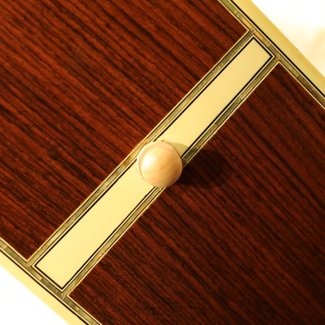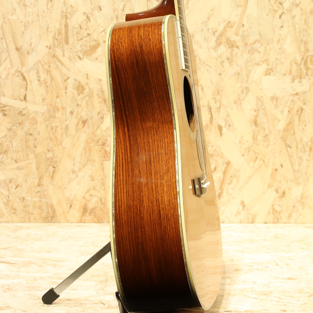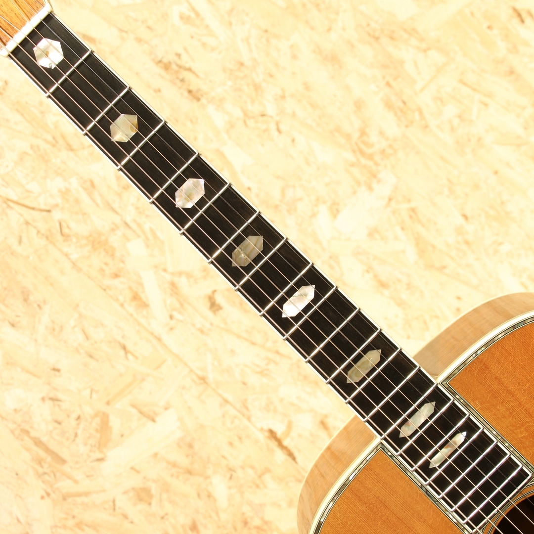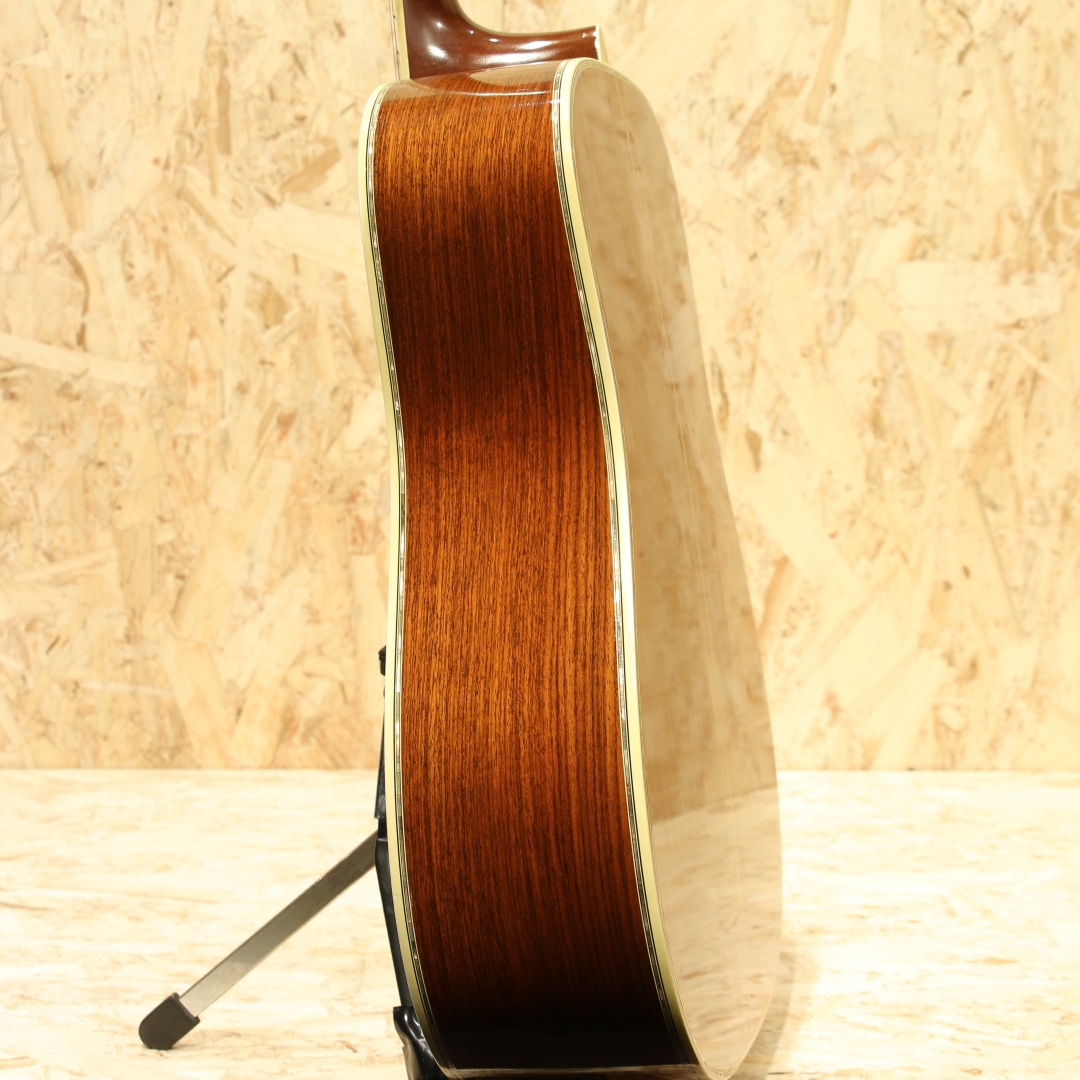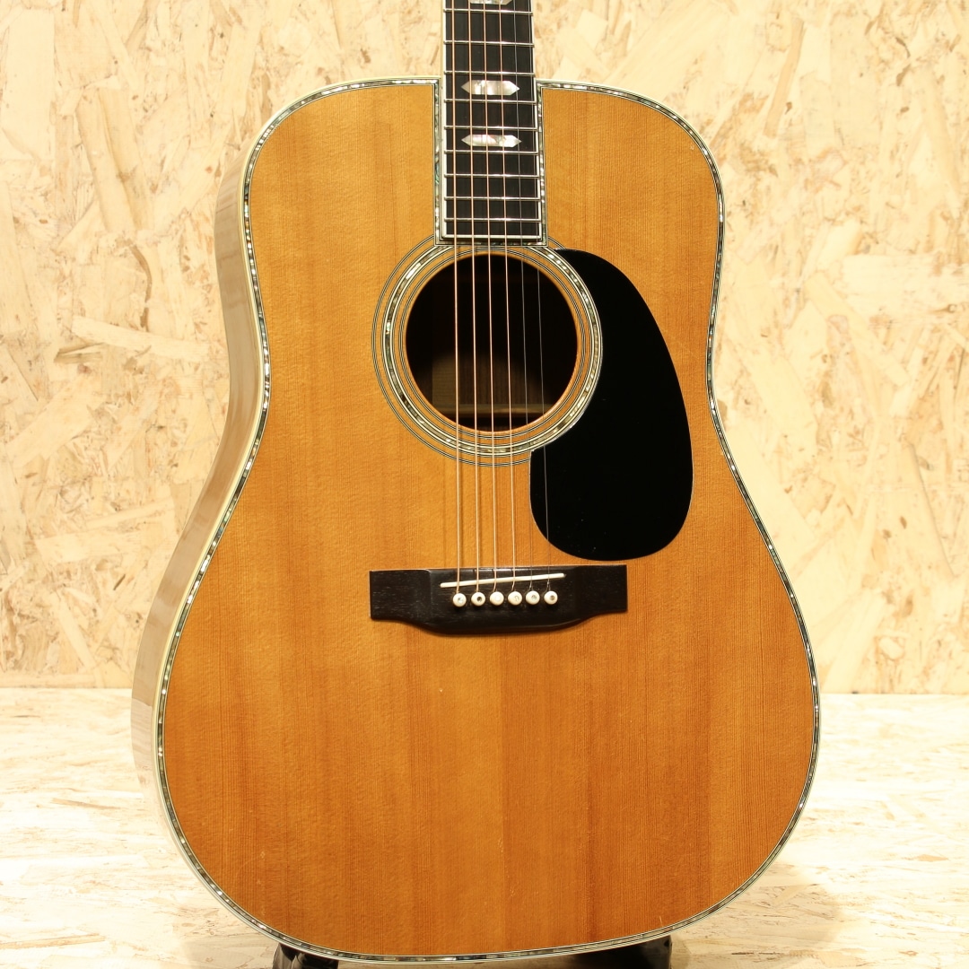 マーチンD-45はカントリーシンガー"Gene Autry(ジーン・オートリー)"のオーダーから生まれたマーチンギターの最高級機種。1933年から1942年の間に91本が製造された後、マーチンギターの広報・研究家として活躍したマイク・ロングワースによって1968年に再生産が実現されました。マーチンスタイル45はこの型番に見合う材料を供給できない場合には生産されません。常にこの上ないクオリティを誇る最高のシリーズとなります。本器は1980年製の1本。スプルーストップ、インディアンローズウッドサイド&バック、マホガニーネック、エボニー指板&ブリッジ、オリジナルゴールドシャーラーぺグ、バーチカルヘッドロゴ、ヘキサゴン指板インレイ、アバロンロゼッタ&トリム、スクエアトラスロッド、ラージローズウッドブリッジプレート、モザイクバックストリップ、ノンスキャロップド・Xブレイシング。線が太くパンチの効いたサウンド。まとまりのあるゴツンと前に飛び出す出音で、程よくきらびやかで切れのあるサウンドはこの時期の45ならでは。エンドピンはジャックサイズに拡張されていますが、現在はピックアップは外されており、同サイズのウッドピンを装着済み。ピックガードはオリジナルよりわずかオーバーサイズのものに交換されていますがマーティンクラックなどはなく美しい状態をキープ。ブリッジピンは近年のD45ピンに交換され、元のピンはケース内に同梱(ひとつのみ欠けがありますが使用は出来ます)。ネック裏には各ポジションごとのカぽ傷、ピックガードやサウンドホール周りの若干の弾き傷、細やかな傷や細かいウェザーチェックなどは見られますがオリジナルフィニッシュをキープし、木部の割れなどはない状態をキープ。かなり大事に愛用されて使用されてきたギターであることが伺え、しっかりと弾きこまれた一品。ネックは極わずか順ぞりほぼまっすぐでSQではベストなコンディション。12F上で6弦3.0mm、1弦2.0mmとフォーキーなセットアップ。プレイコンディション良好でしっかり使って頂ける1本です。ノンスキャロップ、SQネック、ソリッドアバロン、この時代でしか味わえない音色と風格、当時の憧れは同時期の個体でしか拾えません。ぜひお手に取ってお試しください。オリジナルブルーケース付属。