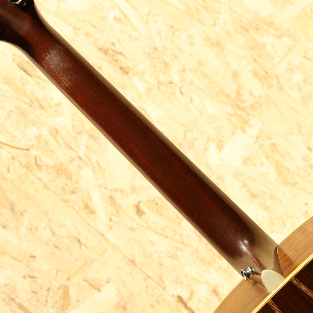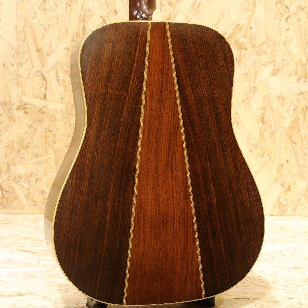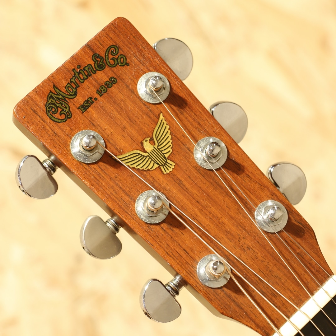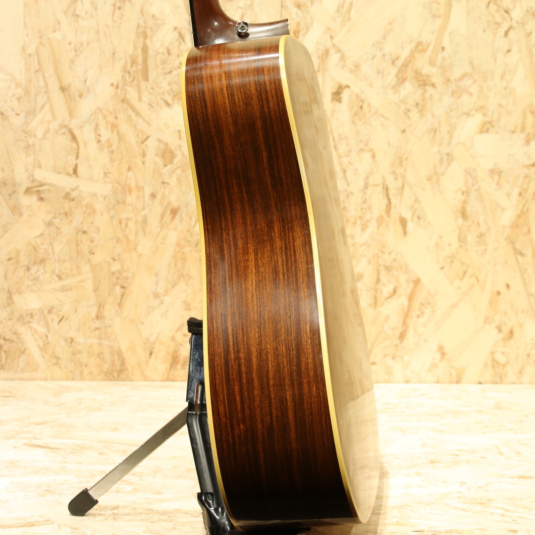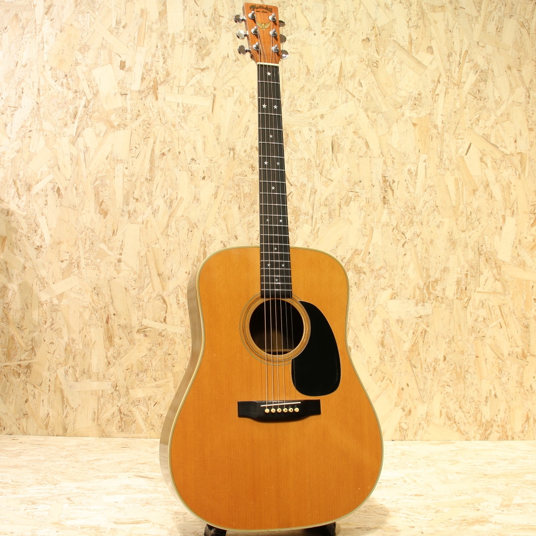 アメリカ建国200周年記念の1976年に1976本限定で生産された"D-76"。1776年の独立宣言から200年を記念して生産されたもっとも有名なリミテッドモデルのひとつで、200年に因んで1975年に200本、1976年には1776本の計1976本が2年間にわたって製造されました。当時のD-45と同グレードの材で製作されたモデルで、ミュージシャンの使用なども相まって人気の高いモデルです。本器は1976年製造分の1本。シトカスプルーストップ、インディアンローズウッドサイド&バック、マホガニーネック、エボニー指板&ブリッジ、ミルクボトルグローバーペグ、MOP指板スターインレイ、ヘリンボーンロゼッタ&バックストリップ、スクエアネックロッド、ラージローズウッドブリッジプレート、ノンスキャロップドXブレイシング。イーグルヘッドインレイ、独立当時のアメリカ13州を星に見立てて入れられた指板インレイ、ロゼッタのヘリンボーン装飾など、拘りの詰まったデザイン。重心が低くファットでワイドな音像の低音。しっかりと空気を含んだ奥行き感のある響きで音量もしっかりとありながらそれに埋もれないブライトなマーチンサウンドが味わえます。ヒールサイドにはブリッジピンマウント。サイド6弦側上肩あたりに木部剥がれを修正したような跡がありますがきれいに修正されており、タッチアップ部分もとてもわかりにくくなっています。その他はネック裏に若干の塗装負けと小さなカポ傷がみられますが薄い擦り傷や細かい小傷がわずかに見られる程度で使用感が大変薄い極上美品です。ネック状態もまっすぐで大変状態が良く、プレイアビリティーも素晴らしい状態です。1970年代憧れを抱いた方も多いはずのこの外観。憧れを抱いた方も多いはずのあのモデルです。お探しだった方はこの機会お見逃しなく。汎用ハードケース付。