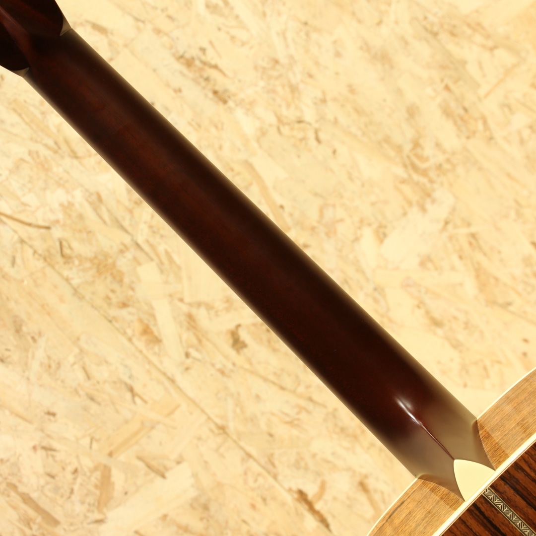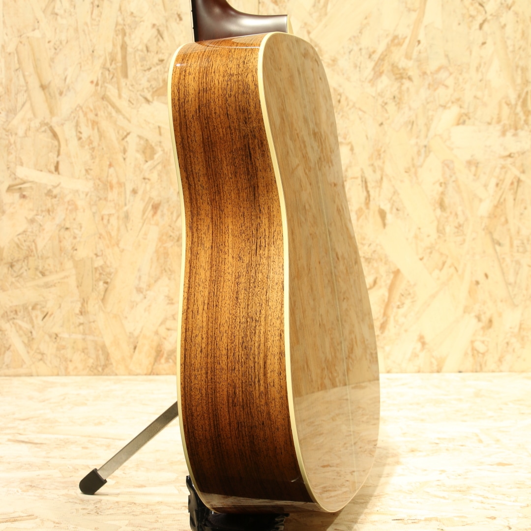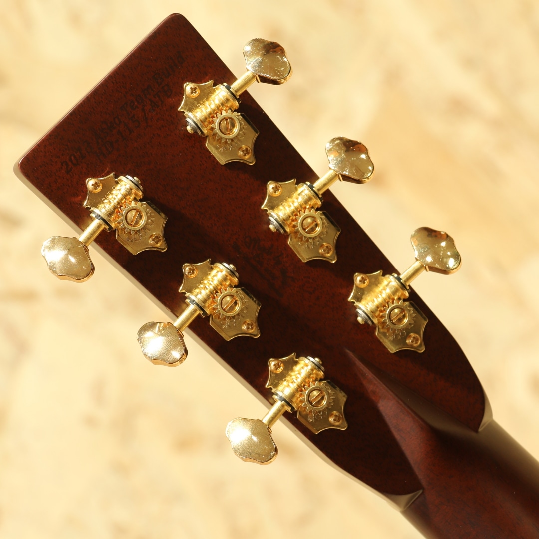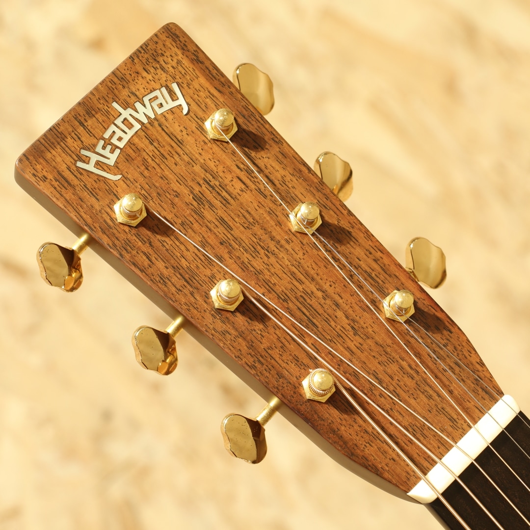 独自の工法と方法論で高品質のアコースティックギターを製作している長野県松本市の老舗ブランド"ヘッドウェイ"。多くのアコースティックギターファン、ミュージシャンたちに支持される日本製ギターを代表するブランドのひとつです。本器は2013年にATB(飛鳥チームビルド)によって40本限定で製作が行われた内の1本”HD-115/ATB ”。2013年製USED品。アディロンダックスプルーストップ、インディアンローズウッドサイド&バック、アフリカンマホガニー1Pネック、エボニー指板&ブリッジ、ゴトークロームペグ、パールダイアモンドスクエア指板ポジションインレイ、べっ甲柄ピックガード、ヘリンボーントリム、ウッドロゼッタ、スキャロップドフォワードシフトXブレイシング。HD-115は創業当時からヘッドウェイを代表するモデルとして長年製作されてきた機種。昭和から続く伝統的なモデルとなります。ATBは2011年から始動しており、スタンダードよりも拘りのスペックやディティールを選りすぐりの職人で製作を行う生産ラインです。この年は素材に拘って製作を行っており、トップ材とブレイシング材にアディロンダックスプルースを採用。更に構造も見直しを図られた意欲作となっています。ネックの厚みを1Fで約1mmほどと少しだけ厚くし、耐久性とサウンド面へのアプローチを。ボディ厚は3mmほど厚くすることでより深いサウンドを。2011年までHD115のスケールは644mmだったところを648mmへ。たった4mmですがサウンド面には影響があり、ややレンジ感が広くハリのあるサウンドを獲得しています。ヘッドウェイでしばしば感じられる硬質さは和らぎ、ふくよかにダイナミックに響くサウンドを感じられます。音色は太く、角の取れた響き、まとまりの良さ。ソリッドな響きというよりはエアリー、容積が増えた分も影響していそうです。柔らかく弾くも良し、まとまりよくガシガシ弾くも良し。ソロギターで優しいサウンドを奏でるも良いでしょう。ピックガードに表面的な弾きキズ、ボディバック面の薄い擦れキズ等見られますが10年近くの経年は感じさせず非常にキレイな状態をキープされています。ネック周りの状態も良いままに保たれており、ロッド残りとサドル残り共に充分。これからの演奏性も心配無しの良質な1本です。拘り貫いた設計や技術、独自の思想を具現化し続けるヘッドウェイ。国内に工場があるため修理などのサポートを受けやすいのもメリットの一つと言えるでしょう。拘りが強いヘッドウェイが誇る技術の高さ、是非ご体感下さい。