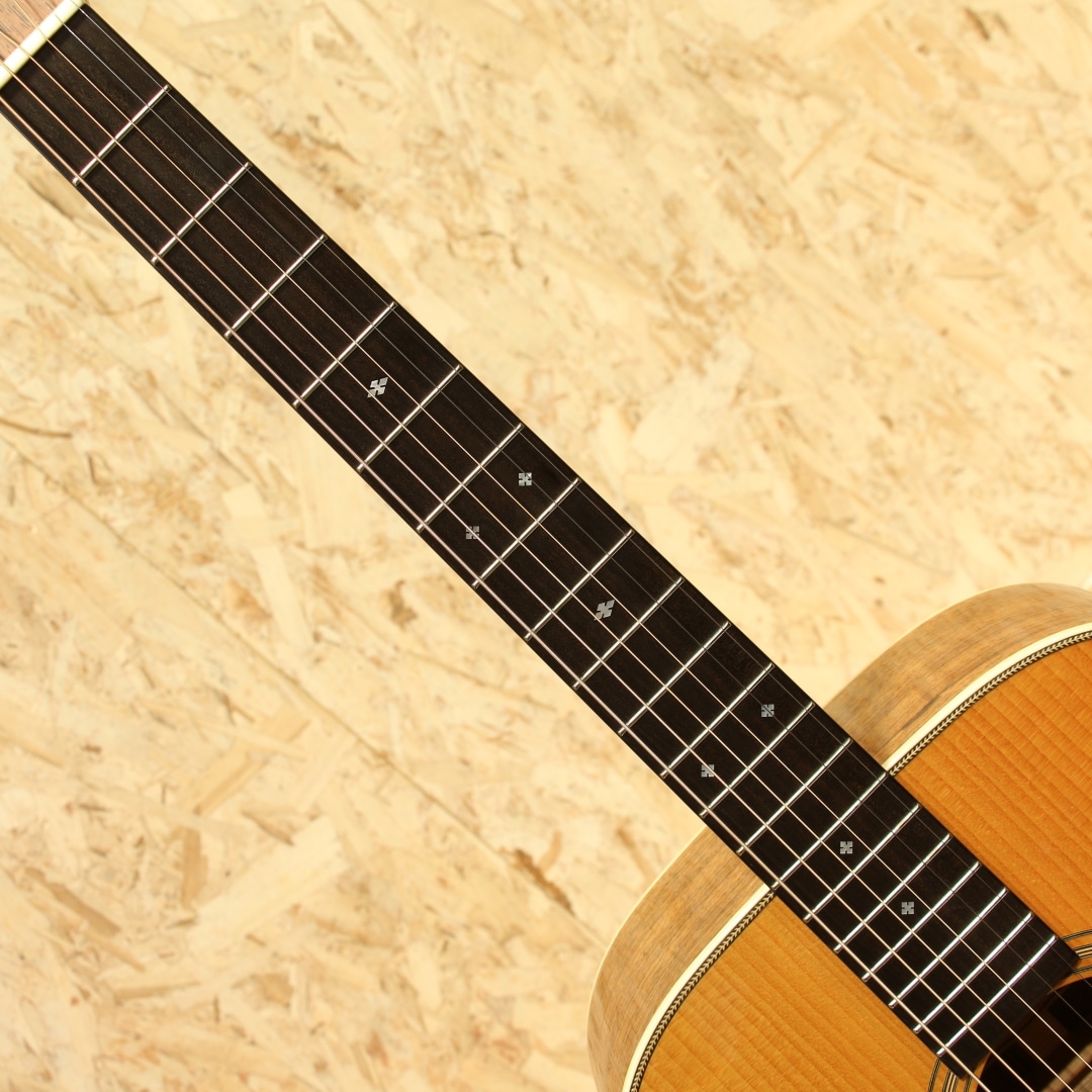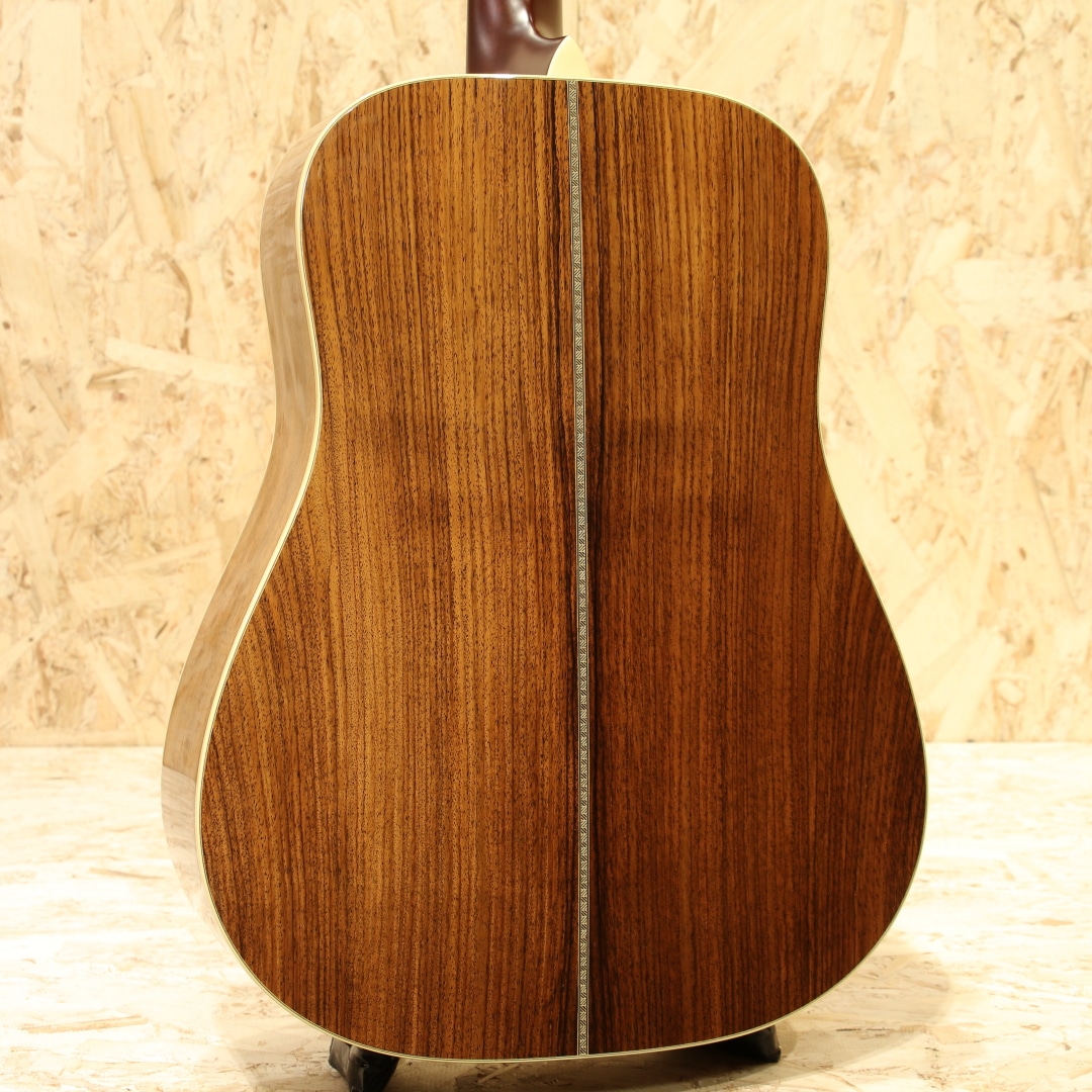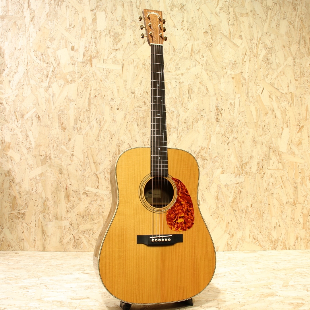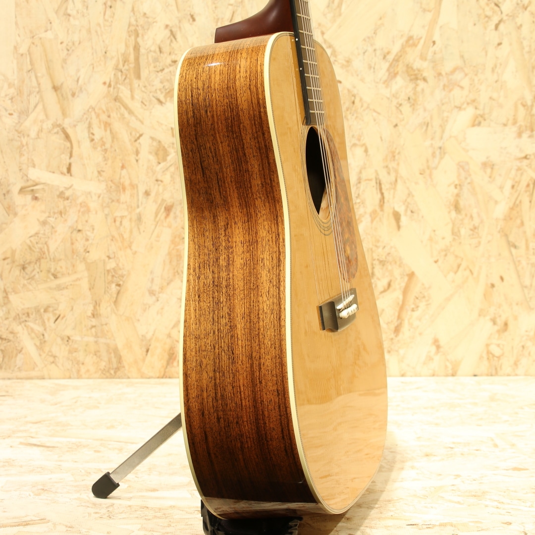 独自の工法と方法論で高品質のアコースティックギターを製作している長野県松本市の老舗ブランド"ヘッドウェイ"。多くのアコースティックギターファン、ミュージシャンたちに支持される日本製ギターを代表するブランドのひとつです。本器は2013年にATB(飛鳥チームビルド)によって40本限定で製作が行われた内の1本”HD-115/ATB ”。2013年製USED品。アディロンダックスプルーストップ、インディアンローズウッドサイド&バック、アフリカンマホガニー1Pネック、エボニー指板&ブリッジ、ゴトークロームペグ、パールダイアモンドスクエア指板ポジションインレイ、べっ甲柄ピックガード、ヘリンボーントリム、ウッドロゼッタ、スキャロップドフォワードシフトXブレイシング。HD-115は創業当時からヘッドウェイを代表するモデルとして長年製作されてきた機種。昭和から続く伝統的なモデルとなります。ATBは2011年から始動しており、スタンダードよりも拘りのスペックやディティールを選りすぐりの職人で製作を行う生産ラインです。この年は素材に拘って製作を行っており、トップ材とブレイシング材にアディロンダックスプルースを採用。更に構造も見直しを図られた意欲作となっています。ネックの厚みを1Fで約1mmほどと少しだけ厚くし、耐久性とサウンド面へのアプローチを。ボディ厚は3mmほど厚くすることでより深いサウンドを。2011年までHD115のスケールは644mmだったところを648mmへ。たった4mmですがサウンド面には影響があり、ややレンジ感が広くハリのあるサウンドを獲得しています。ヘッドウェイでしばしば感じられる硬質さは和らぎ、ふくよかにダイナミックに響くサウンドを感じられます。音色は太く、角の取れた響き、まとまりの良さ。ソリッドな響きというよりはエアリー、容積が増えた分も影響していそうです。柔らかく弾くも良し、まとまりよくガシガシ弾くも良し。ソロギターで優しいサウンドを奏でるも良いでしょう。ピックガードに表面的な弾きキズ、ボディバック面の薄い擦れキズ等見られますが10年近くの経年は感じさせず非常にキレイな状態をキープされています。ネック周りの状態も良いままに保たれており、ロッド残りとサドル残り共に充分。これからの演奏性も心配無しの良質な1本です。拘り貫いた設計や技術、独自の思想を具現化し続けるヘッドウェイ。国内に工場があるため修理などのサポートを受けやすいのもメリットの一つと言えるでしょう。拘りが強いヘッドウェイが誇る技術の高さ、是非ご体感下さい。